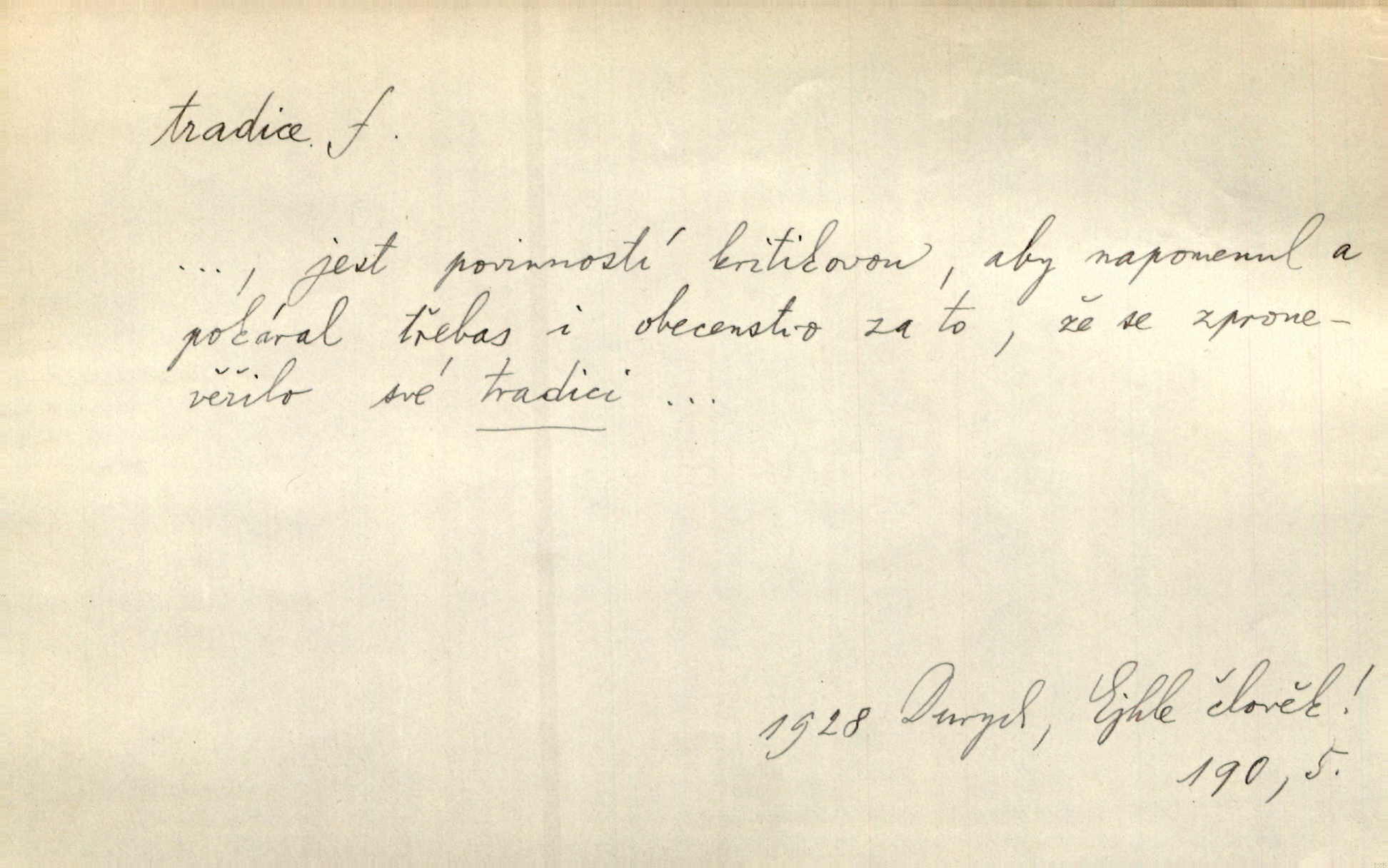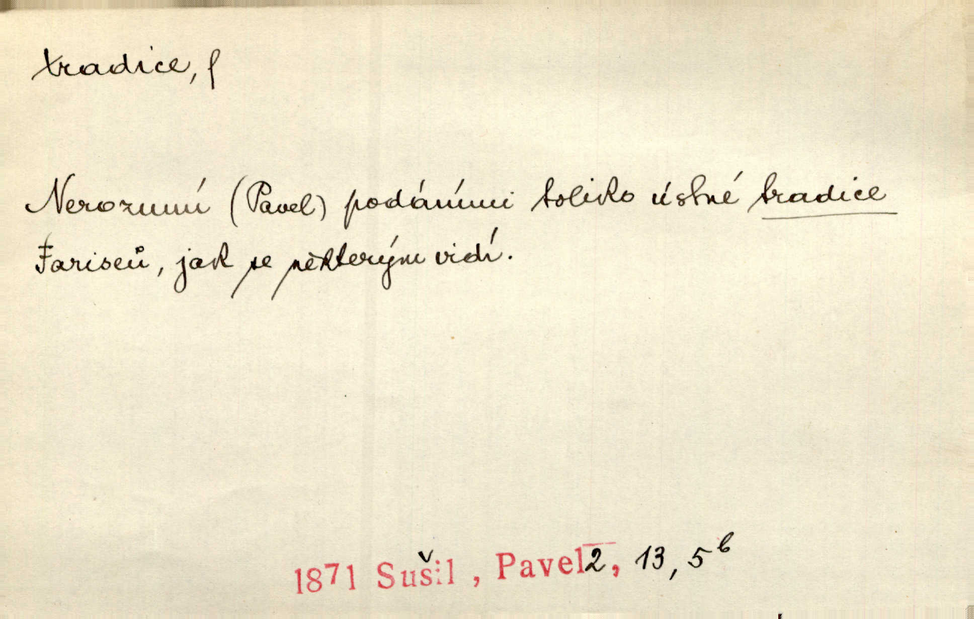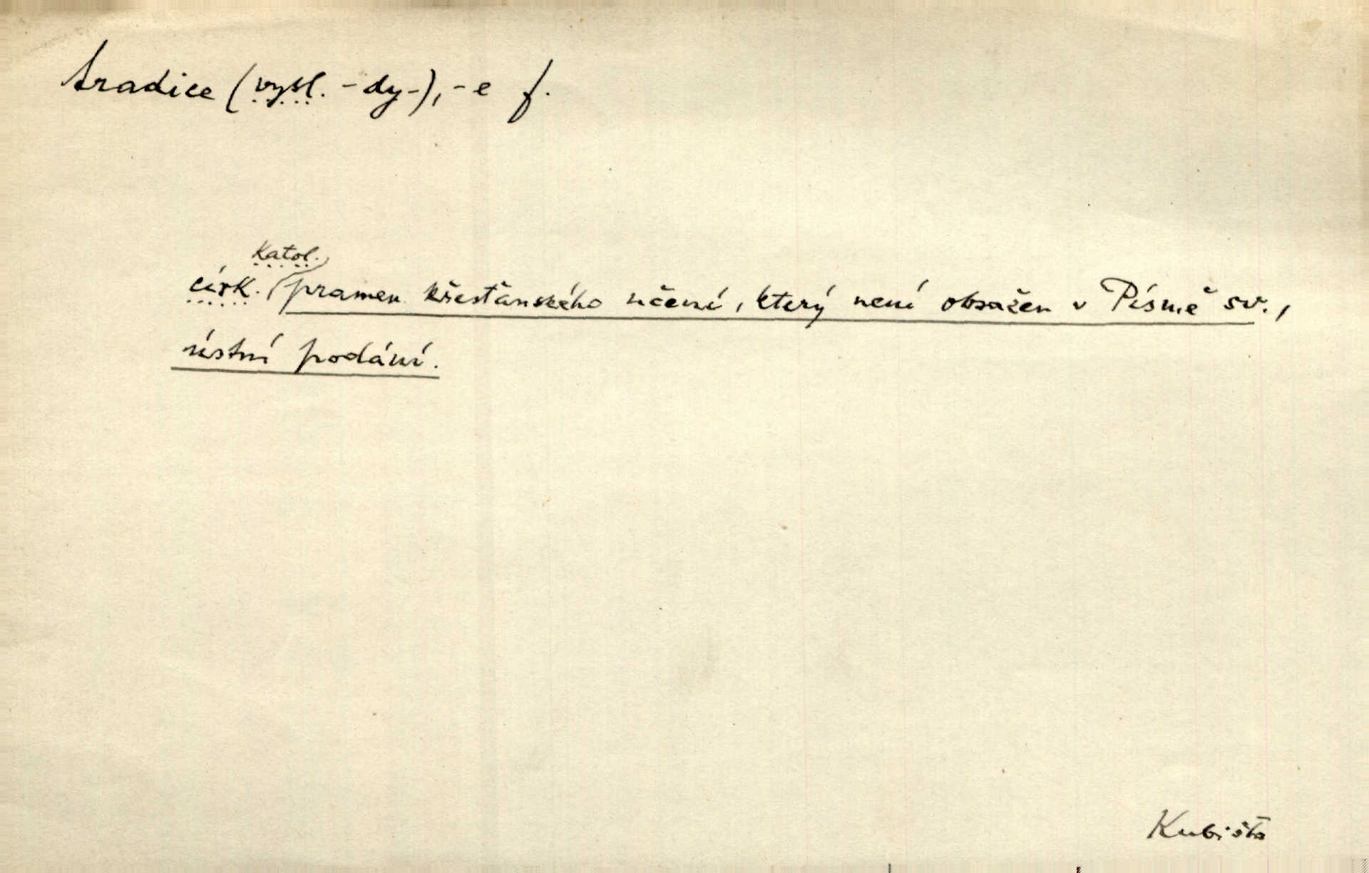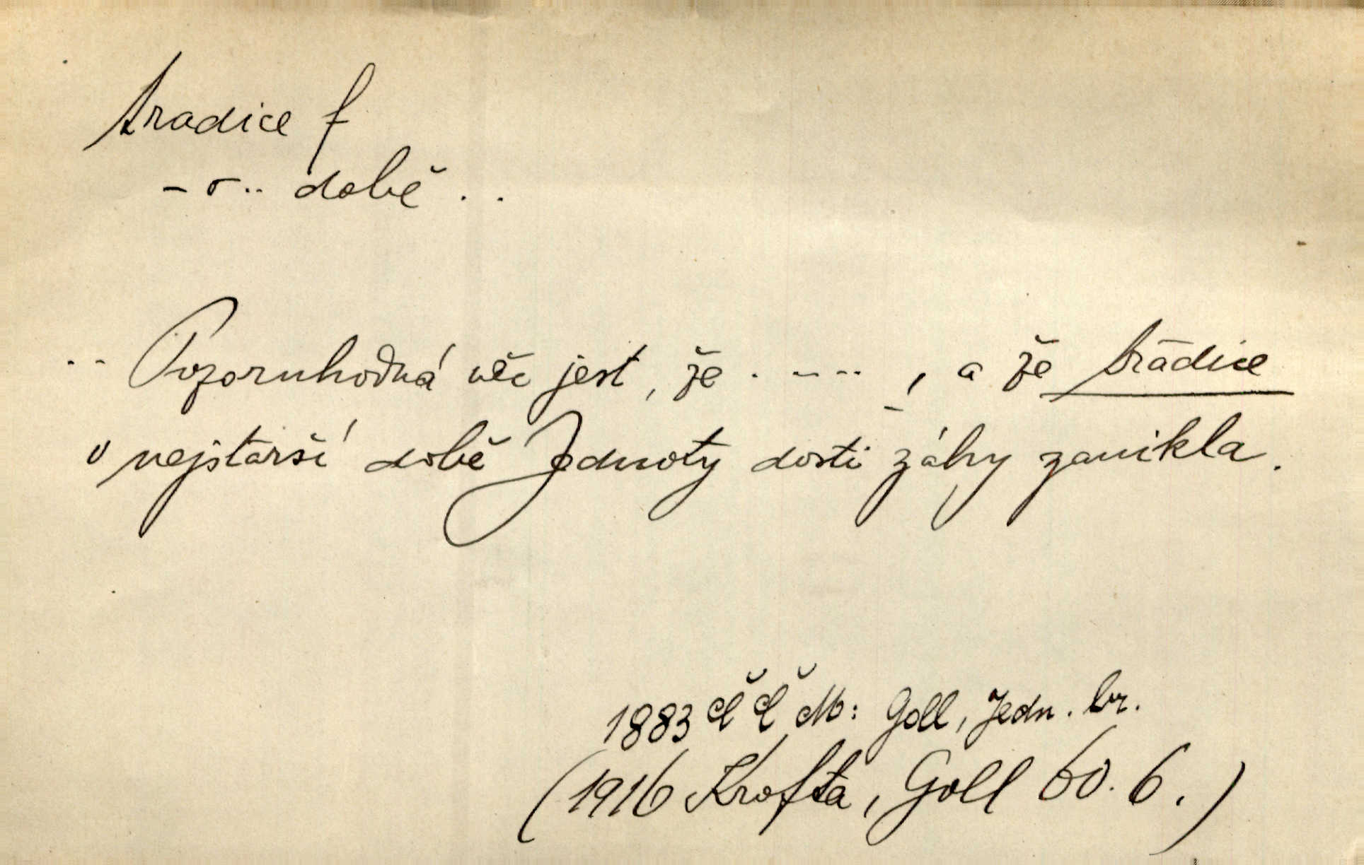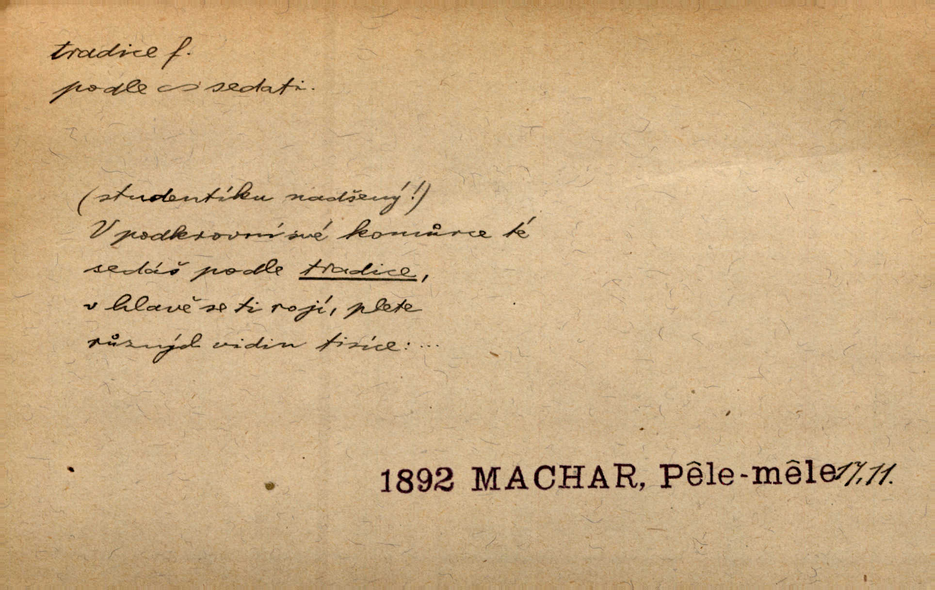 - tradice, -e (zast. tradicie, -ie, tradicí, -í) (vysl. -y-) f. souhrn zvyklostí, obyčejů, názorů, myšlenek a pod. přecházející s jedné generace na druhou a tvořící souvislý vztah k minulosti. Vážila si svých dědů, všechny ty rodinné tradice byly jí posvátny. Herrm. Chtěla, aby se dcera vdala zase do chalupy, do poměrů odpovídajících dávným zdejším tradicím. Šlej. Náš pan Devátý byl narozen již v Čechách, ale tradice a přesvědčení jeho byly po otci i po matce francouzské a republikánské. Staš. [Vlastenci] za žádnou cenu nedali se odtrhnouti od živé tradice svých dob. V. Mrš. [Ariosto byl] příliš svérázný, než aby byl se staral o ducha tradic zašlých věků. Zey. [Matěj z Janova] držev se vždy podstatného základu církevní tradicie, nemohl ovšem důležité váhy míti. Pal. Vzpomeňme, že to byl u nás prvý Jiří Wolker, kdo hlásal návrat k české tradici, zejména k Erbenovi. Čteme. Spor Starých s Moderními rozbil staré tradice. Tille. D Práv. skutečné n. formální odevzdání věci movité, jímž se převádí její vlastnictví s jedné osoby na druhou. D zprávy přenášené obyč. ústně s pokolení na pokolení, ústní podání. Malé obezděné návrší jest dle tradice bývalá vinice sv. Vácslava. Zap. Ti [tři králové] z dálných přišli zemí, ale jiné jich bylo vzezření, než z doby dětství a z běžných si je tradic představujem. Vrch. [Pulkava] také první jal se kontrolovati tradicí českou starými německými zprávami. Pal. Círk. [u katolíků] pramen křesťanského učení, který není obsažen v Písmě svatém, ústní podání.