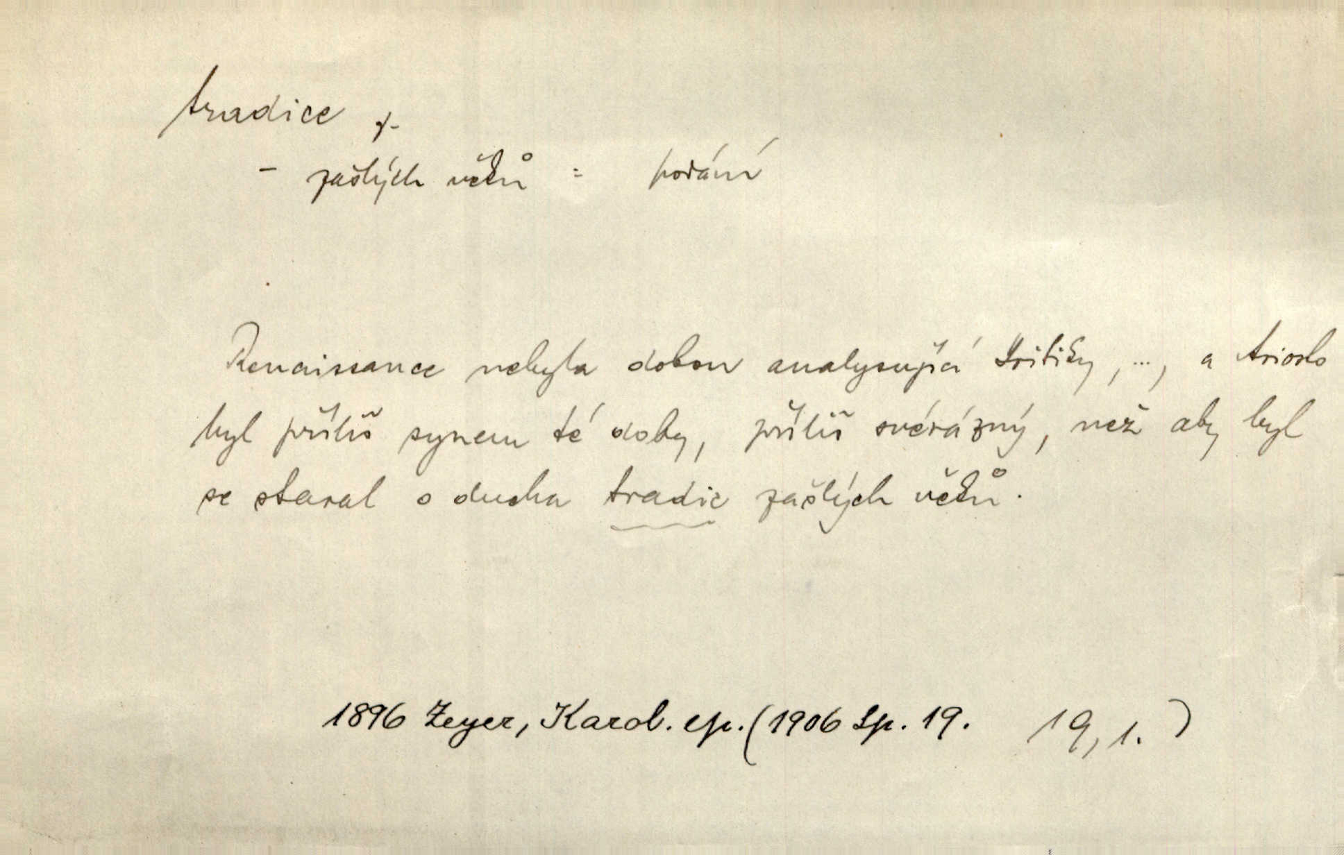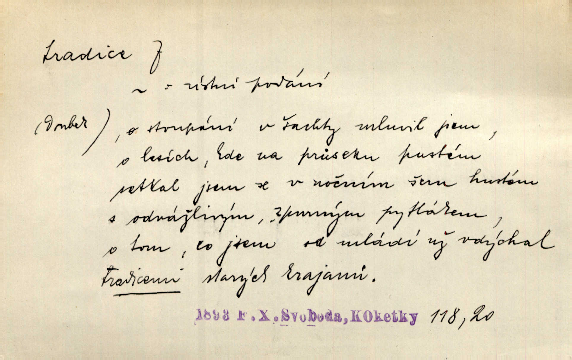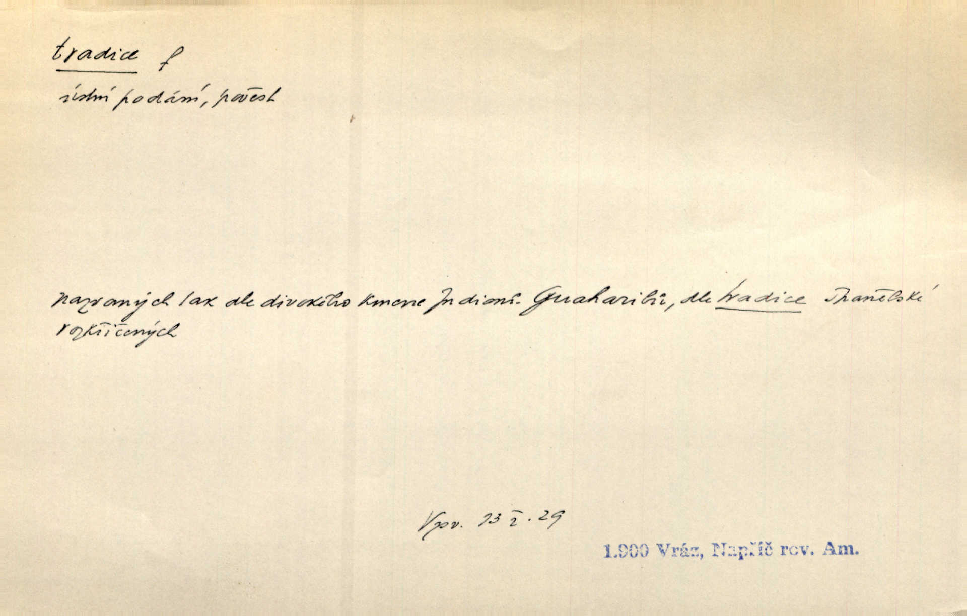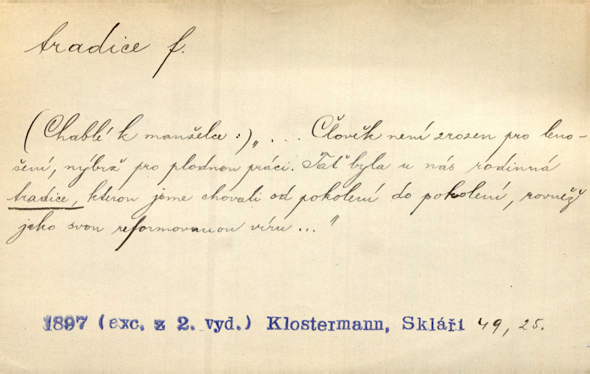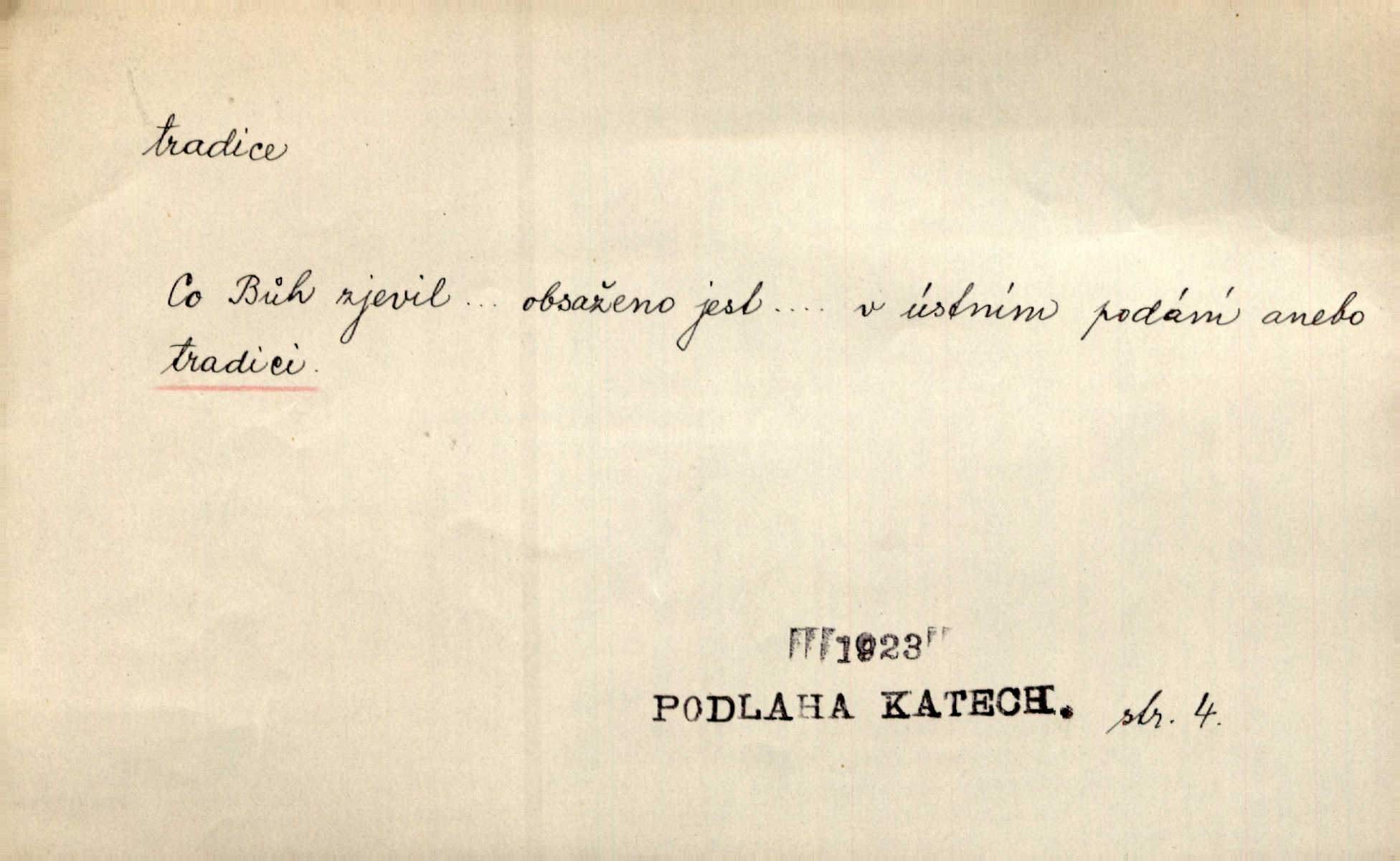 - tradice, -e (zast. tradicie, -ie, tradicí, -í) (vysl. -y-) f. souhrn zvyklostí, obyčejů, názorů, myšlenek a pod. přecházející s jedné generace na druhou a tvořící souvislý vztah k minulosti. Vážila si svých dědů, všechny ty rodinné tradice byly jí posvátny. Herrm. Chtěla, aby se dcera vdala zase do chalupy, do poměrů odpovídajících dávným zdejším tradicím. Šlej. Náš pan Devátý byl narozen již v Čechách, ale tradice a přesvědčení jeho byly po otci i po matce francouzské a republikánské. Staš. [Vlastenci] za žádnou cenu nedali se odtrhnouti od živé tradice svých dob. V. Mrš. [Ariosto byl] příliš svérázný, než aby byl se staral o ducha tradic zašlých věků. Zey. [Matěj z Janova] držev se vždy podstatného základu církevní tradicie, nemohl ovšem důležité váhy míti. Pal. Vzpomeňme, že to byl u nás prvý Jiří Wolker, kdo hlásal návrat k české tradici, zejména k Erbenovi. Čteme. Spor Starých s Moderními rozbil staré tradice. Tille. D Práv. skutečné n. formální odevzdání věci movité, jímž se převádí její vlastnictví s jedné osoby na druhou. D zprávy přenášené obyč. ústně s pokolení na pokolení, ústní podání. Malé obezděné návrší jest dle tradice bývalá vinice sv. Vácslava. Zap. Ti [tři králové] z dálných přišli zemí, ale jiné jich bylo vzezření, než z doby dětství a z běžných si je tradic představujem. Vrch. [Pulkava] také první jal se kontrolovati tradicí českou starými německými zprávami. Pal. Círk. [u katolíků] pramen křesťanského učení, který není obsažen v Písmě svatém, ústní podání.