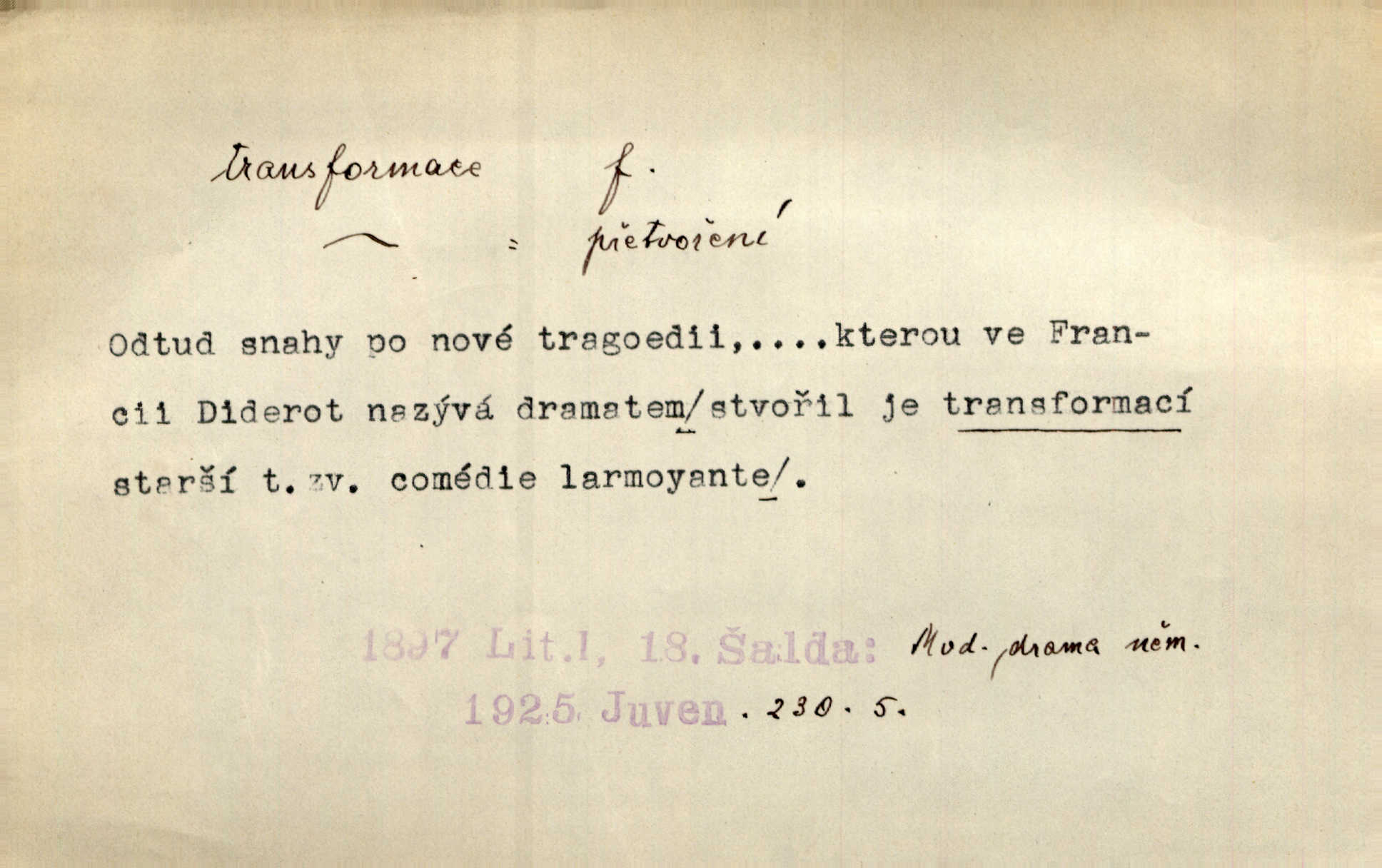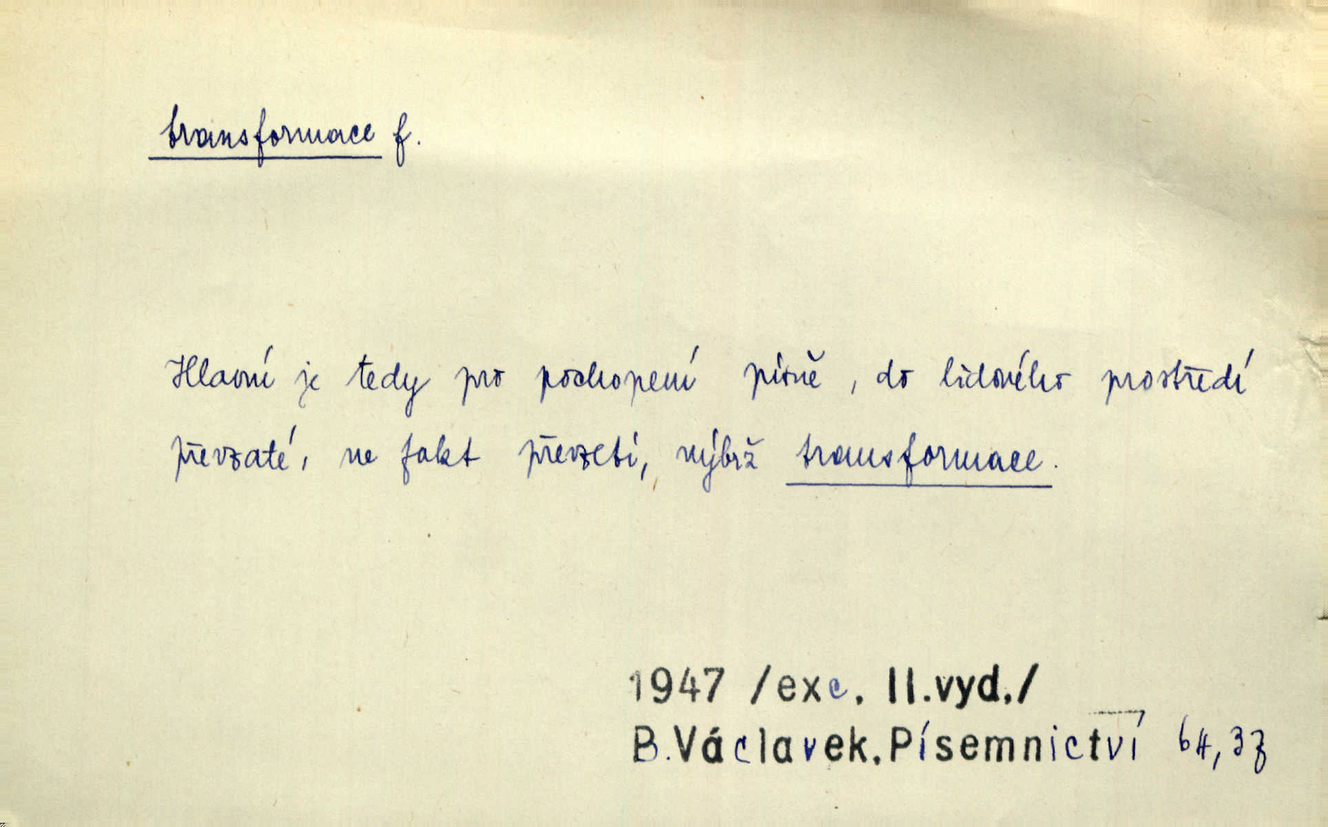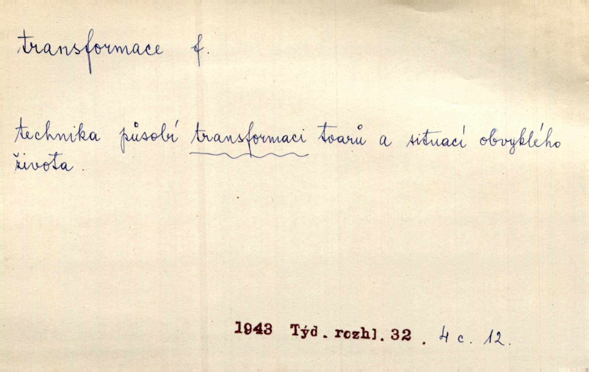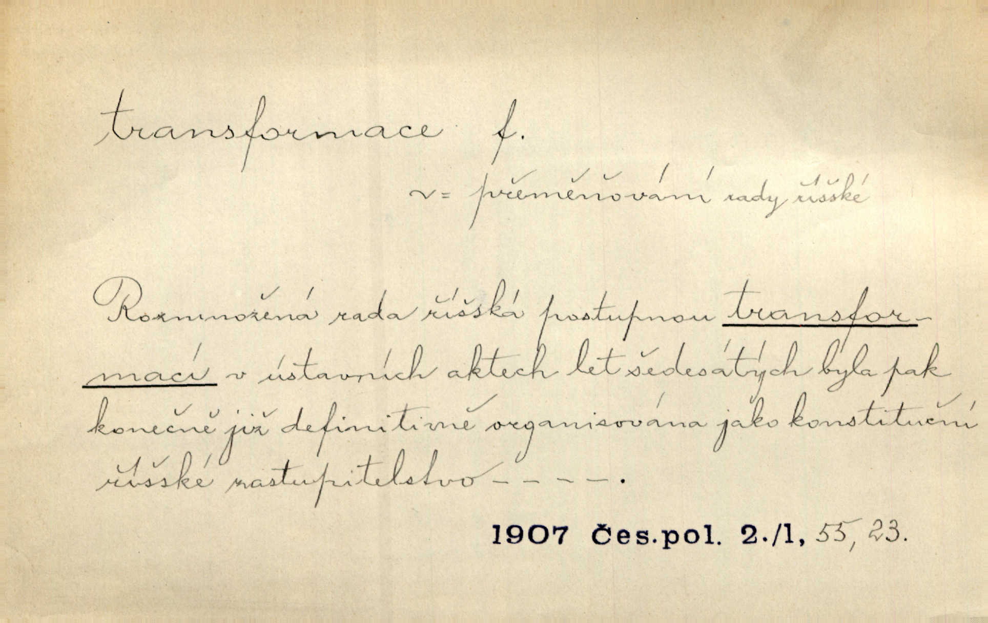 - transformace, -e f. přeměnění, přetvoření. Stvořil je [Diderot drama] transformací starší t. zv. comédie larmoyante. Šal. Rozmnožená rada říšská postupnou transformací v ústavních aktech let šedesátých byla definitivně organisována jako konstituční říšské zastupitelstvo. Čes. pol. Technika je transformace přírody aktivností sociologickou. Pour. El. tech. přeměna daného druhu elektrického proudu v jiný; přeměna střídavého proudu v proud o jiném napětí induktivním způsobem. Fys. transformace souřadnic (v theoretické fysice) převedení daného jevu do jiné souřadnicové soustavy. Mat. transformace rovnic z dané rovnice odvození jiné rovnice, jejíž kořeny jsou v určitém algebraickém vztahu ke kořenům rovnice dané. Geom. transformace útvarů způsob proměny geometrického útvaru v útvar nový, odpovídající původnímu podle určitého zákona. Transformace souřadnic proměna, posunutí soustavy souřadnic. Transformace průmětů nahrazení daných průměten novými průmětnami s přesně vymezeným vztahem k útvaru původnímu.