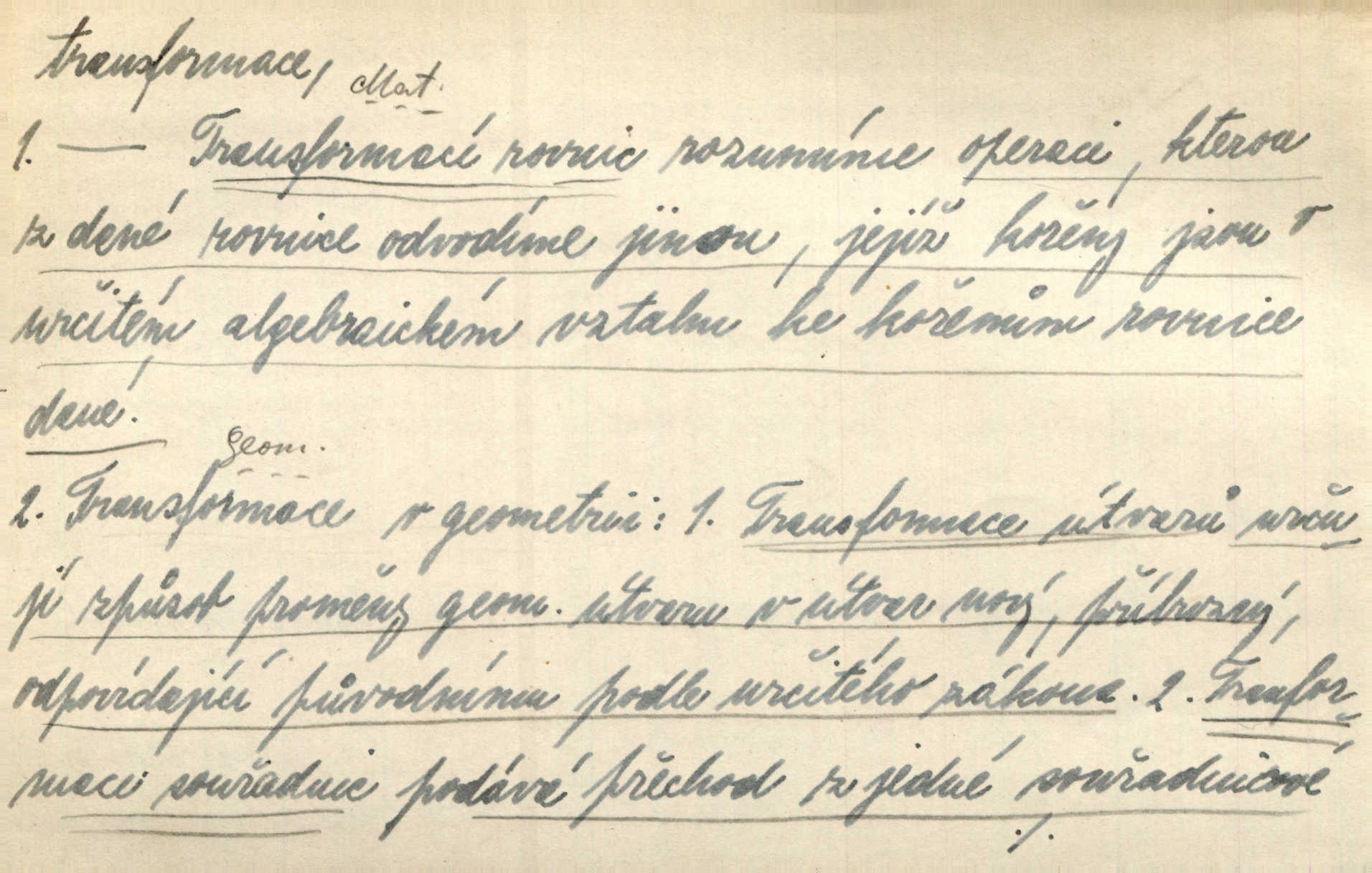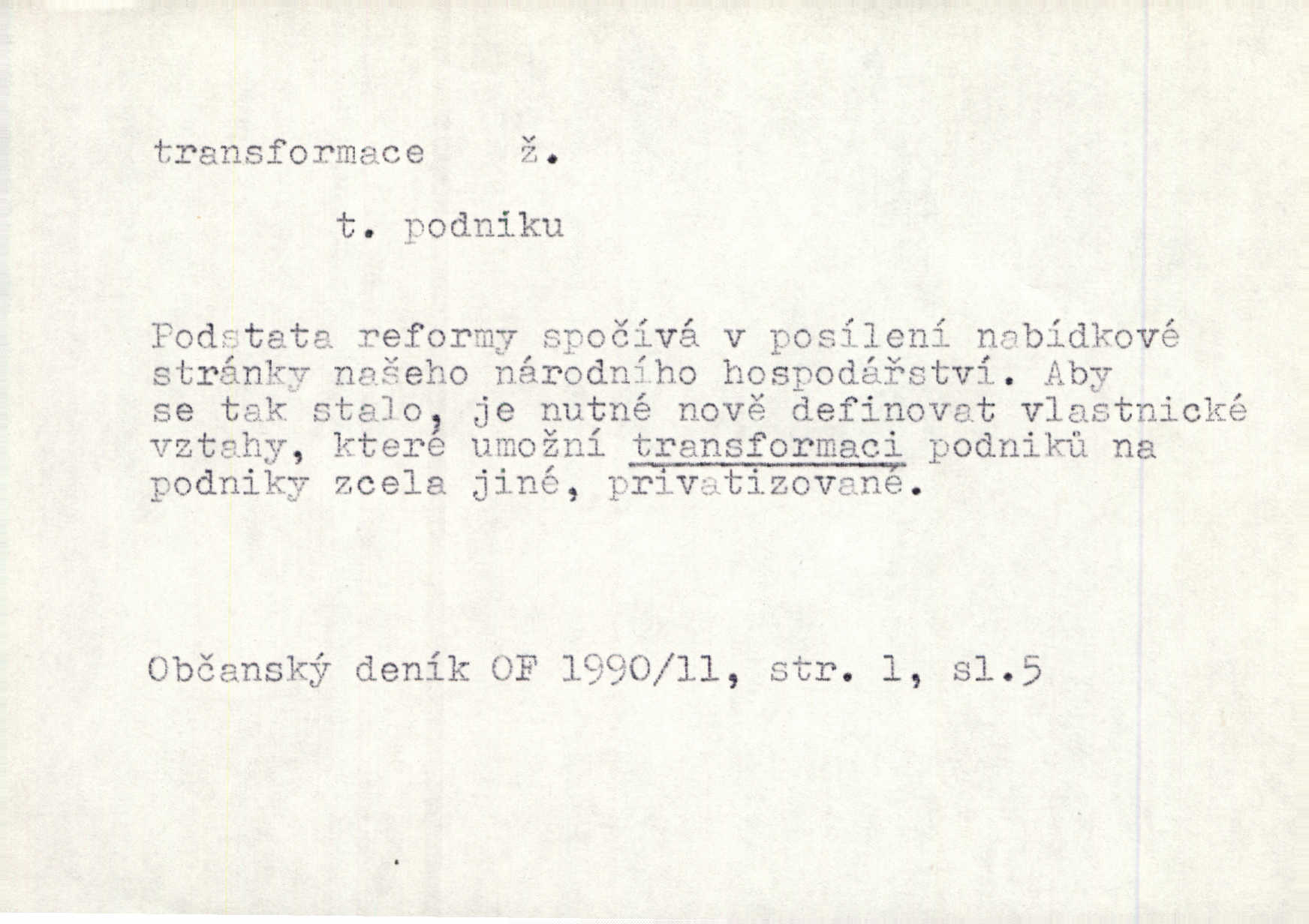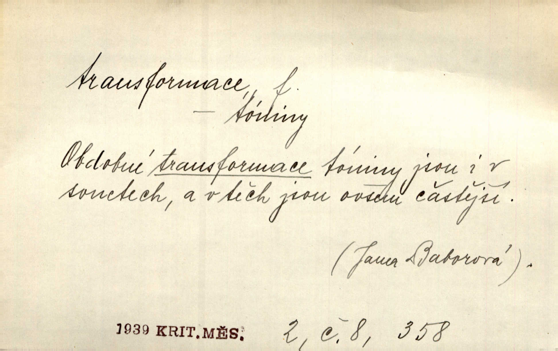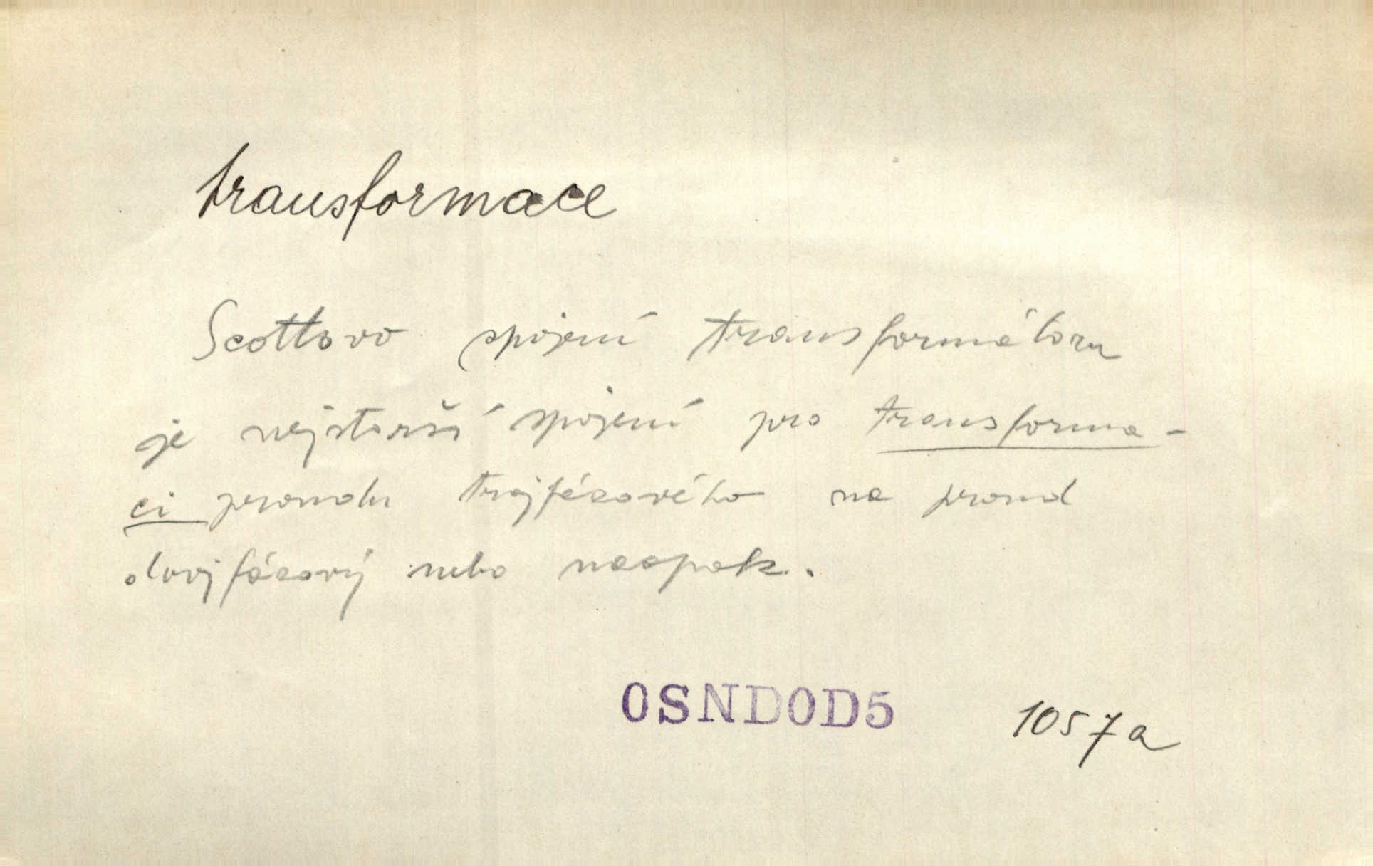 - transformace, -e f. přeměnění, přetvoření. Stvořil je [Diderot drama] transformací starší t. zv. comédie larmoyante. Šal. Rozmnožená rada říšská postupnou transformací v ústavních aktech let šedesátých byla definitivně organisována jako konstituční říšské zastupitelstvo. Čes. pol. Technika je transformace přírody aktivností sociologickou. Pour. El. tech. přeměna daného druhu elektrického proudu v jiný; přeměna střídavého proudu v proud o jiném napětí induktivním způsobem. Fys. transformace souřadnic (v theoretické fysice) převedení daného jevu do jiné souřadnicové soustavy. Mat. transformace rovnic z dané rovnice odvození jiné rovnice, jejíž kořeny jsou v určitém algebraickém vztahu ke kořenům rovnice dané. Geom. transformace útvarů způsob proměny geometrického útvaru v útvar nový, odpovídající původnímu podle určitého zákona. Transformace souřadnic proměna, posunutí soustavy souřadnic. Transformace průmětů nahrazení daných průměten novými průmětnami s přesně vymezeným vztahem k útvaru původnímu.