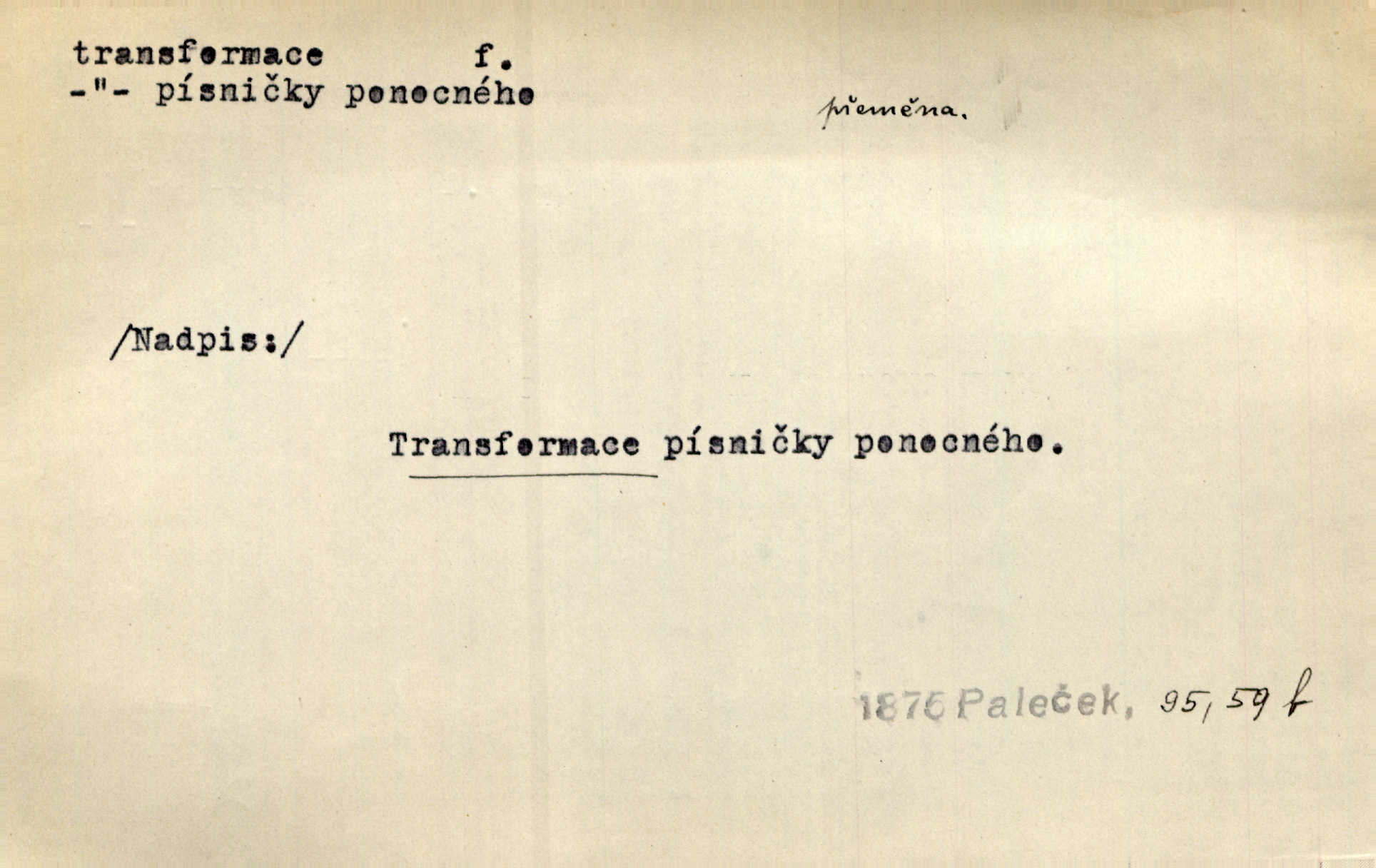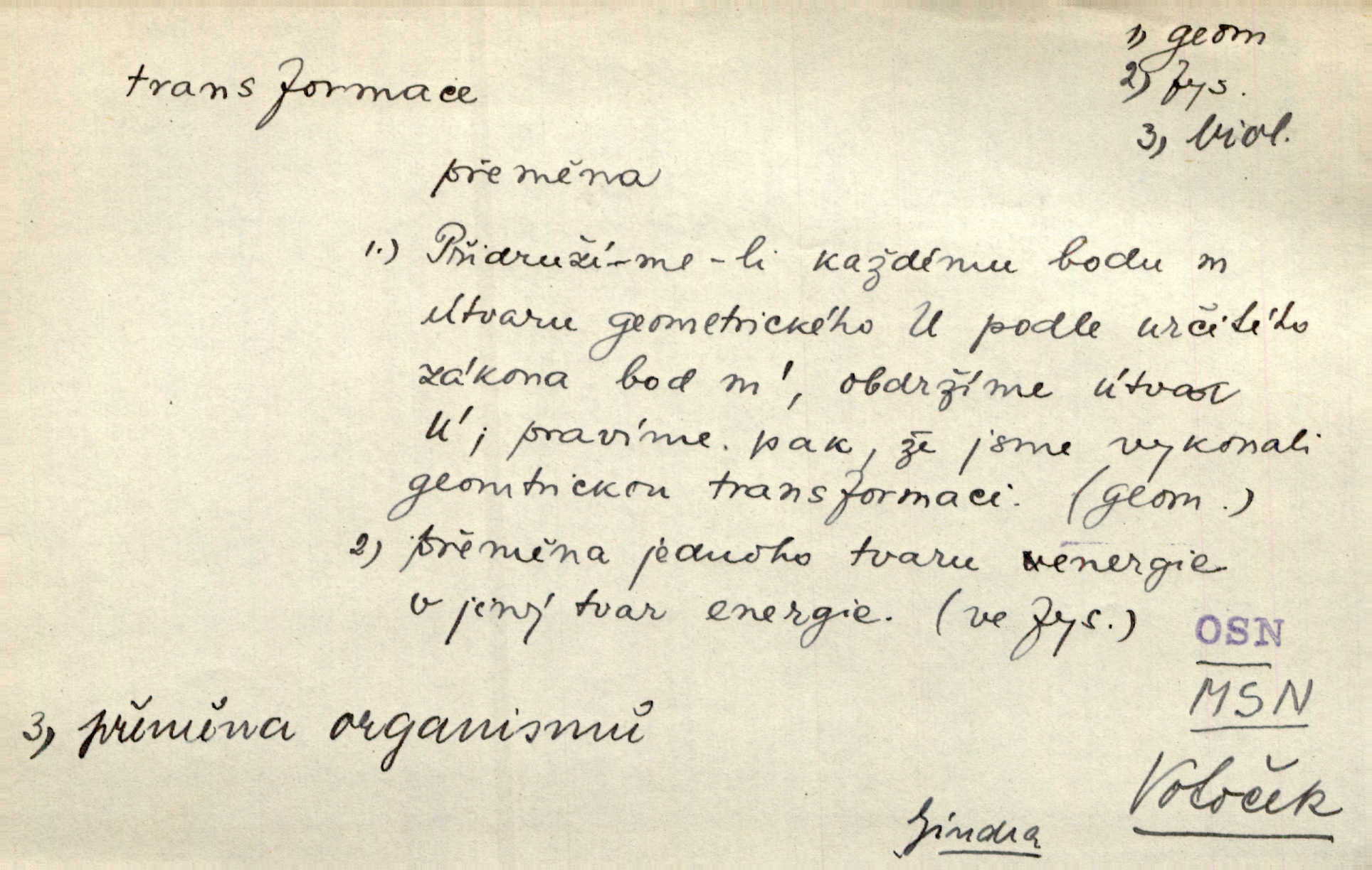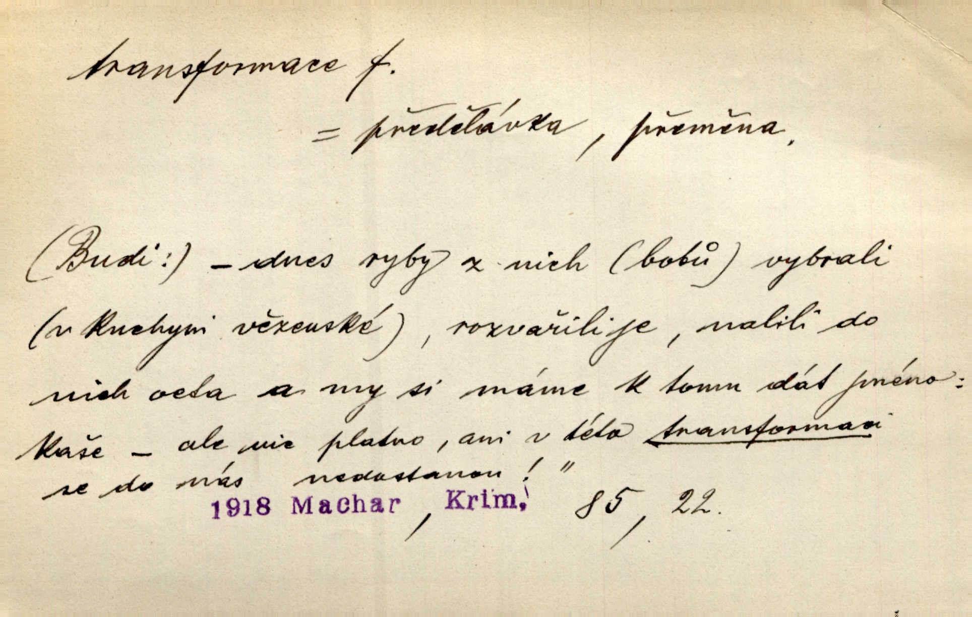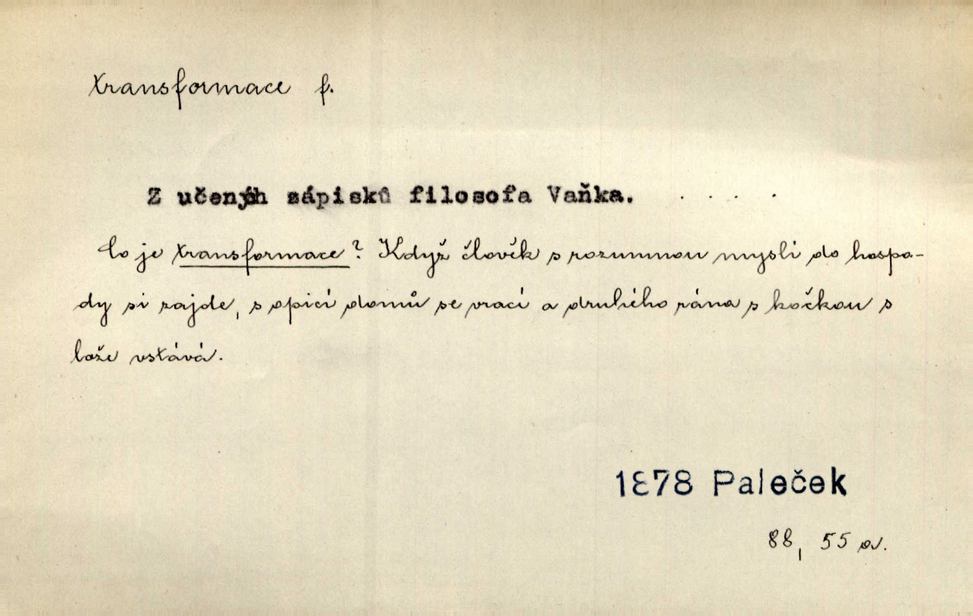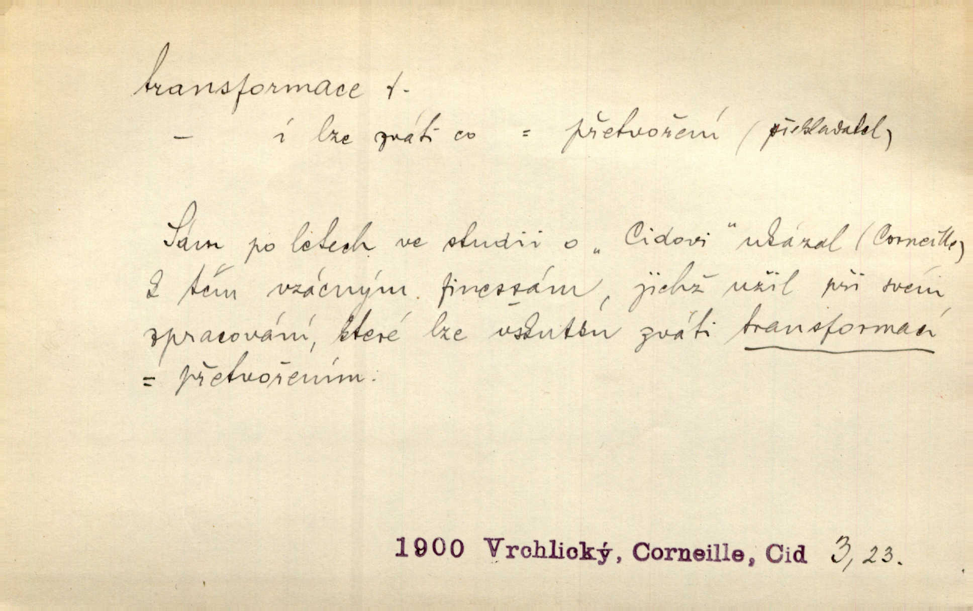 - transformace, -e f. přeměnění, přetvoření. Stvořil je [Diderot drama] transformací starší t. zv. comédie larmoyante. Šal. Rozmnožená rada říšská postupnou transformací v ústavních aktech let šedesátých byla definitivně organisována jako konstituční říšské zastupitelstvo. Čes. pol. Technika je transformace přírody aktivností sociologickou. Pour. El. tech. přeměna daného druhu elektrického proudu v jiný; přeměna střídavého proudu v proud o jiném napětí induktivním způsobem. Fys. transformace souřadnic (v theoretické fysice) převedení daného jevu do jiné souřadnicové soustavy. Mat. transformace rovnic z dané rovnice odvození jiné rovnice, jejíž kořeny jsou v určitém algebraickém vztahu ke kořenům rovnice dané. Geom. transformace útvarů způsob proměny geometrického útvaru v útvar nový, odpovídající původnímu podle určitého zákona. Transformace souřadnic proměna, posunutí soustavy souřadnic. Transformace průmětů nahrazení daných průměten novými průmětnami s přesně vymezeným vztahem k útvaru původnímu.