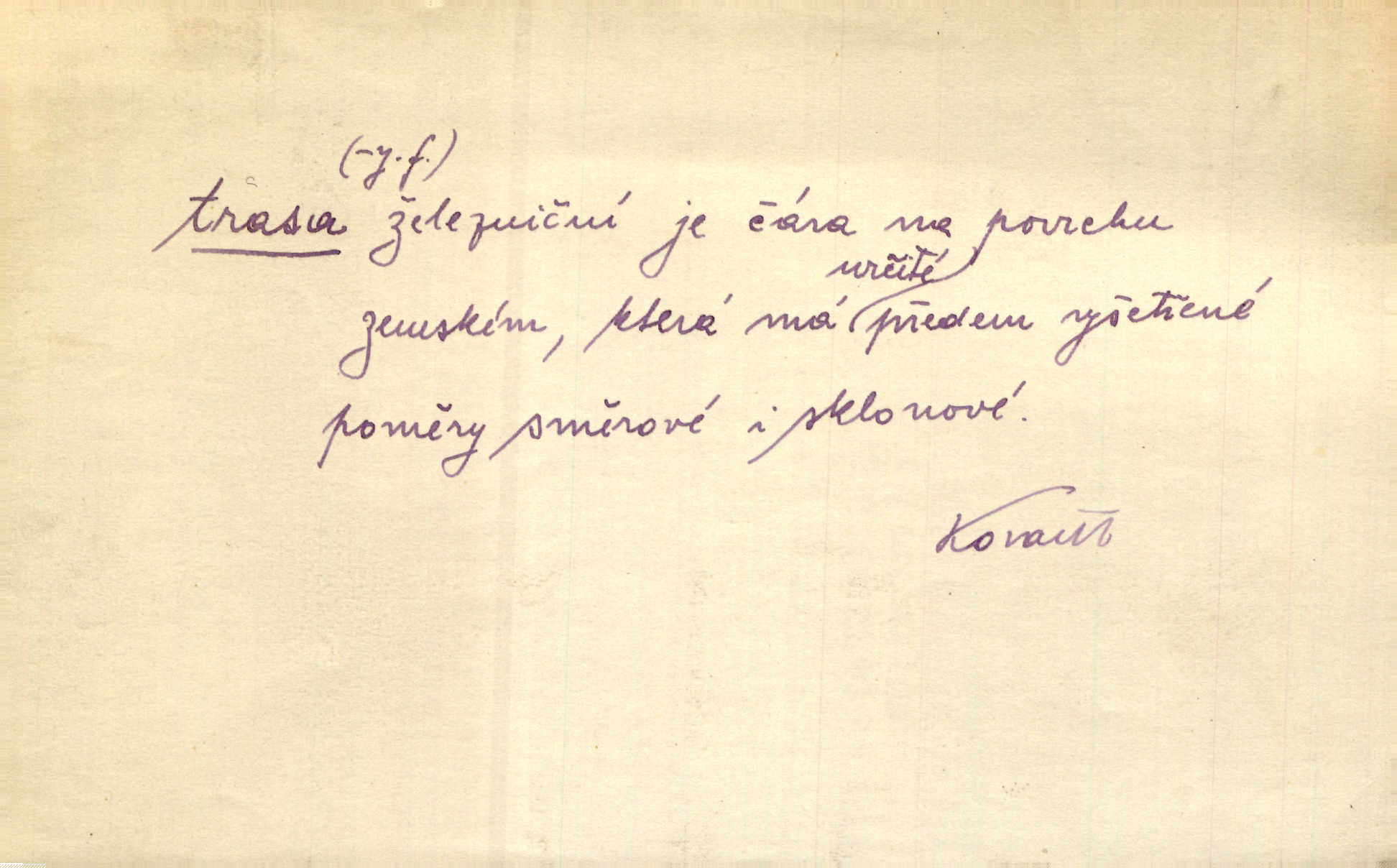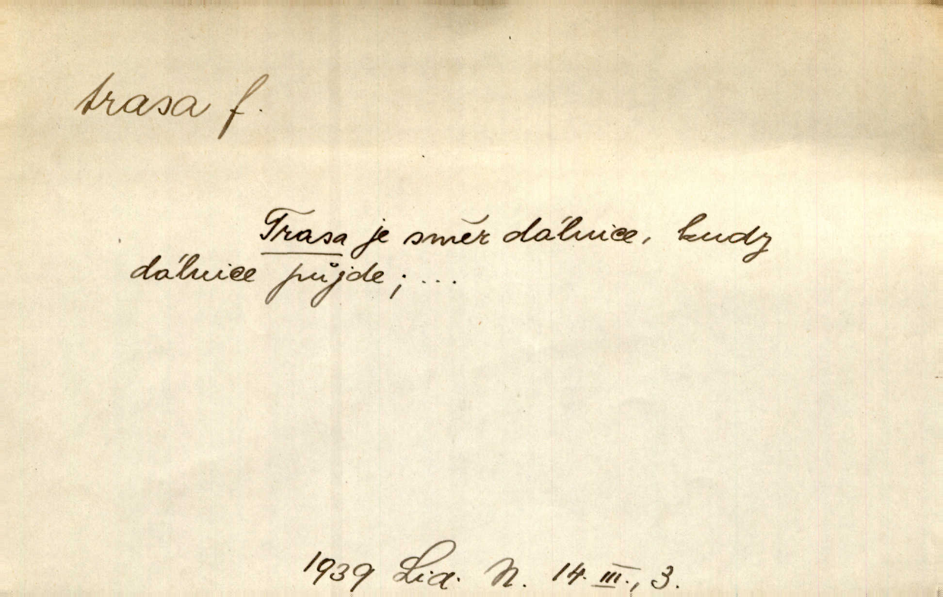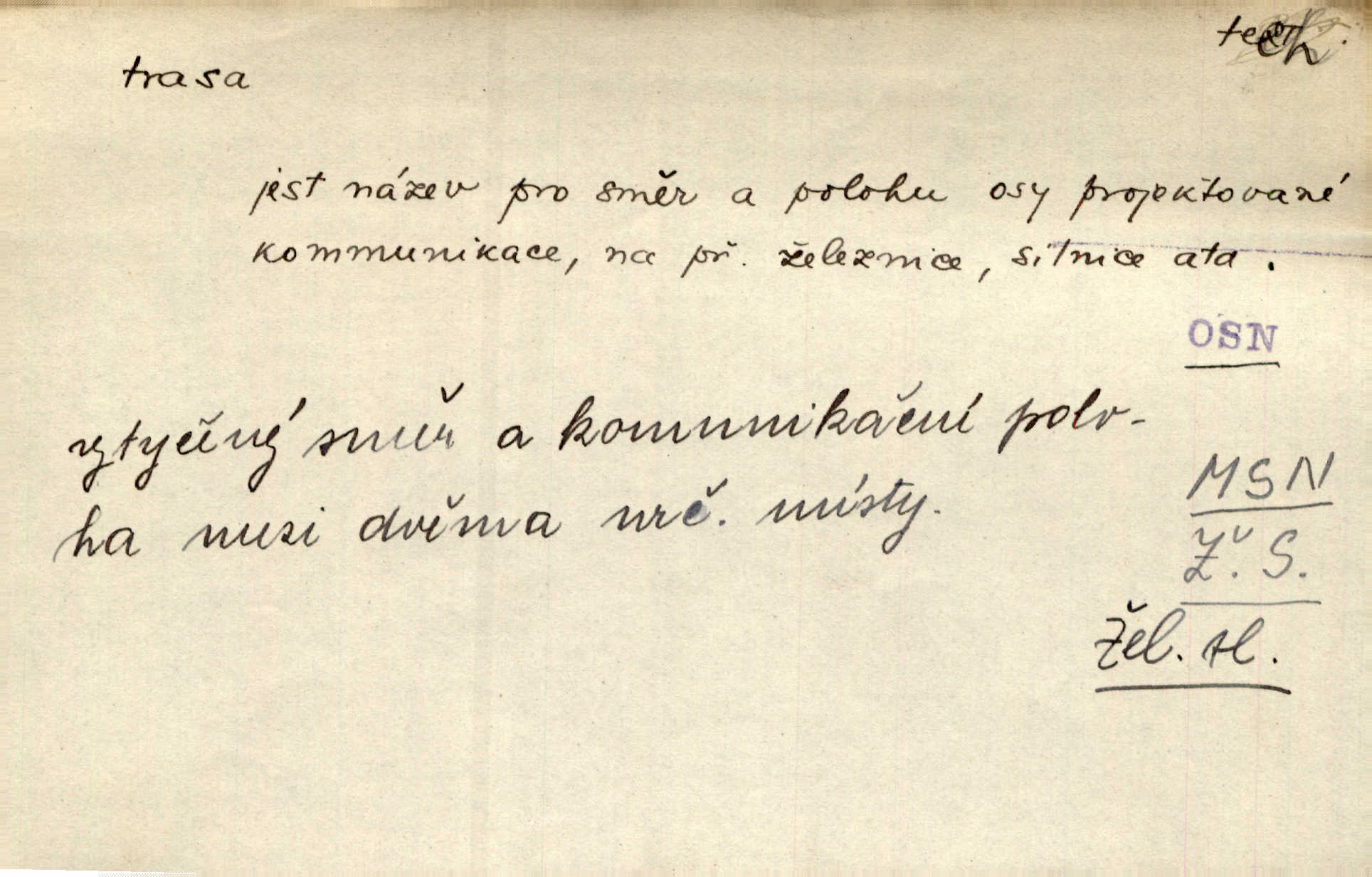 - trasa, -y f. geod. linie na povrchu zemském, mající pevně vyšetřené poměry směrové i sklonové. Stav. vytyčení dopravní cesty (dráhy, silnice, vodní cesty a j.). Voj. vytyčení směru umístění zákopů n. opevňovacího systému.