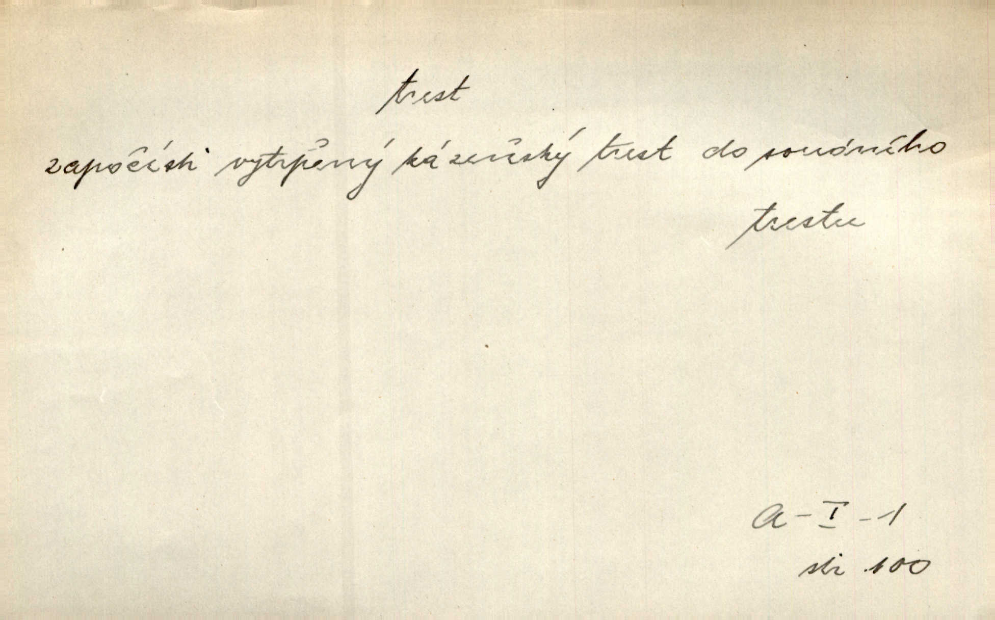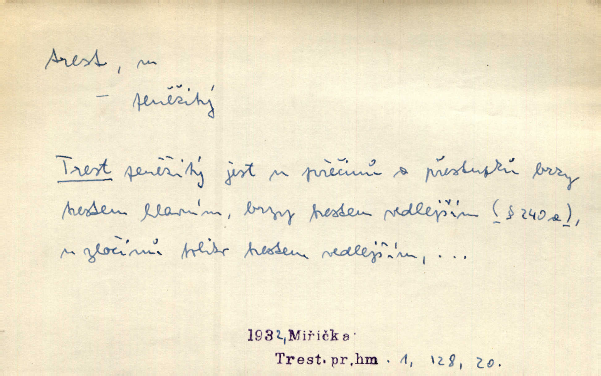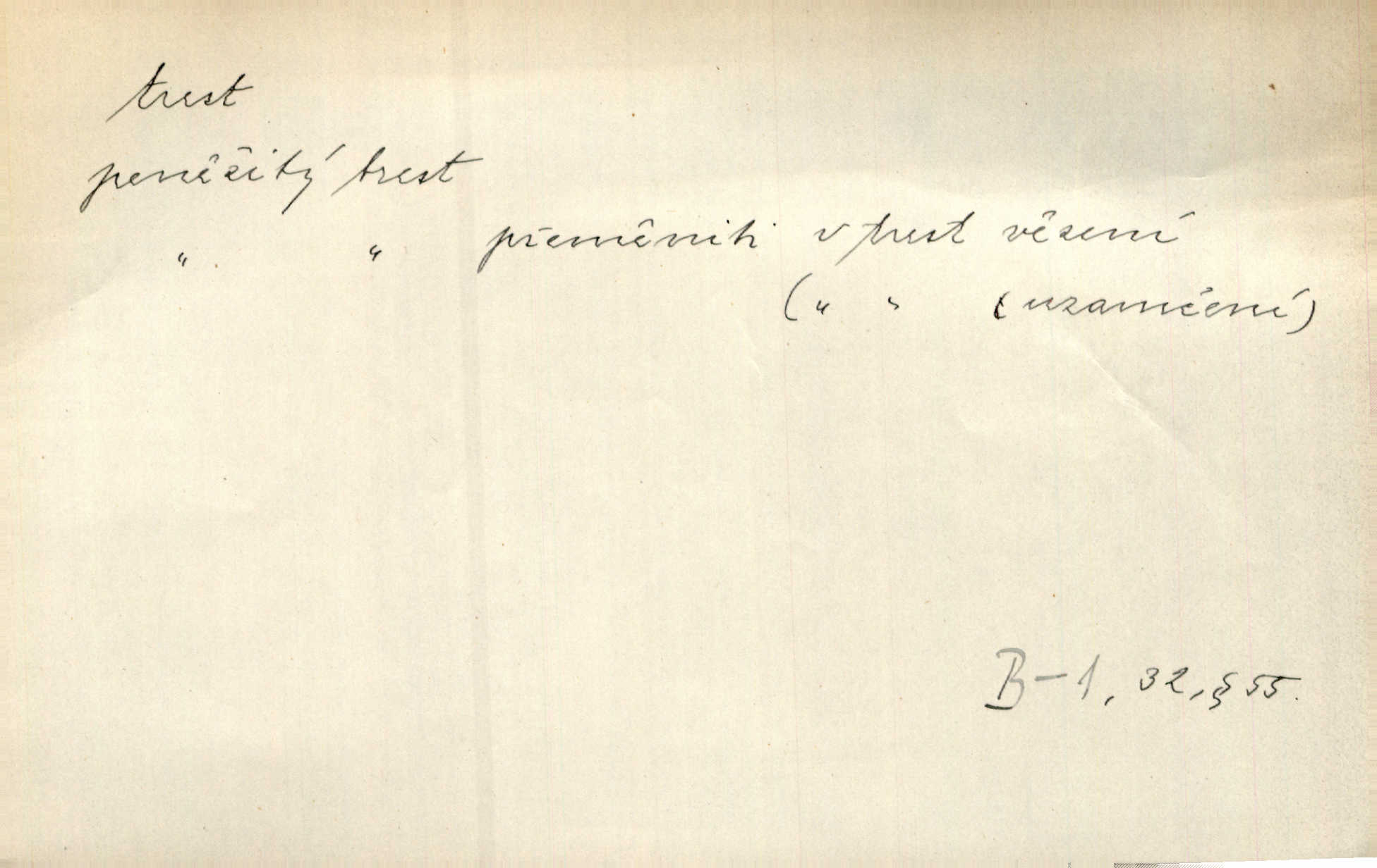 - trest, -u m. újma n. nepříjemnost způsobovaná někomu jako odplata za větší n. menší provinění. Jen na základě zákona možno tresty hrozit a je ukládat. Ústava. Oba misionáři kázali proti kacířským knihám a hrozili časnými i věčnými tresty. Herb. Boží trest padá na tebe za tvoje lehkovážné jednání. Šmil. Nařídili pod trestem smrti, že nesmí nikdo ani z nich [vesnic]‚ ani do nich. Jir. Vojta ohlásil, že hned nastupuje trest. Rais. [Nápadník] sedne si, jakoby přišel odsedět trest. R. Svob. Syna z trestu na vojnu odvedli. Jir. „A pak ty zatracené břečky venku!“ horlíval mistr Kondelík. „Z trestu aby je do sebe lil!“ Herrm. Za trest jsem musel [z letadla] skočit dvakrát. Václavík. Denně si přinášela na podpal do kuchyně stohy latinských trestů úkolů dávaných z trestu. Strettiová. Práv. újma uvalovaná na odsouzeného s výchovným cílem státními n. i jinými orgány k tomu příslušnými po předchozím řízení. Tresty světské, církevní. Tresty disciplinární, policejní, pořádkové, soudní. Trest na cti, na majetku, na svobodě, na těle, na životě. Trest vězení, trest žaláře, trest smrti.