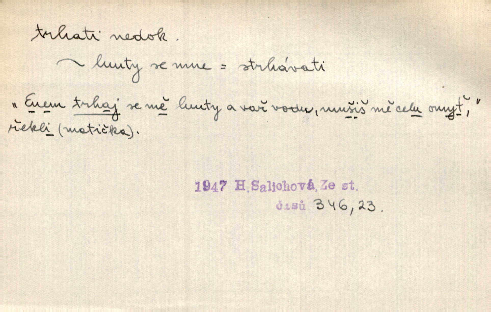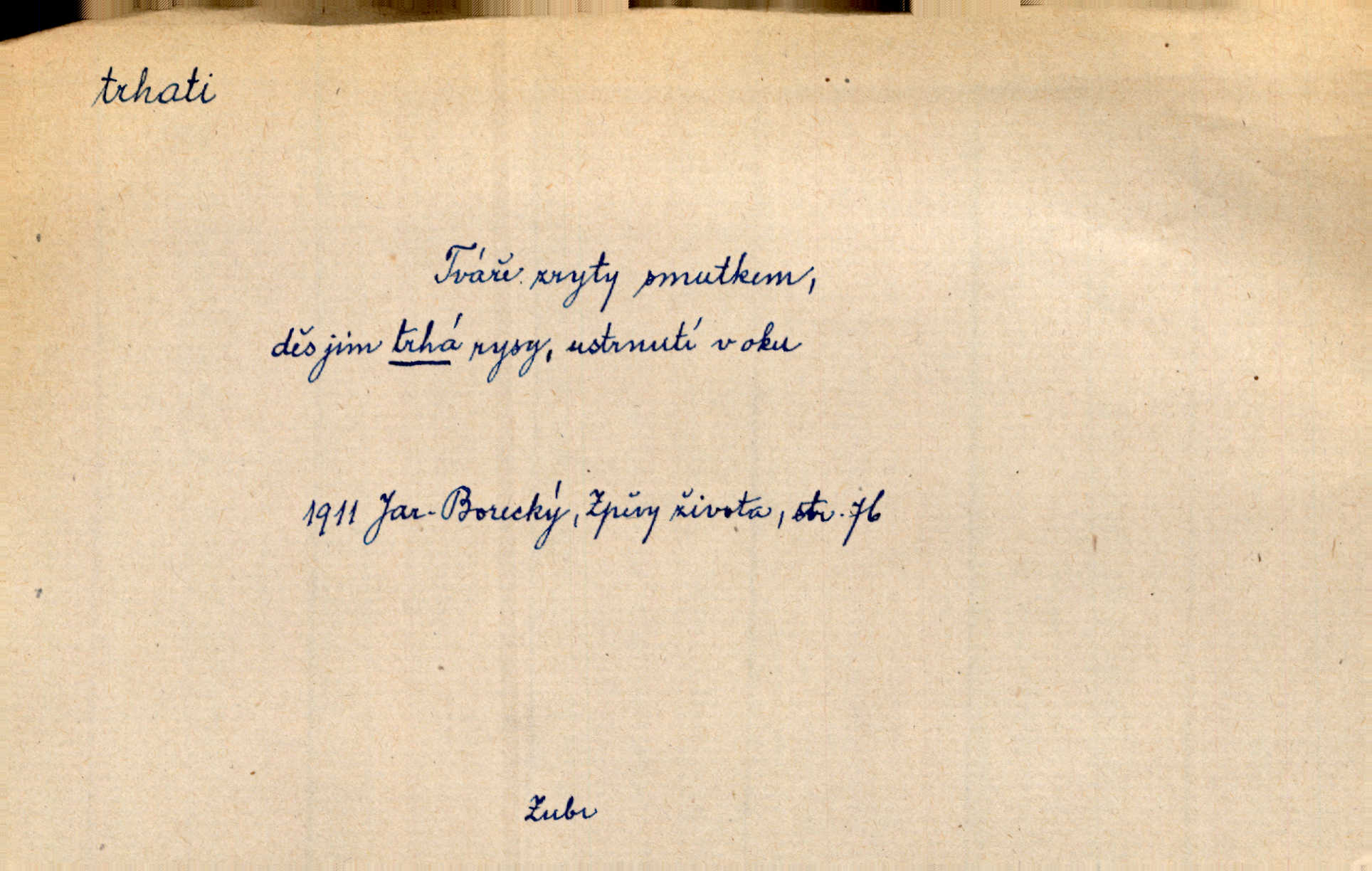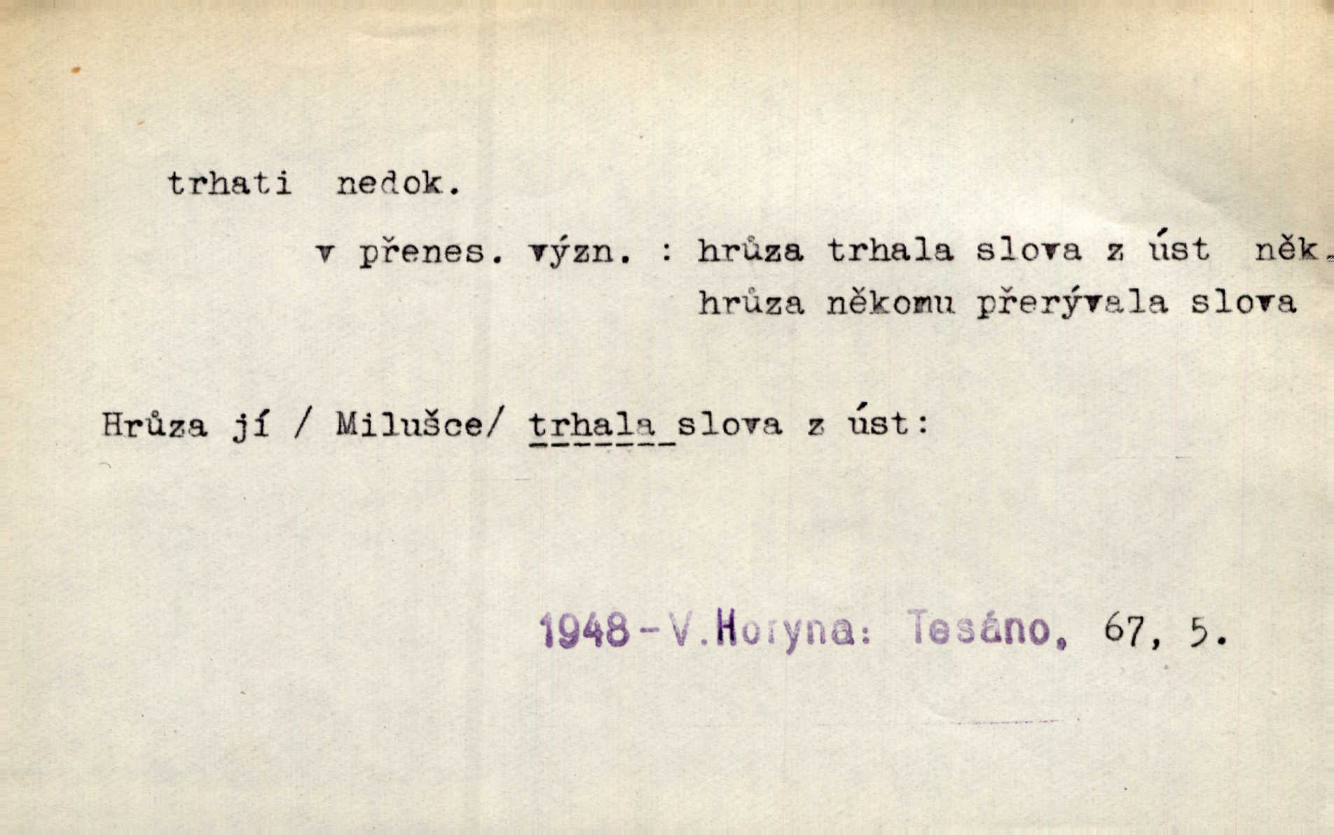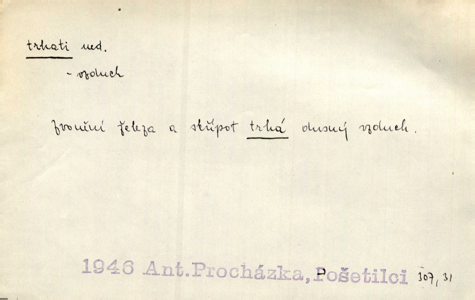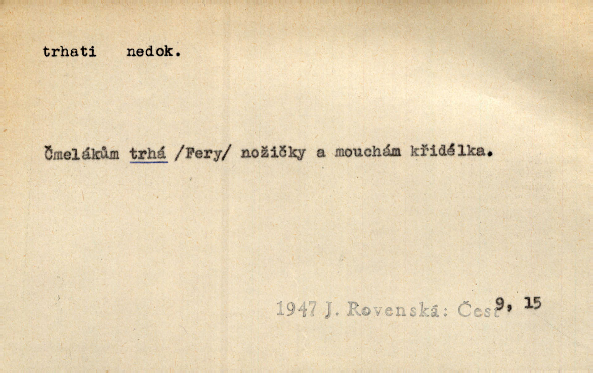 - trhati ned. (čím n. kým) prudce a krátce něčím hýbati n. za něco tahati; něčím n. někým škubati, smýkati, cloumati, lomcovati; trhati se, trhati sebou škubati se, škubati sebou. Ozvaly se pádné rány na dvéře domovní, a někdo prudce trhal zvoncem. Jir. Stojí pod zvonem a zlostně trhá provazem. Baar. Oldra uzdou trhá. Heyd. Koně nepokojně trhají zasněženýma ušima. A. Mrš. Trhala jím zima. Nor. Smělcem trhá vztek. V. Nej. Pes zvyklý svobodě trhal se na řetězu jako zběsilý. Baar. Vozka ve dveřích oznamoval, že koně sebou trhají. V. Mrš. Trhala sebou divoce v divokých snech. Svět. Ruka křečovitě sebou trhala. Vlč. Čím dál, tím více sebou trhaly svaly jejího obličeje. Herrm. Kolikrát to jejími rty trhalo, oči se kalily. Koudelák. Přen. Cosi smutného, lítostného, sklamaného trhalo mu srdcem. Svob. D (koho) rváti, sápati, drásati někoho (zvl. o dravé zvěři); trhati se (s kým) rváti se s někým. Vjede mu do vlasů, začne ho trhat a lomcovat jím. Něm. Máme dva zlé psy, kteří každého cizího trhají. Brodský. Vlk lapá, trhá a dáví ovce. J. z Hv. Trhají v zubech živé kuře. K. Čap. Vystrčil ji z domu, až byla skoro znak upadla, trhal se s ní, až přišel rychtář. Win. D (co odkud) vytrhávati, vyškubávati, strhávati něco odněkud. Nosičů se tu jen hemží a samou ochotností trhají ti všecko z ruky. Obr. živ. Div, že si netrhali [žebráci] almužnu z rukou. Jir. Trhá listonoši z rukou dopisy. Čech. Trhala bych si vlasy s hlavy, když si všecko rozvážím. Kun. Vítr už trhá listí s topolů na humnech. Svatoš. Hvízdání mnoha set úst trhalo uši drásavě bolelo v uších. Dyk. Přen. Darmo by do ní mluvil a trhal ji ze spaní vytrhoval. Rais. Ten den srdce trhalo se všem. A. Mrš. D trhati se (o koho, oč) podnikati prudký zápas o někoho n. něco; velmi usilovně státi o někoho. Vzpomínala, když za ní chodívali hoši a trhali se o ni k tanci. Staš. Budou-li se o tě tam v Praze trhati jako zde, nepovede se ti zle. Kosm. [Obrazy] brzy neobyčejné obliby došly, a lidé se o ně takořka trhali. Lum. Trhají [se] o tvůj povoz, o tvé lidi a koně. Zap. Pak vlky vyrušili, jak se trhali o koňskou zdechlinu u cesty. Jir. D trhati (co) škubnutím oddělovati od lodyhy, větve a p. (obyč. květiny n. plody). Sehnuvši se trhala kvítí. Jir. Když byla žena s trháním [jahod] hotova, vrátily jsme se spolu do města. Něm. Trhelte si [oříšky], ale nelamte lísek. Kosm. To byla má radost, pomáhat v poli — okopávat, trávu trhat. Rais. Docházel k dvorskému lánu, na kterém trhaly trhačky len. Jir. Děti rády trhaly proutky, házely je do vody. Něm. Neměl moci zadržeti ji, kdyby se jí zachtělo trhati zapovězené ovoce býti nevěrnou. Schein. Trhej růže, když kvetou využívej vhodné příležitosti. Tůma. Byl bych blázen, kdybych netrhal slívy, když mi zrají. Šmil. Přen. Byl hotov chytit ji do náruče a trhat sladké rozkoše jejího těla. Schein. D (co) něco souvislého rozrušovati, násilně děliti; poškozovati, ničiti; trhati se dostávati trhliny, poškozovati se trháním. Trhali balvany i skalky na štěrk. Rais. Proud ohromné síly se bouřlivě řítil a valil, trhaje skály. Jir. Caterina trhala a střihala plátno horlivě dále. Zey. Mačkává mezi prsty papírovou kuličku, kterou pak trhá na tisíce kousků. Lum. List mu vyškub’, trhal v kousky drobné. Čech. Je mu milý holendr ve mlýně, když trhá krupky. Hampl. Panny trhají závoje nevěst, stávají se řeholnicemi. K. Schulz. Šimon trhal prkna podlahy, sekaje do nich. Svob. Kocour počal trhati maso zuby i pazoury. Herb. Osedlej si kobylu, co budeš trhat boty. Jir. Dělníci pracovali po celou noc, odvážejíce celou horu země, trhanou prachem i dynamitem. B. Beneš. Dělové náboje trhaly se i zde vybuchovaly. R. právo. Když pustila kolovrat, trhala se jí niť. Herb. Stěžeň praská — plachta v dvé se trhá. Čech. Staré látky se trhají, je zapotřebí ustavičné správy. Prav. Záclony oken pod tíží prachu se až trhají. Ner. Vysoké břehy jsou podemlety, lehce se trhají a padají. Mach. Led prostředkem taje a se trhá, puká. Něm. Chmury se ještě přeháněly oblohou, ale již se trhaly. Jir. K tomu ke všemu se s řízků [masa] zase obaly trhaly a spadávaly. Maj. Bavoři se trhali smíchy div se nepotrhali. Hol. U každého sedláka se ho tak ptávali a všady se trhali smíchem. Herb. Tu práci zrovna trhá úporně pracuje. Rais. Uvidí, a první ten Reisek, co si nejvíc trhal hubu zbytečně mnoho mluvil. Klost. Slang. Rád „trhá kulisy“, jak se říká v divadelním žargonu usiluje o drastický efekt. Smet. Přen. Chladně trhal jednu illusi jeho za druhou. Kun. Příjemně zní sem flašinet, jehož jednotlivé zvuky vítr trhá a zanáší. Wojk. Proč trháte zbylé posud svazky [rodinné]? Heyd. Slova se jí lítostí trhala. Šmil. Dnešní její spánek trhal se. Herrm. Tech. trhání dobývání skalin pomocí trhavin, střílení. D trhati (se) vůbec rozdélovati (se), oddělovati (se), děliti (se). A to by bylo pěkné, trhat společnost, že byste se nestyděl! Tůma. Druh neslyší — zaniká v prachu s houfem, jenž počíná se trhati. Jir. [Závodník] přidává, už se trhá předstihuje ostatní. Lid. nov. [Usedlosti] se tenkráte ještě jako teď libovolně trhati nesměly. Svět. Od tebe se trhám a k ženě tě posílám. Svět. Od srdce se jí trhá nejen muž, ale i všechno, co náleželo posud k ní. V. Mrš. D míti trhání ob. pociťovati nutkání, touhu něco podniknout. Měl silné trhání, byl by se nejraději rozjel ven ke Zbraslavi. Jir. Uslyševše o nastávající znamenité svatbě, měli hrozitánské trhání a byli by dali nevím co, kdyby se mohli na tu parádu hezky z blízka podívat. Herrm. [Pes] míval nějaký čas trhání [napadnout drůbež]‚ ale