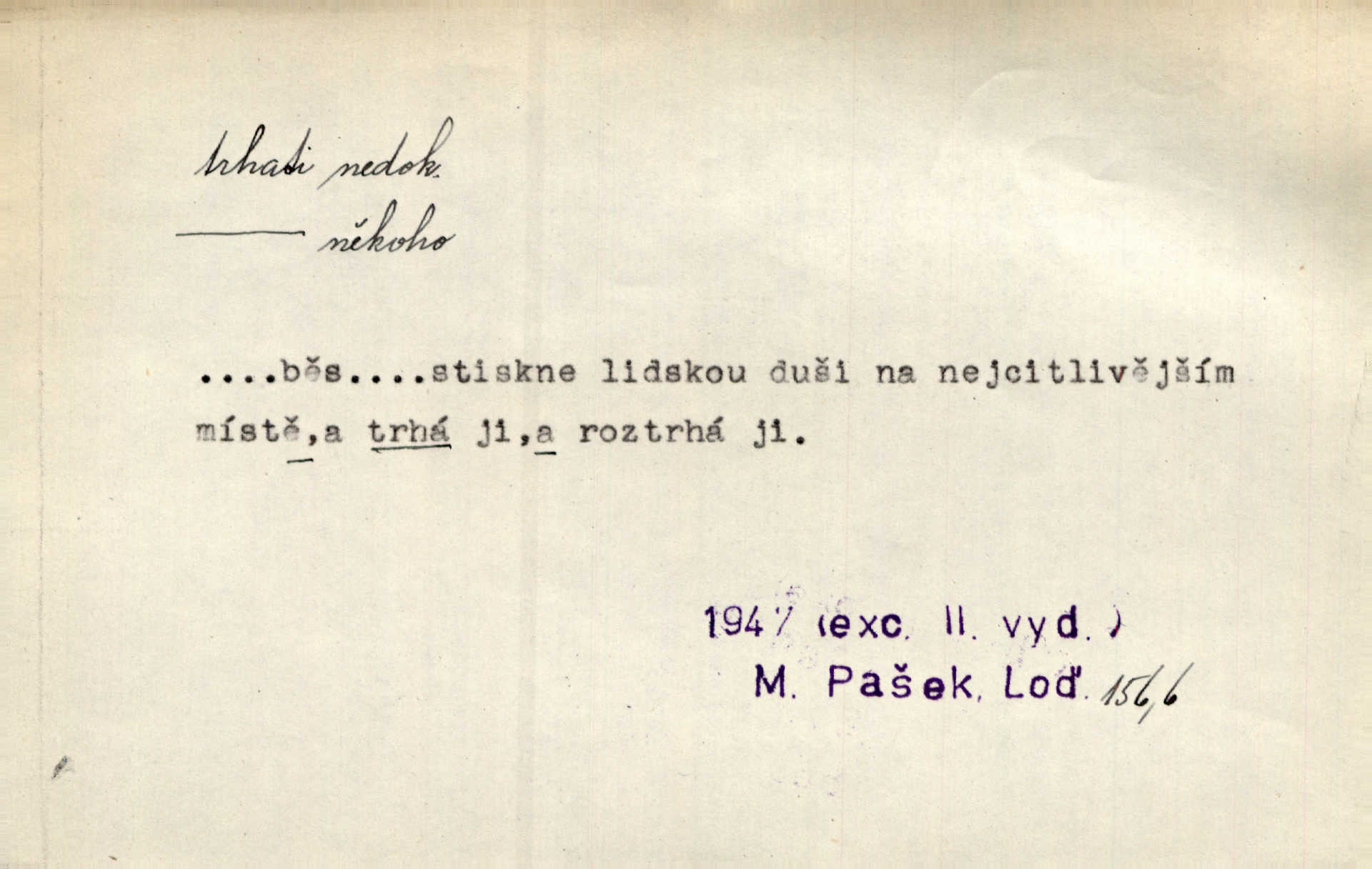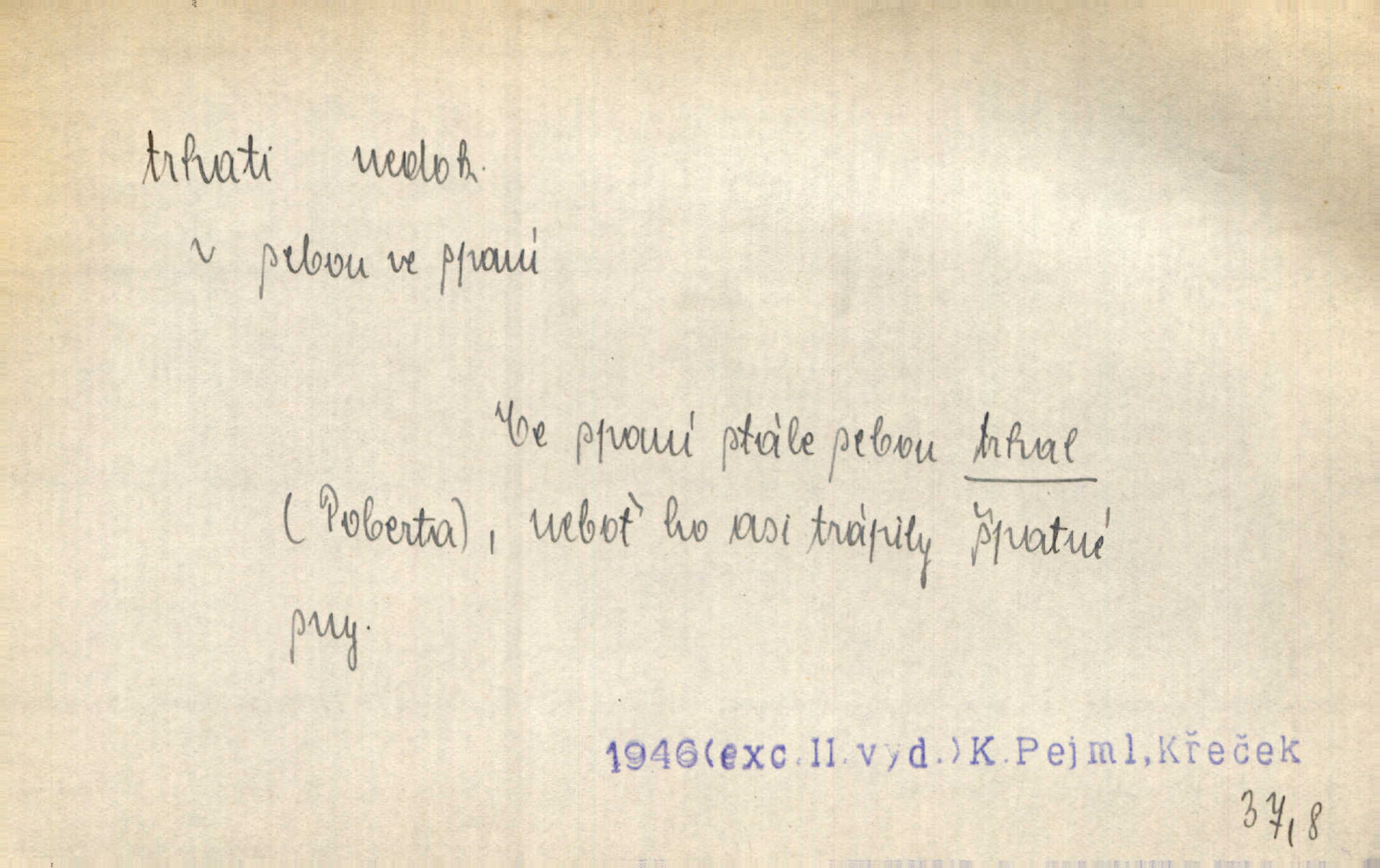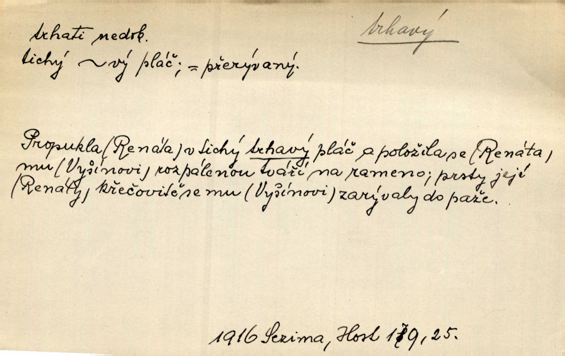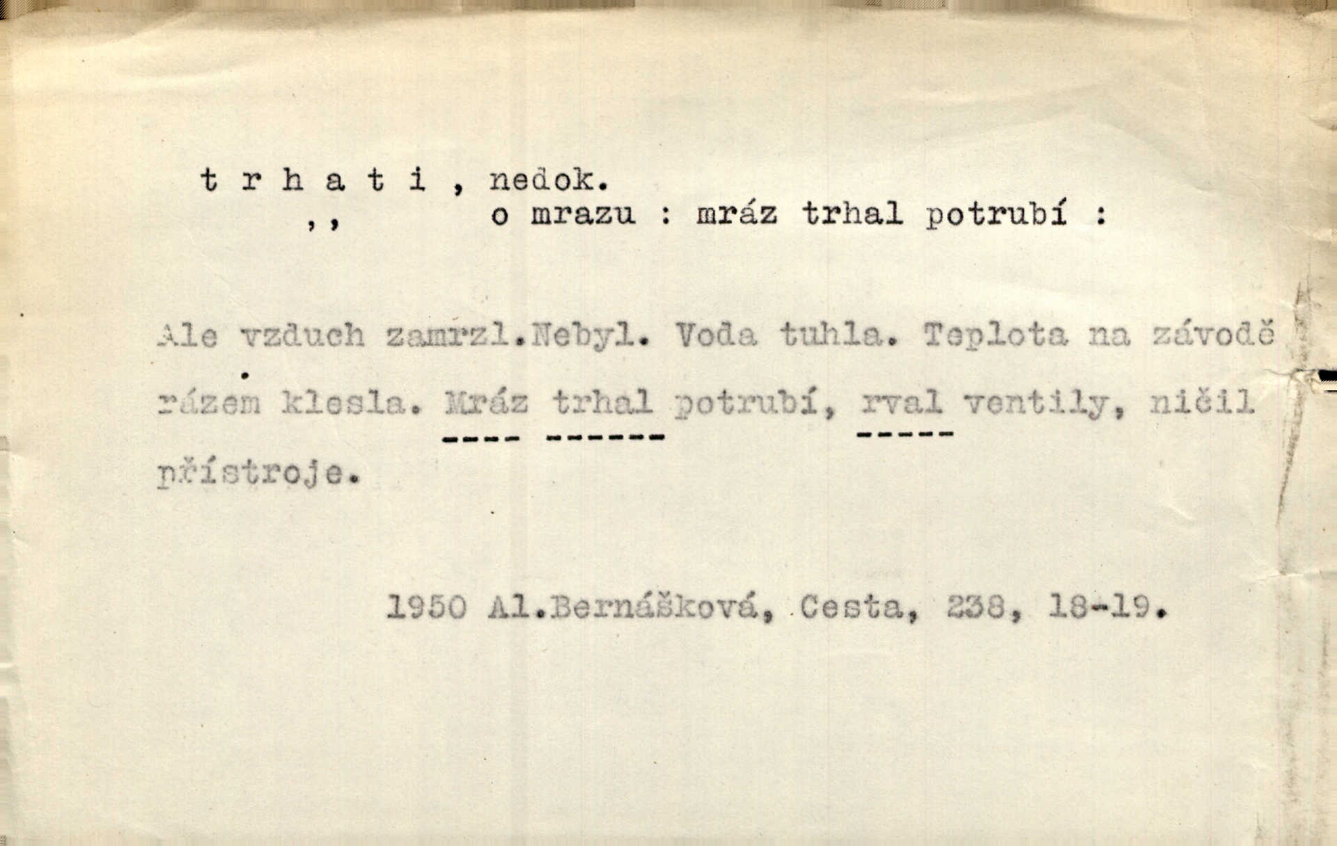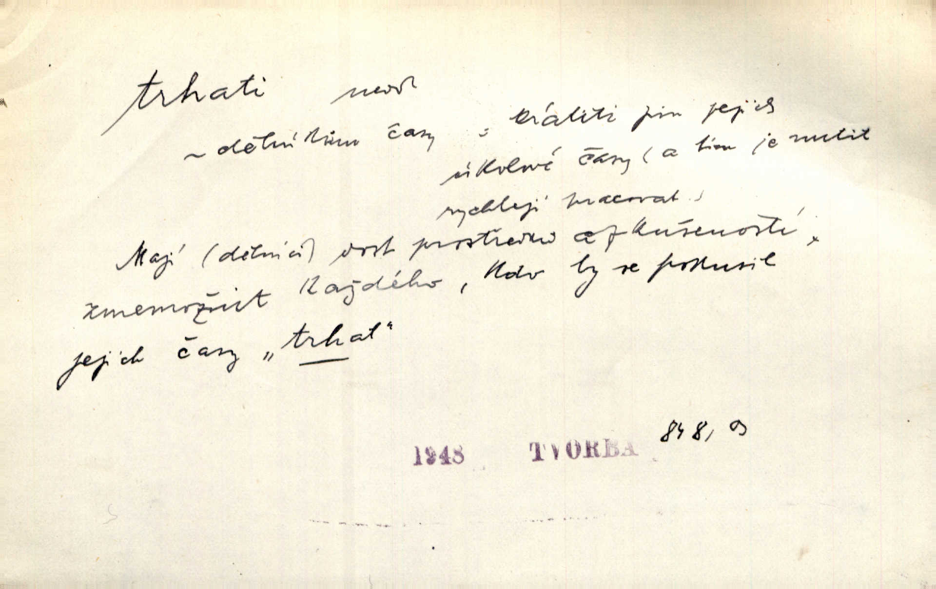 - trhati ned. (čím n. kým) prudce a krátce něčím hýbati n. za něco tahati; něčím n. někým škubati, smýkati, cloumati, lomcovati; trhati se, trhati sebou škubati se, škubati sebou. Ozvaly se pádné rány na dvéře domovní, a někdo prudce trhal zvoncem. Jir. Stojí pod zvonem a zlostně trhá provazem. Baar. Oldra uzdou trhá. Heyd. Koně nepokojně trhají zasněženýma ušima. A. Mrš. Trhala jím zima. Nor. Smělcem trhá vztek. V. Nej. Pes zvyklý svobodě trhal se na řetězu jako zběsilý. Baar. Vozka ve dveřích oznamoval, že koně sebou trhají. V. Mrš. Trhala sebou divoce v divokých snech. Svět. Ruka křečovitě sebou trhala. Vlč. Čím dál, tím více sebou trhaly svaly jejího obličeje. Herrm. Kolikrát to jejími rty trhalo, oči se kalily. Koudelák. Přen. Cosi smutného, lítostného, sklamaného trhalo mu srdcem. Svob. D (koho) rváti, sápati, drásati někoho (zvl. o dravé zvěři); trhati se (s kým) rváti se s někým. Vjede mu do vlasů, začne ho trhat a lomcovat jím. Něm. Máme dva zlé psy, kteří každého cizího trhají. Brodský. Vlk lapá, trhá a dáví ovce. J. z Hv. Trhají v zubech živé kuře. K. Čap. Vystrčil ji z domu, až byla skoro znak upadla, trhal se s ní, až přišel rychtář. Win. D (co odkud) vytrhávati, vyškubávati, strhávati něco odněkud. Nosičů se tu jen hemží a samou ochotností trhají ti všecko z ruky. Obr. živ. Div, že si netrhali [žebráci] almužnu z rukou. Jir. Trhá listonoši z rukou dopisy. Čech. Trhala bych si vlasy s hlavy, když si všecko rozvážím. Kun. Vítr už trhá listí s topolů na humnech. Svatoš. Hvízdání mnoha set úst trhalo uši drásavě bolelo v uších. Dyk. Přen. Darmo by do ní mluvil a trhal ji ze spaní vytrhoval. Rais. Ten den srdce trhalo se všem. A. Mrš. D trhati se (o koho, oč) podnikati prudký zápas o někoho n. něco; velmi usilovně státi o někoho. Vzpomínala, když za ní chodívali hoši a trhali se o ni k tanci. Staš. Budou-li se o tě tam v Praze trhati jako zde, nepovede se ti zle. Kosm. [Obrazy] brzy neobyčejné obliby došly, a lidé se o ně takořka trhali. Lum. Trhají [se] o tvůj povoz, o tvé lidi a koně. Zap. Pak vlky vyrušili, jak se trhali o koňskou zdechlinu u cesty. Jir. D trhati (co) škubnutím oddělovati od lodyhy, větve a p. (obyč. květiny n. plody). Sehnuvši se trhala kvítí. Jir. Když byla žena s trháním [jahod] hotova, vrátily jsme se spolu do města. Něm. Trhelte si [oříšky], ale nelamte lísek. Kosm. To byla má radost, pomáhat v poli — okopávat, trávu trhat. Rais. Docházel k dvorskému lánu, na kterém trhaly trhačky len. Jir. Děti rády trhaly proutky, házely je do vody. Něm. Neměl moci zadržeti ji, kdyby se jí zachtělo trhati zapovězené ovoce býti nevěrnou. Schein. Trhej růže, když kvetou využívej vhodné příležitosti. Tůma. Byl bych blázen, kdybych netrhal slívy, když mi zrají. Šmil. Přen. Byl hotov chytit ji do náruče a trhat sladké rozkoše jejího těla. Schein. D (co) něco souvislého rozrušovati, násilně děliti; poškozovati, ničiti; trhati se dostávati trhliny, poškozovati se trháním. Trhali balvany i skalky na štěrk. Rais. Proud ohromné síly se bouřlivě řítil a valil, trhaje skály. Jir. Caterina trhala a střihala plátno horlivě dále. Zey. Mačkává mezi prsty papírovou kuličku, kterou pak trhá na tisíce kousků. Lum. List mu vyškub’, trhal v kousky drobné. Čech. Je mu milý holendr ve mlýně, když trhá krupky. Hampl. Panny trhají závoje nevěst, stávají se řeholnicemi. K. Schulz. Šimon trhal prkna podlahy, sekaje do nich. Svob. Kocour počal trhati maso zuby i pazoury. Herb. Osedlej si kobylu, co budeš trhat boty. Jir. Dělníci pracovali po celou noc, odvážejíce celou horu země, trhanou prachem i dynamitem. B. Beneš. Dělové náboje trhaly se i zde vybuchovaly. R. právo. Když pustila kolovrat, trhala se jí niť. Herb. Stěžeň praská — plachta v dvé se trhá. Čech. Staré látky se trhají, je zapotřebí ustavičné správy. Prav. Záclony oken pod tíží prachu se až trhají. Ner. Vysoké břehy jsou podemlety, lehce se trhají a padají. Mach. Led prostředkem taje a se trhá, puká. Něm. Chmury se ještě přeháněly oblohou, ale již se trhaly. Jir. K tomu ke všemu se s řízků [masa] zase obaly trhaly a spadávaly. Maj. Bavoři se trhali smíchy div se nepotrhali. Hol. U každého sedláka se ho tak ptávali a všady se trhali smíchem. Herb. Tu práci zrovna trhá úporně pracuje. Rais. Uvidí, a první ten Reisek, co si nejvíc trhal hubu zbytečně mnoho mluvil. Klost. Slang. Rád „trhá kulisy“, jak se říká v divadelním žargonu usiluje o drastický efekt. Smet. Přen. Chladně trhal jednu illusi jeho za druhou. Kun. Příjemně zní sem flašinet, jehož jednotlivé zvuky vítr trhá a zanáší. Wojk. Proč trháte zbylé posud svazky [rodinné]? Heyd. Slova se jí lítostí trhala. Šmil. Dnešní její spánek trhal se. Herrm. Tech. trhání dobývání skalin pomocí trhavin, střílení. D trhati (se) vůbec rozdélovati (se), oddělovati (se), děliti (se). A to by bylo pěkné, trhat společnost, že byste se nestyděl! Tůma. Druh neslyší — zaniká v prachu s houfem, jenž počíná se trhati. Jir. [Závodník] přidává, už se trhá předstihuje ostatní. Lid. nov. [Usedlosti] se tenkráte ještě jako teď libovolně trhati nesměly. Svět. Od tebe se trhám a k ženě tě posílám. Svět. Od srdce se jí trhá nejen muž, ale i všechno, co náleželo posud k ní. V. Mrš. D míti trhání ob. pociťovati nutkání, touhu něco podniknout. Měl silné trhání, byl by se nejraději rozjel ven ke Zbraslavi. Jir. Uslyševše o nastávající znamenité svatbě, měli hrozitánské trhání a byli by dali nevím co, kdyby se mohli na tu parádu hezky z blízka podívat. Herrm. [Pes] míval nějaký čas trhání [napadnout drůbež]‚ ale