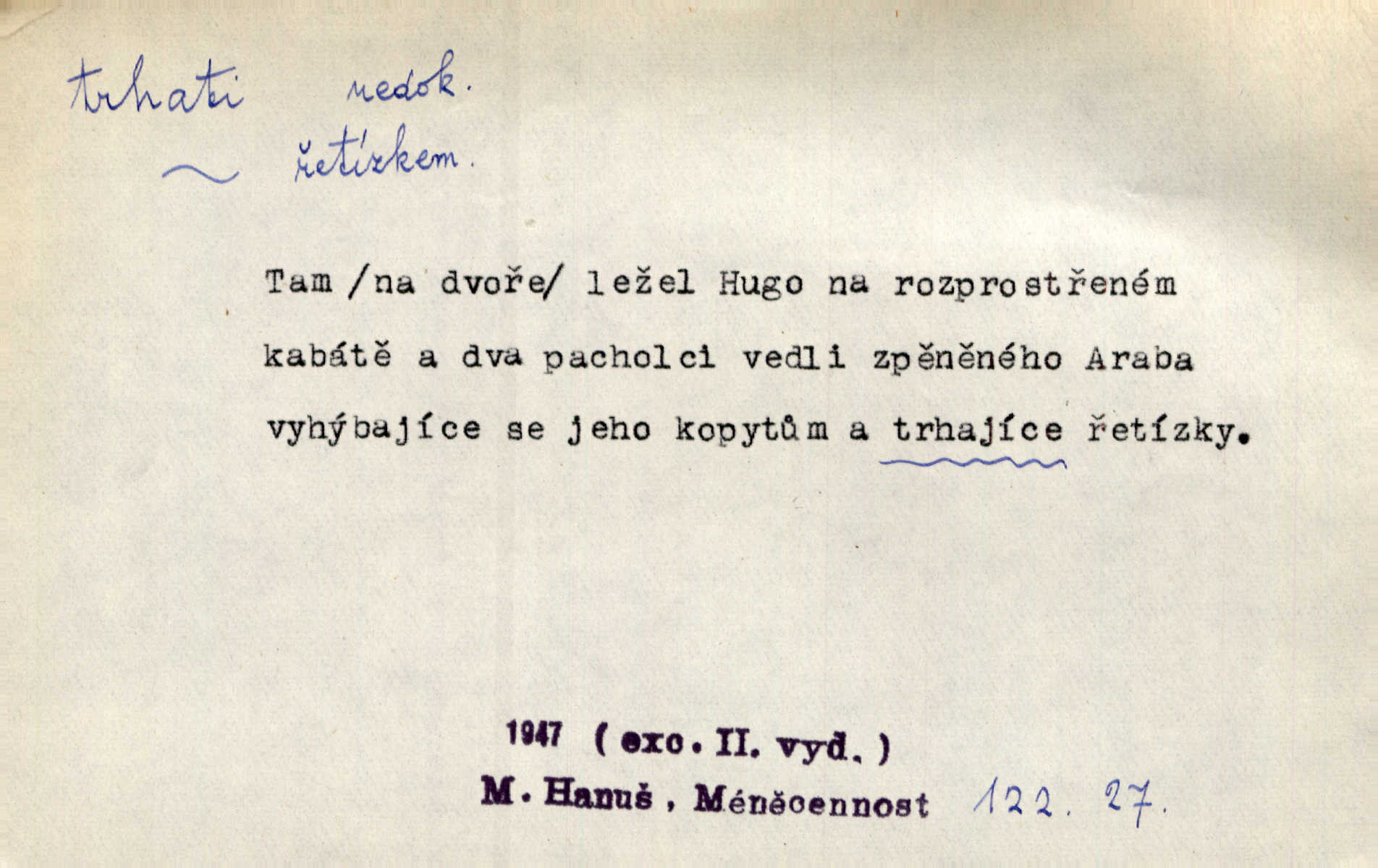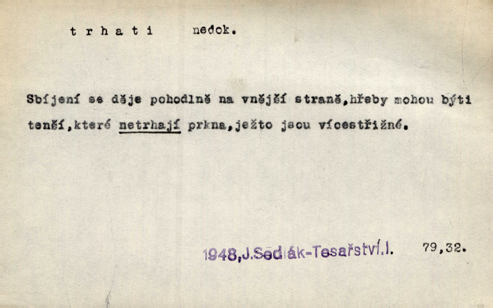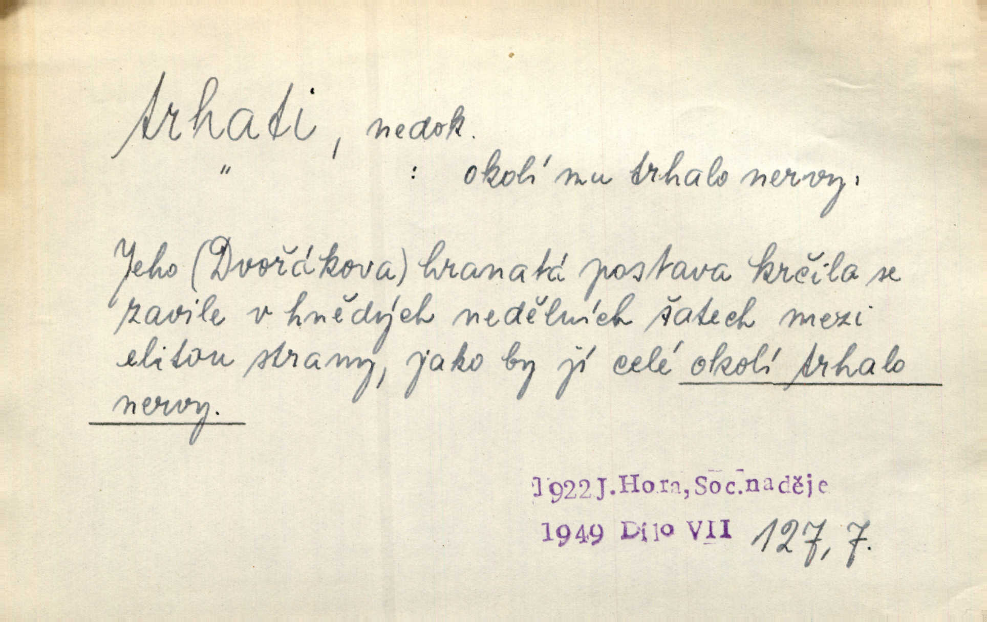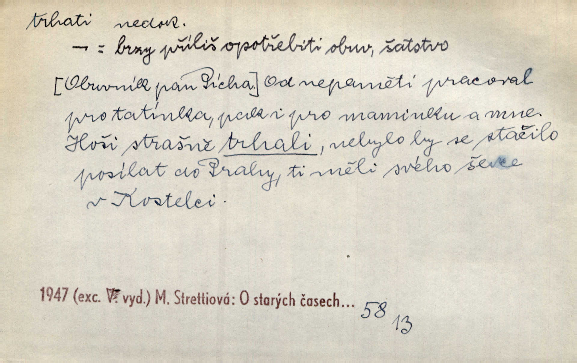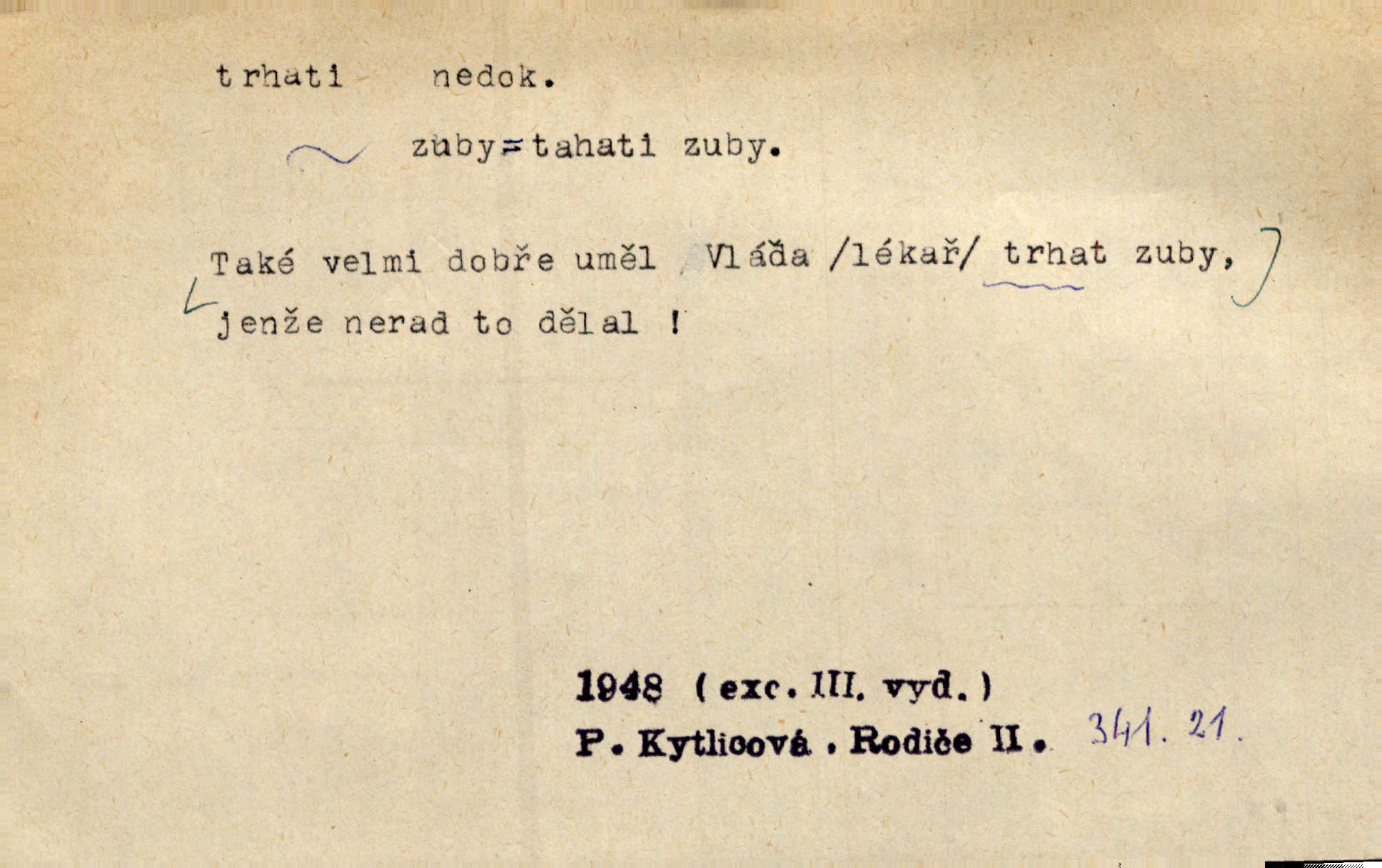 - trhati ned. (čím n. kým) prudce a krátce něčím hýbati n. za něco tahati; něčím n. někým škubati, smýkati, cloumati, lomcovati; trhati se, trhati sebou škubati se, škubati sebou. Ozvaly se pádné rány na dvéře domovní, a někdo prudce trhal zvoncem. Jir. Stojí pod zvonem a zlostně trhá provazem. Baar. Oldra uzdou trhá. Heyd. Koně nepokojně trhají zasněženýma ušima. A. Mrš. Trhala jím zima. Nor. Smělcem trhá vztek. V. Nej. Pes zvyklý svobodě trhal se na řetězu jako zběsilý. Baar. Vozka ve dveřích oznamoval, že koně sebou trhají. V. Mrš. Trhala sebou divoce v divokých snech. Svět. Ruka křečovitě sebou trhala. Vlč. Čím dál, tím více sebou trhaly svaly jejího obličeje. Herrm. Kolikrát to jejími rty trhalo, oči se kalily. Koudelák. Přen. Cosi smutného, lítostného, sklamaného trhalo mu srdcem. Svob. D (koho) rváti, sápati, drásati někoho (zvl. o dravé zvěři); trhati se (s kým) rváti se s někým. Vjede mu do vlasů, začne ho trhat a lomcovat jím. Něm. Máme dva zlé psy, kteří každého cizího trhají. Brodský. Vlk lapá, trhá a dáví ovce. J. z Hv. Trhají v zubech živé kuře. K. Čap. Vystrčil ji z domu, až byla skoro znak upadla, trhal se s ní, až přišel rychtář. Win. D (co odkud) vytrhávati, vyškubávati, strhávati něco odněkud. Nosičů se tu jen hemží a samou ochotností trhají ti všecko z ruky. Obr. živ. Div, že si netrhali [žebráci] almužnu z rukou. Jir. Trhá listonoši z rukou dopisy. Čech. Trhala bych si vlasy s hlavy, když si všecko rozvážím. Kun. Vítr už trhá listí s topolů na humnech. Svatoš. Hvízdání mnoha set úst trhalo uši drásavě bolelo v uších. Dyk. Přen. Darmo by do ní mluvil a trhal ji ze spaní vytrhoval. Rais. Ten den srdce trhalo se všem. A. Mrš. D trhati se (o koho, oč) podnikati prudký zápas o někoho n. něco; velmi usilovně státi o někoho. Vzpomínala, když za ní chodívali hoši a trhali se o ni k tanci. Staš. Budou-li se o tě tam v Praze trhati jako zde, nepovede se ti zle. Kosm. [Obrazy] brzy neobyčejné obliby došly, a lidé se o ně takořka trhali. Lum. Trhají [se] o tvůj povoz, o tvé lidi a koně. Zap. Pak vlky vyrušili, jak se trhali o koňskou zdechlinu u cesty. Jir. D trhati (co) škubnutím oddělovati od lodyhy, větve a p. (obyč. květiny n. plody). Sehnuvši se trhala kvítí. Jir. Když byla žena s trháním [jahod] hotova, vrátily jsme se spolu do města. Něm. Trhelte si [oříšky], ale nelamte lísek. Kosm. To byla má radost, pomáhat v poli — okopávat, trávu trhat. Rais. Docházel k dvorskému lánu, na kterém trhaly trhačky len. Jir. Děti rády trhaly proutky, házely je do vody. Něm. Neměl moci zadržeti ji, kdyby se jí zachtělo trhati zapovězené ovoce býti nevěrnou. Schein. Trhej růže, když kvetou využívej vhodné příležitosti. Tůma. Byl bych blázen, kdybych netrhal slívy, když mi zrají. Šmil. Přen. Byl hotov chytit ji do náruče a trhat sladké rozkoše jejího těla. Schein. D (co) něco souvislého rozrušovati, násilně děliti; poškozovati, ničiti; trhati se dostávati trhliny, poškozovati se trháním. Trhali balvany i skalky na štěrk. Rais. Proud ohromné síly se bouřlivě řítil a valil, trhaje skály. Jir. Caterina trhala a střihala plátno horlivě dále. Zey. Mačkává mezi prsty papírovou kuličku, kterou pak trhá na tisíce kousků. Lum. List mu vyškub’, trhal v kousky drobné. Čech. Je mu milý holendr ve mlýně, když trhá krupky. Hampl. Panny trhají závoje nevěst, stávají se řeholnicemi. K. Schulz. Šimon trhal prkna podlahy, sekaje do nich. Svob. Kocour počal trhati maso zuby i pazoury. Herb. Osedlej si kobylu, co budeš trhat boty. Jir. Dělníci pracovali po celou noc, odvážejíce celou horu země, trhanou prachem i dynamitem. B. Beneš. Dělové náboje trhaly se i zde vybuchovaly. R. právo. Když pustila kolovrat, trhala se jí niť. Herb. Stěžeň praská — plachta v dvé se trhá. Čech. Staré látky se trhají, je zapotřebí ustavičné správy. Prav. Záclony oken pod tíží prachu se až trhají. Ner. Vysoké břehy jsou podemlety, lehce se trhají a padají. Mach. Led prostředkem taje a se trhá, puká. Něm. Chmury se ještě přeháněly oblohou, ale již se trhaly. Jir. K tomu ke všemu se s řízků [masa] zase obaly trhaly a spadávaly. Maj. Bavoři se trhali smíchy div se nepotrhali. Hol. U každého sedláka se ho tak ptávali a všady se trhali smíchem. Herb. Tu práci zrovna trhá úporně pracuje. Rais. Uvidí, a první ten Reisek, co si nejvíc trhal hubu zbytečně mnoho mluvil. Klost. Slang. Rád „trhá kulisy“, jak se říká v divadelním žargonu usiluje o drastický efekt. Smet. Přen. Chladně trhal jednu illusi jeho za druhou. Kun. Příjemně zní sem flašinet, jehož jednotlivé zvuky vítr trhá a zanáší. Wojk. Proč trháte zbylé posud svazky [rodinné]? Heyd. Slova se jí lítostí trhala. Šmil. Dnešní její spánek trhal se. Herrm. Tech. trhání dobývání skalin pomocí trhavin, střílení. D trhati (se) vůbec rozdélovati (se), oddělovati (se), děliti (se). A to by bylo pěkné, trhat společnost, že byste se nestyděl! Tůma. Druh neslyší — zaniká v prachu s houfem, jenž počíná se trhati. Jir. [Závodník] přidává, už se trhá předstihuje ostatní. Lid. nov. [Usedlosti] se tenkráte ještě jako teď libovolně trhati nesměly. Svět. Od tebe se trhám a k ženě tě posílám. Svět. Od srdce se jí trhá nejen muž, ale i všechno, co náleželo posud k ní. V. Mrš. D míti trhání ob. pociťovati nutkání, touhu něco podniknout. Měl silné trhání, byl by se nejraději rozjel ven ke Zbraslavi. Jir. Uslyševše o nastávající znamenité svatbě, měli hrozitánské trhání a byli by dali nevím co, kdyby se mohli na tu parádu hezky z blízka podívat. Herrm. [Pes] míval nějaký čas trhání [napadnout drůbež]‚ ale
