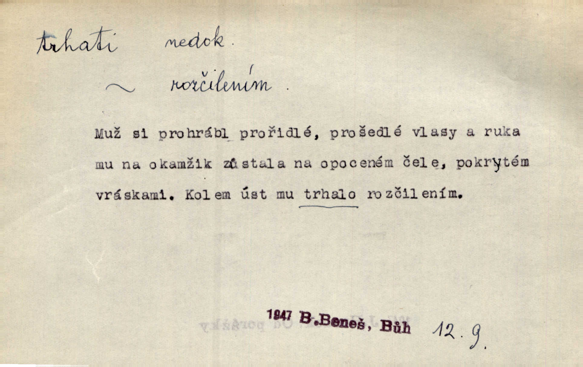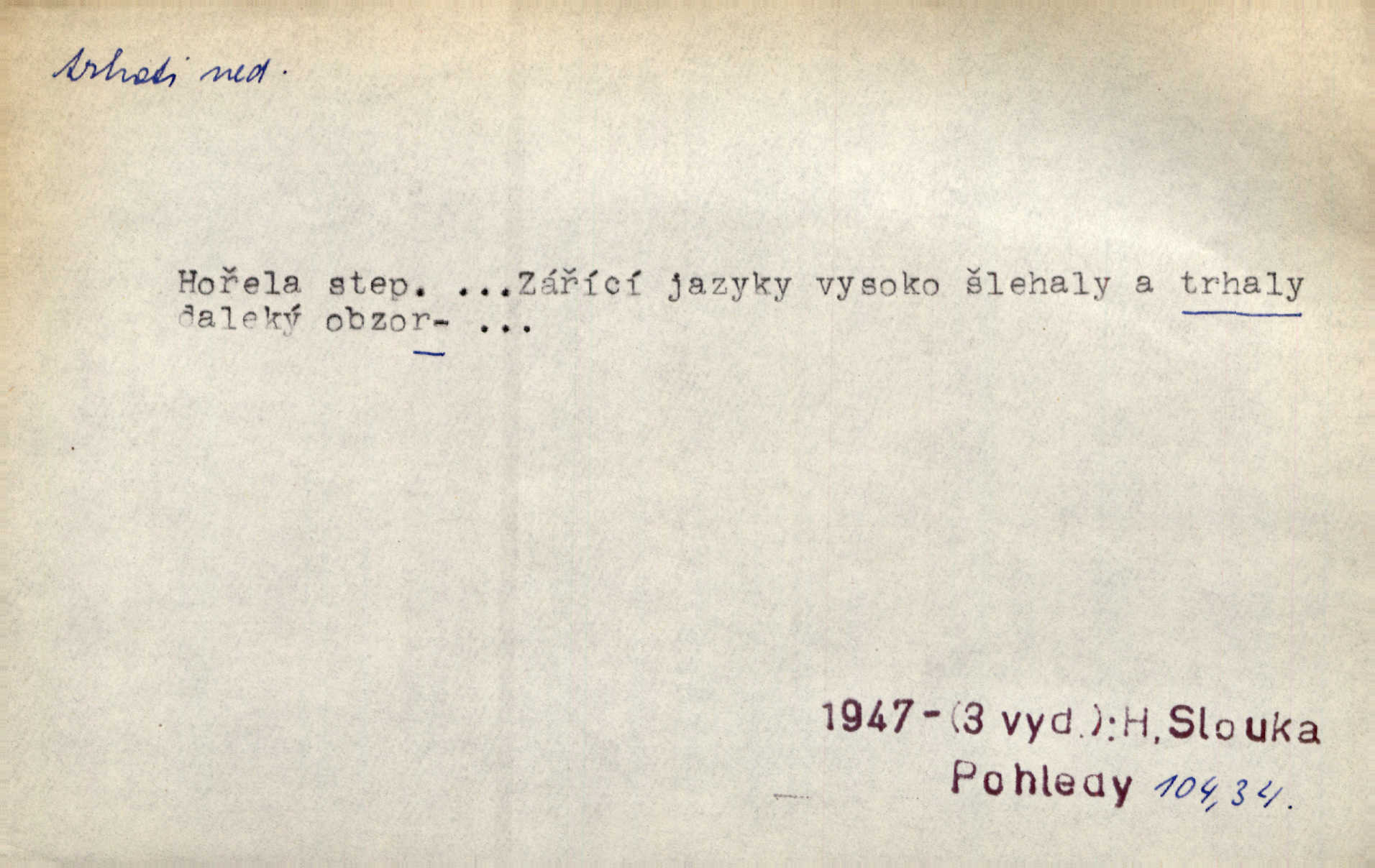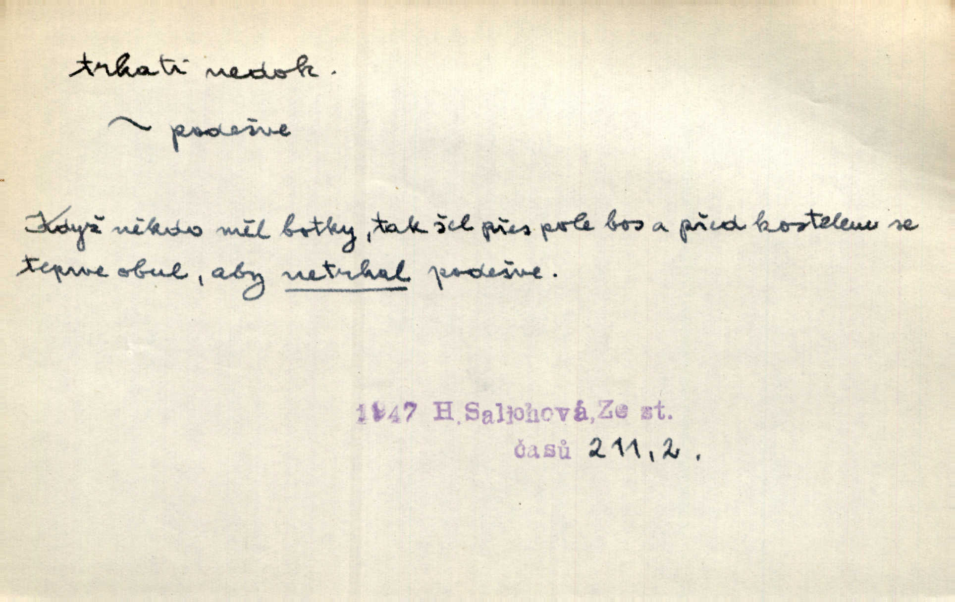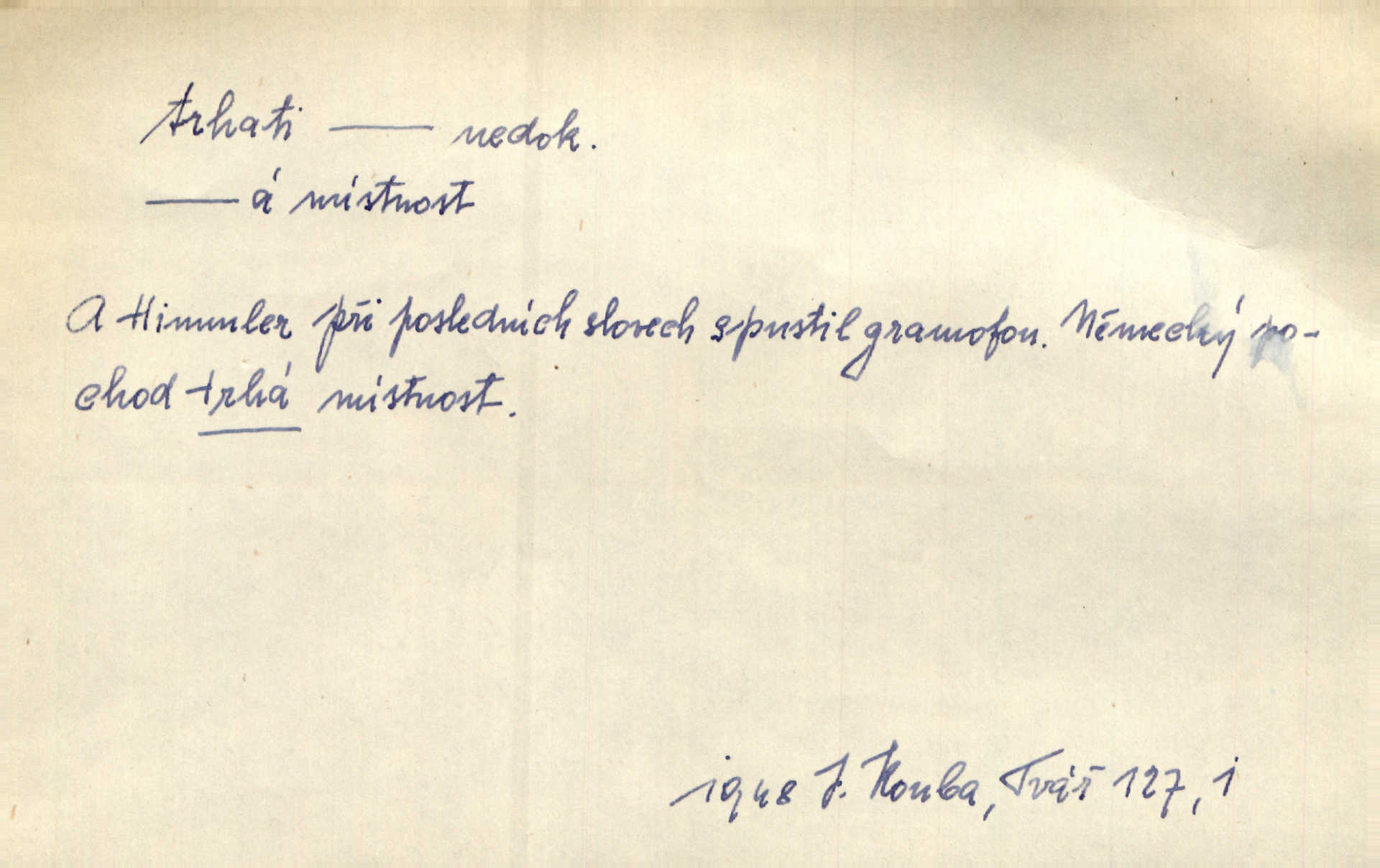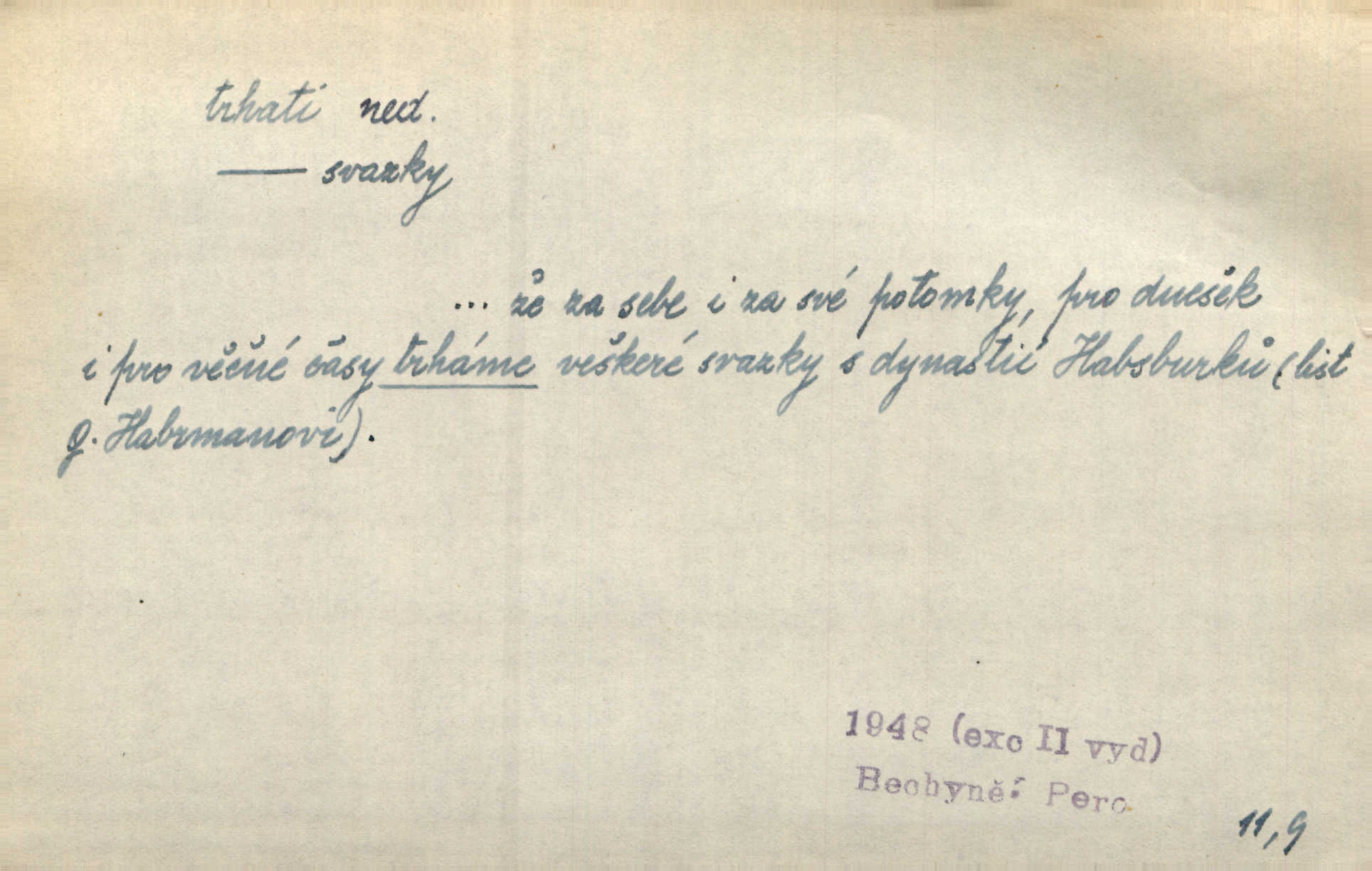 - trhati ned. (čím n. kým) prudce a krátce něčím hýbati n. za něco tahati; něčím n. někým škubati, smýkati, cloumati, lomcovati; trhati se, trhati sebou škubati se, škubati sebou. Ozvaly se pádné rány na dvéře domovní, a někdo prudce trhal zvoncem. Jir. Stojí pod zvonem a zlostně trhá provazem. Baar. Oldra uzdou trhá. Heyd. Koně nepokojně trhají zasněženýma ušima. A. Mrš. Trhala jím zima. Nor. Smělcem trhá vztek. V. Nej. Pes zvyklý svobodě trhal se na řetězu jako zběsilý. Baar. Vozka ve dveřích oznamoval, že koně sebou trhají. V. Mrš. Trhala sebou divoce v divokých snech. Svět. Ruka křečovitě sebou trhala. Vlč. Čím dál, tím více sebou trhaly svaly jejího obličeje. Herrm. Kolikrát to jejími rty trhalo, oči se kalily. Koudelák. Přen. Cosi smutného, lítostného, sklamaného trhalo mu srdcem. Svob. D (koho) rváti, sápati, drásati někoho (zvl. o dravé zvěři); trhati se (s kým) rváti se s někým. Vjede mu do vlasů, začne ho trhat a lomcovat jím. Něm. Máme dva zlé psy, kteří každého cizího trhají. Brodský. Vlk lapá, trhá a dáví ovce. J. z Hv. Trhají v zubech živé kuře. K. Čap. Vystrčil ji z domu, až byla skoro znak upadla, trhal se s ní, až přišel rychtář. Win. D (co odkud) vytrhávati, vyškubávati, strhávati něco odněkud. Nosičů se tu jen hemží a samou ochotností trhají ti všecko z ruky. Obr. živ. Div, že si netrhali [žebráci] almužnu z rukou. Jir. Trhá listonoši z rukou dopisy. Čech. Trhala bych si vlasy s hlavy, když si všecko rozvážím. Kun. Vítr už trhá listí s topolů na humnech. Svatoš. Hvízdání mnoha set úst trhalo uši drásavě bolelo v uších. Dyk. Přen. Darmo by do ní mluvil a trhal ji ze spaní vytrhoval. Rais. Ten den srdce trhalo se všem. A. Mrš. D trhati se (o koho, oč) podnikati prudký zápas o někoho n. něco; velmi usilovně státi o někoho. Vzpomínala, když za ní chodívali hoši a trhali se o ni k tanci. Staš. Budou-li se o tě tam v Praze trhati jako zde, nepovede se ti zle. Kosm. [Obrazy] brzy neobyčejné obliby došly, a lidé se o ně takořka trhali. Lum. Trhají [se] o tvůj povoz, o tvé lidi a koně. Zap. Pak vlky vyrušili, jak se trhali o koňskou zdechlinu u cesty. Jir. D trhati (co) škubnutím oddělovati od lodyhy, větve a p. (obyč. květiny n. plody). Sehnuvši se trhala kvítí. Jir. Když byla žena s trháním [jahod] hotova, vrátily jsme se spolu do města. Něm. Trhelte si [oříšky], ale nelamte lísek. Kosm. To byla má radost, pomáhat v poli — okopávat, trávu trhat. Rais. Docházel k dvorskému lánu, na kterém trhaly trhačky len. Jir. Děti rády trhaly proutky, házely je do vody. Něm. Neměl moci zadržeti ji, kdyby se jí zachtělo trhati zapovězené ovoce býti nevěrnou. Schein. Trhej růže, když kvetou využívej vhodné příležitosti. Tůma. Byl bych blázen, kdybych netrhal slívy, když mi zrají. Šmil. Přen. Byl hotov chytit ji do náruče a trhat sladké rozkoše jejího těla. Schein. D (co) něco souvislého rozrušovati, násilně děliti; poškozovati, ničiti; trhati se dostávati trhliny, poškozovati se trháním. Trhali balvany i skalky na štěrk. Rais. Proud ohromné síly se bouřlivě řítil a valil, trhaje skály. Jir. Caterina trhala a střihala plátno horlivě dále. Zey. Mačkává mezi prsty papírovou kuličku, kterou pak trhá na tisíce kousků. Lum. List mu vyškub’, trhal v kousky drobné. Čech. Je mu milý holendr ve mlýně, když trhá krupky. Hampl. Panny trhají závoje nevěst, stávají se řeholnicemi. K. Schulz. Šimon trhal prkna podlahy, sekaje do nich. Svob. Kocour počal trhati maso zuby i pazoury. Herb. Osedlej si kobylu, co budeš trhat boty. Jir. Dělníci pracovali po celou noc, odvážejíce celou horu země, trhanou prachem i dynamitem. B. Beneš. Dělové náboje trhaly se i zde vybuchovaly. R. právo. Když pustila kolovrat, trhala se jí niť. Herb. Stěžeň praská — plachta v dvé se trhá. Čech. Staré látky se trhají, je zapotřebí ustavičné správy. Prav. Záclony oken pod tíží prachu se až trhají. Ner. Vysoké břehy jsou podemlety, lehce se trhají a padají. Mach. Led prostředkem taje a se trhá, puká. Něm. Chmury se ještě přeháněly oblohou, ale již se trhaly. Jir. K tomu ke všemu se s řízků [masa] zase obaly trhaly a spadávaly. Maj. Bavoři se trhali smíchy div se nepotrhali. Hol. U každého sedláka se ho tak ptávali a všady se trhali smíchem. Herb. Tu práci zrovna trhá úporně pracuje. Rais. Uvidí, a první ten Reisek, co si nejvíc trhal hubu zbytečně mnoho mluvil. Klost. Slang. Rád „trhá kulisy“, jak se říká v divadelním žargonu usiluje o drastický efekt. Smet. Přen. Chladně trhal jednu illusi jeho za druhou. Kun. Příjemně zní sem flašinet, jehož jednotlivé zvuky vítr trhá a zanáší. Wojk. Proč trháte zbylé posud svazky [rodinné]? Heyd. Slova se jí lítostí trhala. Šmil. Dnešní její spánek trhal se. Herrm. Tech. trhání dobývání skalin pomocí trhavin, střílení. D trhati (se) vůbec rozdélovati (se), oddělovati (se), děliti (se). A to by bylo pěkné, trhat společnost, že byste se nestyděl! Tůma. Druh neslyší — zaniká v prachu s houfem, jenž počíná se trhati. Jir. [Závodník] přidává, už se trhá předstihuje ostatní. Lid. nov. [Usedlosti] se tenkráte ještě jako teď libovolně trhati nesměly. Svět. Od tebe se trhám a k ženě tě posílám. Svět. Od srdce se jí trhá nejen muž, ale i všechno, co náleželo posud k ní. V. Mrš. D míti trhání ob. pociťovati nutkání, touhu něco podniknout. Měl silné trhání, byl by se nejraději rozjel ven ke Zbraslavi. Jir. Uslyševše o nastávající znamenité svatbě, měli hrozitánské trhání a byli by dali nevím co, kdyby se mohli na tu parádu hezky z blízka podívat. Herrm. [Pes] míval nějaký čas trhání [napadnout drůbež]‚ ale
