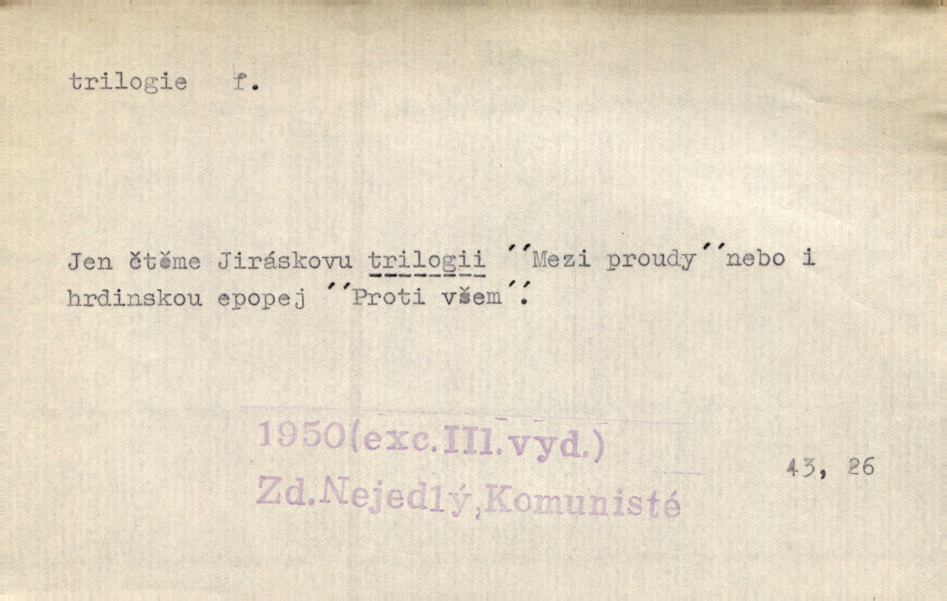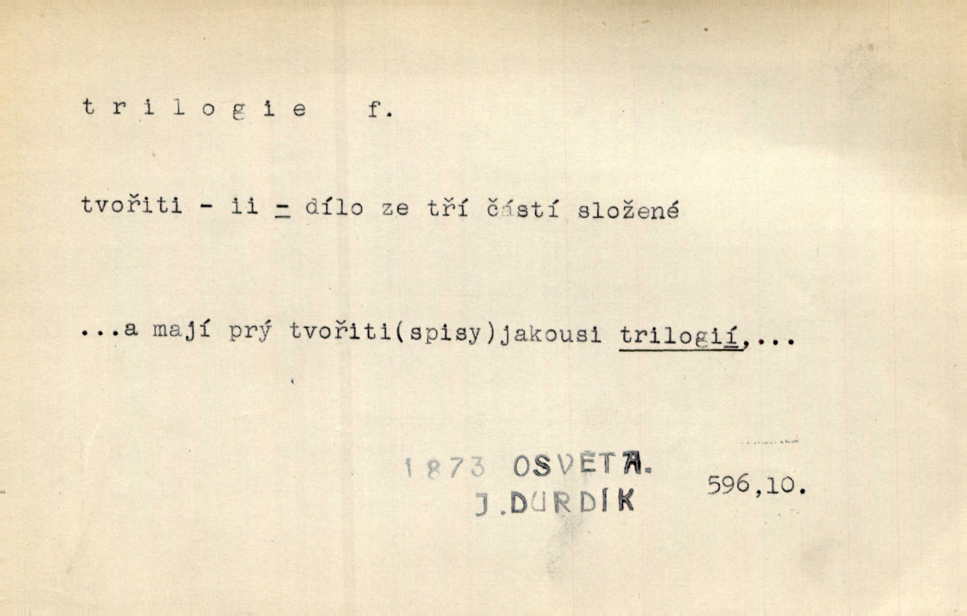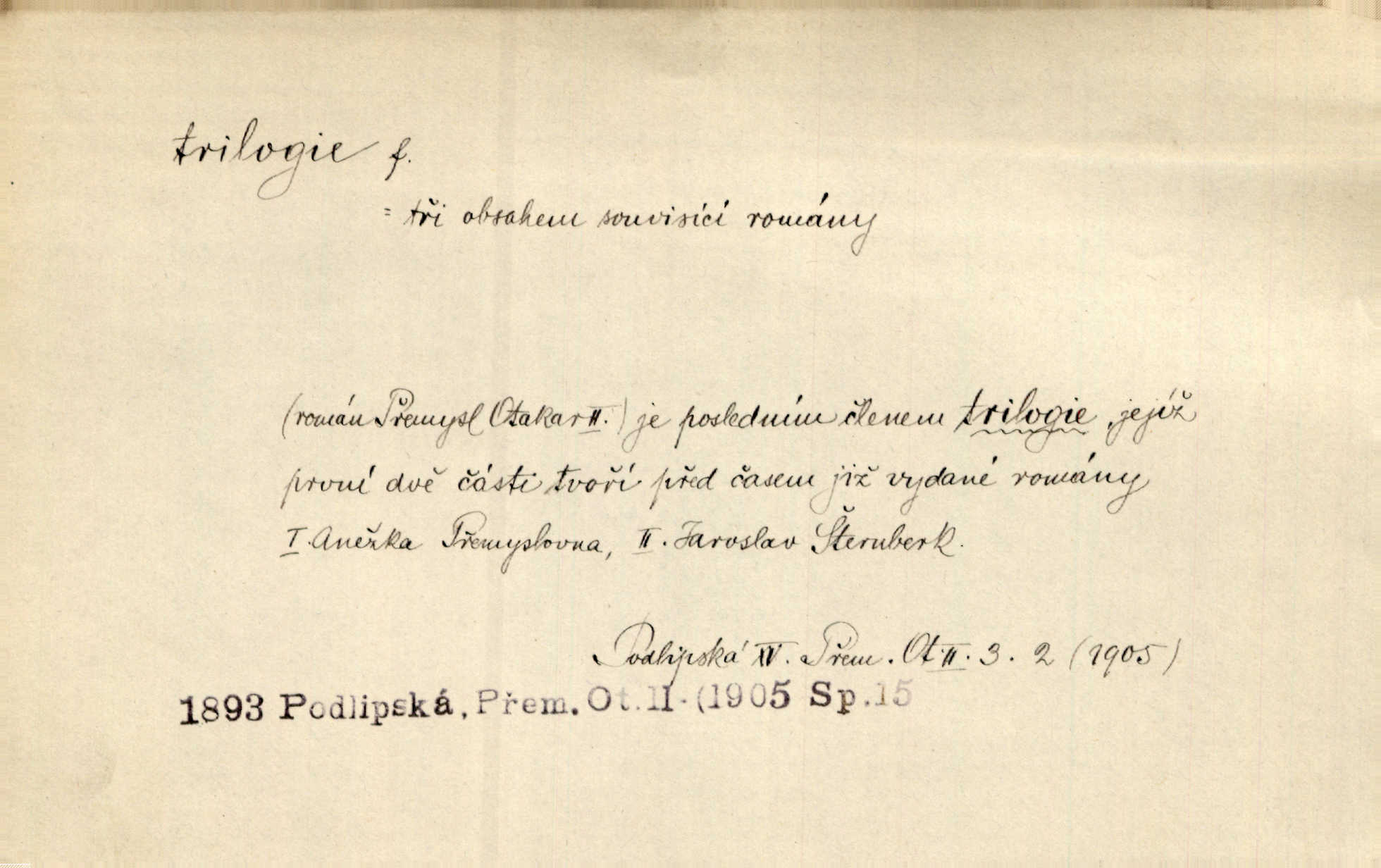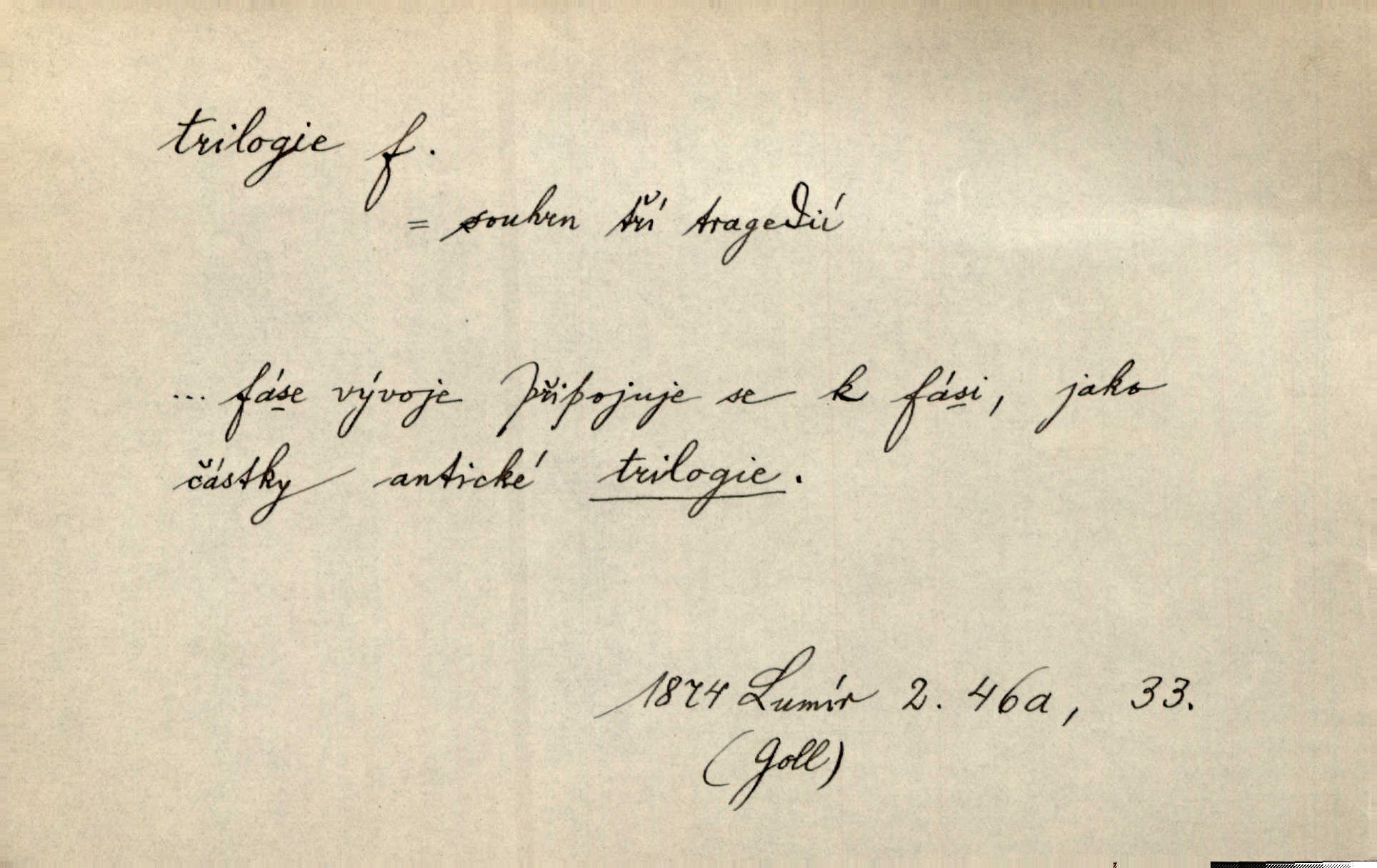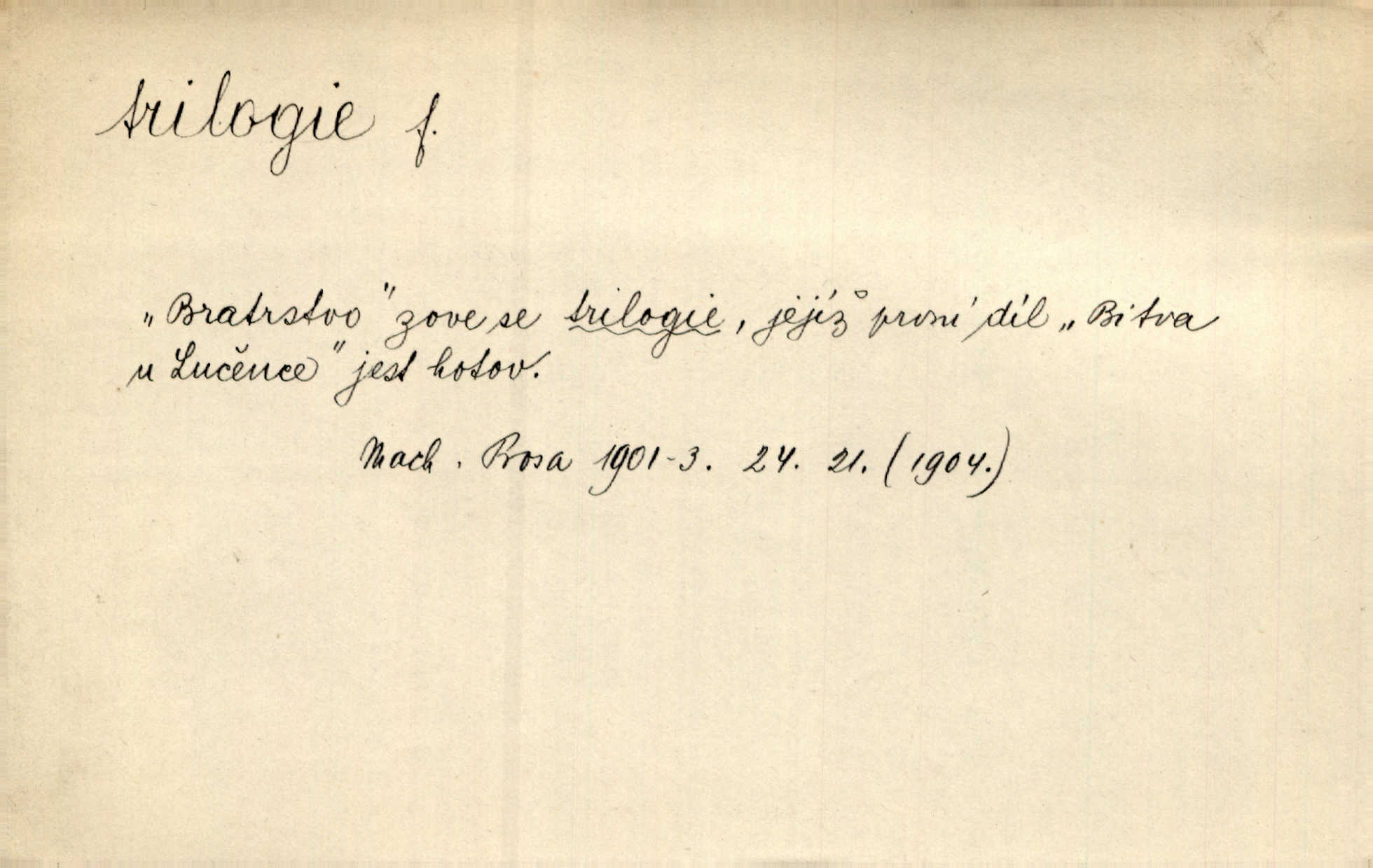 - trilogie, -e f. slovesné, zpr. dramatické n. románové dílo skládající se ze tří částí navzájem souvisících. Nejslavnější jeho trilogii Oresteii nedali cenu. V. Neb. V Schillerově Waldštýnské trilogii zračí se prvky tragedie osudové. Lit. č. „Bratrstvo“ zove se trilogie, jejíž první díl „Bitva u Lučence“ je hotov. Mach. Revoluční trilogie vznikla po „Poslu“. Dyk. První část lyricky erotické trilogie. Šal.