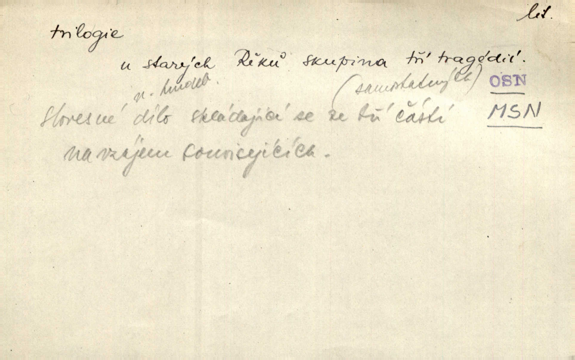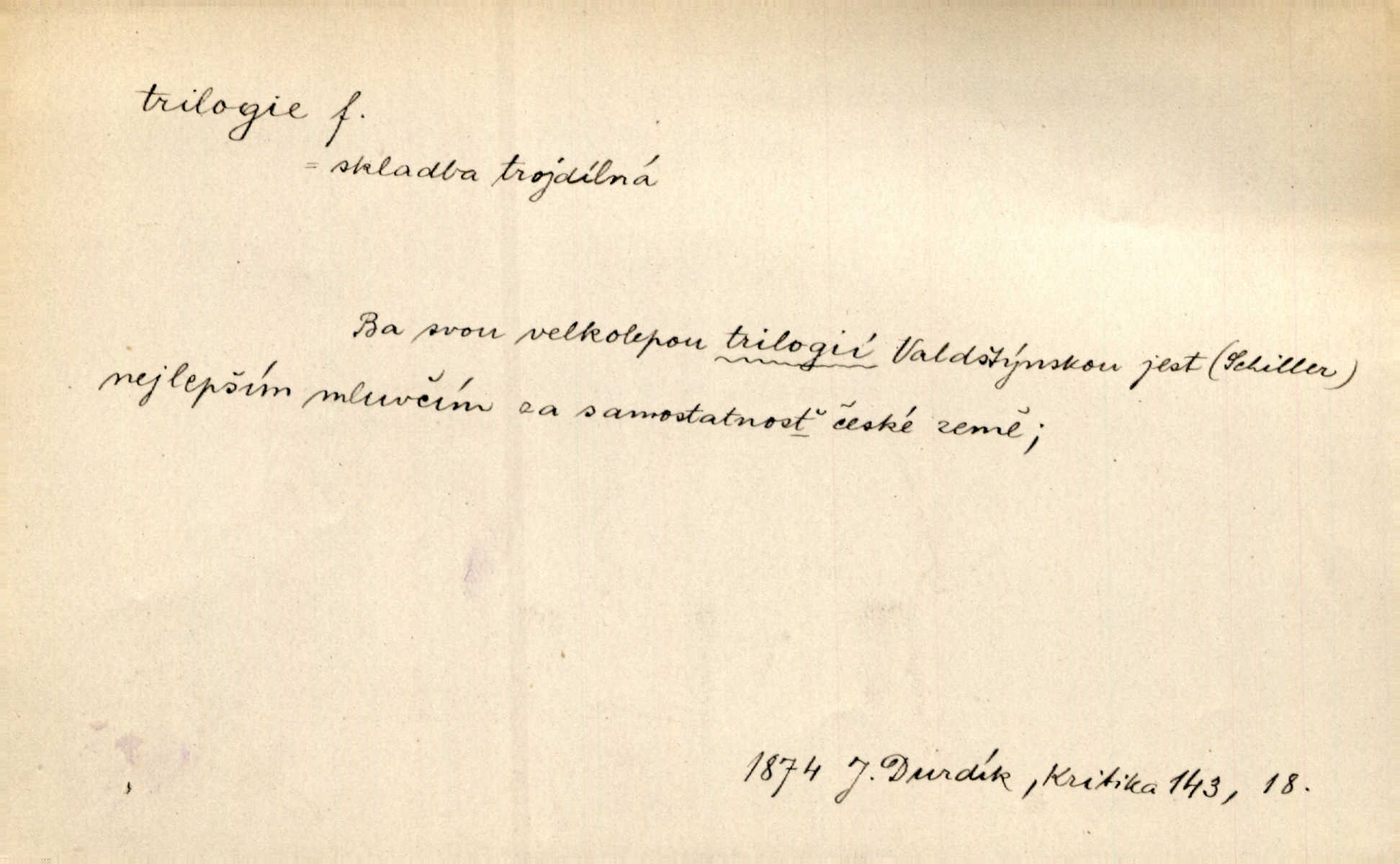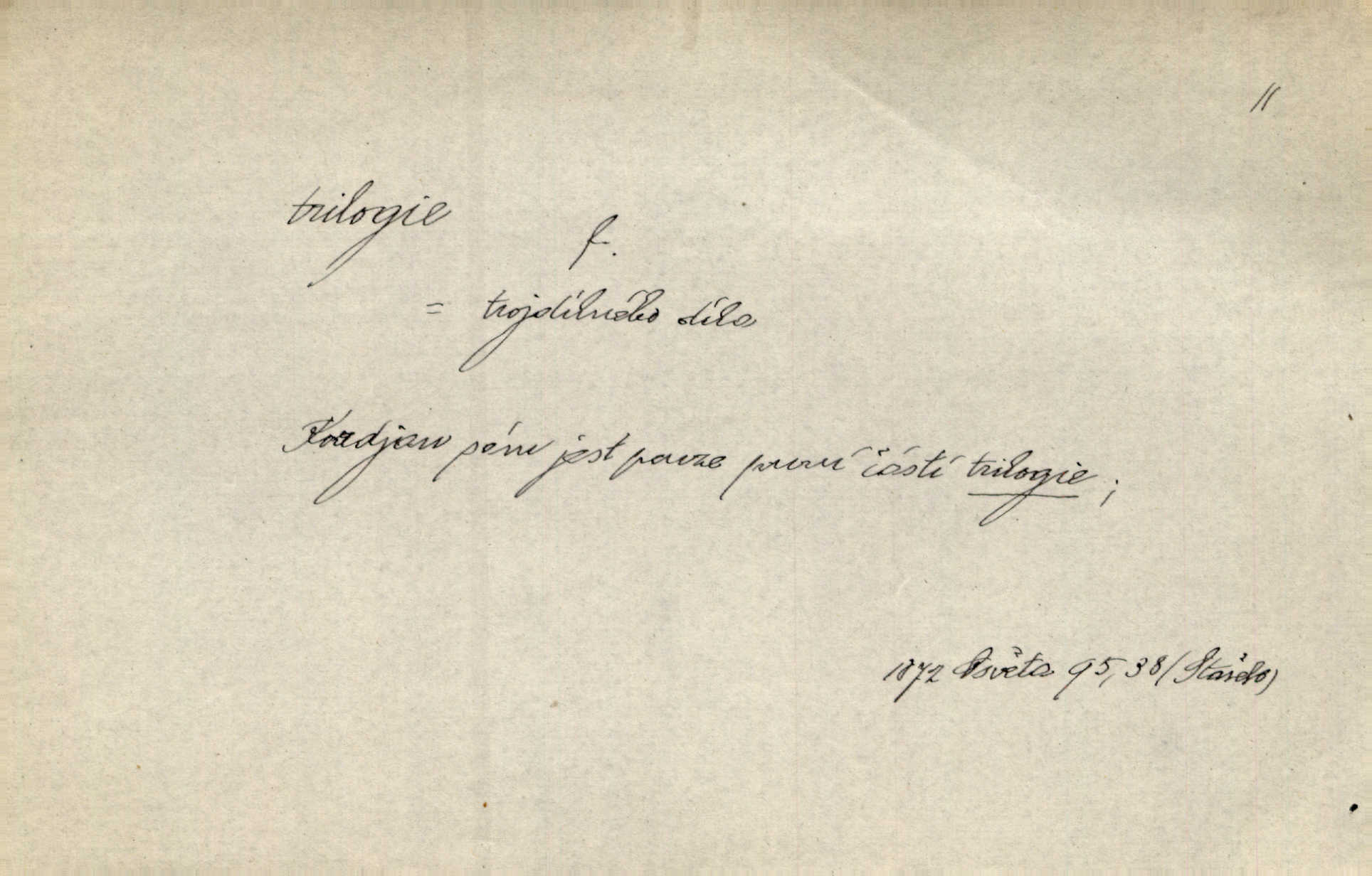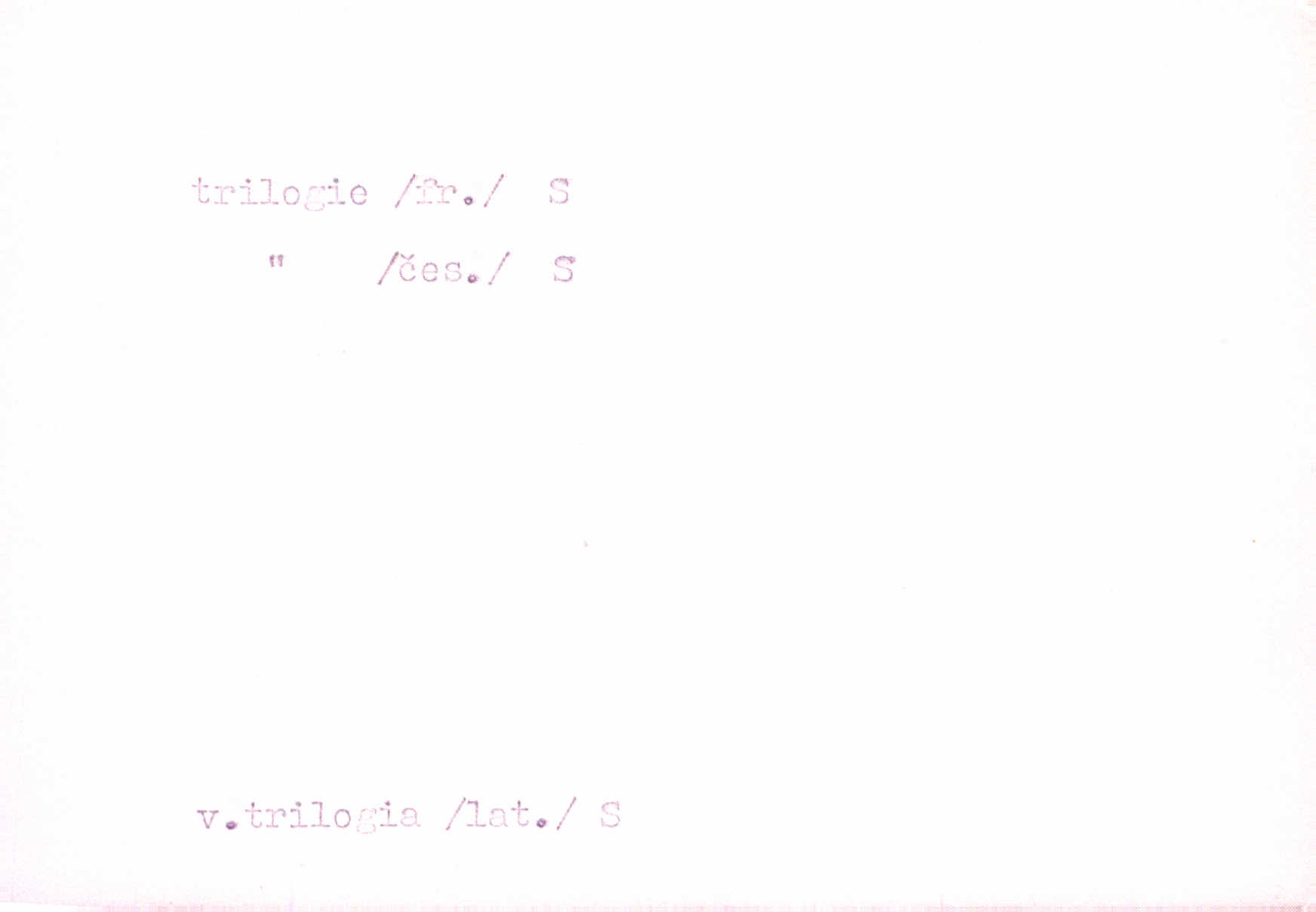 - trilogie, -e f. slovesné, zpr. dramatické n. románové dílo skládající se ze tří částí navzájem souvisících. Nejslavnější jeho trilogii Oresteii nedali cenu. V. Neb. V Schillerově Waldštýnské trilogii zračí se prvky tragedie osudové. Lit. č. „Bratrstvo“ zove se trilogie, jejíž první díl „Bitva u Lučence“ je hotov. Mach. Revoluční trilogie vznikla po „Poslu“. Dyk. První část lyricky erotické trilogie. Šal.