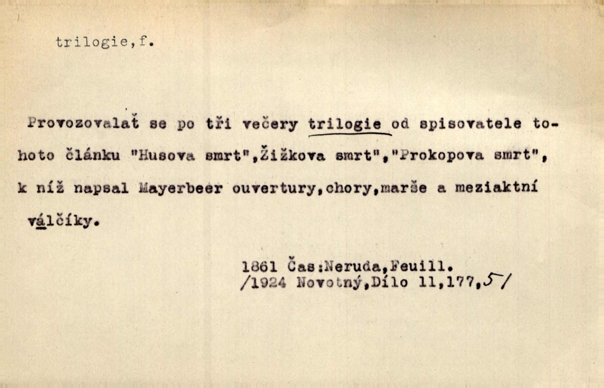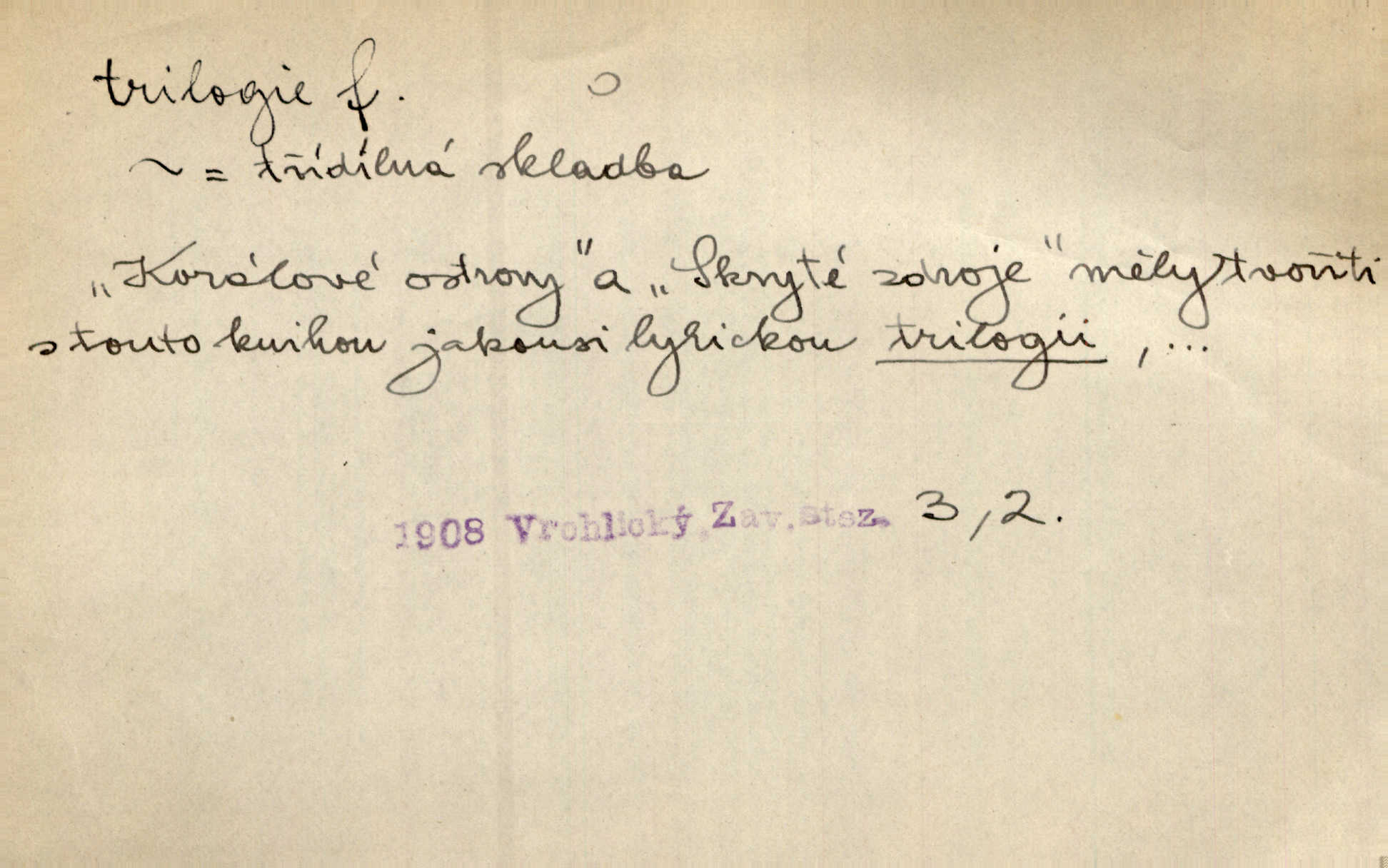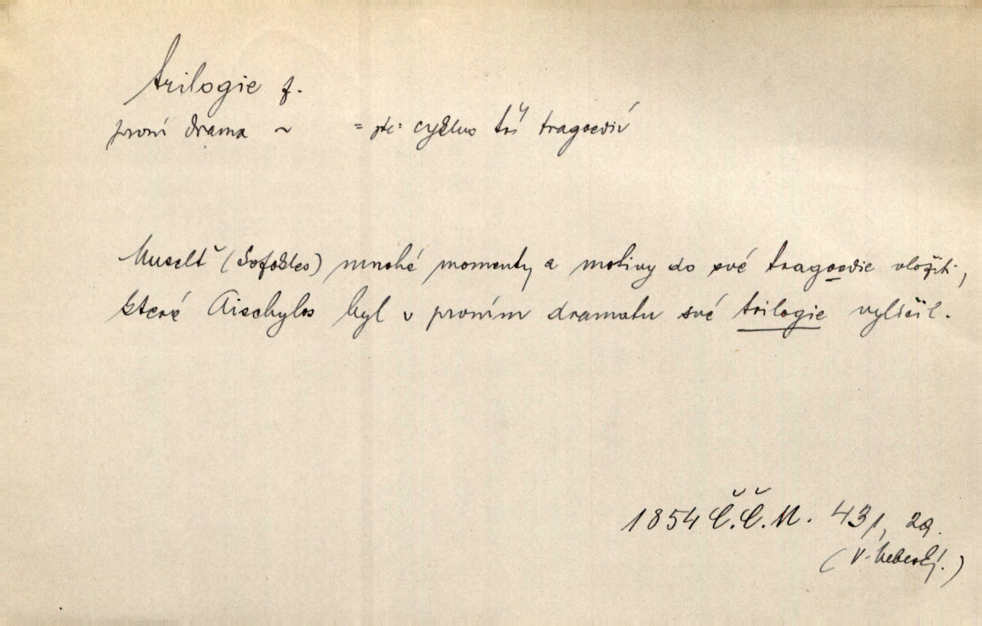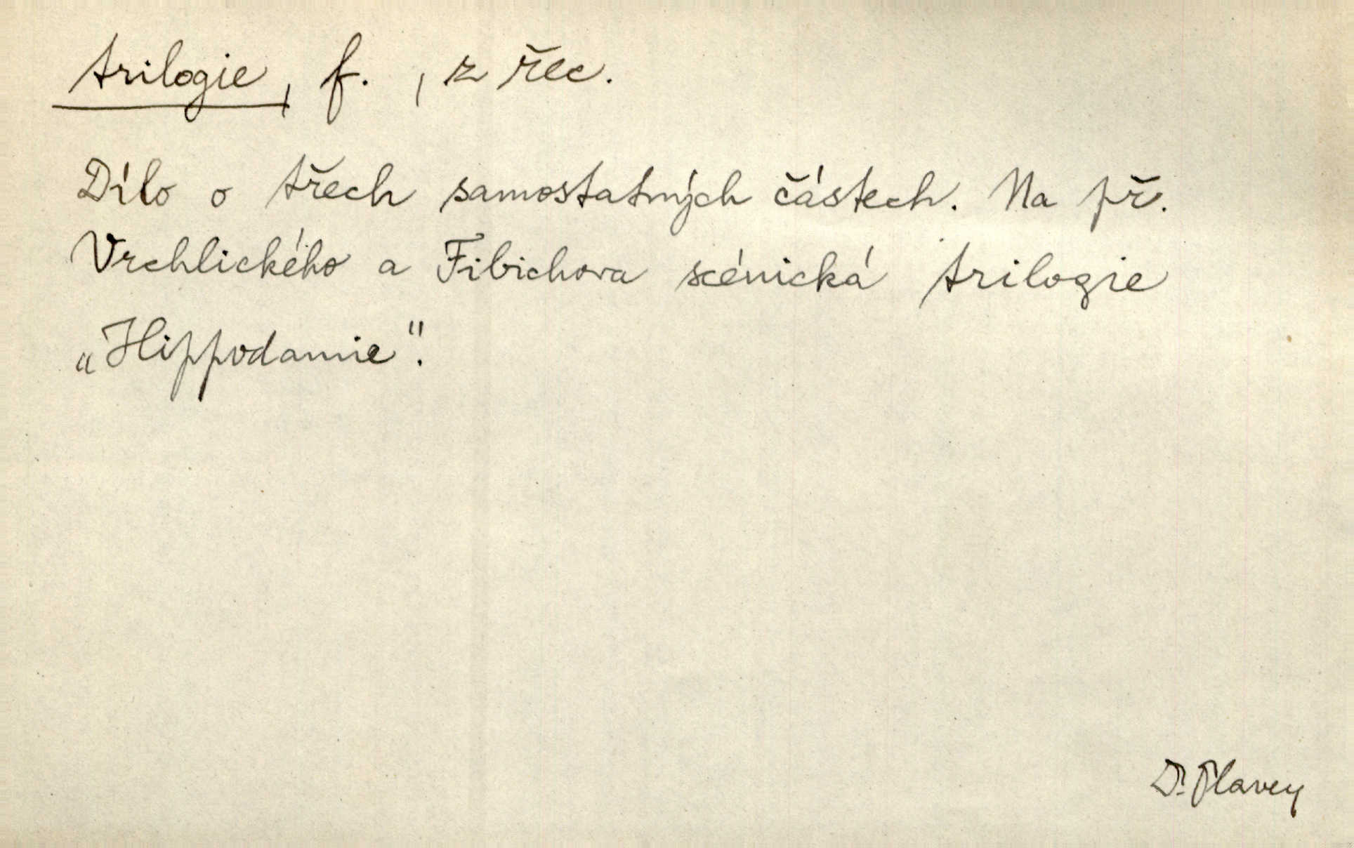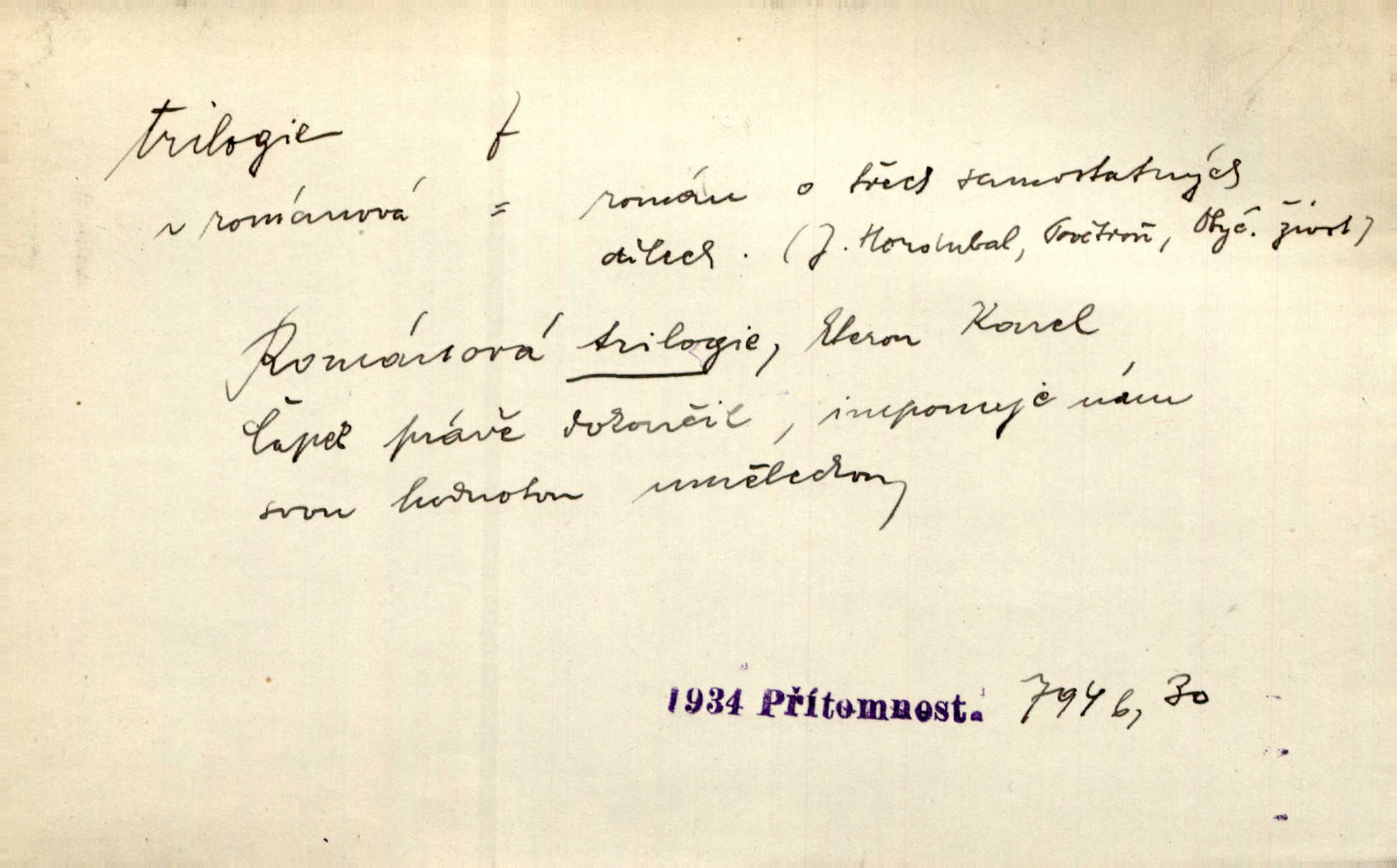 - trilogie, -e f. slovesné, zpr. dramatické n. románové dílo skládající se ze tří částí navzájem souvisících. Nejslavnější jeho trilogii Oresteii nedali cenu. V. Neb. V Schillerově Waldštýnské trilogii zračí se prvky tragedie osudové. Lit. č. „Bratrstvo“ zove se trilogie, jejíž první díl „Bitva u Lučence“ je hotov. Mach. Revoluční trilogie vznikla po „Poslu“. Dyk. První část lyricky erotické trilogie. Šal.