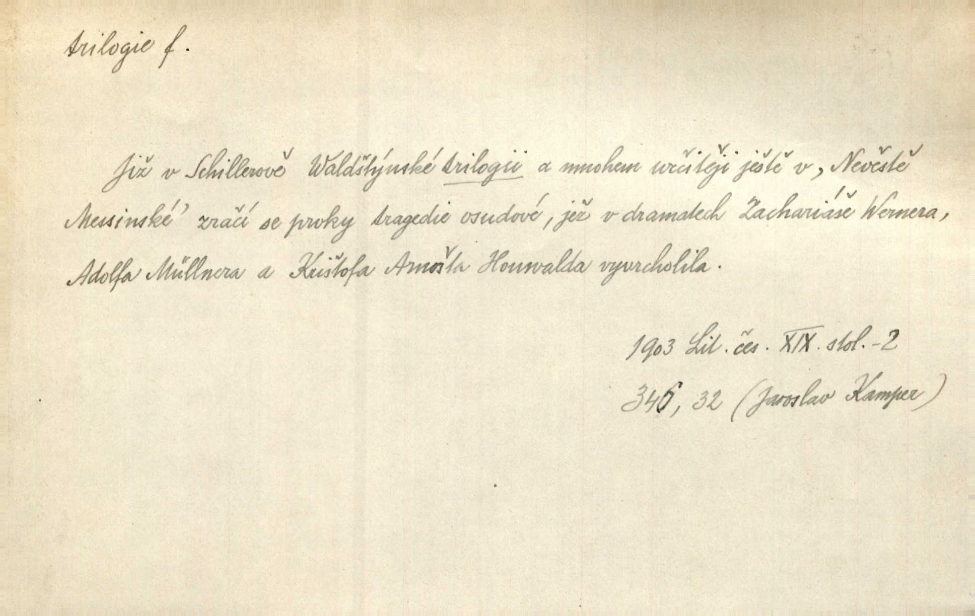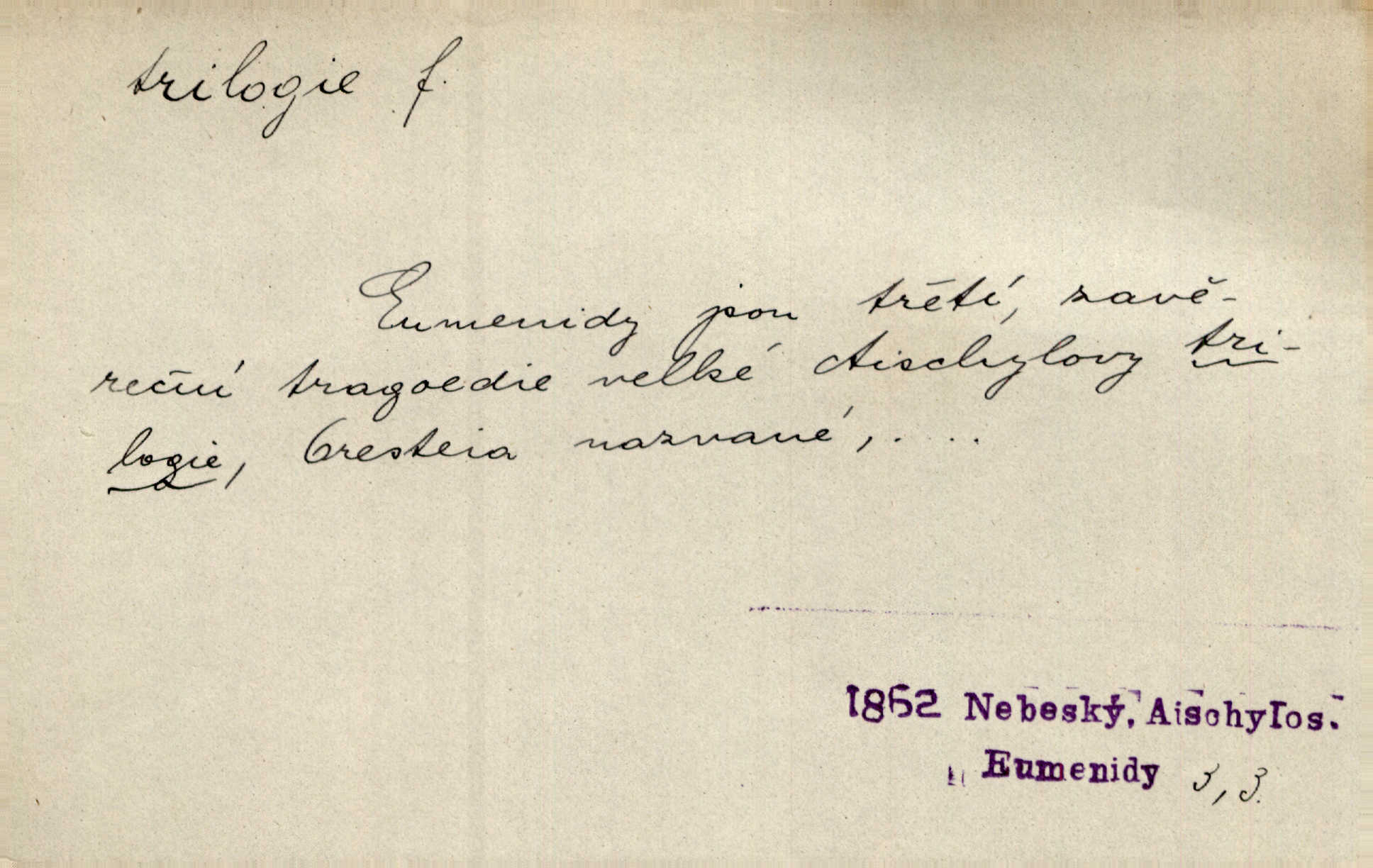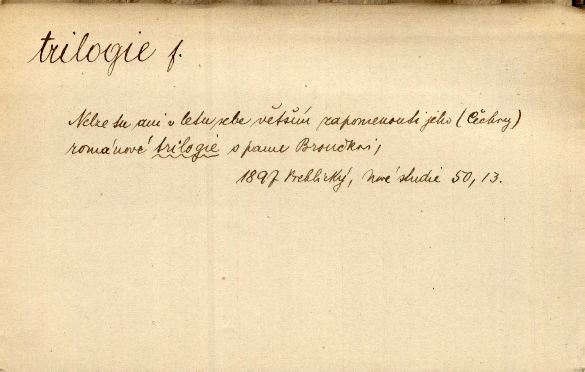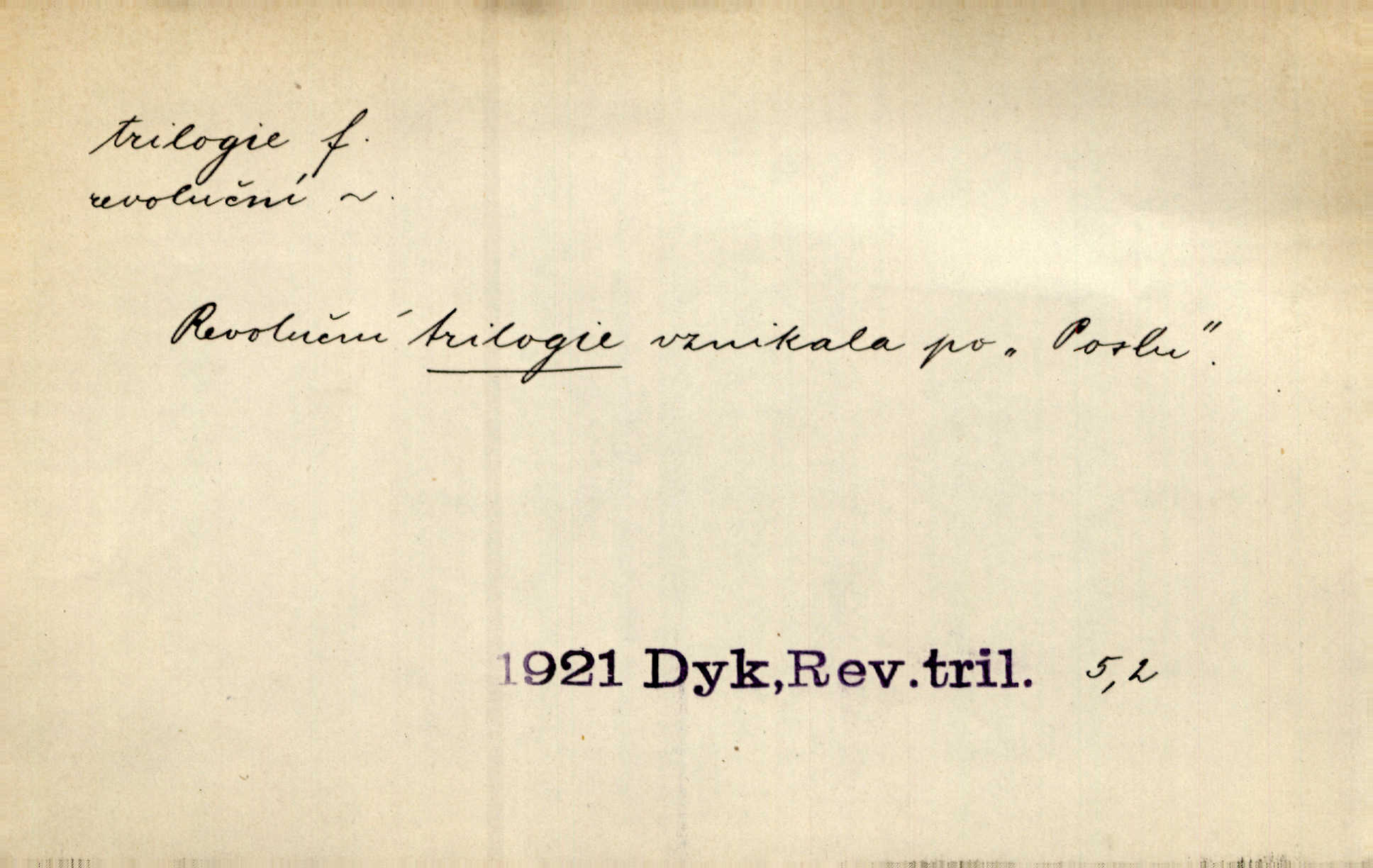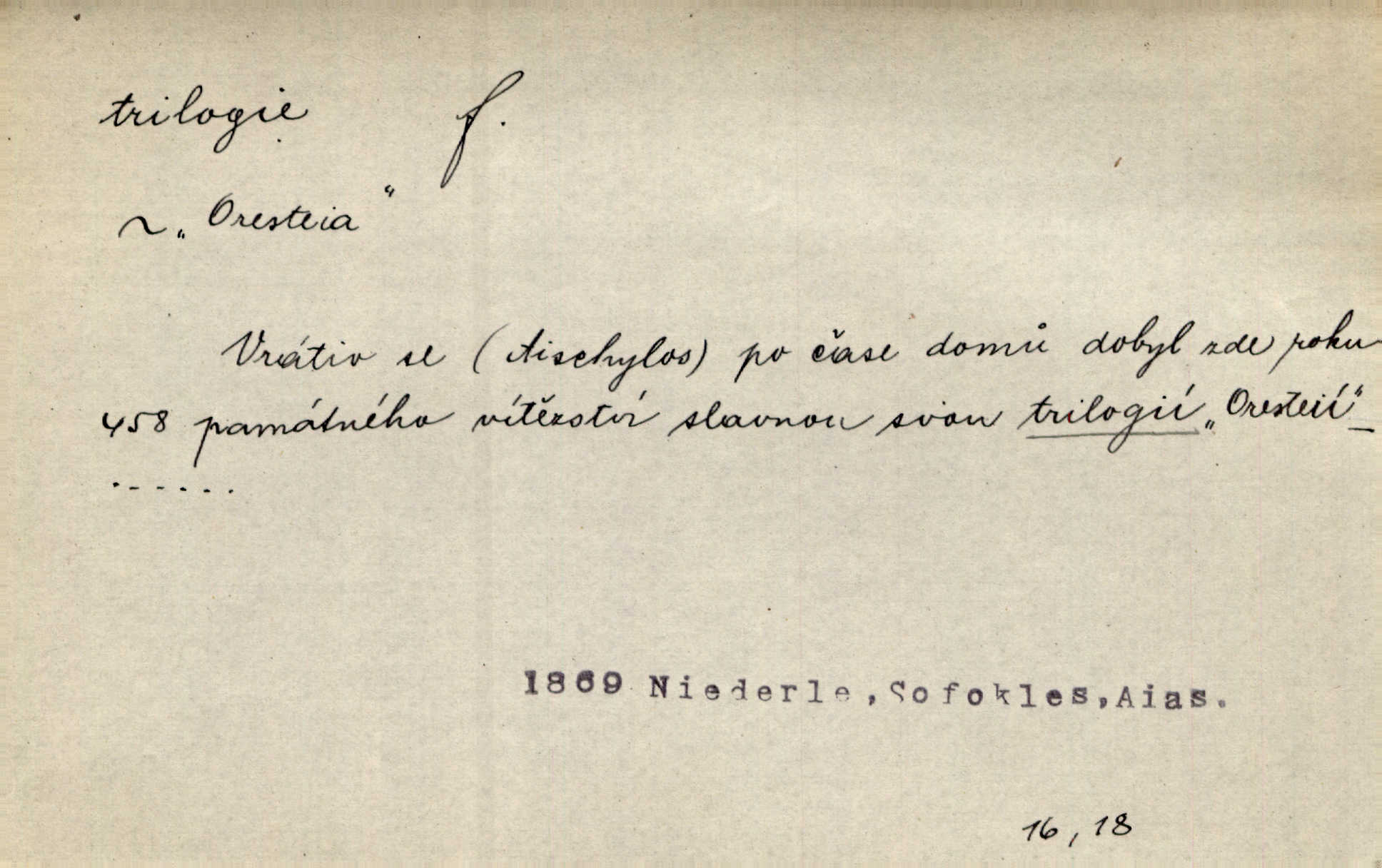 - trilogie, -e f. slovesné, zpr. dramatické n. románové dílo skládající se ze tří částí navzájem souvisících. Nejslavnější jeho trilogii Oresteii nedali cenu. V. Neb. V Schillerově Waldštýnské trilogii zračí se prvky tragedie osudové. Lit. č. „Bratrstvo“ zove se trilogie, jejíž první díl „Bitva u Lučence“ je hotov. Mach. Revoluční trilogie vznikla po „Poslu“. Dyk. První část lyricky erotické trilogie. Šal.
