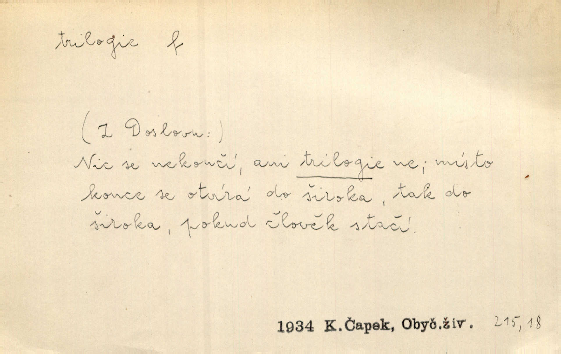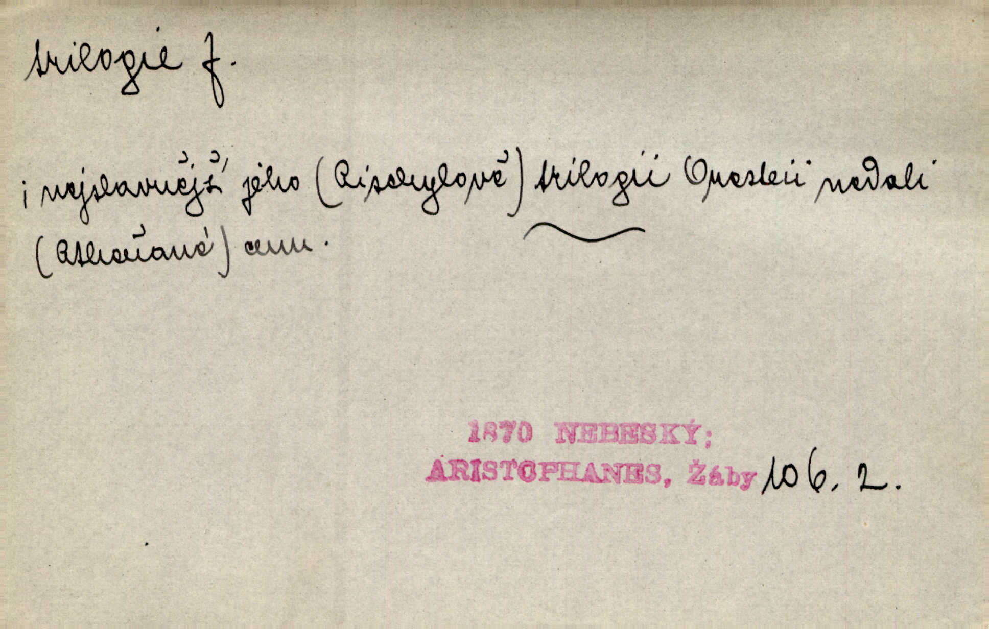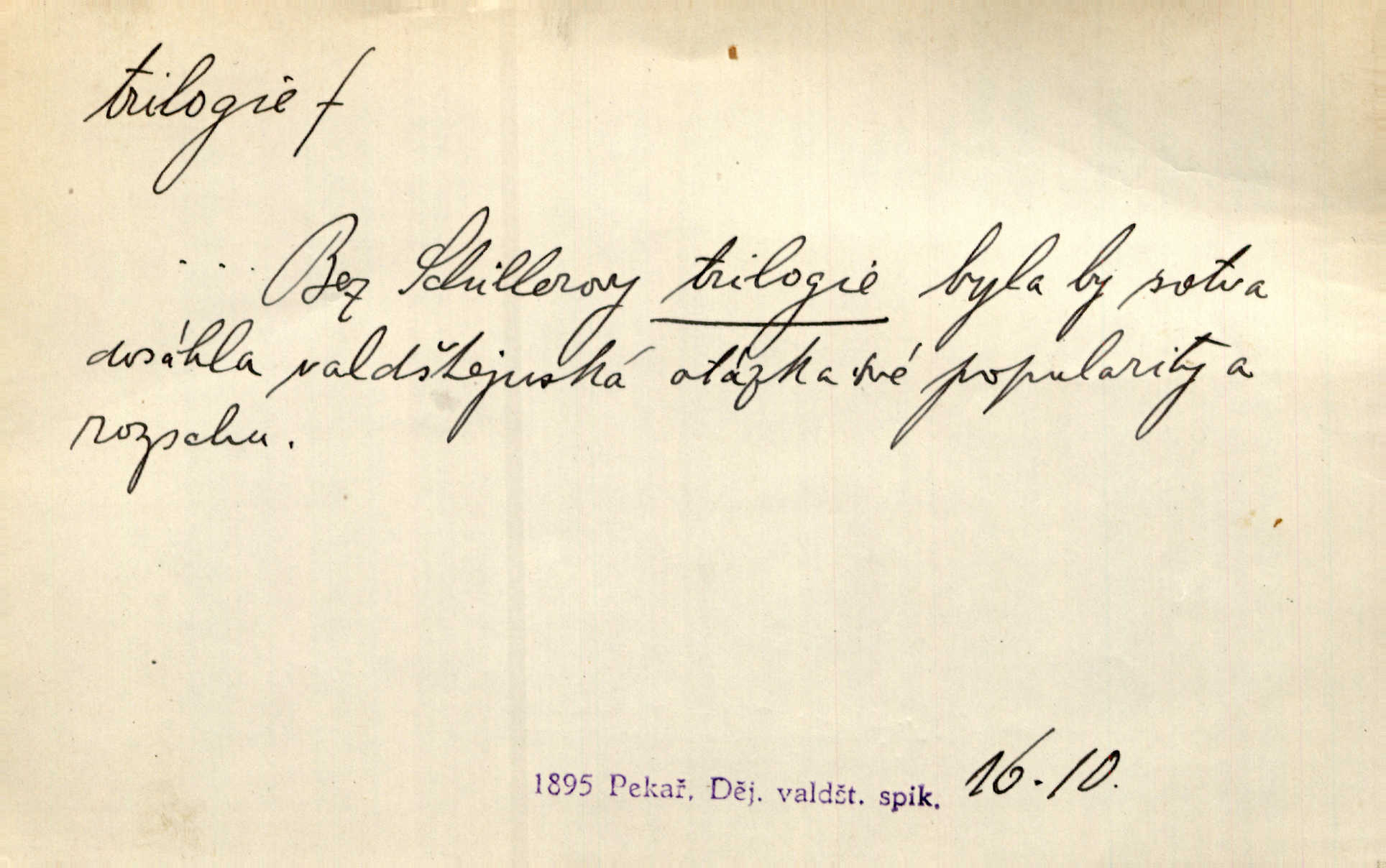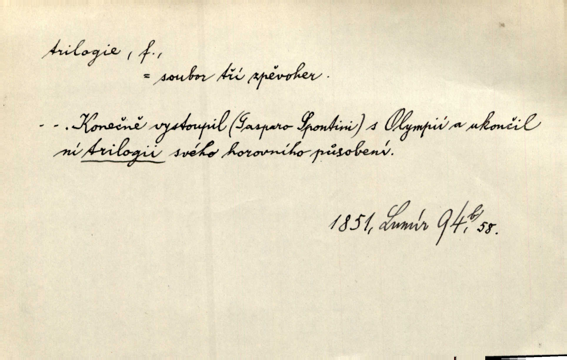 - trilogie, -e f. slovesné, zpr. dramatické n. románové dílo skládající se ze tří částí navzájem souvisících. Nejslavnější jeho trilogii Oresteii nedali cenu. V. Neb. V Schillerově Waldštýnské trilogii zračí se prvky tragedie osudové. Lit. č. „Bratrstvo“ zove se trilogie, jejíž první díl „Bitva u Lučence“ je hotov. Mach. Revoluční trilogie vznikla po „Poslu“. Dyk. První část lyricky erotické trilogie. Šal.