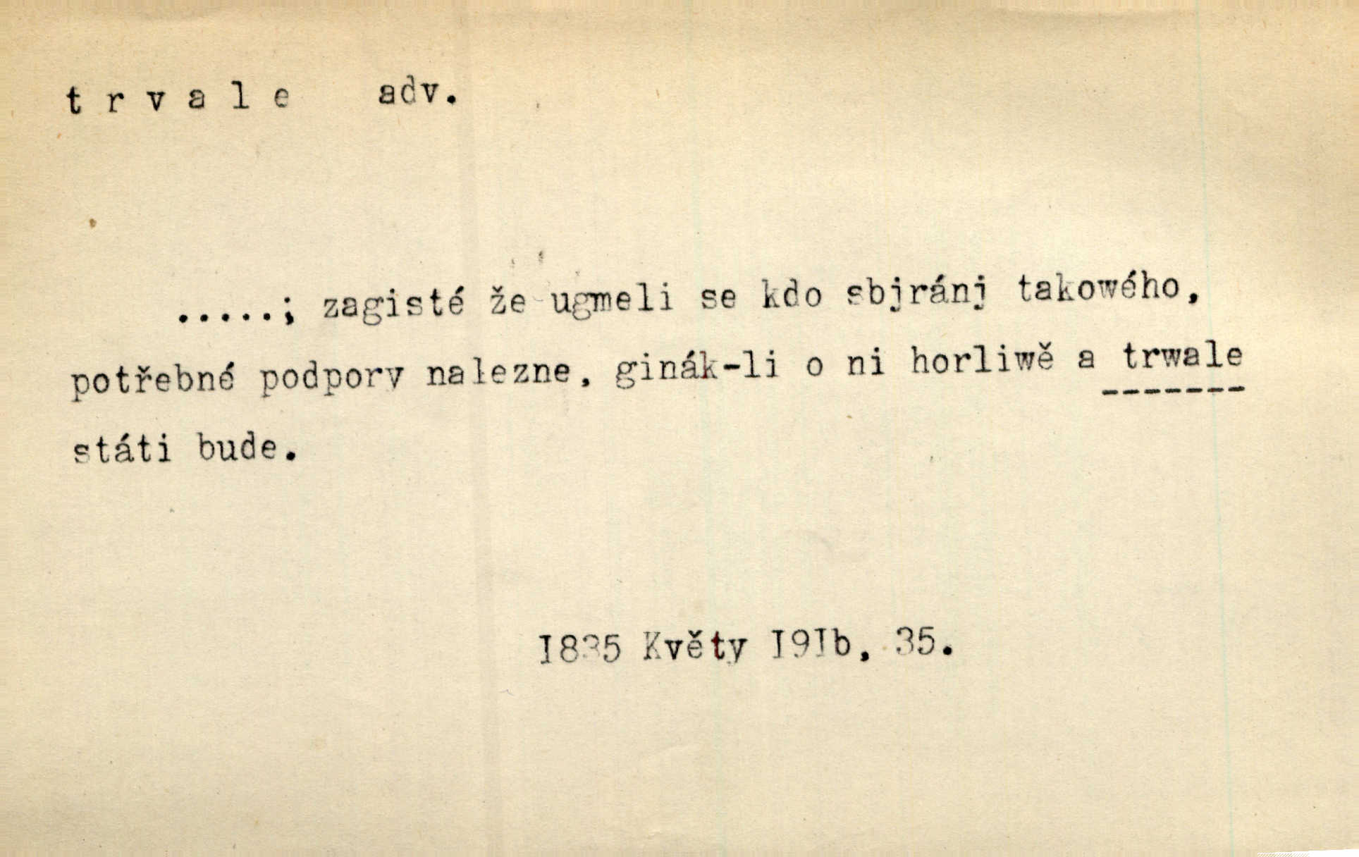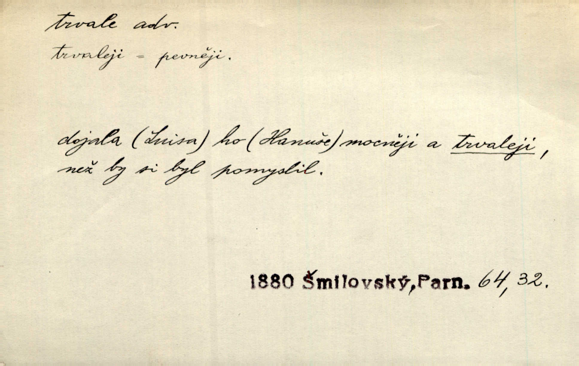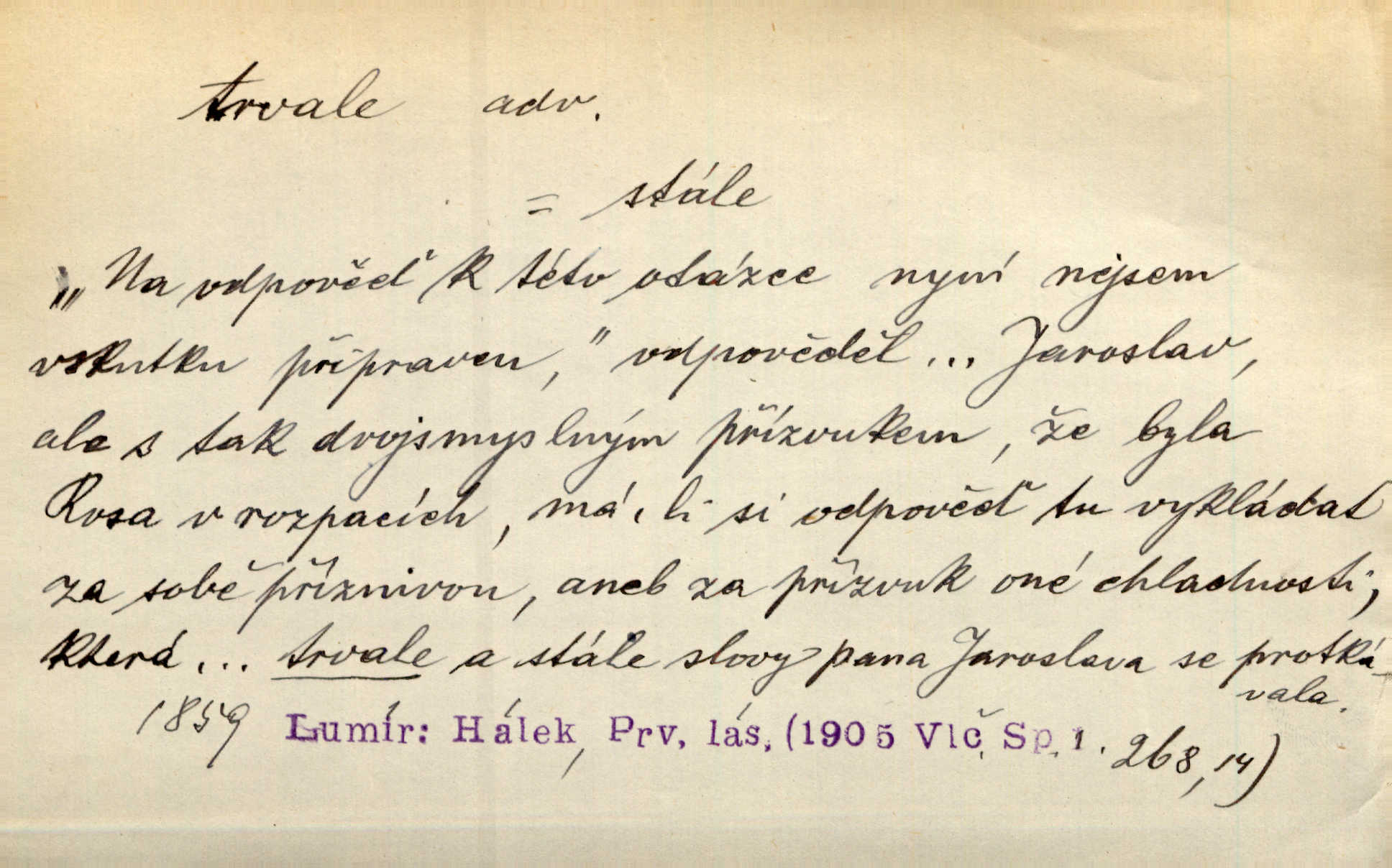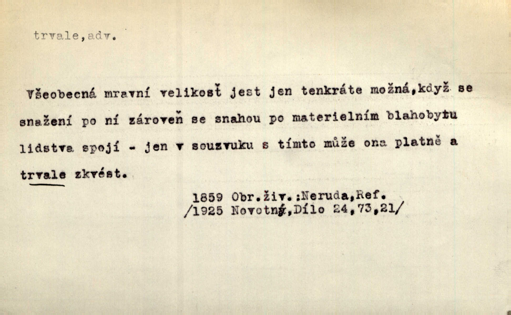 - trvale adv. k trvalý. Jen člověk klidný, nevášnivý může býti trvale šťastným ustavičně. Arb. [Leconte de Lisle] trvale usadil se v Paříži natrvalo. Vrch. Soudcové z povolání jsou na svá místa ustanovováni vždy trvale. Ústava.
