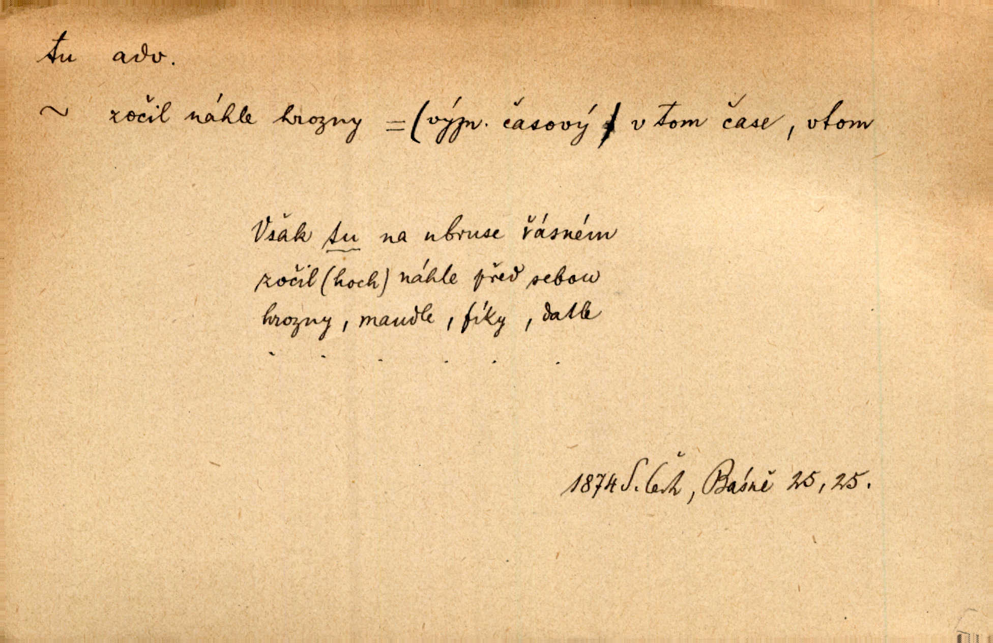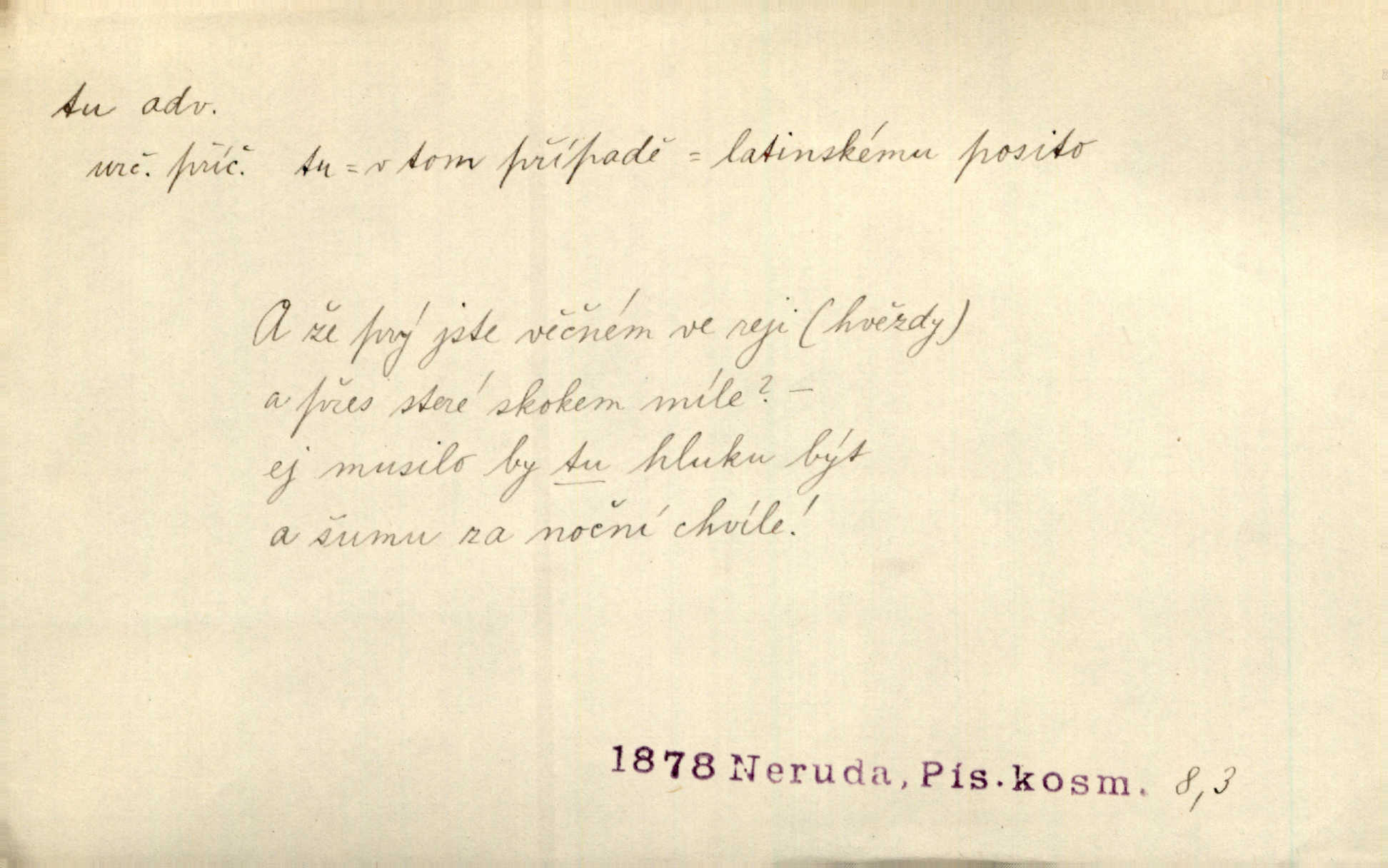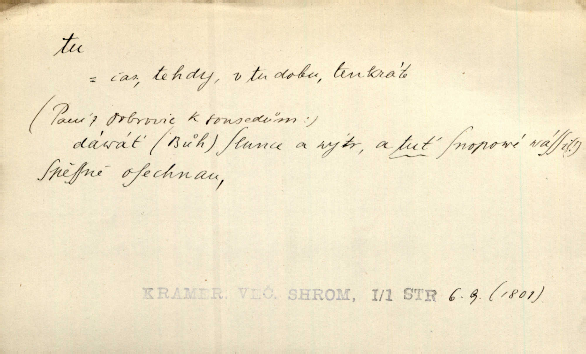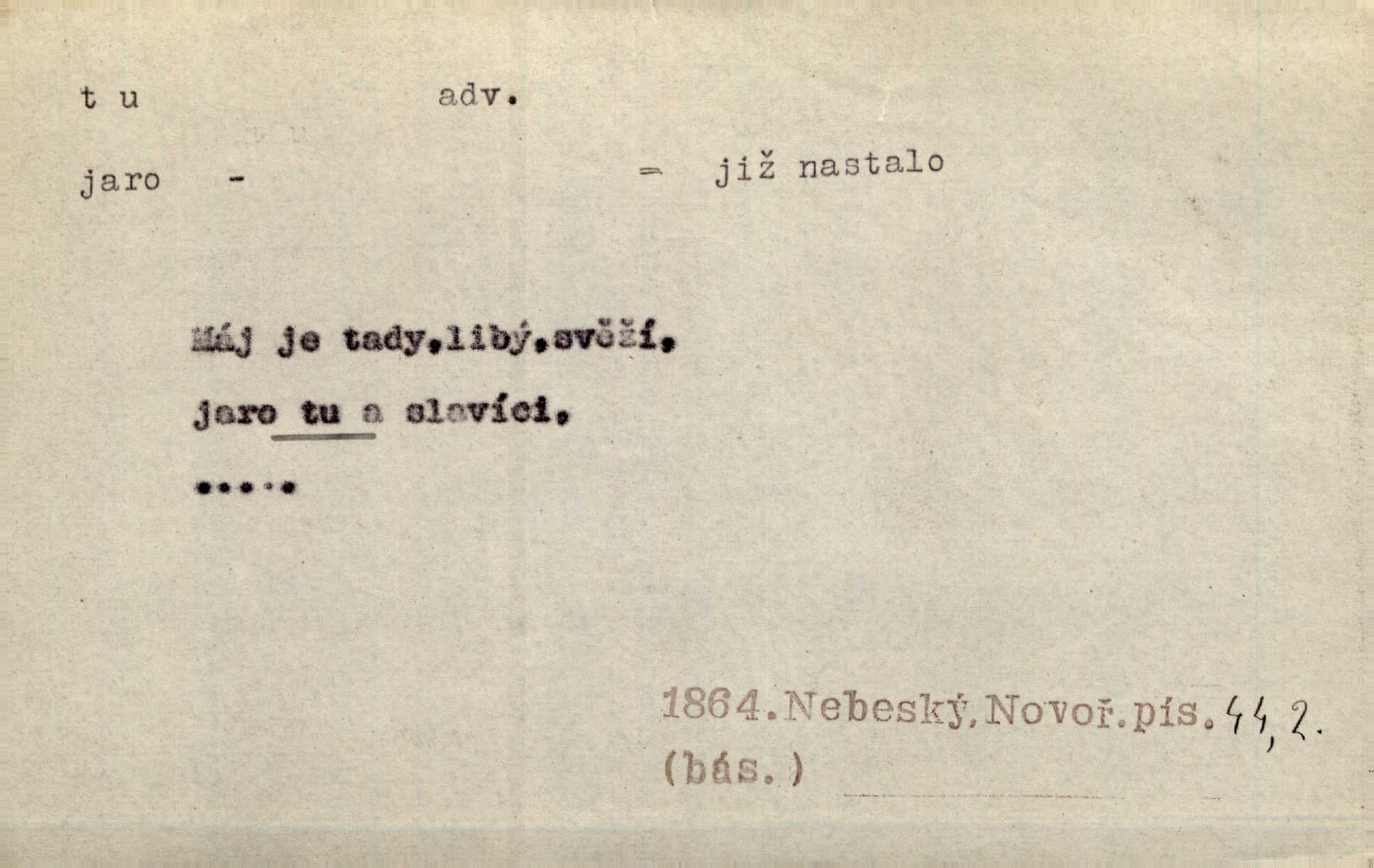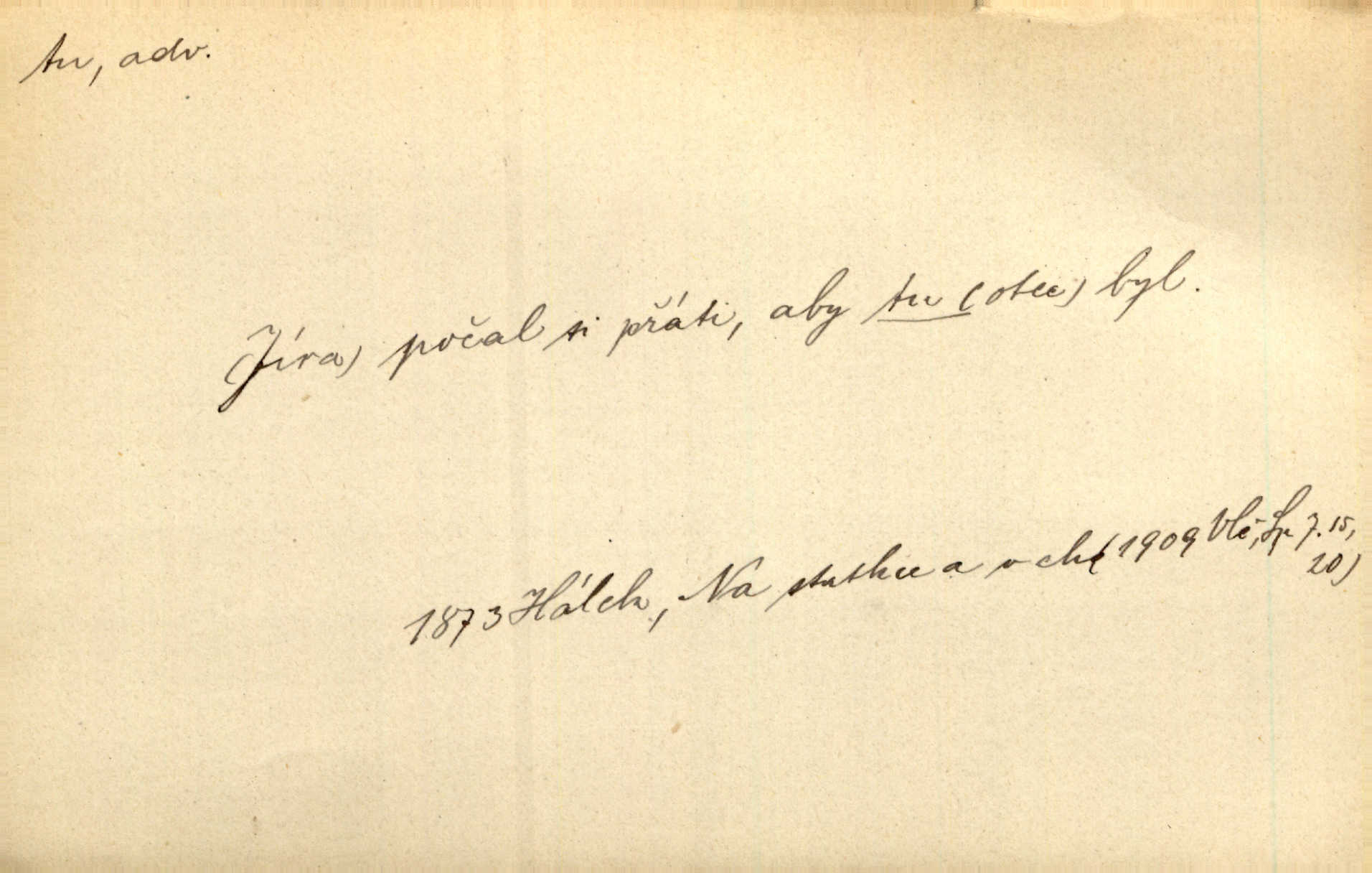 - tu adv. vyjadřující určité místo, na něž se zprav. ukazuje n. odkazuje; zde, na tomto místě. Stará šla a za chvíli tu byla s večeří. Herrm. Tu dole stojí kmotr Nuccio. Zey. Čejč také tím bohatl, že tu vedla silnice z Uher k Brnu. Herb. Je bez místa, a je tu rodina má rodinu. Jir. „Tu je má ruka, Zázvore.“ odvětil Brok, tiskna mu pravici. Štol. „Tu máte, poslíčku — za cestu —“ a podávala mu celý desetník. Baar. „Už je dávno na věčnosti a já jsem ještě tu,“ vzdychla stařenka na tomto světě, na zemi. Něm. Sáhl do torby, aby vytáhl Palečka i peníze, ale nastojte, — torba jako sklo — kde nic, tu nic! Něm. Proč pak si bral takovou ženskou kde nic tu nic? úplně chudou, bez prostředků. Rais. Kde se vzal, tu se vzal, stojí náhle před Cimburou voják. Baar. Tu a tam bylo vidět u silnice osyku. Jir. Pracoval tu i tam za chasníka. Šmil. Nikde nebylo viděti človíčka, jen tu tam poskakoval vrabec. Herrm. Leda že se ohlédl po stádu krav a koz, nebo po ovcích v houfu, tu větším, tam menším. Jir. Pole ta bez stromů, většinou rovná a jen tu onde stoupající mírnou vlnou, tratila se na obzoru. Jir. D Expr. v některých spojeních (tu máš! a j.) vyjadřuje podiv, překvapení. Myslel jsem, že budeš jako plnoletý moudřejší, ale tu máš čerte kropáč, bylo to čím dál tím horší. Čap. Ch. Přiběhlo na roh ulice a — tu máš! Stál tam pan strážník. Mateříd. Myslil si, že bude mít děvče radost, zatím tu máš! Zastihne nevěstu v objetí vlastního bratra. Svět. D Dial. na toto místo, v tato místa, sem. Oni prajeli — že stě hevaj. — Ja sem tu šel. Nor. D vyjadřuje čas: v té chvíli, v tom okamžiku, tehdy, „Bratr je ženat, a víte také, že švakrová —“ tu ustala a pohlédla na mne tázavě. Šim. Okamžik nechtělo se jaksi nikomu dovnitř. Tu se sebral Vácslav a vkročil mužně. Ner. Leda když viděl přicházeti vrchního, tu ovšem skočil na nohy. Herb. Tu se na Josefa i všelijaká nectnost ukázala. Mistr doslýchal, že se tu a tam opil někdy. Prav. Domácnost i polní hospodářství spravovala Evička s čeládkou, on jen tu a tam svou vůli projevil občas. Svět. Musí děvče kolikrát za den běžet tu na pole, tu na trávu. Něm. Tu zpozoruje, že mi schází knoflík na zimníku, tu že mám odtržené poutko. Šim. Šla pal po mně, obracel mne tu tváří k zemi, tu na znak, klekal mi tu prsa, tu na záda. Čech. Expr. Než to po těch harantech všecko uklidím a srovnám, máte tu konec července. Šim. Když blížila se volba do obecního výboru, jakého tu bylo běhání. Šmil.