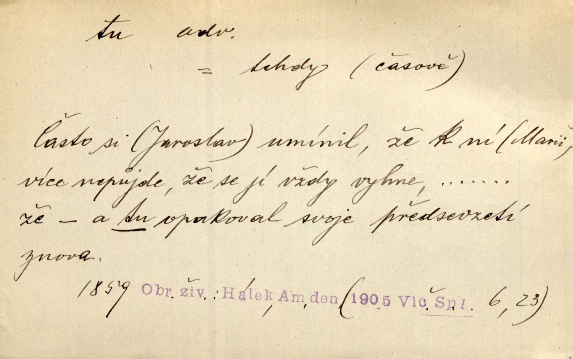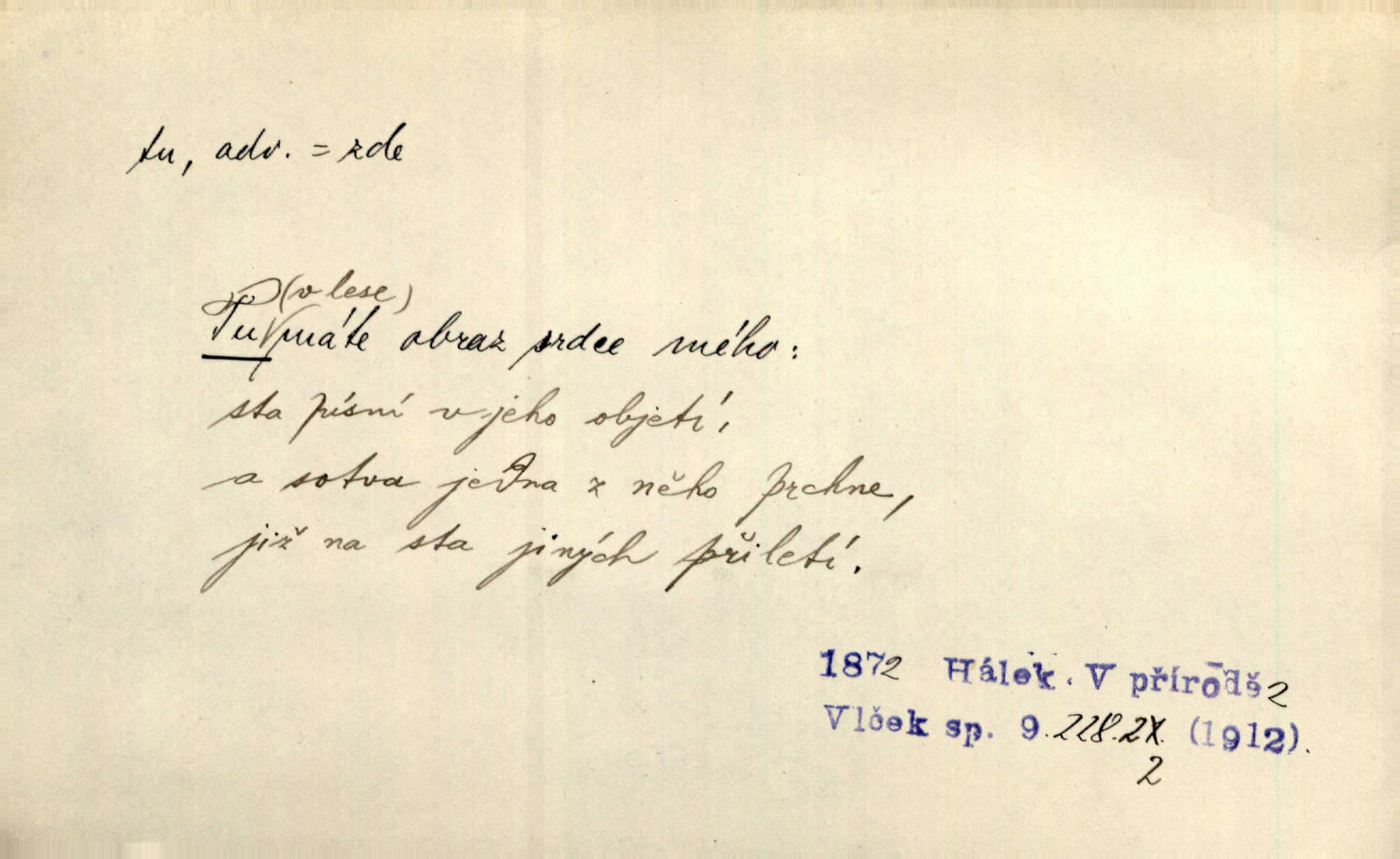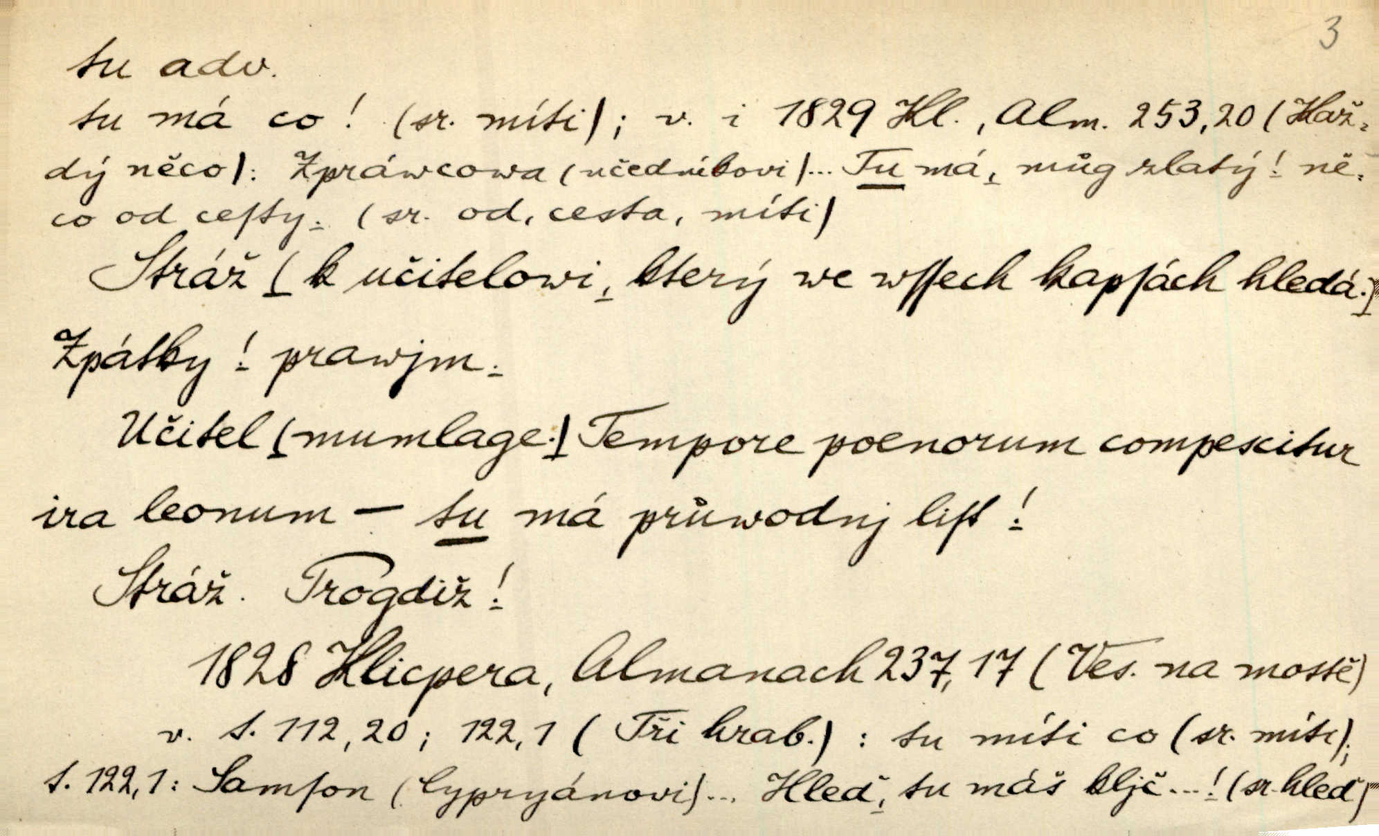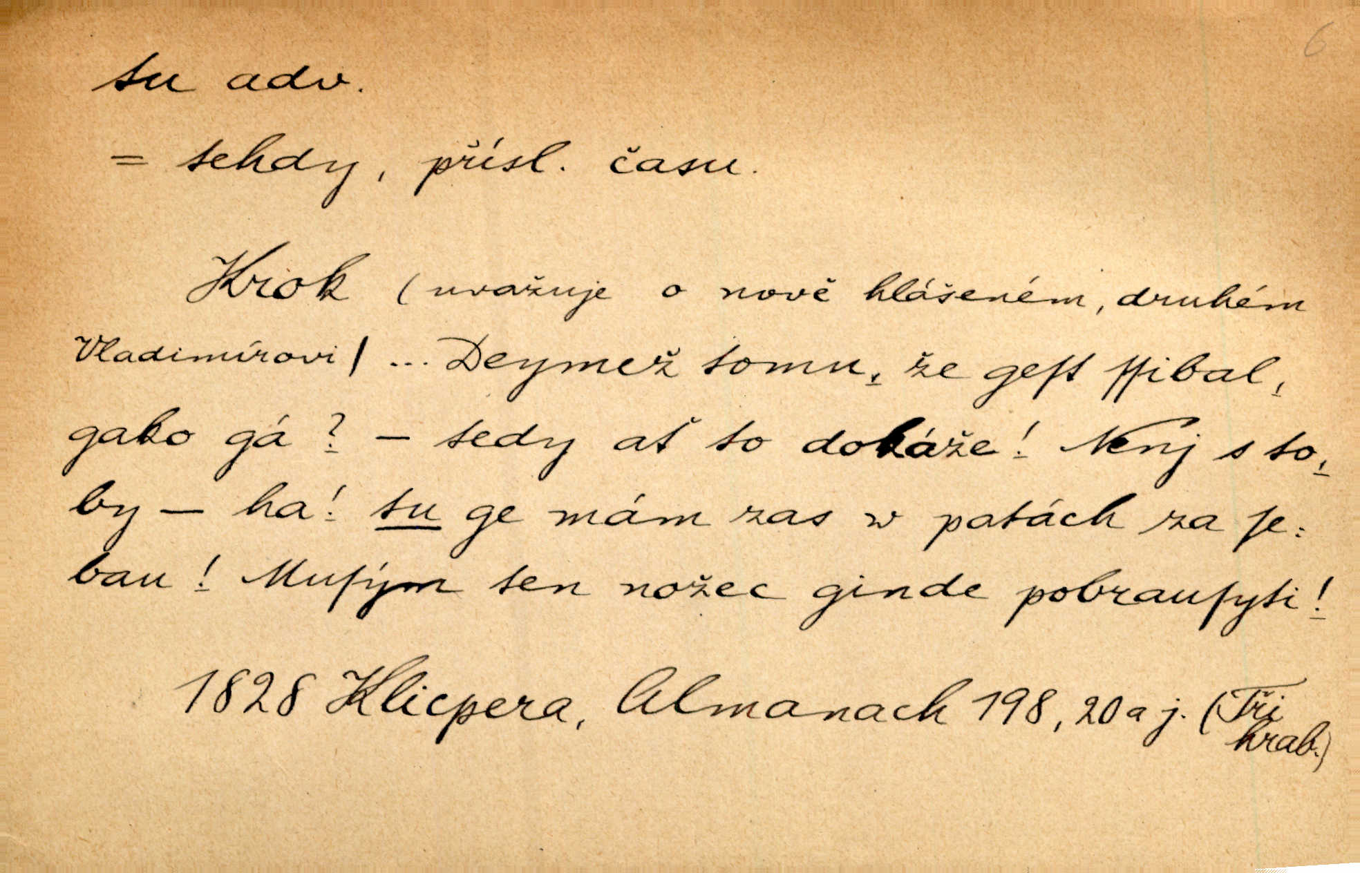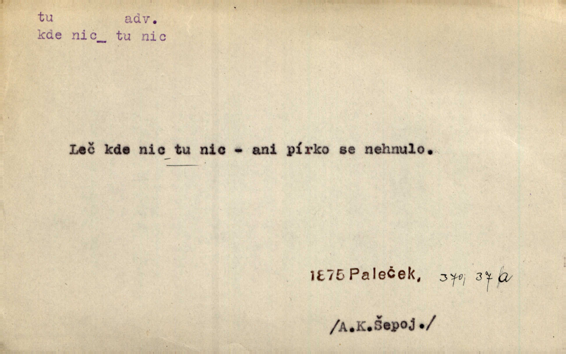 - tu adv. vyjadřující určité místo, na něž se zprav. ukazuje n. odkazuje; zde, na tomto místě. Stará šla a za chvíli tu byla s večeří. Herrm. Tu dole stojí kmotr Nuccio. Zey. Čejč také tím bohatl, že tu vedla silnice z Uher k Brnu. Herb. Je bez místa, a je tu rodina má rodinu. Jir. „Tu je má ruka, Zázvore.“ odvětil Brok, tiskna mu pravici. Štol. „Tu máte, poslíčku — za cestu —“ a podávala mu celý desetník. Baar. „Už je dávno na věčnosti a já jsem ještě tu,“ vzdychla stařenka na tomto světě, na zemi. Něm. Sáhl do torby, aby vytáhl Palečka i peníze, ale nastojte, — torba jako sklo — kde nic, tu nic! Něm. Proč pak si bral takovou ženskou kde nic tu nic? úplně chudou, bez prostředků. Rais. Kde se vzal, tu se vzal, stojí náhle před Cimburou voják. Baar. Tu a tam bylo vidět u silnice osyku. Jir. Pracoval tu i tam za chasníka. Šmil. Nikde nebylo viděti človíčka, jen tu tam poskakoval vrabec. Herrm. Leda že se ohlédl po stádu krav a koz, nebo po ovcích v houfu, tu větším, tam menším. Jir. Pole ta bez stromů, většinou rovná a jen tu onde stoupající mírnou vlnou, tratila se na obzoru. Jir. D Expr. v některých spojeních (tu máš! a j.) vyjadřuje podiv, překvapení. Myslel jsem, že budeš jako plnoletý moudřejší, ale tu máš čerte kropáč, bylo to čím dál tím horší. Čap. Ch. Přiběhlo na roh ulice a — tu máš! Stál tam pan strážník. Mateříd. Myslil si, že bude mít děvče radost, zatím tu máš! Zastihne nevěstu v objetí vlastního bratra. Svět. D Dial. na toto místo, v tato místa, sem. Oni prajeli — že stě hevaj. — Ja sem tu šel. Nor. D vyjadřuje čas: v té chvíli, v tom okamžiku, tehdy, „Bratr je ženat, a víte také, že švakrová —“ tu ustala a pohlédla na mne tázavě. Šim. Okamžik nechtělo se jaksi nikomu dovnitř. Tu se sebral Vácslav a vkročil mužně. Ner. Leda když viděl přicházeti vrchního, tu ovšem skočil na nohy. Herb. Tu se na Josefa i všelijaká nectnost ukázala. Mistr doslýchal, že se tu a tam opil někdy. Prav. Domácnost i polní hospodářství spravovala Evička s čeládkou, on jen tu a tam svou vůli projevil občas. Svět. Musí děvče kolikrát za den běžet tu na pole, tu na trávu. Něm. Tu zpozoruje, že mi schází knoflík na zimníku, tu že mám odtržené poutko. Šim. Šla pal po mně, obracel mne tu tváří k zemi, tu na znak, klekal mi tu prsa, tu na záda. Čech. Expr. Než to po těch harantech všecko uklidím a srovnám, máte tu konec července. Šim. Když blížila se volba do obecního výboru, jakého tu bylo běhání. Šmil.