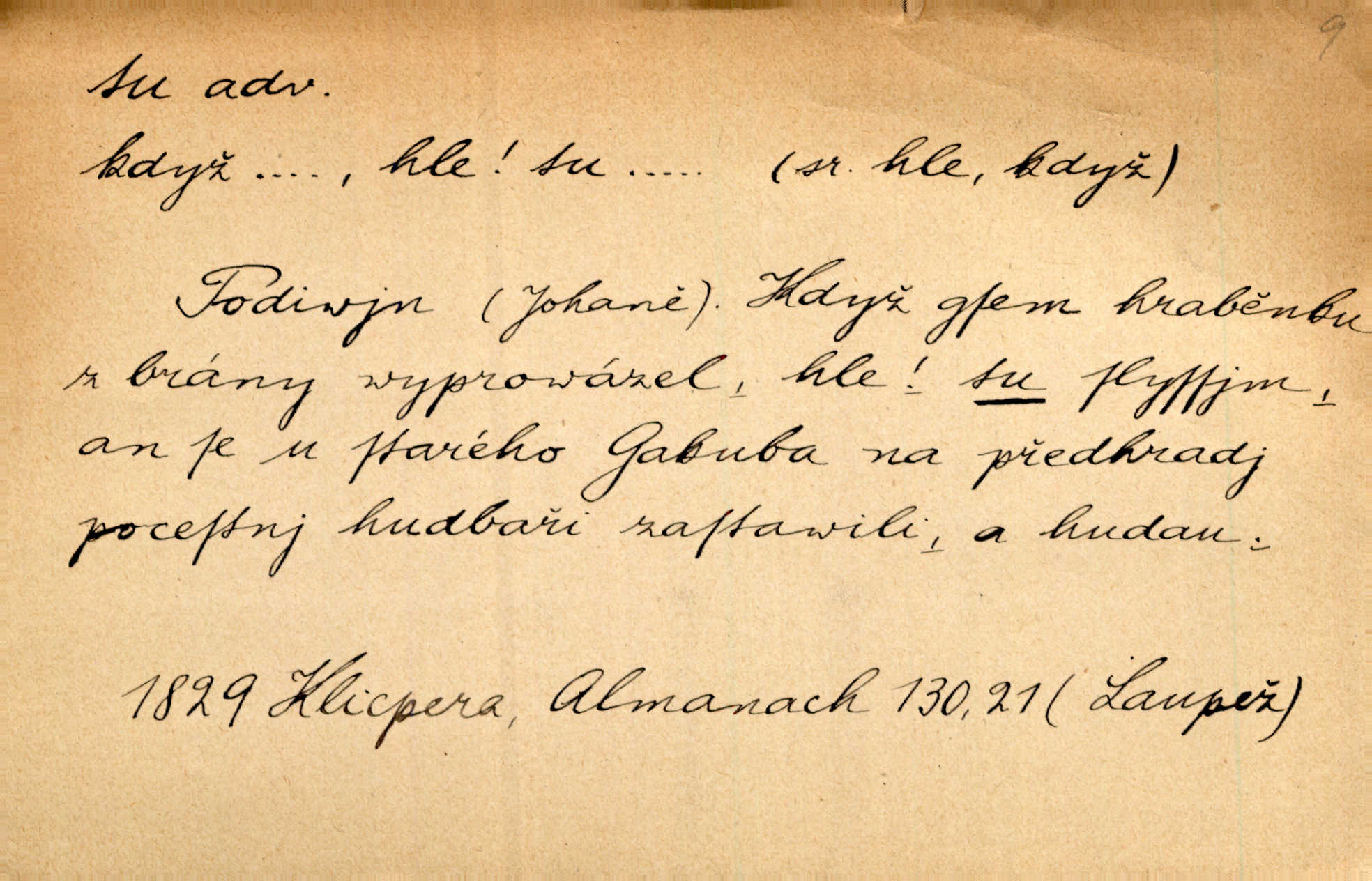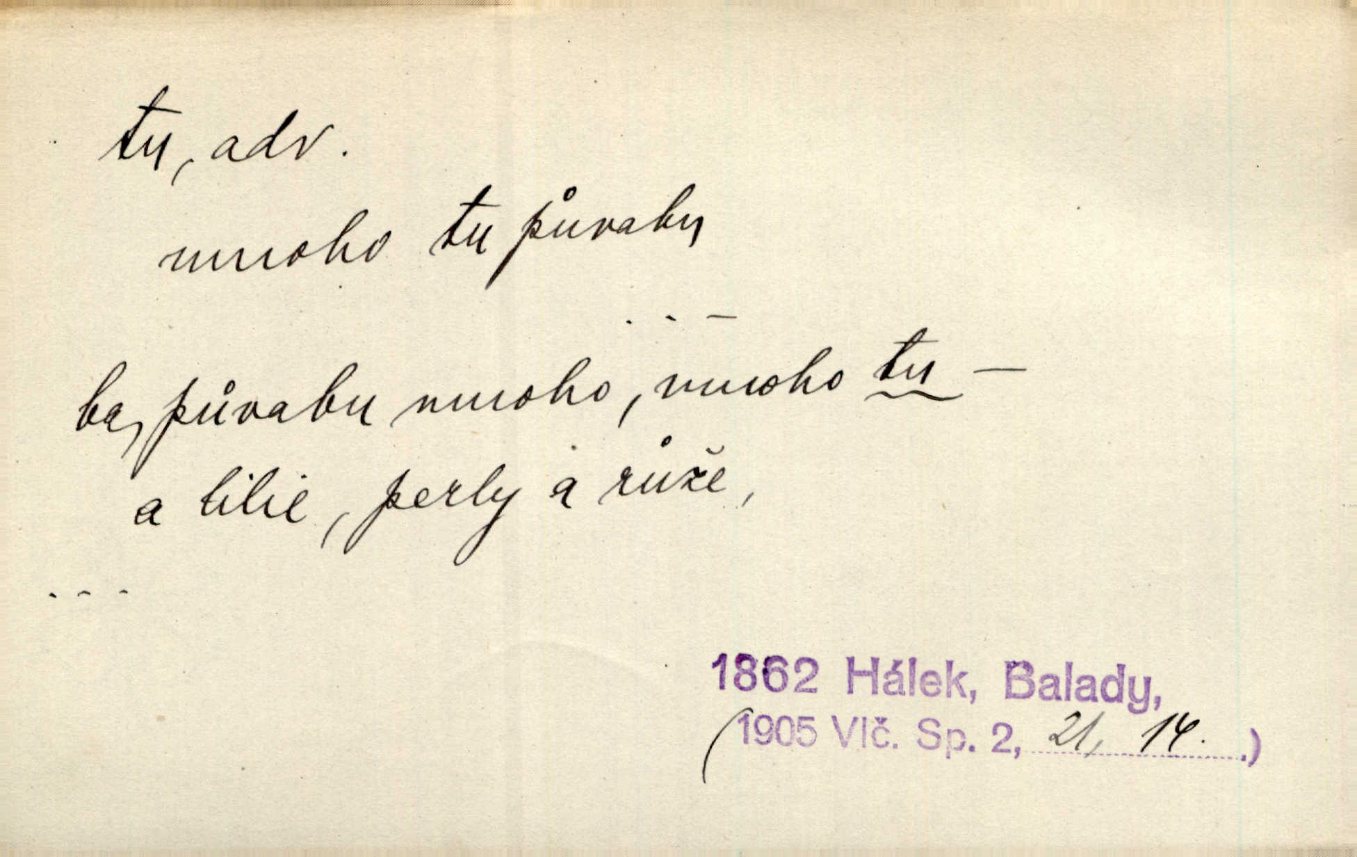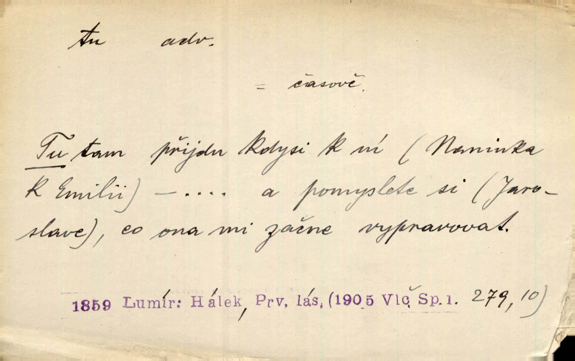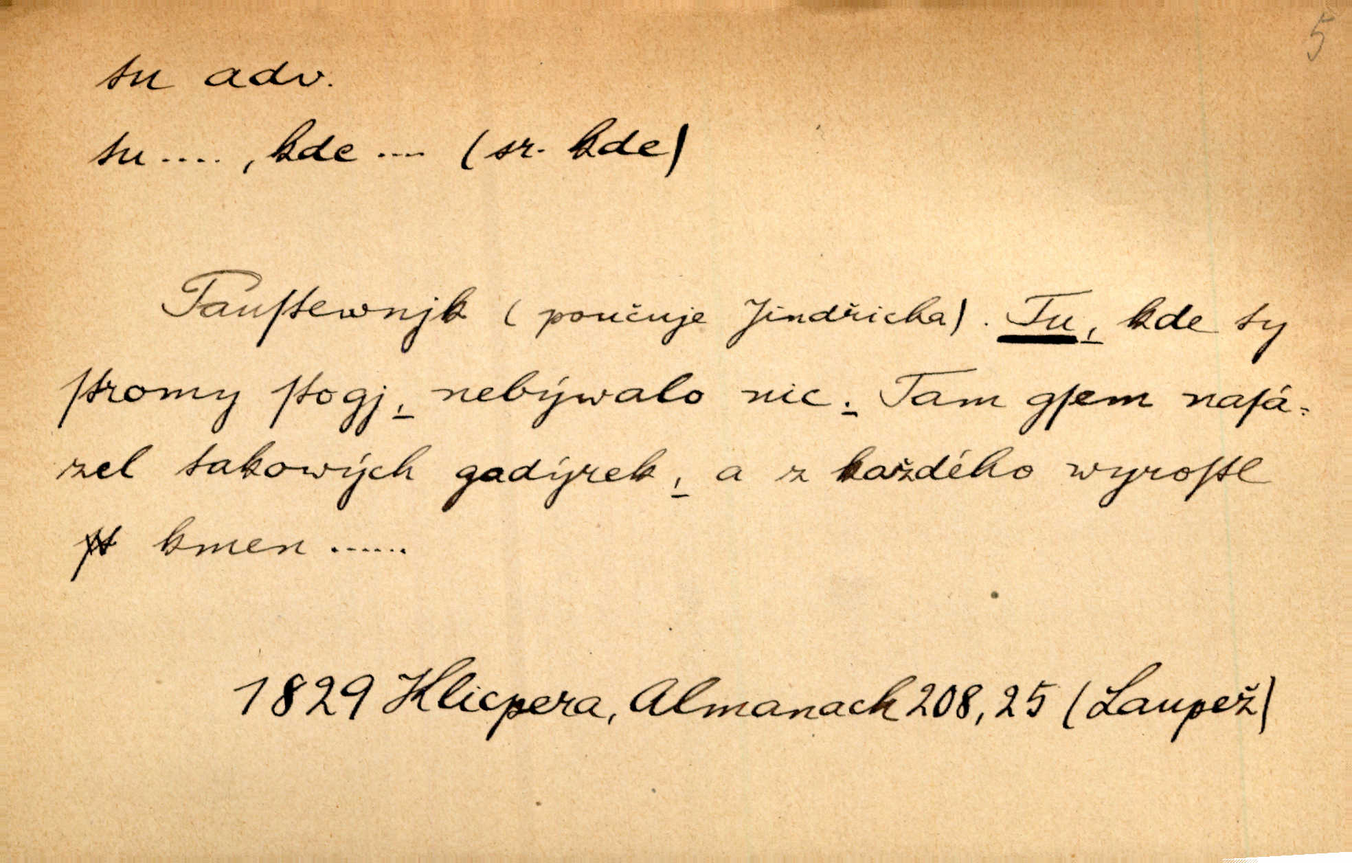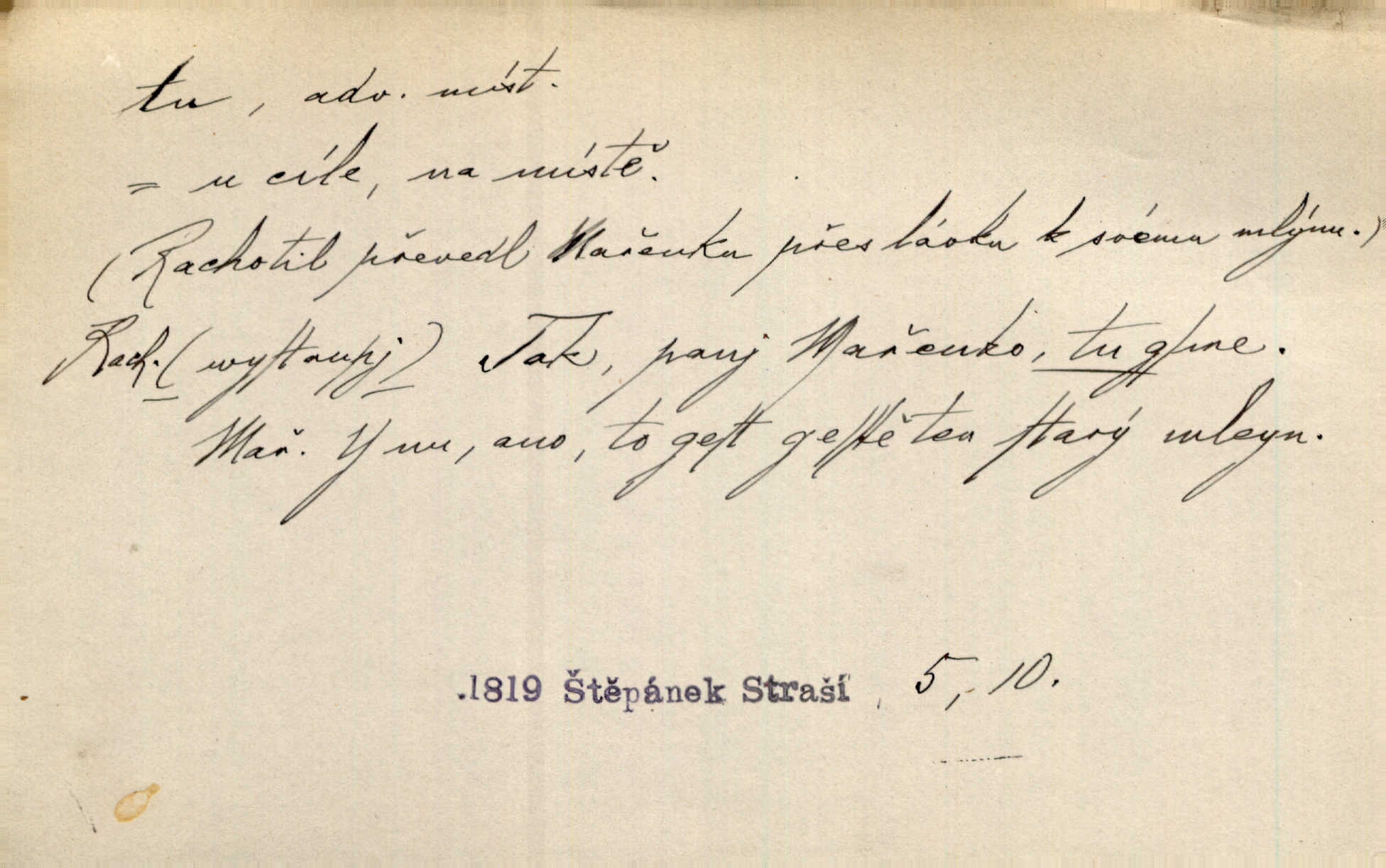 - tu adv. vyjadřující určité místo, na něž se zprav. ukazuje n. odkazuje; zde, na tomto místě. Stará šla a za chvíli tu byla s večeří. Herrm. Tu dole stojí kmotr Nuccio. Zey. Čejč také tím bohatl, že tu vedla silnice z Uher k Brnu. Herb. Je bez místa, a je tu rodina má rodinu. Jir. „Tu je má ruka, Zázvore.“ odvětil Brok, tiskna mu pravici. Štol. „Tu máte, poslíčku — za cestu —“ a podávala mu celý desetník. Baar. „Už je dávno na věčnosti a já jsem ještě tu,“ vzdychla stařenka na tomto světě, na zemi. Něm. Sáhl do torby, aby vytáhl Palečka i peníze, ale nastojte, — torba jako sklo — kde nic, tu nic! Něm. Proč pak si bral takovou ženskou kde nic tu nic? úplně chudou, bez prostředků. Rais. Kde se vzal, tu se vzal, stojí náhle před Cimburou voják. Baar. Tu a tam bylo vidět u silnice osyku. Jir. Pracoval tu i tam za chasníka. Šmil. Nikde nebylo viděti človíčka, jen tu tam poskakoval vrabec. Herrm. Leda že se ohlédl po stádu krav a koz, nebo po ovcích v houfu, tu větším, tam menším. Jir. Pole ta bez stromů, většinou rovná a jen tu onde stoupající mírnou vlnou, tratila se na obzoru. Jir. D Expr. v některých spojeních (tu máš! a j.) vyjadřuje podiv, překvapení. Myslel jsem, že budeš jako plnoletý moudřejší, ale tu máš čerte kropáč, bylo to čím dál tím horší. Čap. Ch. Přiběhlo na roh ulice a — tu máš! Stál tam pan strážník. Mateříd. Myslil si, že bude mít děvče radost, zatím tu máš! Zastihne nevěstu v objetí vlastního bratra. Svět. D Dial. na toto místo, v tato místa, sem. Oni prajeli — že stě hevaj. — Ja sem tu šel. Nor. D vyjadřuje čas: v té chvíli, v tom okamžiku, tehdy, „Bratr je ženat, a víte také, že švakrová —“ tu ustala a pohlédla na mne tázavě. Šim. Okamžik nechtělo se jaksi nikomu dovnitř. Tu se sebral Vácslav a vkročil mužně. Ner. Leda když viděl přicházeti vrchního, tu ovšem skočil na nohy. Herb. Tu se na Josefa i všelijaká nectnost ukázala. Mistr doslýchal, že se tu a tam opil někdy. Prav. Domácnost i polní hospodářství spravovala Evička s čeládkou, on jen tu a tam svou vůli projevil občas. Svět. Musí děvče kolikrát za den běžet tu na pole, tu na trávu. Něm. Tu zpozoruje, že mi schází knoflík na zimníku, tu že mám odtržené poutko. Šim. Šla pal po mně, obracel mne tu tváří k zemi, tu na znak, klekal mi tu prsa, tu na záda. Čech. Expr. Než to po těch harantech všecko uklidím a srovnám, máte tu konec července. Šim. Když blížila se volba do obecního výboru, jakého tu bylo běhání. Šmil.