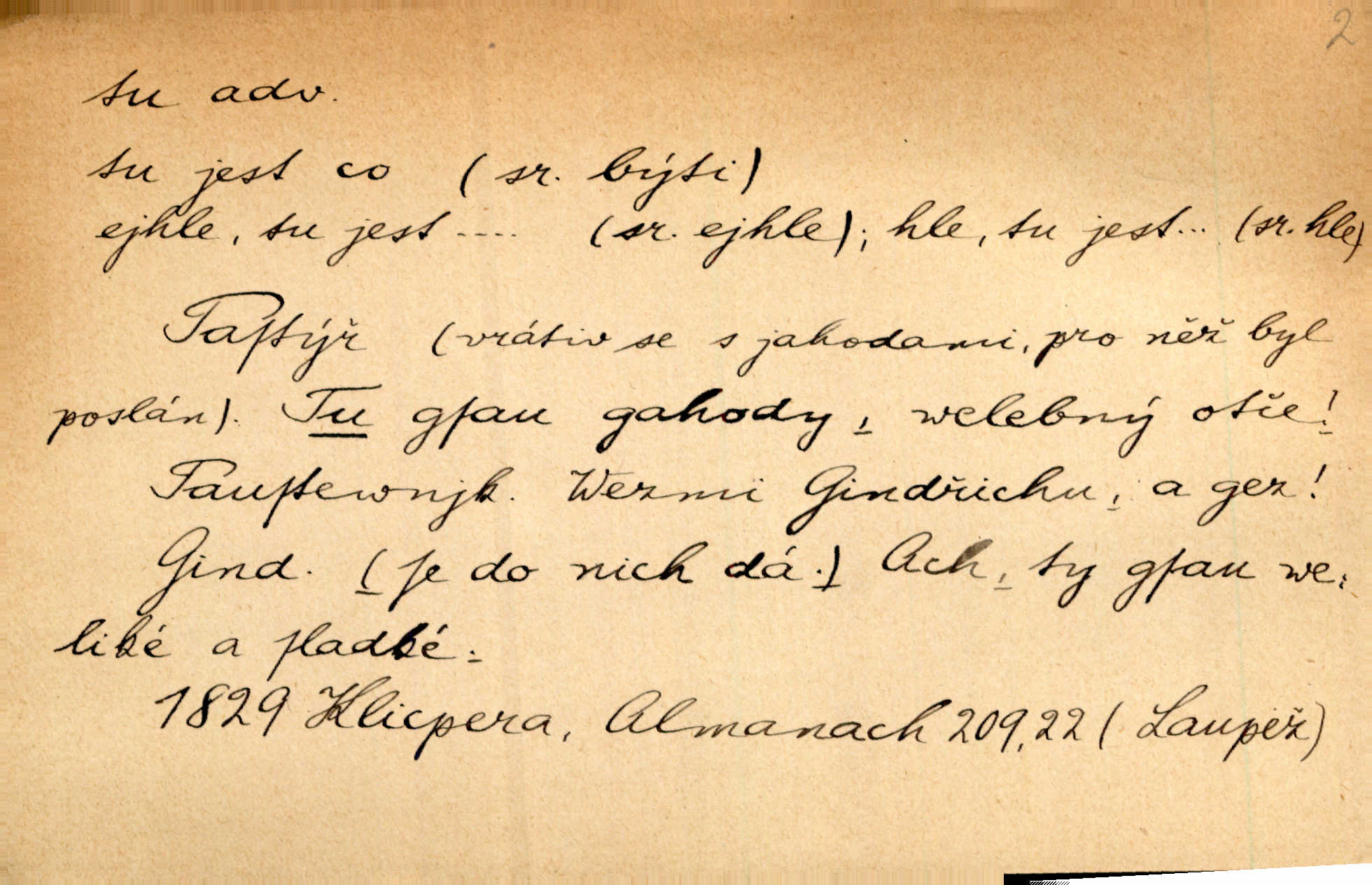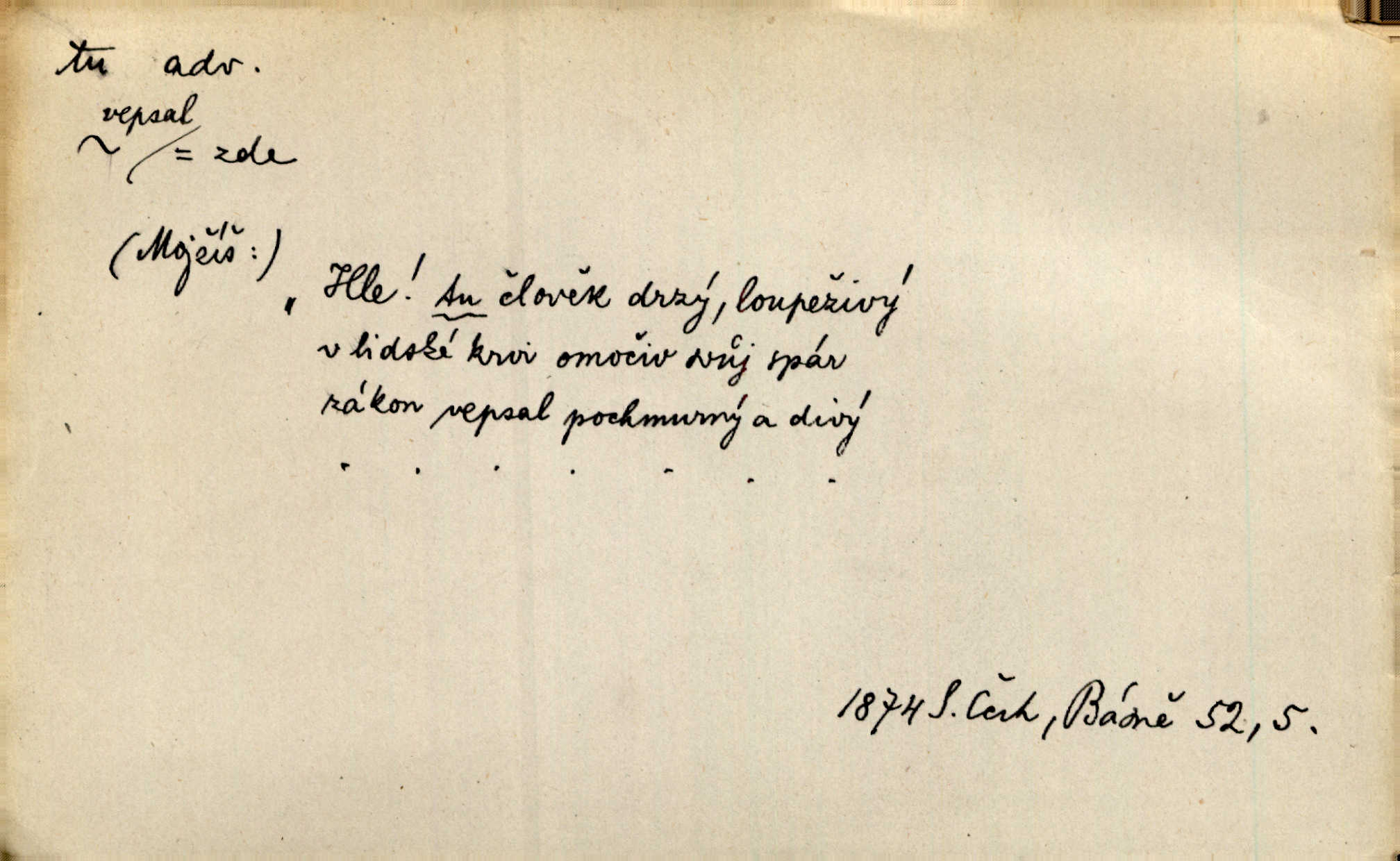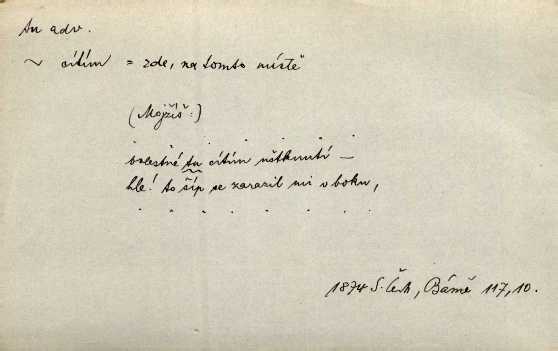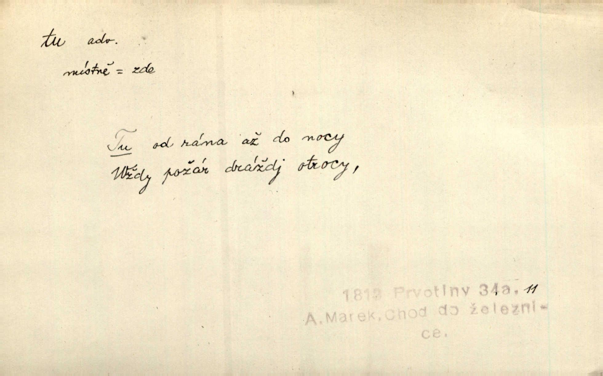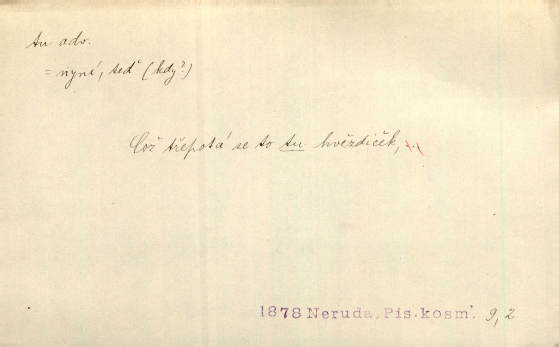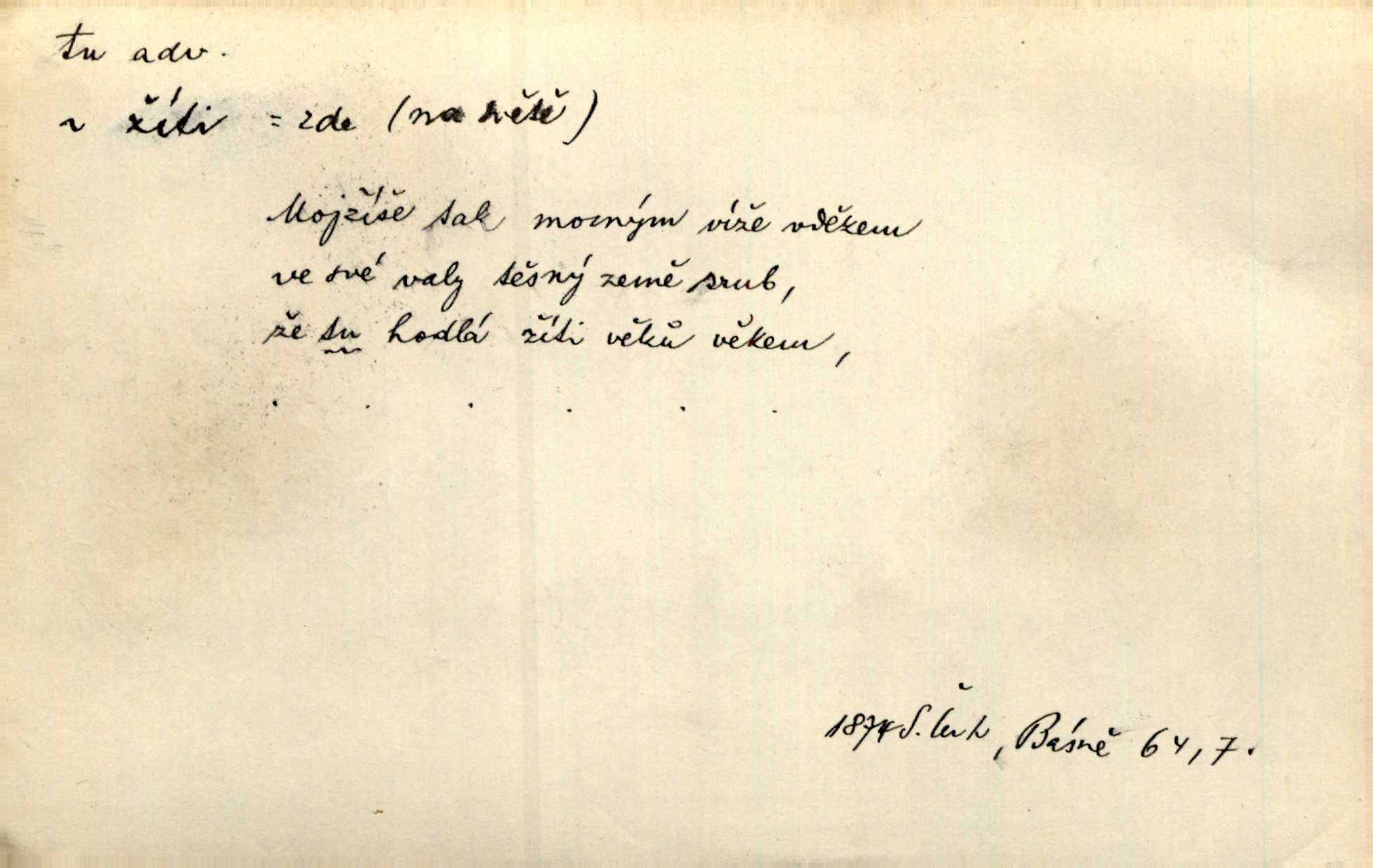 - tu adv. vyjadřující určité místo, na něž se zprav. ukazuje n. odkazuje; zde, na tomto místě. Stará šla a za chvíli tu byla s večeří. Herrm. Tu dole stojí kmotr Nuccio. Zey. Čejč také tím bohatl, že tu vedla silnice z Uher k Brnu. Herb. Je bez místa, a je tu rodina má rodinu. Jir. „Tu je má ruka, Zázvore.“ odvětil Brok, tiskna mu pravici. Štol. „Tu máte, poslíčku — za cestu —“ a podávala mu celý desetník. Baar. „Už je dávno na věčnosti a já jsem ještě tu,“ vzdychla stařenka na tomto světě, na zemi. Něm. Sáhl do torby, aby vytáhl Palečka i peníze, ale nastojte, — torba jako sklo — kde nic, tu nic! Něm. Proč pak si bral takovou ženskou kde nic tu nic? úplně chudou, bez prostředků. Rais. Kde se vzal, tu se vzal, stojí náhle před Cimburou voják. Baar. Tu a tam bylo vidět u silnice osyku. Jir. Pracoval tu i tam za chasníka. Šmil. Nikde nebylo viděti človíčka, jen tu tam poskakoval vrabec. Herrm. Leda že se ohlédl po stádu krav a koz, nebo po ovcích v houfu, tu větším, tam menším. Jir. Pole ta bez stromů, většinou rovná a jen tu onde stoupající mírnou vlnou, tratila se na obzoru. Jir. D Expr. v některých spojeních (tu máš! a j.) vyjadřuje podiv, překvapení. Myslel jsem, že budeš jako plnoletý moudřejší, ale tu máš čerte kropáč, bylo to čím dál tím horší. Čap. Ch. Přiběhlo na roh ulice a — tu máš! Stál tam pan strážník. Mateříd. Myslil si, že bude mít děvče radost, zatím tu máš! Zastihne nevěstu v objetí vlastního bratra. Svět. D Dial. na toto místo, v tato místa, sem. Oni prajeli — že stě hevaj. — Ja sem tu šel. Nor. D vyjadřuje čas: v té chvíli, v tom okamžiku, tehdy, „Bratr je ženat, a víte také, že švakrová —“ tu ustala a pohlédla na mne tázavě. Šim. Okamžik nechtělo se jaksi nikomu dovnitř. Tu se sebral Vácslav a vkročil mužně. Ner. Leda když viděl přicházeti vrchního, tu ovšem skočil na nohy. Herb. Tu se na Josefa i všelijaká nectnost ukázala. Mistr doslýchal, že se tu a tam opil někdy. Prav. Domácnost i polní hospodářství spravovala Evička s čeládkou, on jen tu a tam svou vůli projevil občas. Svět. Musí děvče kolikrát za den běžet tu na pole, tu na trávu. Něm. Tu zpozoruje, že mi schází knoflík na zimníku, tu že mám odtržené poutko. Šim. Šla pal po mně, obracel mne tu tváří k zemi, tu na znak, klekal mi tu prsa, tu na záda. Čech. Expr. Než to po těch harantech všecko uklidím a srovnám, máte tu konec července. Šim. Když blížila se volba do obecního výboru, jakého tu bylo běhání. Šmil.
