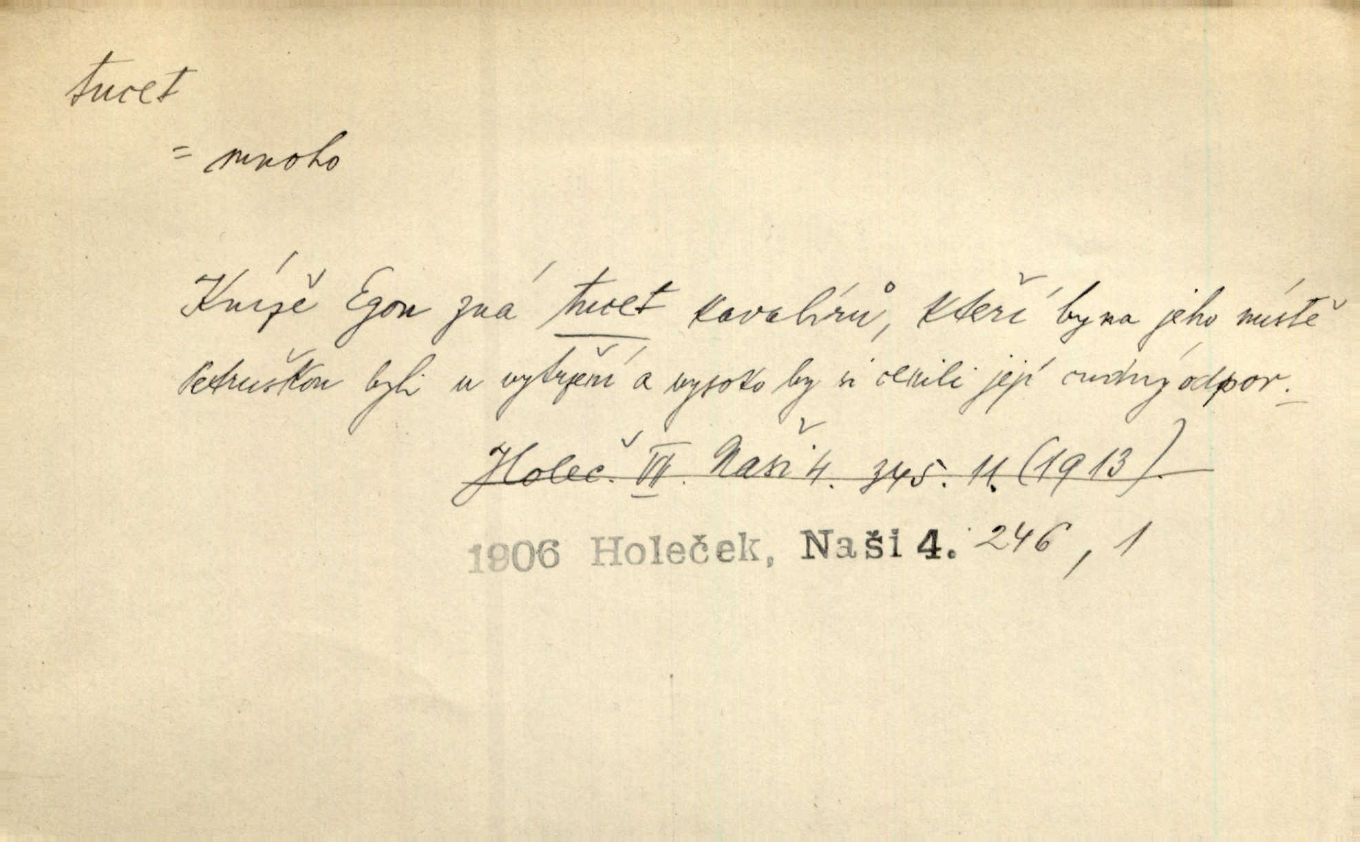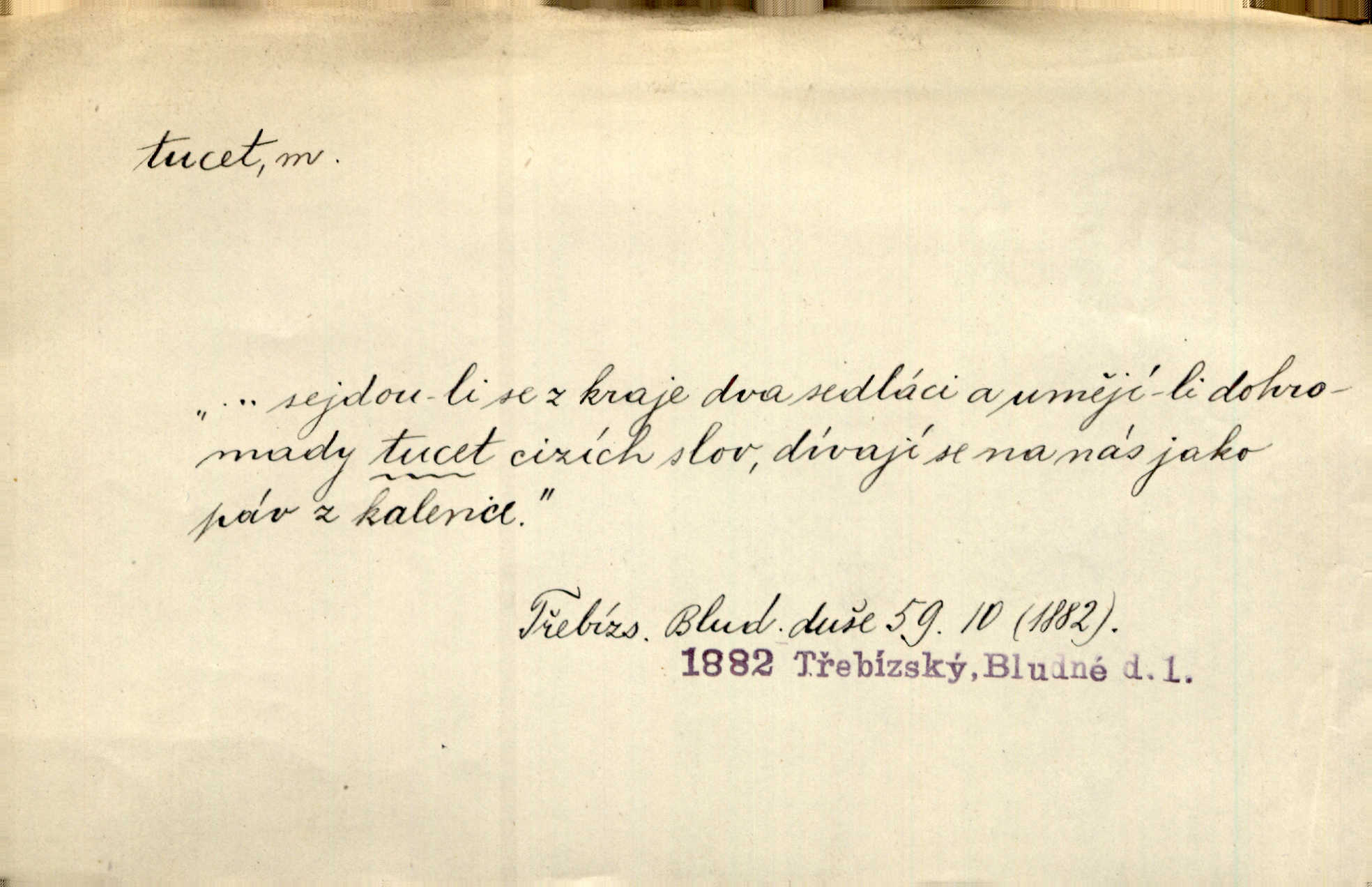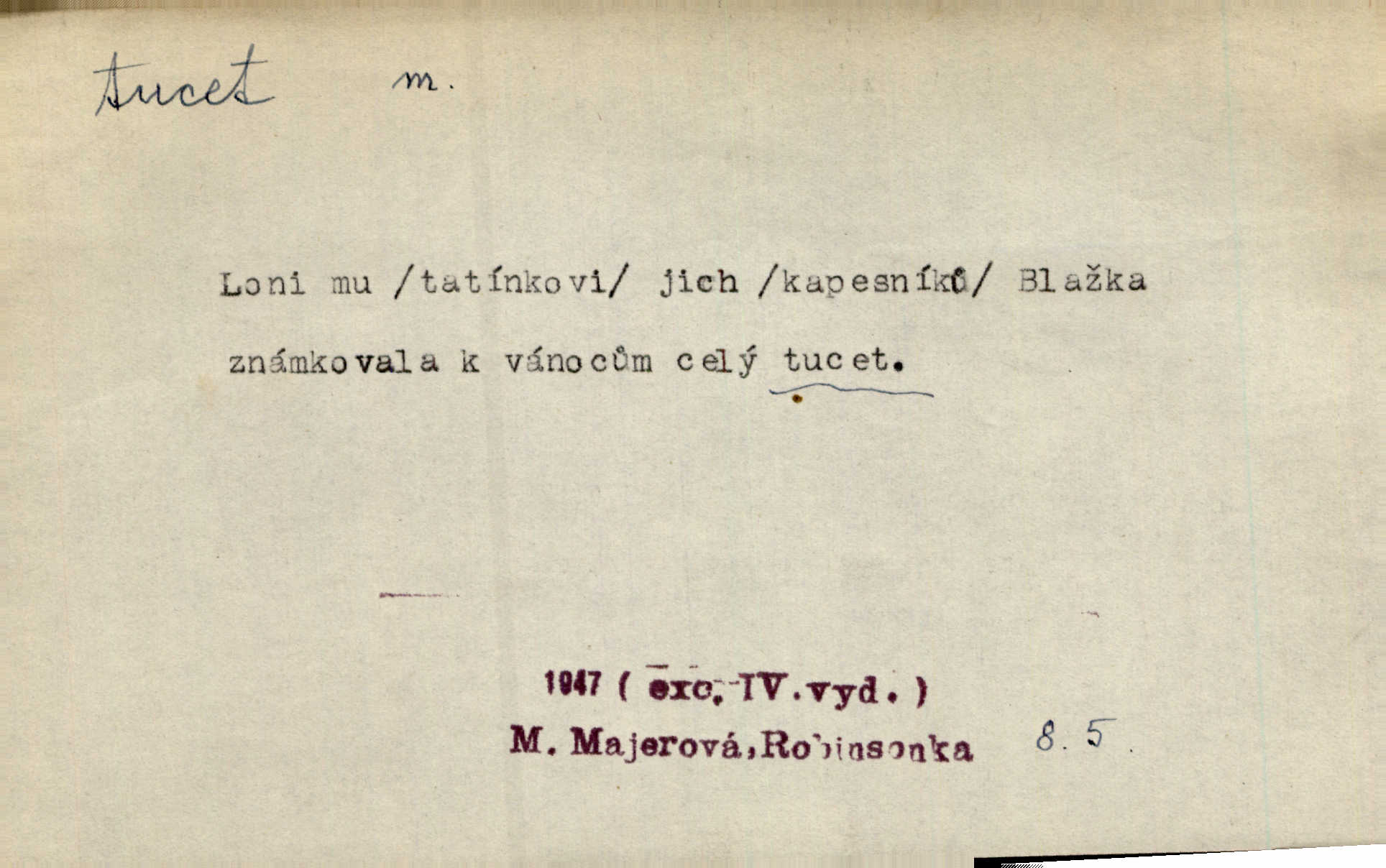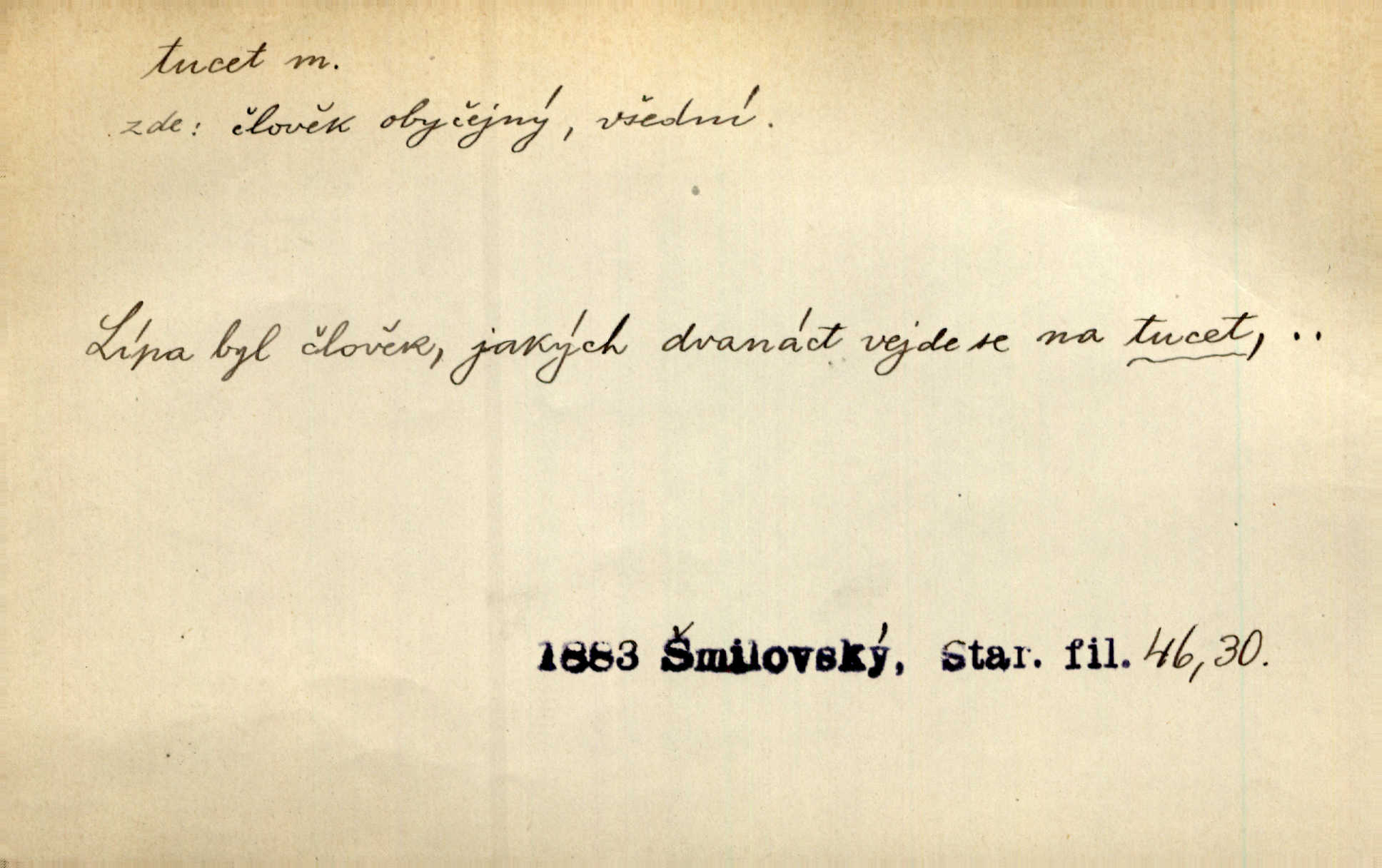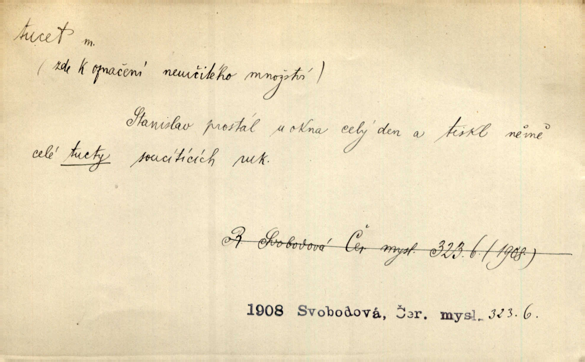 - tucet, -ctu m. dvanáct předmětů téhož druhu. Tucet stříbrných nožů, vidliček, lžic, klíšťky na cukr. Herrm. Přidáno bylo tucet dětských kšandiček a šest párů střevíců. A. Mrš. Babička dostala půl tuctu šňůr na kolovrat „jarmarku“. Něm. Umějí-li dohromady tucet cizích slov, dívají se na nás jako páv z kalenice. Třeb. Lípa byl člověk, jakých dvanáct vejde na tucet tuctový, všední. Šmil. D Expr. mnoho, množství. Stanislav prostál u okna celý den a tiskl němě celé tucty soucítících ruk. R. Svob. Zde seznal tucet umělkyň na vlas jako ona krásných. Podl. Kníže Egon zná tucet kavalírů, kteří by na jeho místě Petruškou byli u vytržení. Hol.