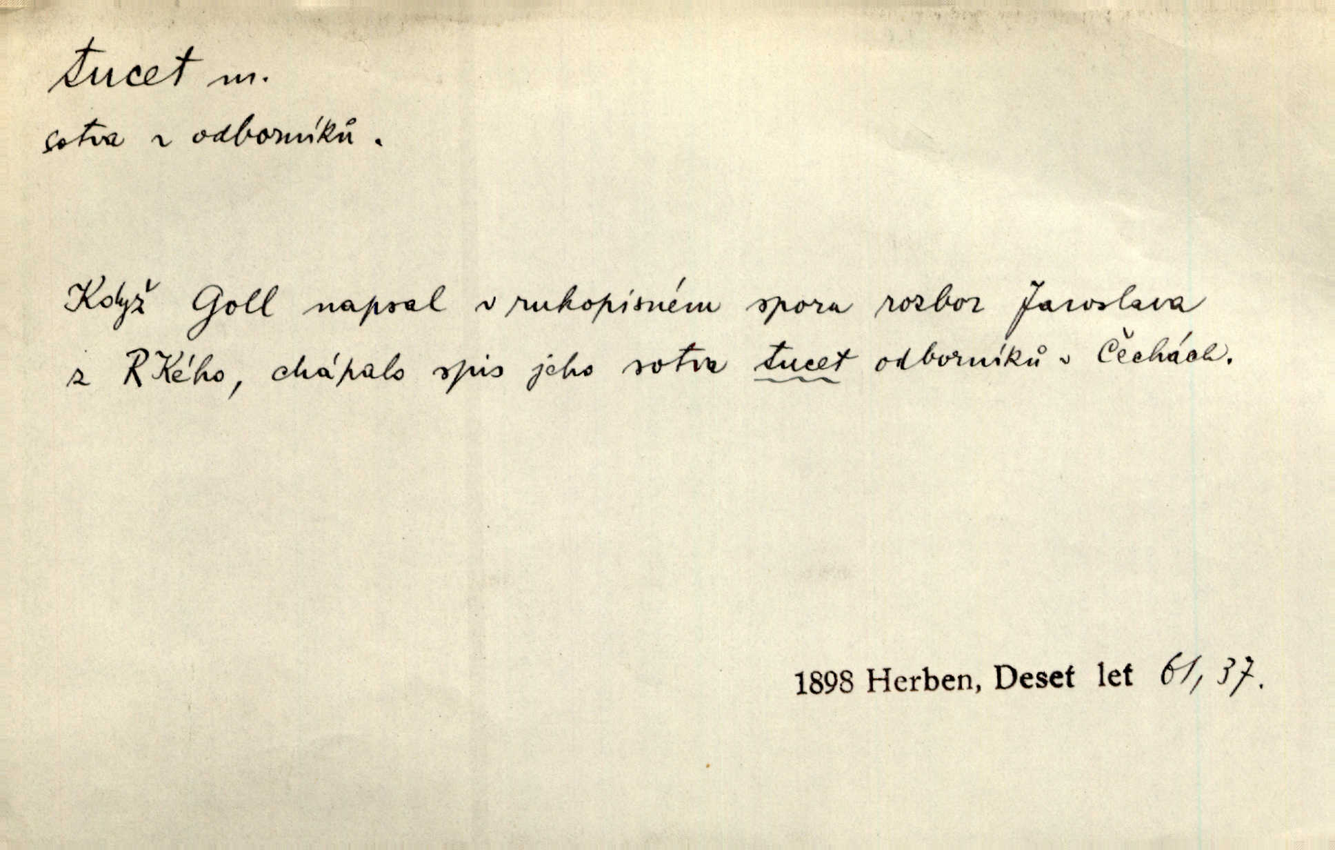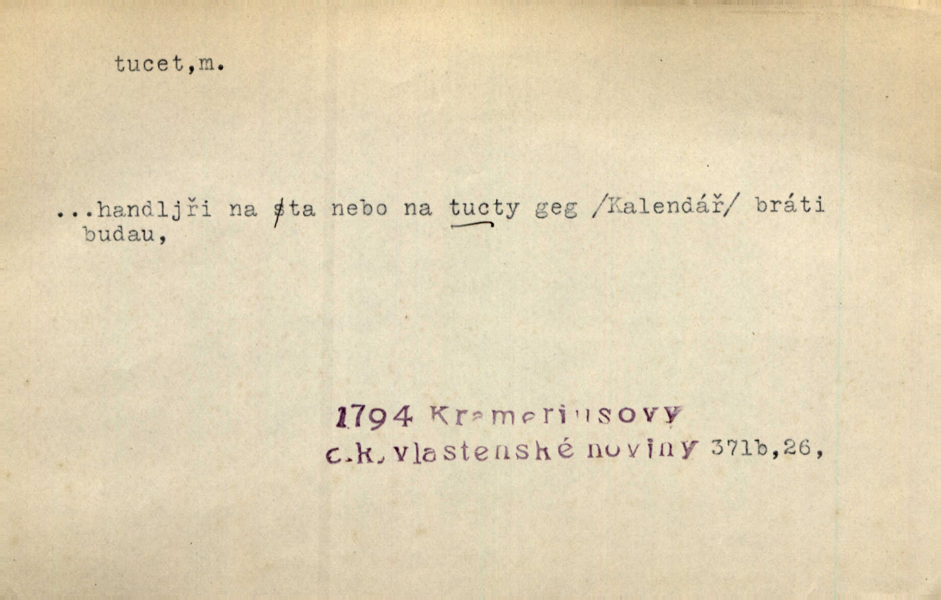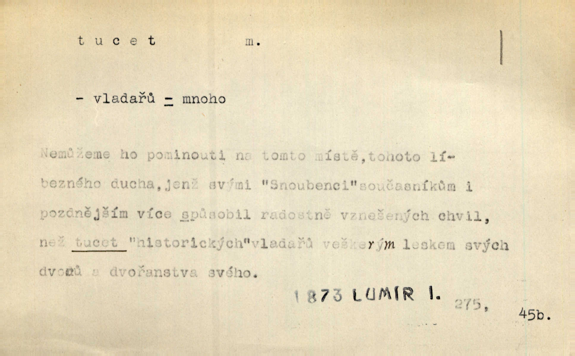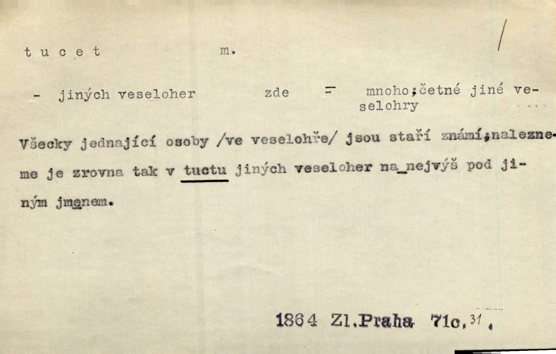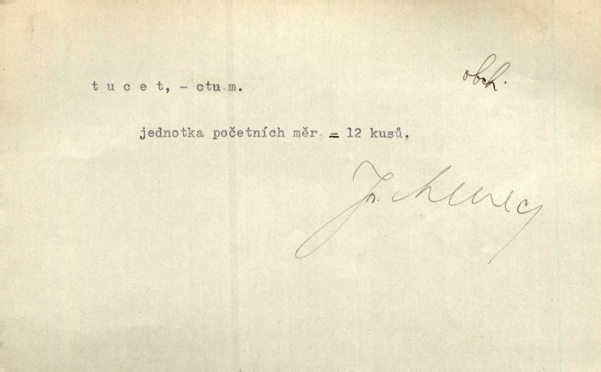 - tucet, -ctu m. dvanáct předmětů téhož druhu. Tucet stříbrných nožů, vidliček, lžic, klíšťky na cukr. Herrm. Přidáno bylo tucet dětských kšandiček a šest párů střevíců. A. Mrš. Babička dostala půl tuctu šňůr na kolovrat „jarmarku“. Něm. Umějí-li dohromady tucet cizích slov, dívají se na nás jako páv z kalenice. Třeb. Lípa byl člověk, jakých dvanáct vejde na tucet tuctový, všední. Šmil. D Expr. mnoho, množství. Stanislav prostál u okna celý den a tiskl němě celé tucty soucítících ruk. R. Svob. Zde seznal tucet umělkyň na vlas jako ona krásných. Podl. Kníže Egon zná tucet kavalírů, kteří by na jeho místě Petruškou byli u vytržení. Hol.