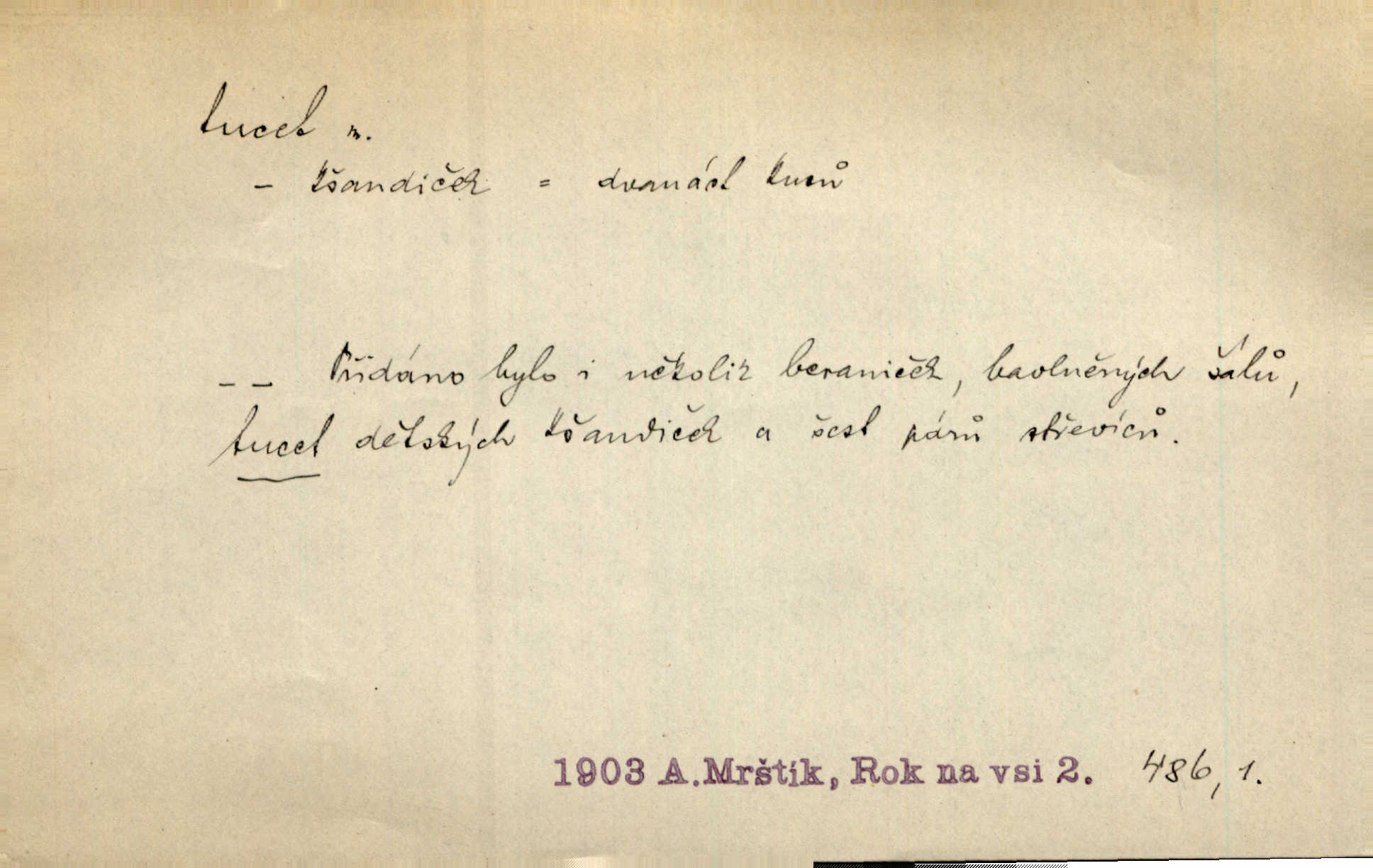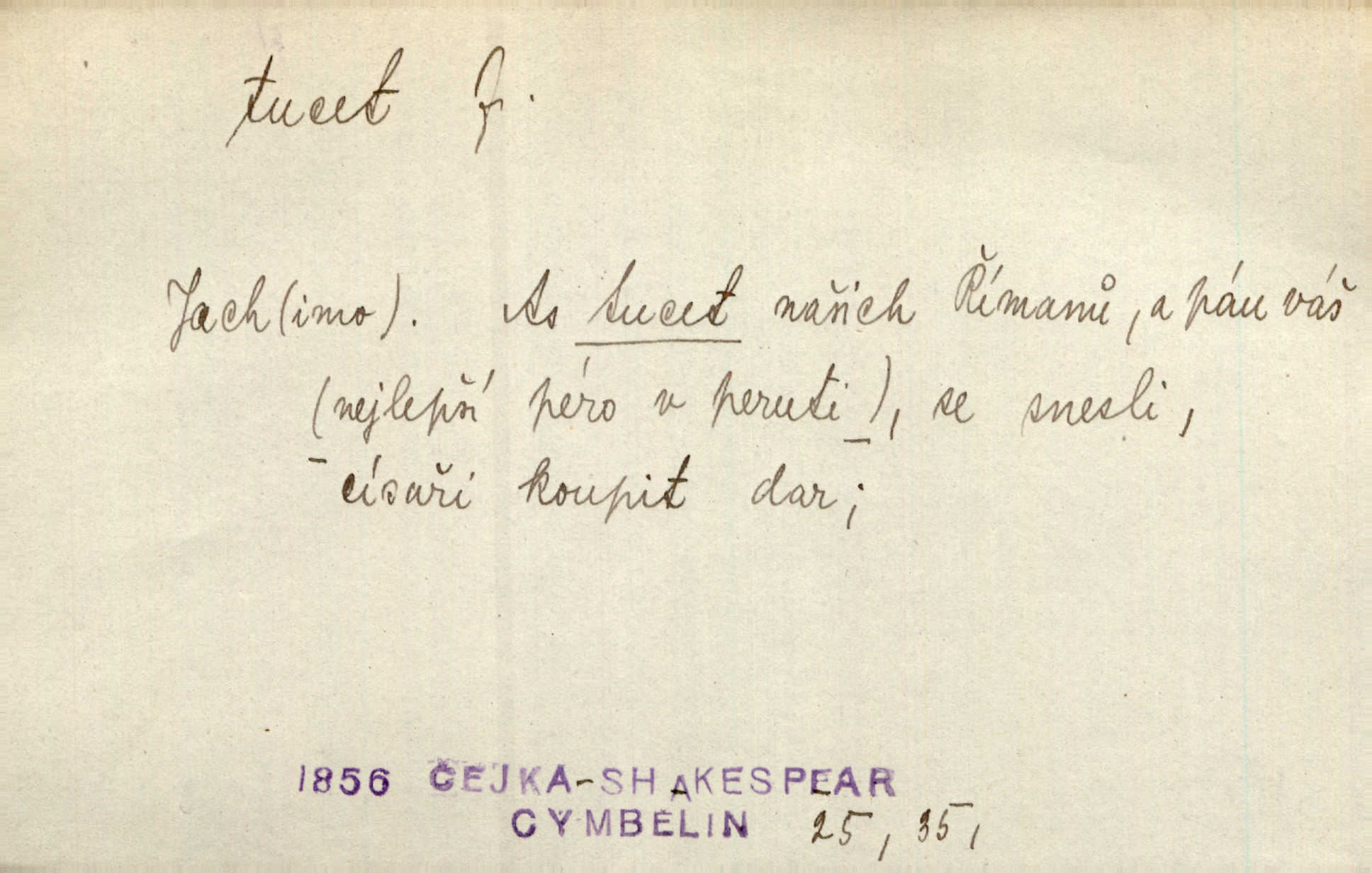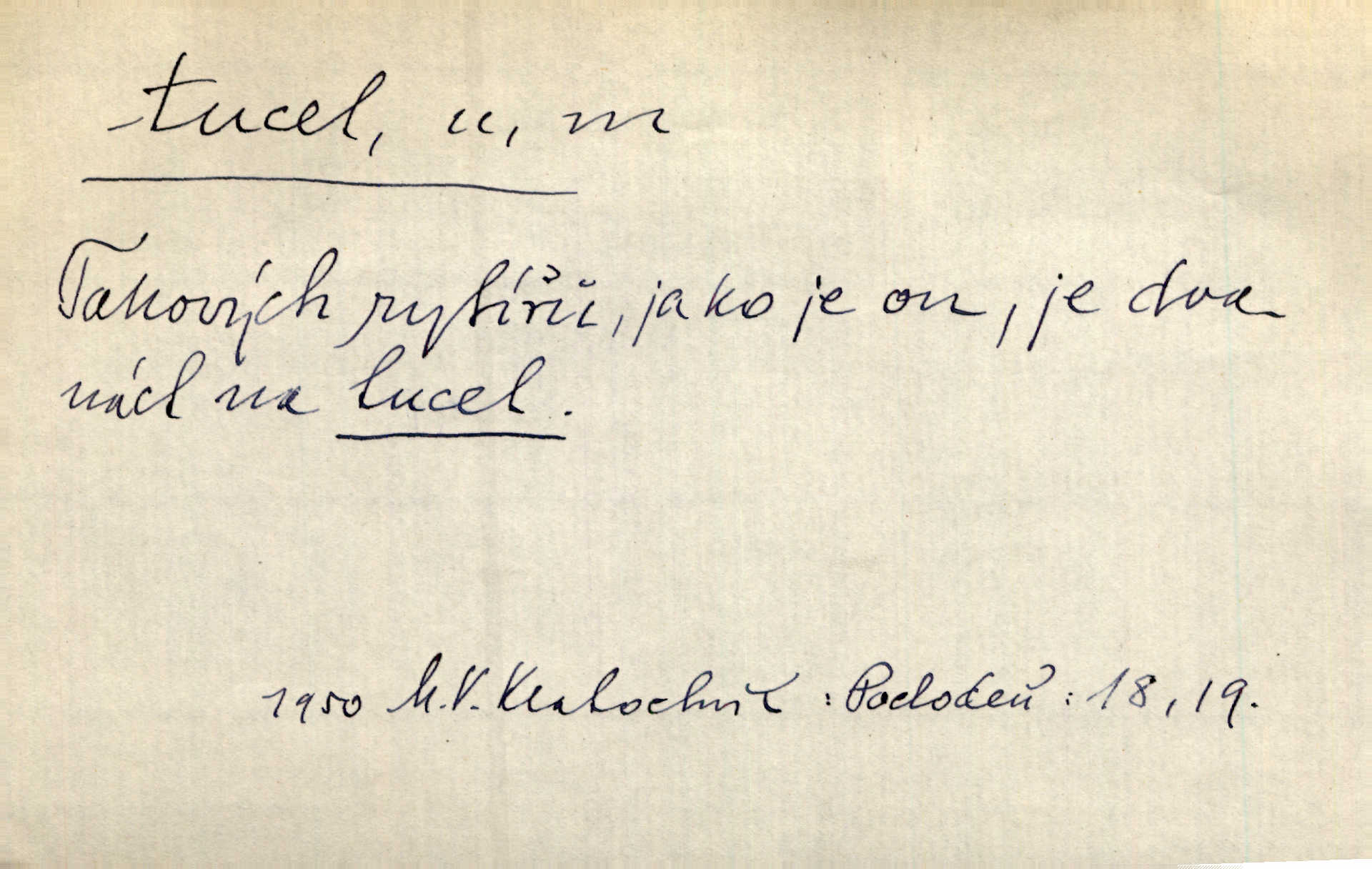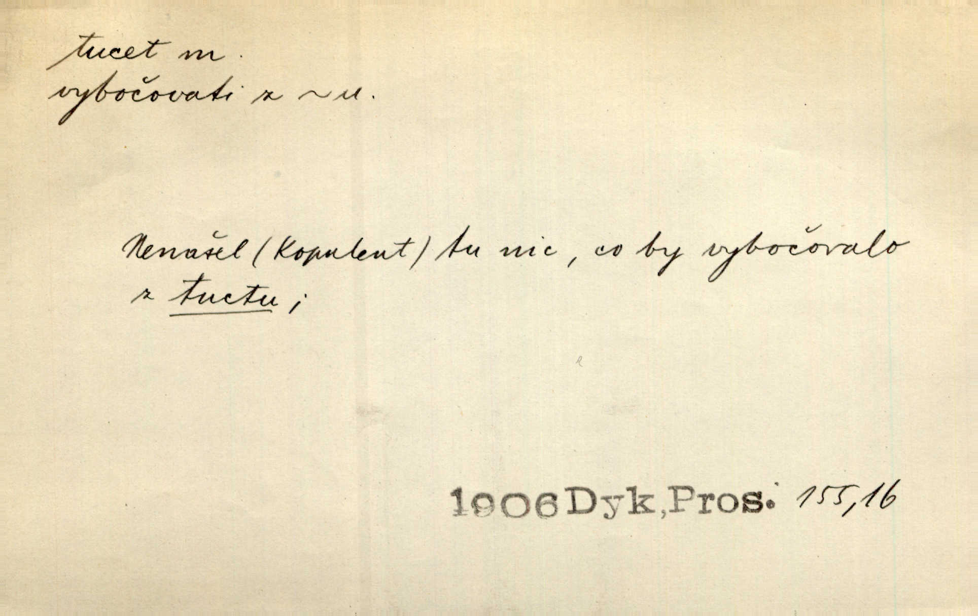 - tucet, -ctu m. dvanáct předmětů téhož druhu. Tucet stříbrných nožů, vidliček, lžic, klíšťky na cukr. Herrm. Přidáno bylo tucet dětských kšandiček a šest párů střevíců. A. Mrš. Babička dostala půl tuctu šňůr na kolovrat „jarmarku“. Něm. Umějí-li dohromady tucet cizích slov, dívají se na nás jako páv z kalenice. Třeb. Lípa byl člověk, jakých dvanáct vejde na tucet tuctový, všední. Šmil. D Expr. mnoho, množství. Stanislav prostál u okna celý den a tiskl němě celé tucty soucítících ruk. R. Svob. Zde seznal tucet umělkyň na vlas jako ona krásných. Podl. Kníže Egon zná tucet kavalírů, kteří by na jeho místě Petruškou byli u vytržení. Hol.