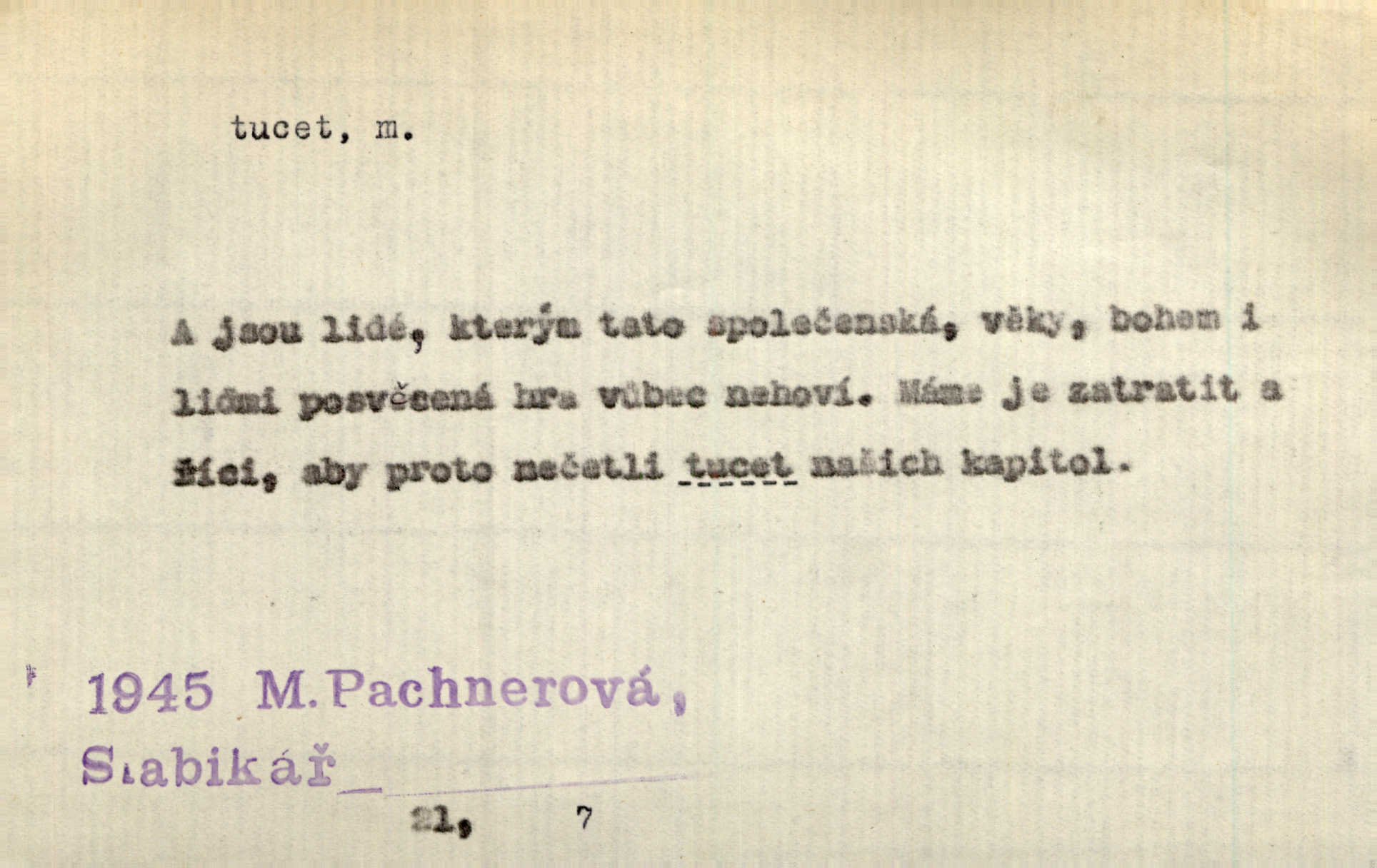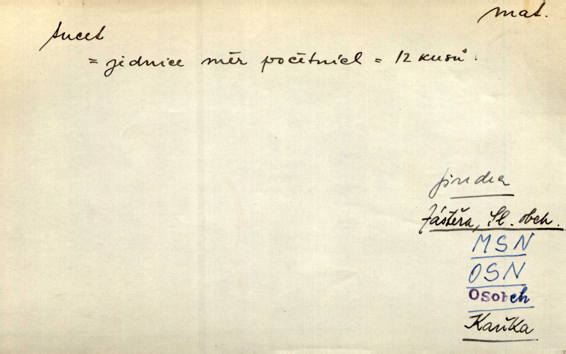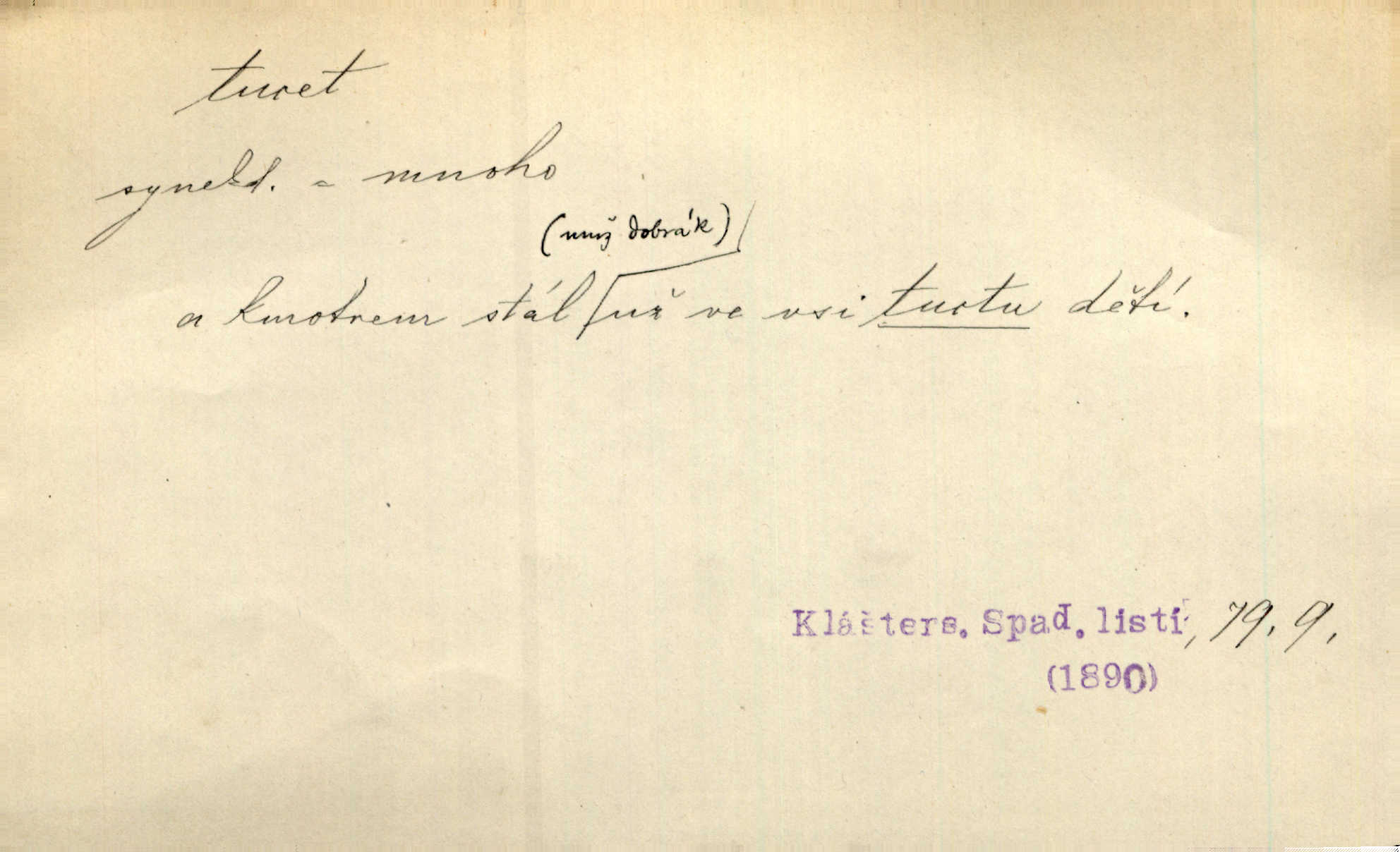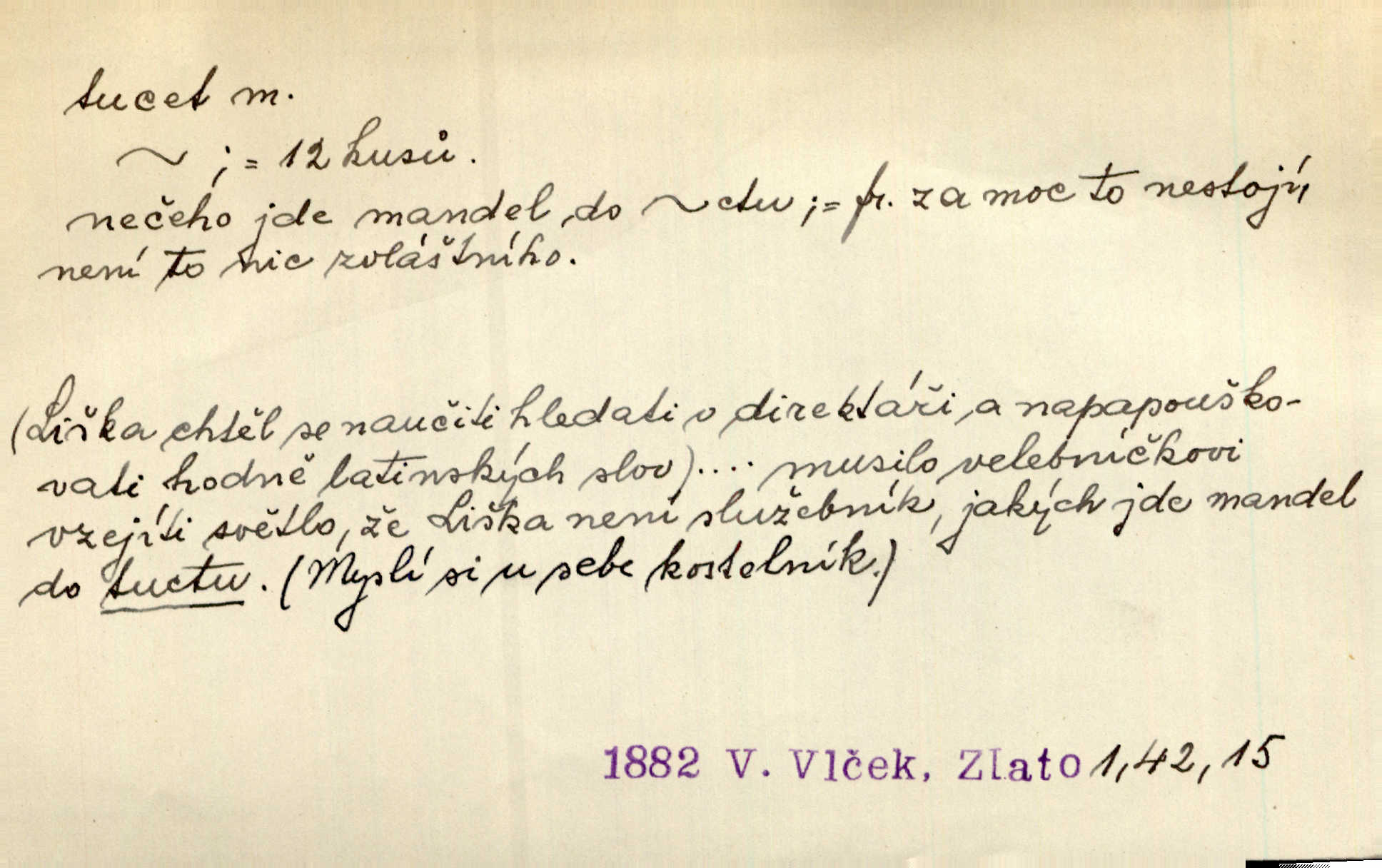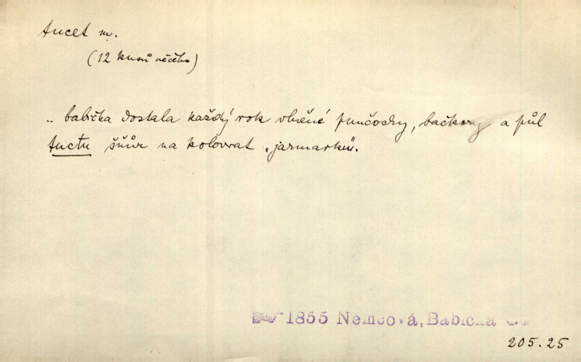- tucet, -ctu m. dvanáct předmětů téhož druhu. Tucet stříbrných nožů, vidliček, lžic, klíšťky na cukr. Herrm. Přidáno bylo tucet dětských kšandiček a šest párů střevíců. A. Mrš. Babička dostala půl tuctu šňůr na kolovrat „jarmarku“. Něm. Umějí-li dohromady tucet cizích slov, dívají se na nás jako páv z kalenice. Třeb. Lípa byl člověk, jakých dvanáct vejde na tucet tuctový, všední. Šmil. D Expr. mnoho, množství. Stanislav prostál u okna celý den a tiskl němě celé tucty soucítících ruk. R. Svob. Zde seznal tucet umělkyň na vlas jako ona krásných. Podl. Kníže Egon zná tucet kavalírů, kteří by na jeho místě Petruškou byli u vytržení. Hol.