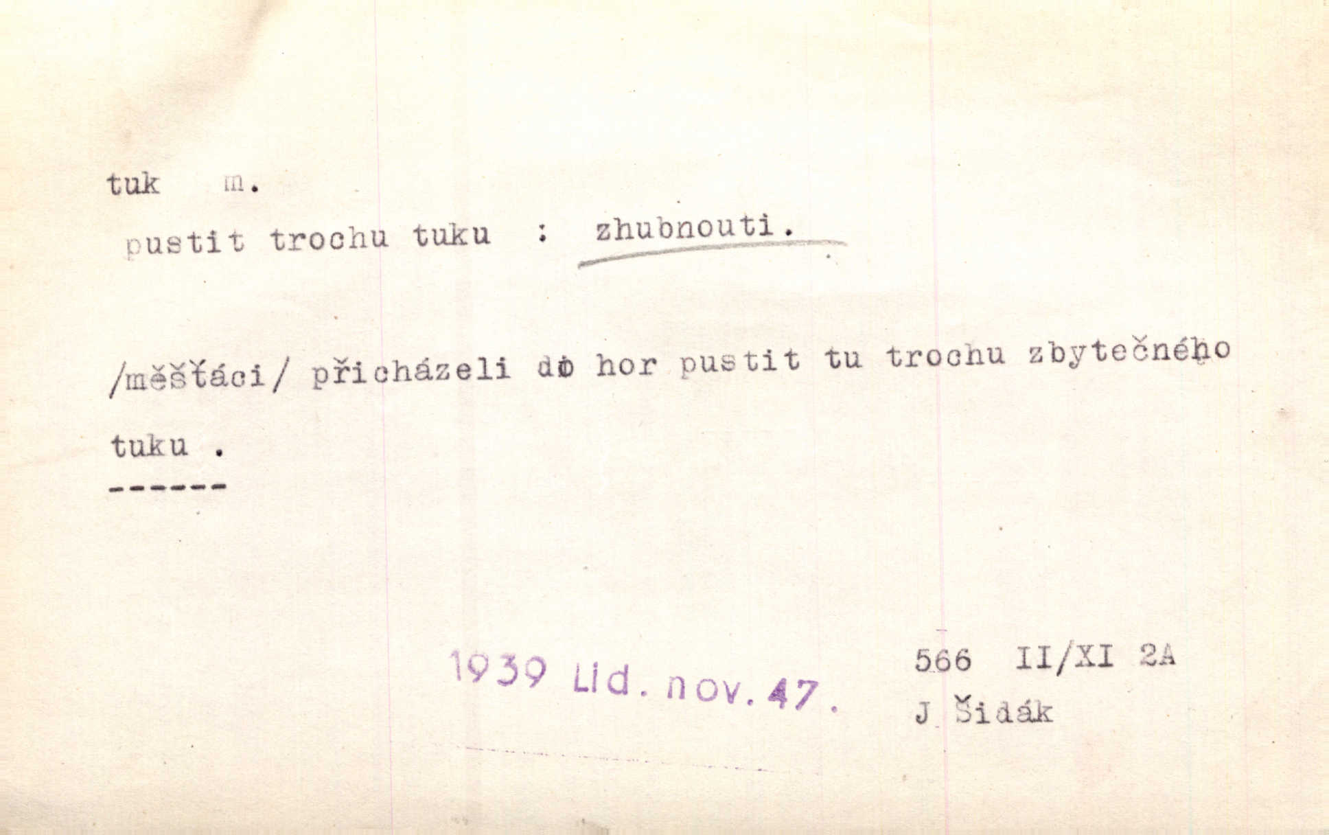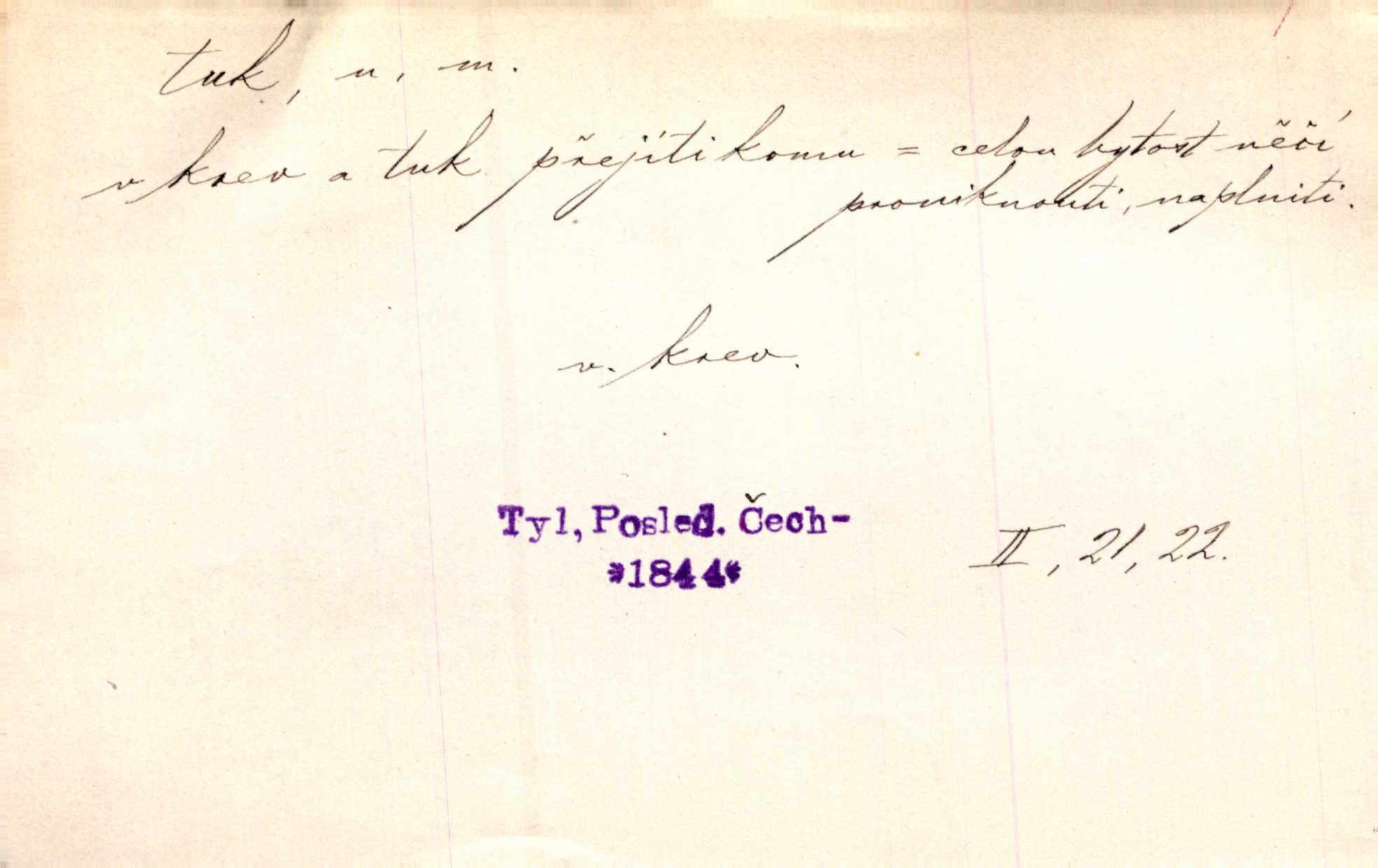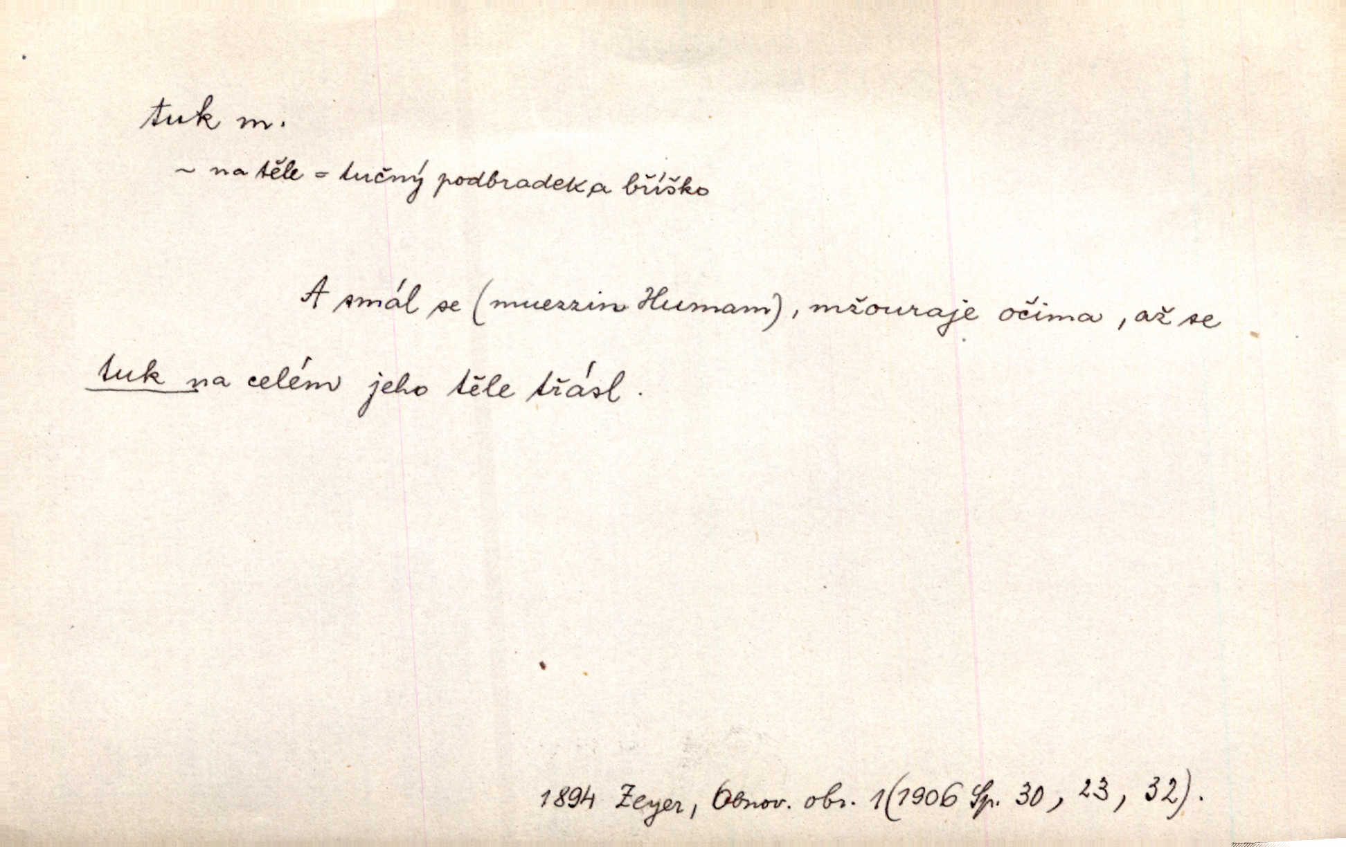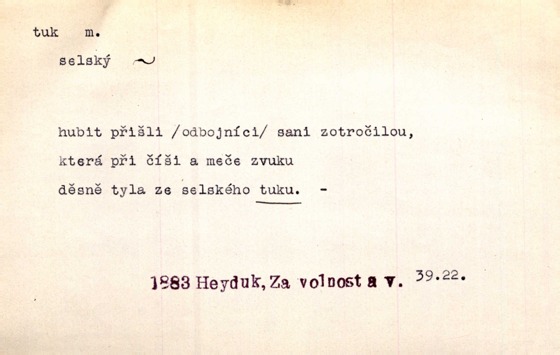 - tuk, -u m. mastná látka v těle živočišném n. v některých rostlinách. Ovce byly jako v tuku zaobalené. Hál. [Prase] nasazovalo tuk a maso a bylo pěkně „prorostlé“. Ner. Nevidíš, že má každý komár více tuku nežli tvá koza? Klicp. Jak medvěd z tuku žilem z minulosti. Vrch. [Vlas] se skládá z proteinu, tuků, barviva. Ner. Vitamin D je v rybím tuku. Hofer. Celá jeho tělesnost neoplývá nadbytkem tuku. Herrm. [Měšťáci] přicházeli do hor pustit tu trochu zbytečného tuku zhubnout. Lid. nov. Pískot mu pronikal tuk a kosti. Prav. Přen. Lid žít má, byste tyli z jeho tuku. Kraj. Část Vídně požírala tuk a šťávu z celého utištěného mocnářství. Havl. Nám všecko [studium] přešlo v tuk a krev úplně jsme si je osvojili. Třeb. Společnost dusila se ve vlastním tuku byla ničena bohatstvím. Naše d. D omastek potravin (máslo, sádlo, lůj atd.). Už měsíc neviděli jsme ani gram mouky, ani lžíci tuku. Baar. D vůbec nějaké mazadlo. Dám osy tukem namazati, vůz obrátit. Vrch. D Chem., biol. glycerid mastných kyselin. Tuky rostlinné, tuky živočišné.