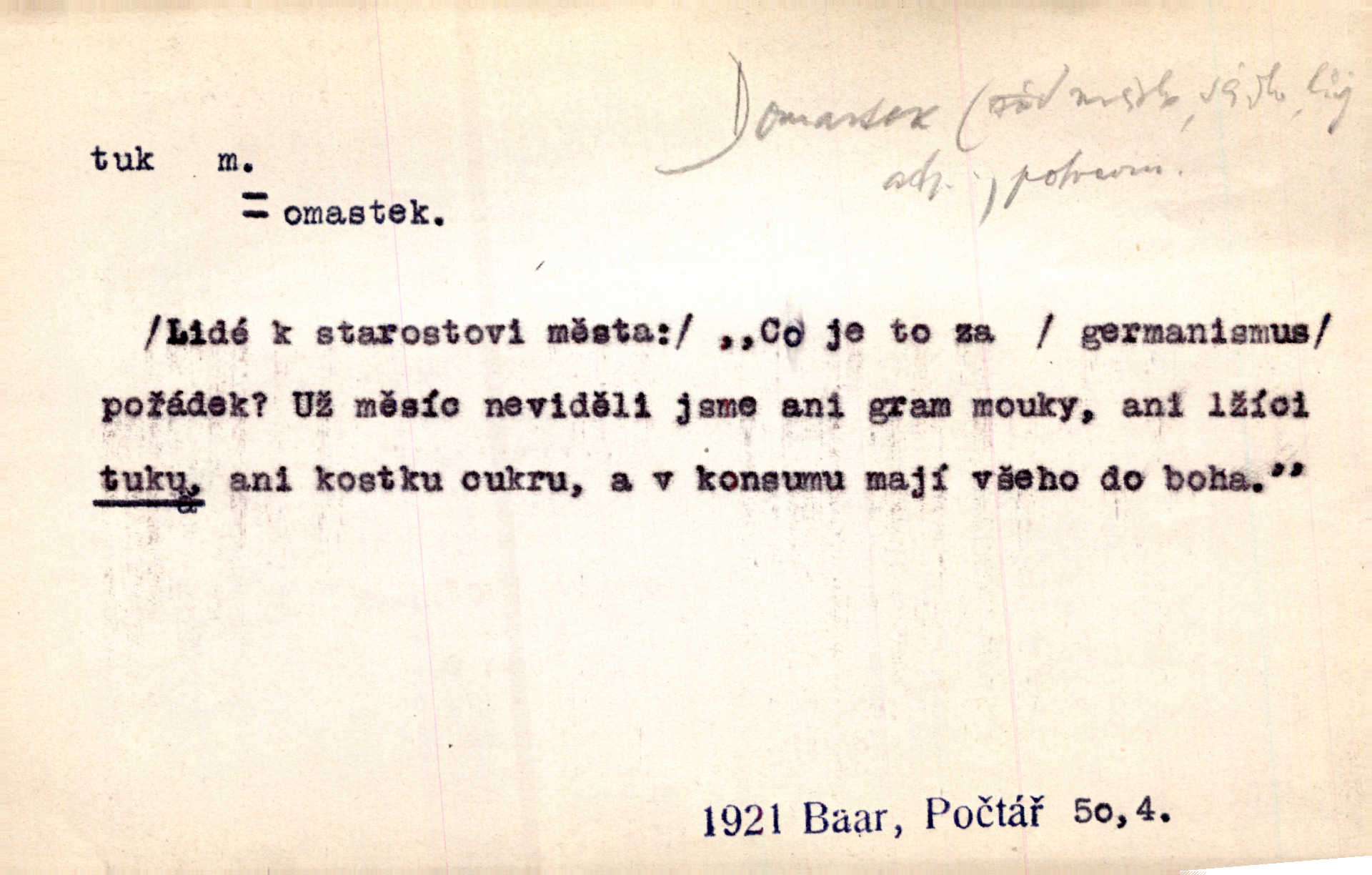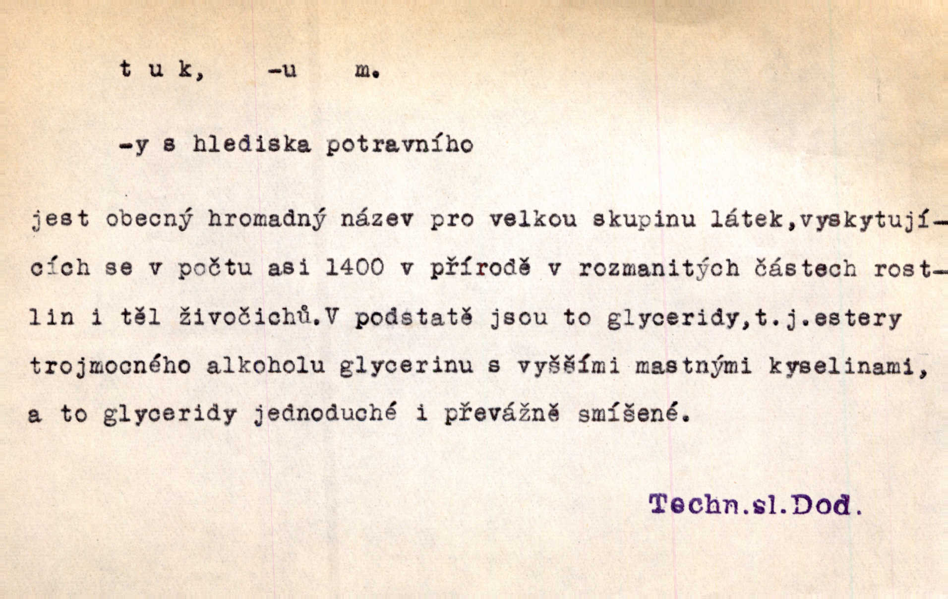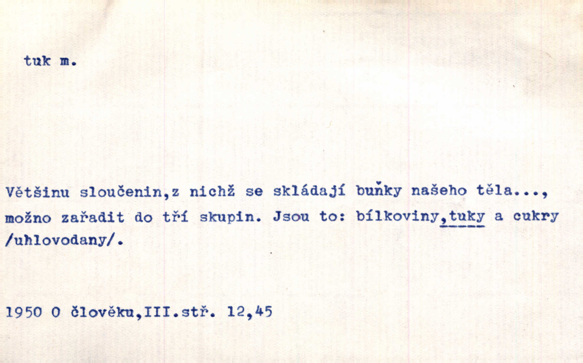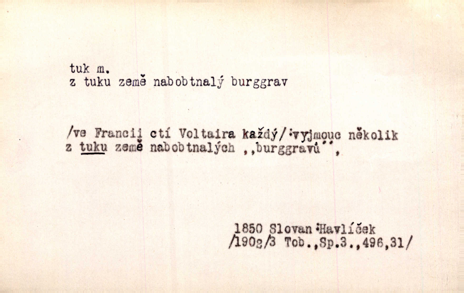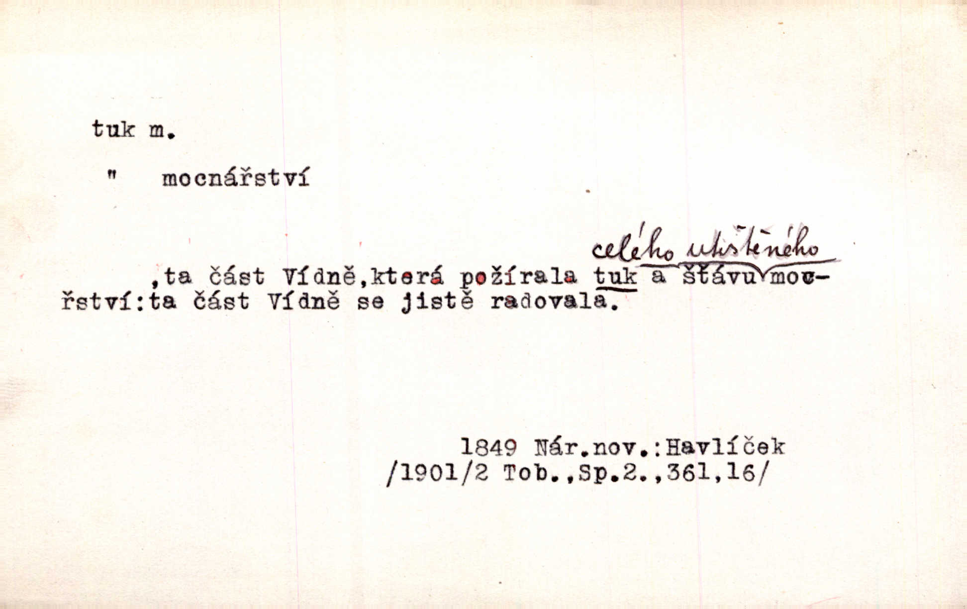 - tuk, -u m. mastná látka v těle živočišném n. v některých rostlinách. Ovce byly jako v tuku zaobalené. Hál. [Prase] nasazovalo tuk a maso a bylo pěkně „prorostlé“. Ner. Nevidíš, že má každý komár více tuku nežli tvá koza? Klicp. Jak medvěd z tuku žilem z minulosti. Vrch. [Vlas] se skládá z proteinu, tuků, barviva. Ner. Vitamin D je v rybím tuku. Hofer. Celá jeho tělesnost neoplývá nadbytkem tuku. Herrm. [Měšťáci] přicházeli do hor pustit tu trochu zbytečného tuku zhubnout. Lid. nov. Pískot mu pronikal tuk a kosti. Prav. Přen. Lid žít má, byste tyli z jeho tuku. Kraj. Část Vídně požírala tuk a šťávu z celého utištěného mocnářství. Havl. Nám všecko [studium] přešlo v tuk a krev úplně jsme si je osvojili. Třeb. Společnost dusila se ve vlastním tuku byla ničena bohatstvím. Naše d. D omastek potravin (máslo, sádlo, lůj atd.). Už měsíc neviděli jsme ani gram mouky, ani lžíci tuku. Baar. D vůbec nějaké mazadlo. Dám osy tukem namazati, vůz obrátit. Vrch. D Chem., biol. glycerid mastných kyselin. Tuky rostlinné, tuky živočišné.
