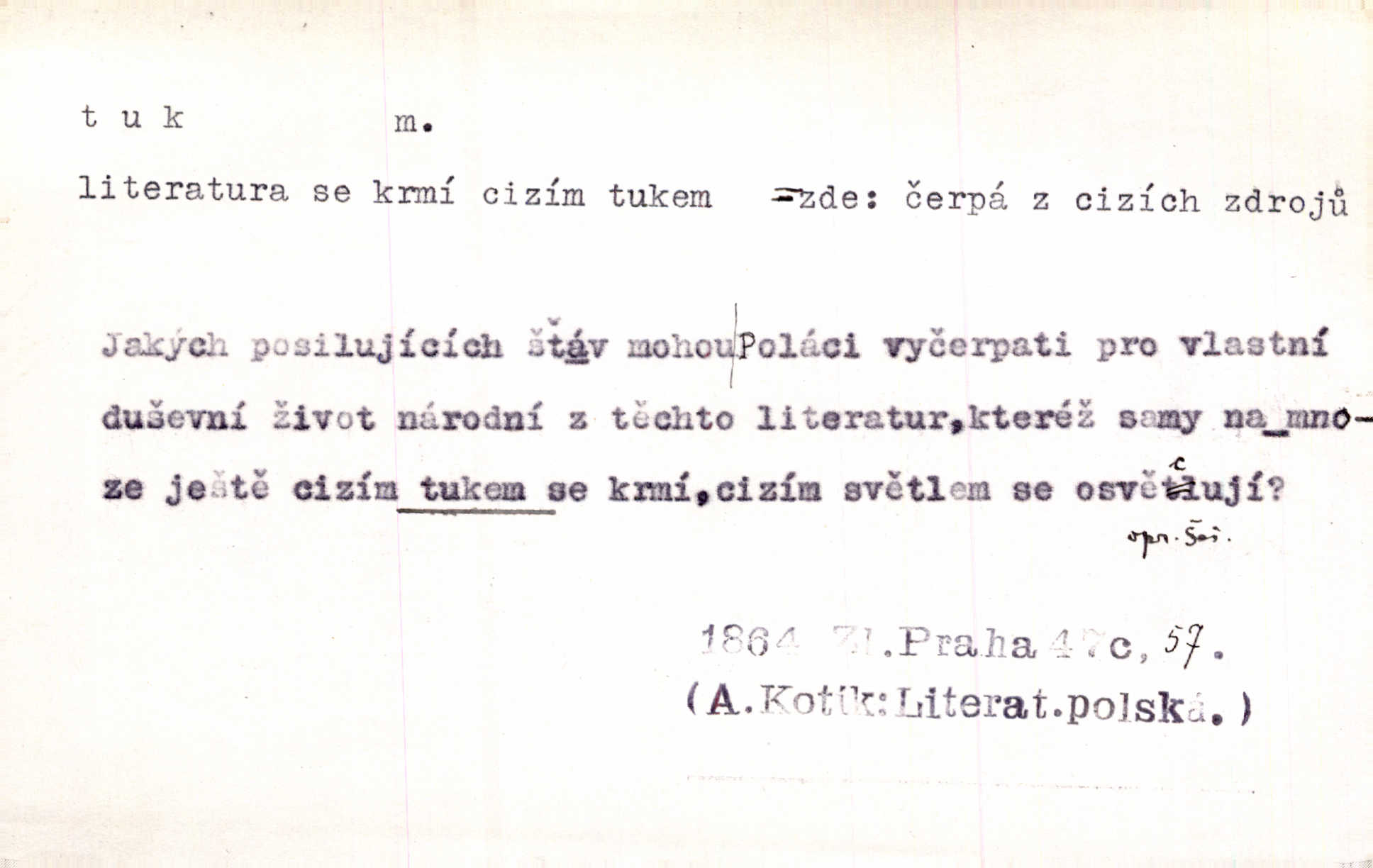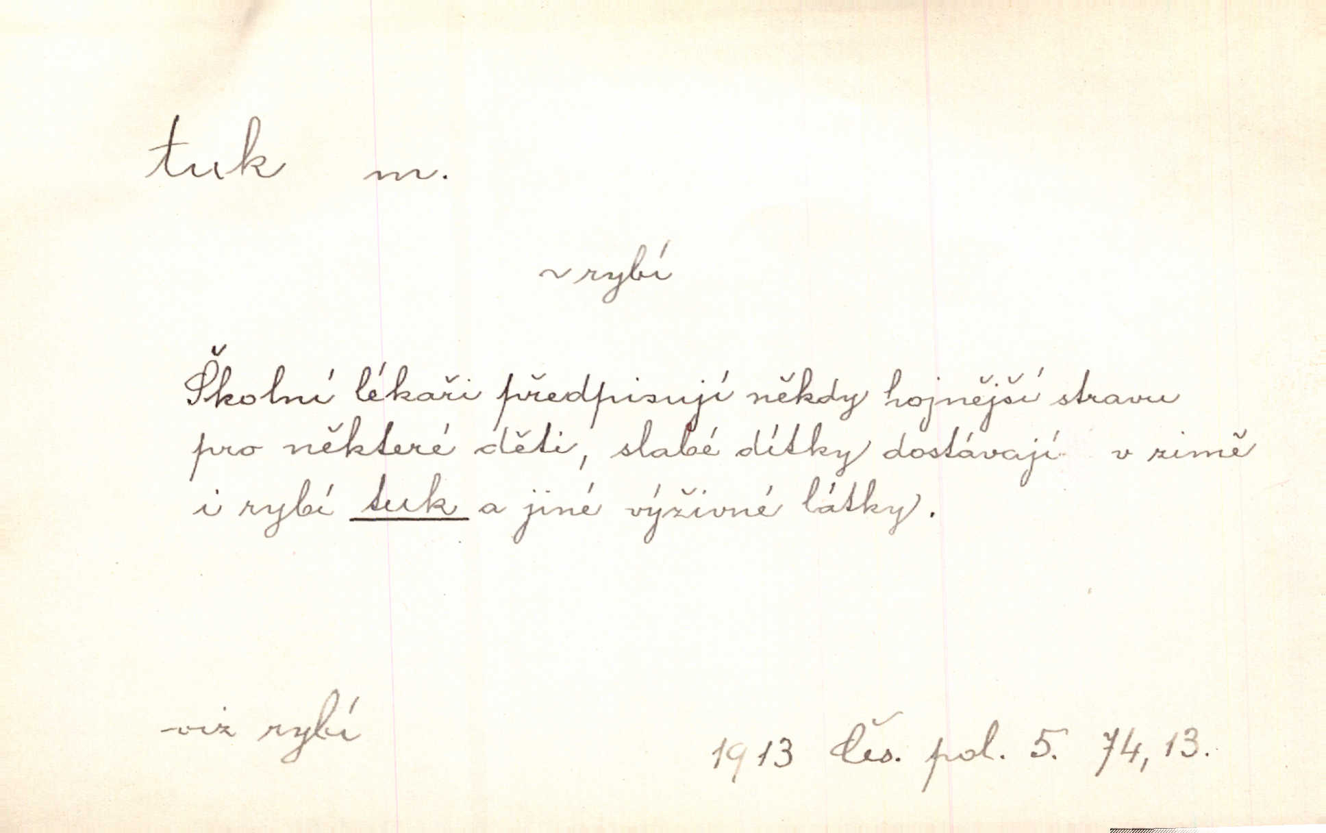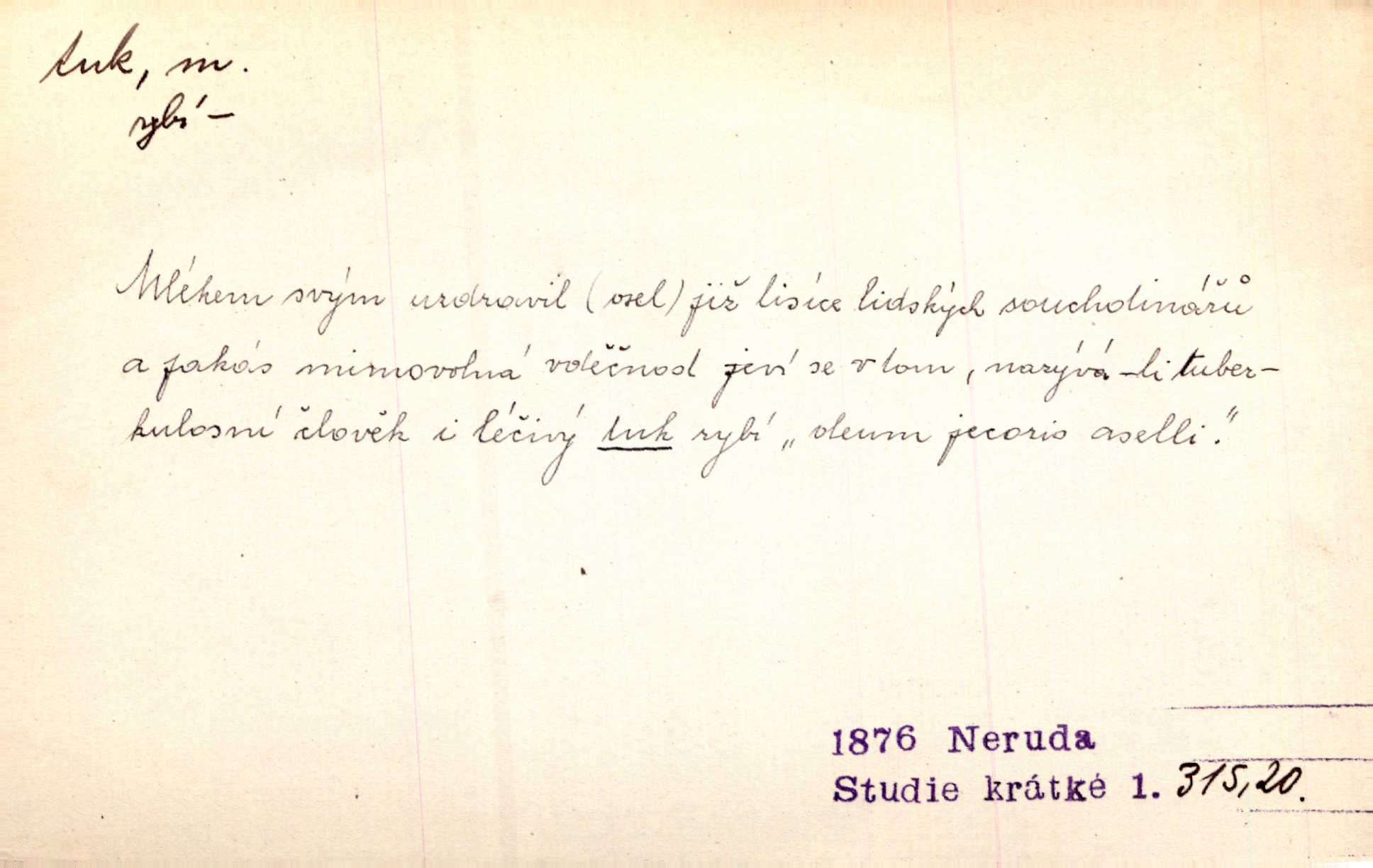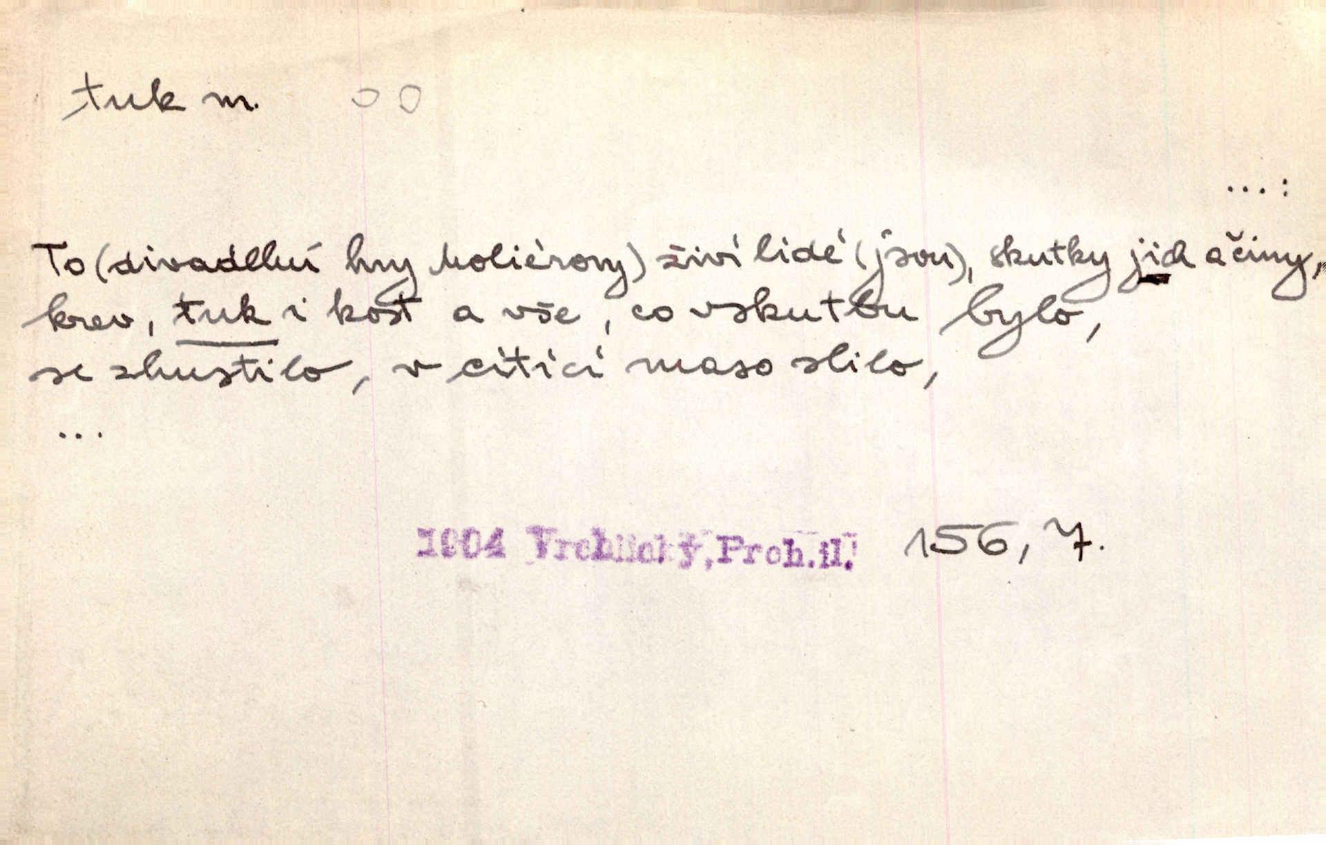 - tuk, -u m. mastná látka v těle živočišném n. v některých rostlinách. Ovce byly jako v tuku zaobalené. Hál. [Prase] nasazovalo tuk a maso a bylo pěkně „prorostlé“. Ner. Nevidíš, že má každý komár více tuku nežli tvá koza? Klicp. Jak medvěd z tuku žilem z minulosti. Vrch. [Vlas] se skládá z proteinu, tuků, barviva. Ner. Vitamin D je v rybím tuku. Hofer. Celá jeho tělesnost neoplývá nadbytkem tuku. Herrm. [Měšťáci] přicházeli do hor pustit tu trochu zbytečného tuku zhubnout. Lid. nov. Pískot mu pronikal tuk a kosti. Prav. Přen. Lid žít má, byste tyli z jeho tuku. Kraj. Část Vídně požírala tuk a šťávu z celého utištěného mocnářství. Havl. Nám všecko [studium] přešlo v tuk a krev úplně jsme si je osvojili. Třeb. Společnost dusila se ve vlastním tuku byla ničena bohatstvím. Naše d. D omastek potravin (máslo, sádlo, lůj atd.). Už měsíc neviděli jsme ani gram mouky, ani lžíci tuku. Baar. D vůbec nějaké mazadlo. Dám osy tukem namazati, vůz obrátit. Vrch. D Chem., biol. glycerid mastných kyselin. Tuky rostlinné, tuky živočišné.