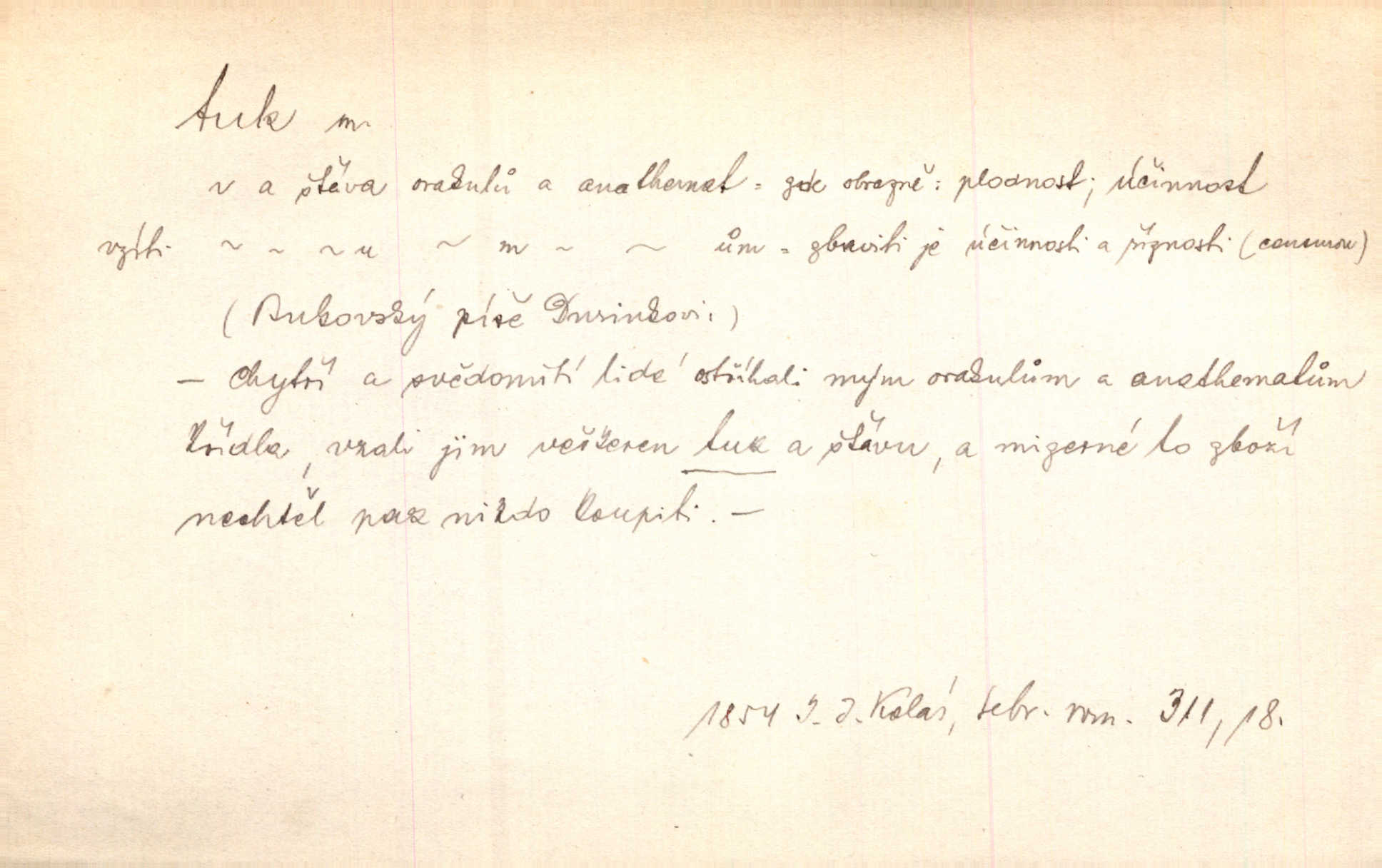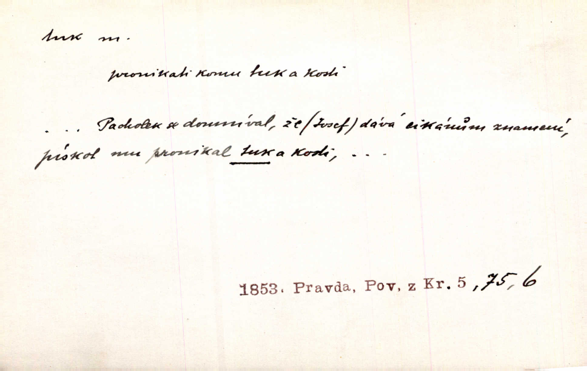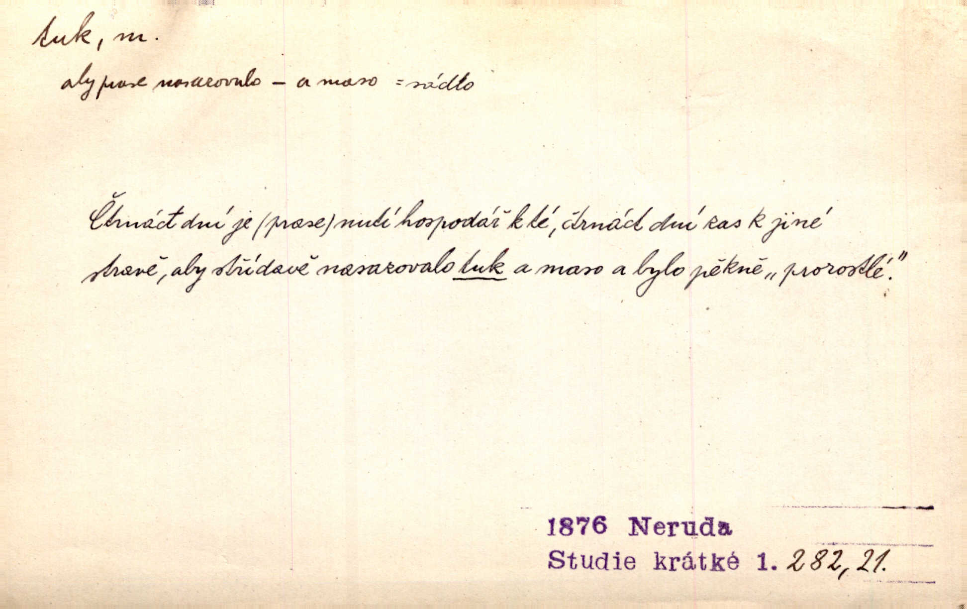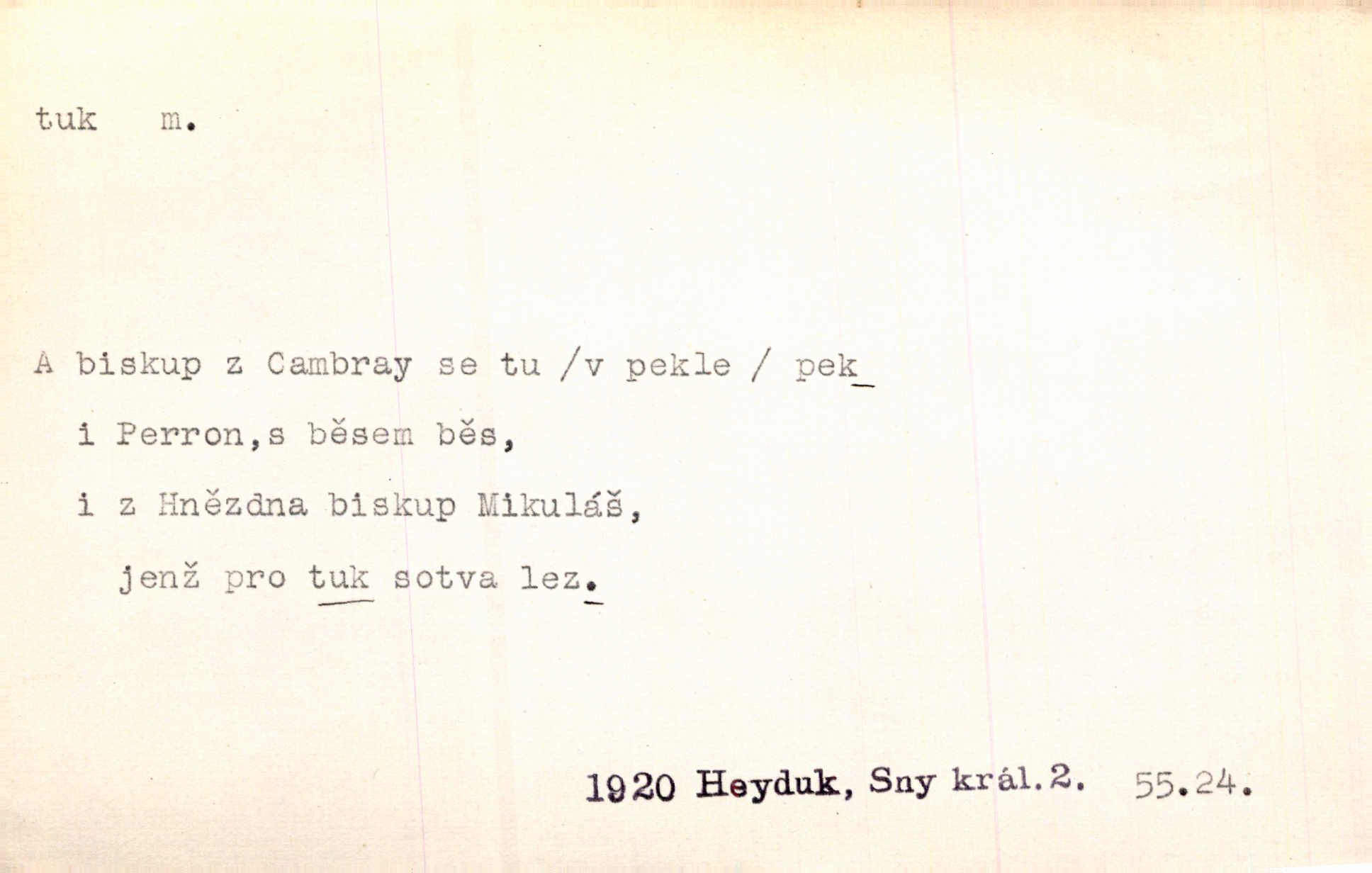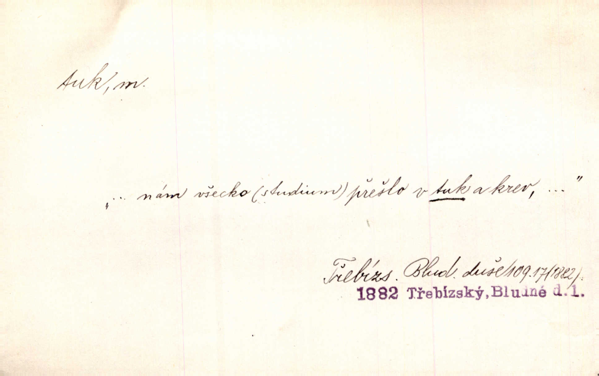 - tuk, -u m. mastná látka v těle živočišném n. v některých rostlinách. Ovce byly jako v tuku zaobalené. Hál. [Prase] nasazovalo tuk a maso a bylo pěkně „prorostlé“. Ner. Nevidíš, že má každý komár více tuku nežli tvá koza? Klicp. Jak medvěd z tuku žilem z minulosti. Vrch. [Vlas] se skládá z proteinu, tuků, barviva. Ner. Vitamin D je v rybím tuku. Hofer. Celá jeho tělesnost neoplývá nadbytkem tuku. Herrm. [Měšťáci] přicházeli do hor pustit tu trochu zbytečného tuku zhubnout. Lid. nov. Pískot mu pronikal tuk a kosti. Prav. Přen. Lid žít má, byste tyli z jeho tuku. Kraj. Část Vídně požírala tuk a šťávu z celého utištěného mocnářství. Havl. Nám všecko [studium] přešlo v tuk a krev úplně jsme si je osvojili. Třeb. Společnost dusila se ve vlastním tuku byla ničena bohatstvím. Naše d. D omastek potravin (máslo, sádlo, lůj atd.). Už měsíc neviděli jsme ani gram mouky, ani lžíci tuku. Baar. D vůbec nějaké mazadlo. Dám osy tukem namazati, vůz obrátit. Vrch. D Chem., biol. glycerid mastných kyselin. Tuky rostlinné, tuky živočišné.