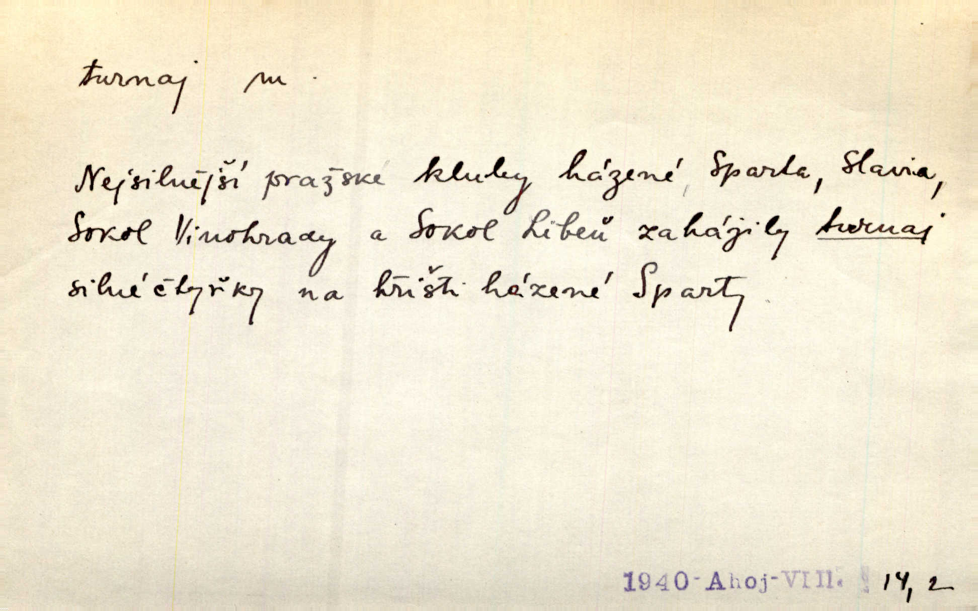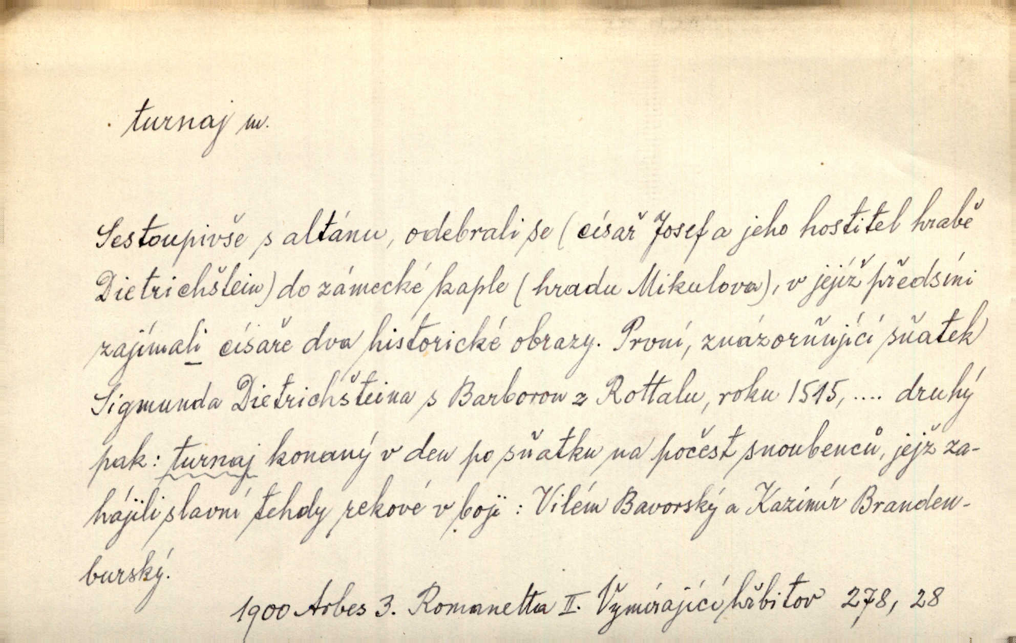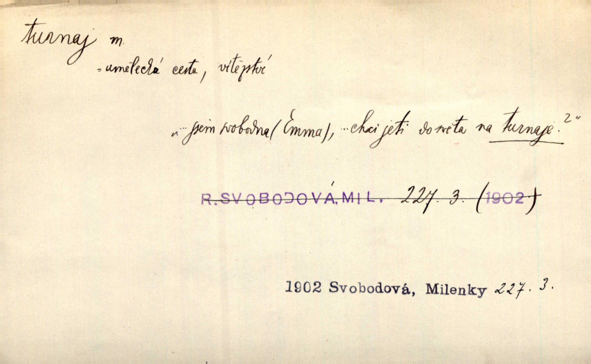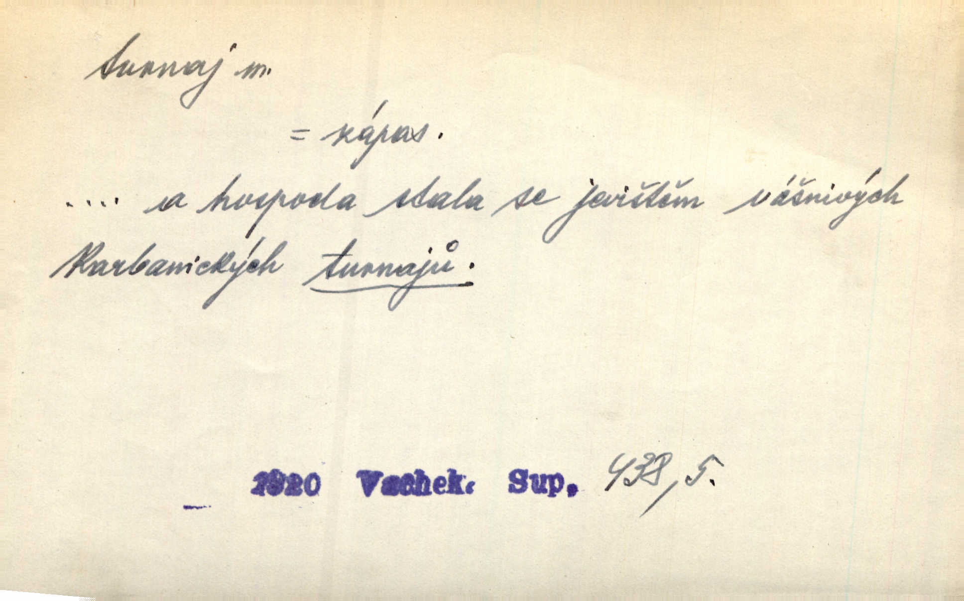 - turnaj, -e m. středověká rytířská hra, rytířský zápas, kolba. Byl vypsán z Prahy velký turnaj, ku kterémuž se všickni rytíři sjeti měli. Něm. Troubami dáno znamení k turnaji, a jako dva vtělení vichrové hnali rytířové proti sobě. Ritt. Přen. Hospoda stala se jevištěm vášnivých karbanických turnajů. Vach. Slavily se tu nejedny turnaje v řečnictví. V. Mrš. Jsem svobodna, chci jeti do světa na turnaje na závodění o slávu. R. Svob. D Sport. sportovní soutěž jednotlivců n. družstev; turnaj šermířský, tennisový, šachový a j.
