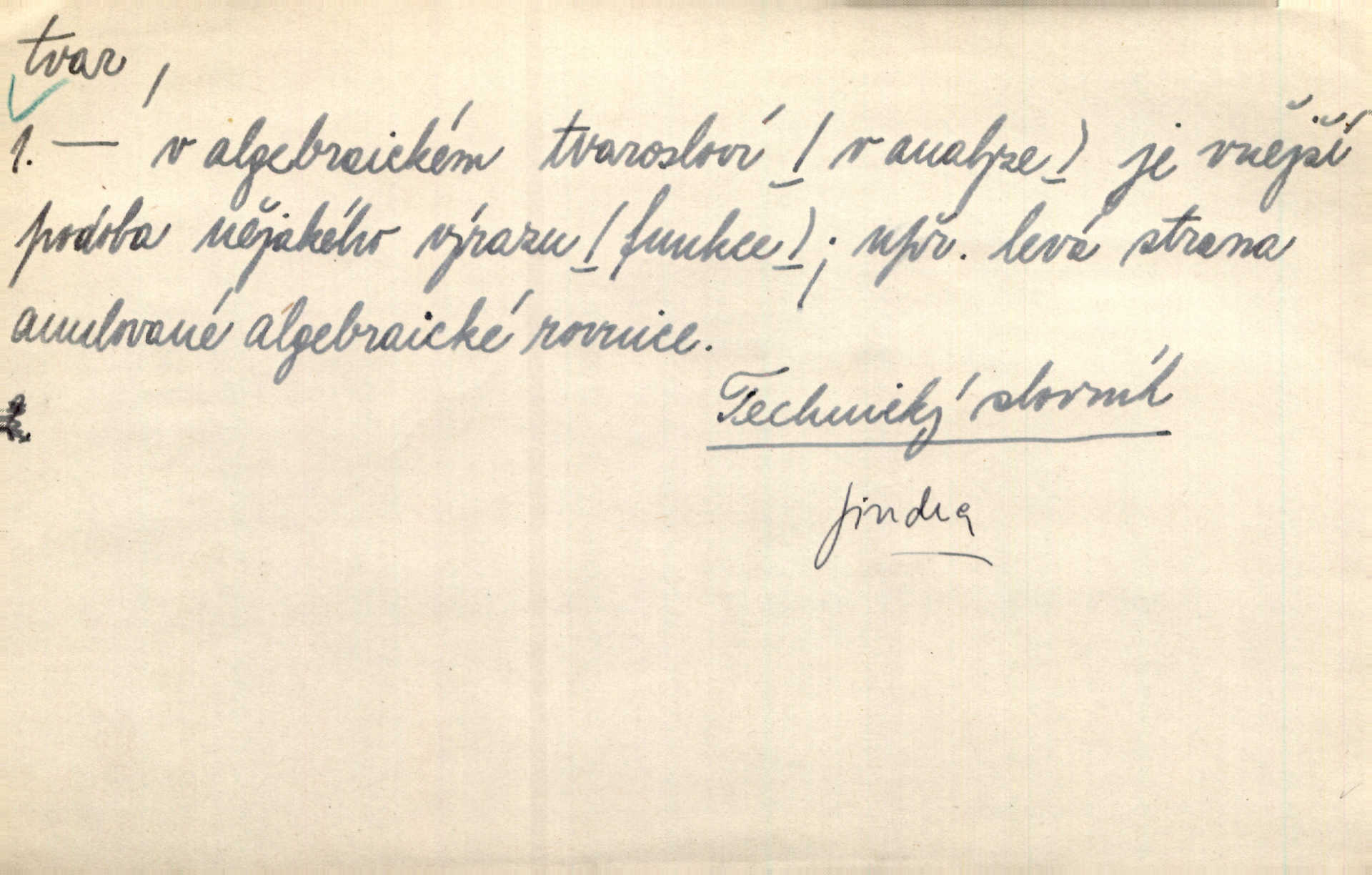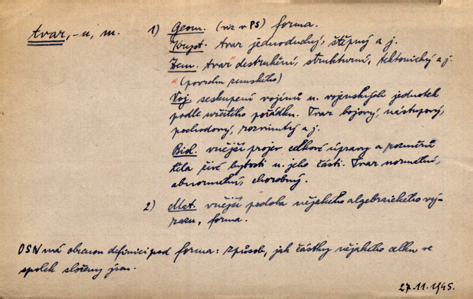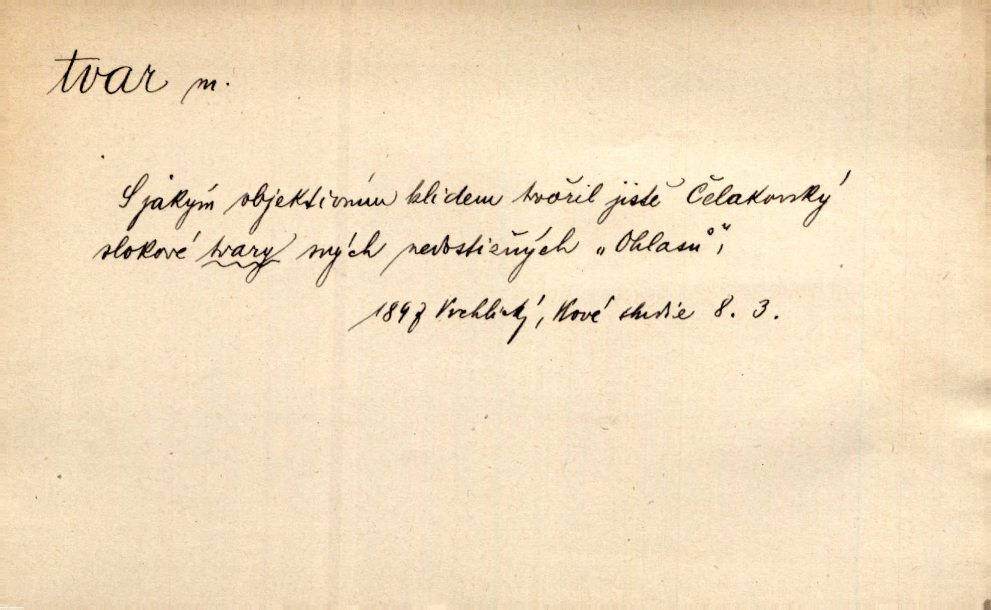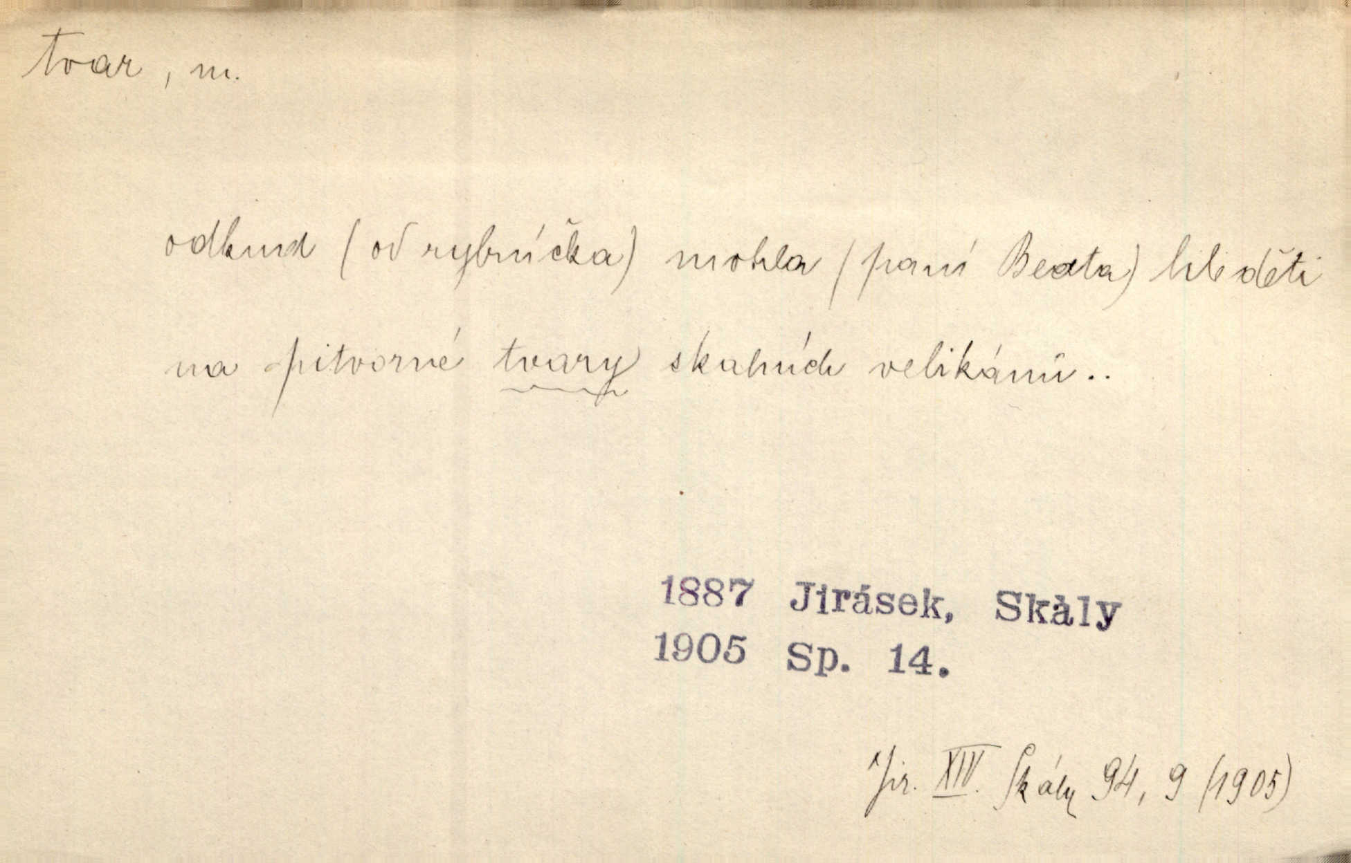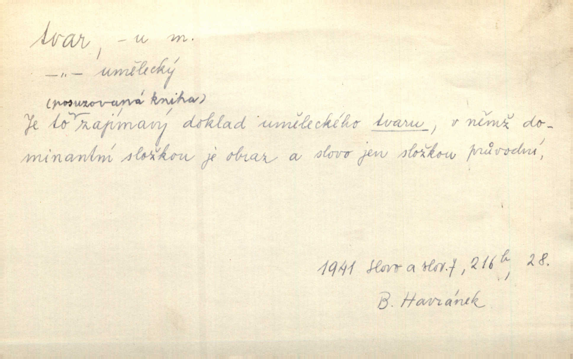 - tvar, -u m. způsob, jakým je plošný obraz n. těleso vymezeno. Původní česká vesnice byla formy okrouhlé a již tvarem svým byla symbolem a výrazem jednoty rodové. Jir. Seděl v lenošce tvaru poněkud starodávného. Herrm. Lámu větévku s nejbližšího keře a ohýbám ji ve tvar věnce. Lit. noviny. Zvláště tvar nosu a malých úst dojímal pozorovatele. Ner. Nad vlnamí páry se vznášely a kolem dědin rozkládaly běloučký svůj tvar. V. Mrš. Geom. forma. Kryst. tvar jednoduchý, štěpený a j. Zem. tvar (povrchu zemského) destrukční, strukturní, tektonický a j. Zahr. zákrsek (stromek) uměle tvarovaný. Voj. seskupování vojínů n. vojenských jednotek podle určitého pořádku. Tvar bojový, nástupový, bočný, čelní, pochodový a p. Tech. aerodynamický tvar (vozidla, letadla). D tvary (tělesné) proporce, rozměry, vnější vzhled. Na prahu sýpky stálo děvče postavy vysoké, plných tvarů. Jan. Prsa jejich [tanečnic] byla pokryta penězi tvořícími jakýs pohyblivý, vděkuplně k tvarům přiléhající pancíř. Zey. Na oblačných štítech, vozech, koních obrovské se mužů kreslí tvary. Čech. Mě takým činí [Athéna]‚ jak přeje si, jednak žebráka tvar mi dávajíc, jednak i muže mladého zas. Vaň. Vidím ten rozum vzácný, vznešený — všechen ten tvar a vzlhled mladistvé krásy. J. J. Kol. [Máť mrtvých] stvořila jí [duši pěvcově] příbytek ve tvaru slavíka. Zey. Biol. tvar normální, abnormální, chorobný. D ráz, způsob. Používá [tělesná výchova] pro všechny cvičence celé řady různých druhů a tvarů vrhů a hodů. Vojta. Známost Jaroslavova se slečnou Rosou nabývala nyní barvitého tvaru. Hál. Byl si předsevzal, že bude „sloužiti člověčenstvu“ a mlhavý ten pojem vzal náhle na se tvar určitý. Zey. Rodiče jsou povinni objevit svému dítěti tvar životní, který pokládají za vrcholný. R. Svob. Mat. vnější podoba nějakého algebraického výrazu, forma. D gramatická podoba slova. Básníka překvapilo slovo „říci“ jako z úst baletky neočekávaný tvar. Čap. Ch. Gram. obměněná podoba slova mající mluvnický význam; slovesné tvary určité a neurčité; tvary jednoduché a složité, opsané; tvary jmenné a složené (přídavného jména). D uspořádání všech složek i částí uměleckého díla. Tvar uměleckého díla, jeho důsledné dopracování a domýšlení, je předním příznakem díla opravdu uměleckého. Muk. Symbolisté kladli důraz na tvar jako na cosi absolutního. Muk. Je to zajímavý doklad uměleckého tvaru, v němž dominantní složkou je obraz a slovo jen složkou průvodní. Havr. D Psych. v idealistické psychologii tvarové nesoučtový celek, jehož celostní charakter není podmíněn komponenty.