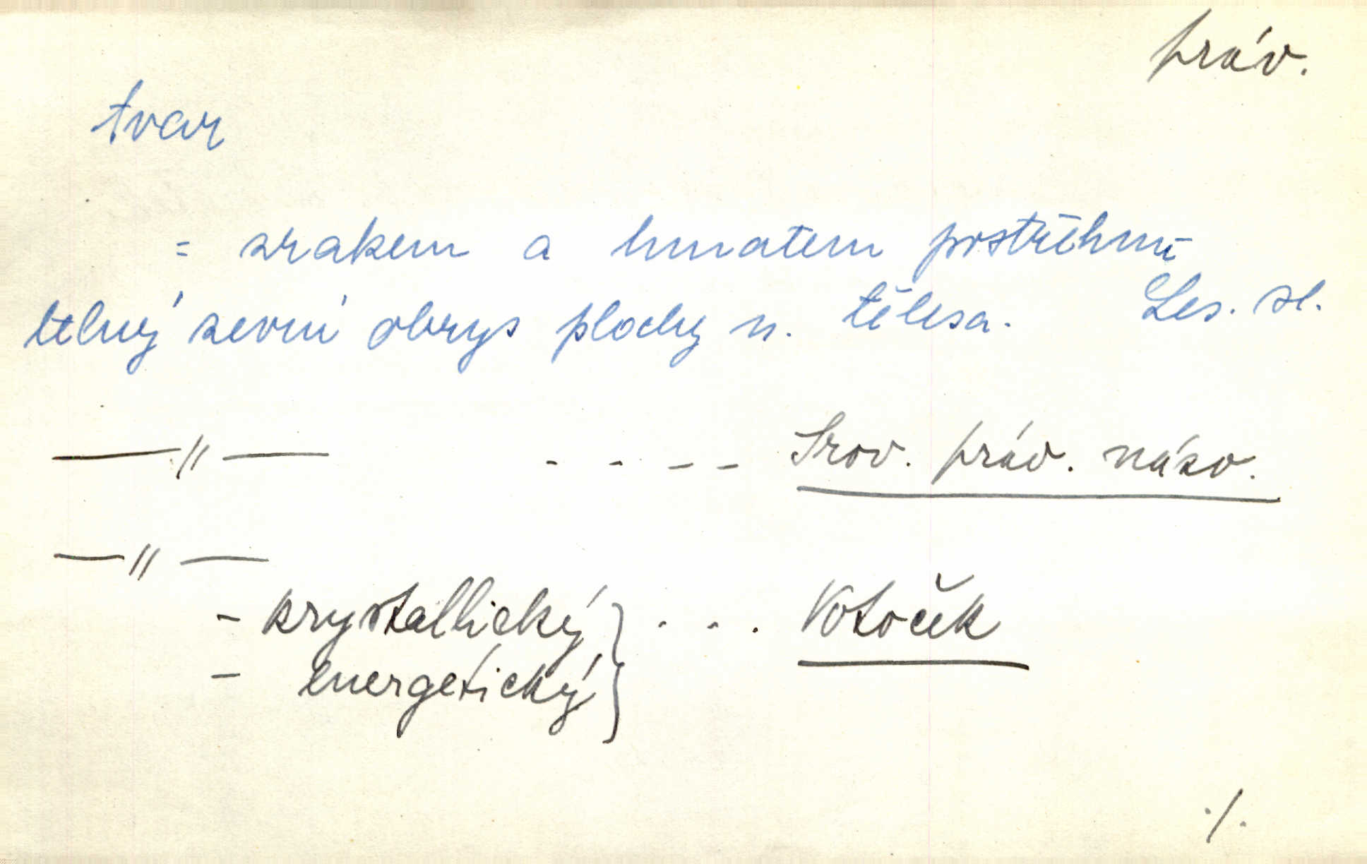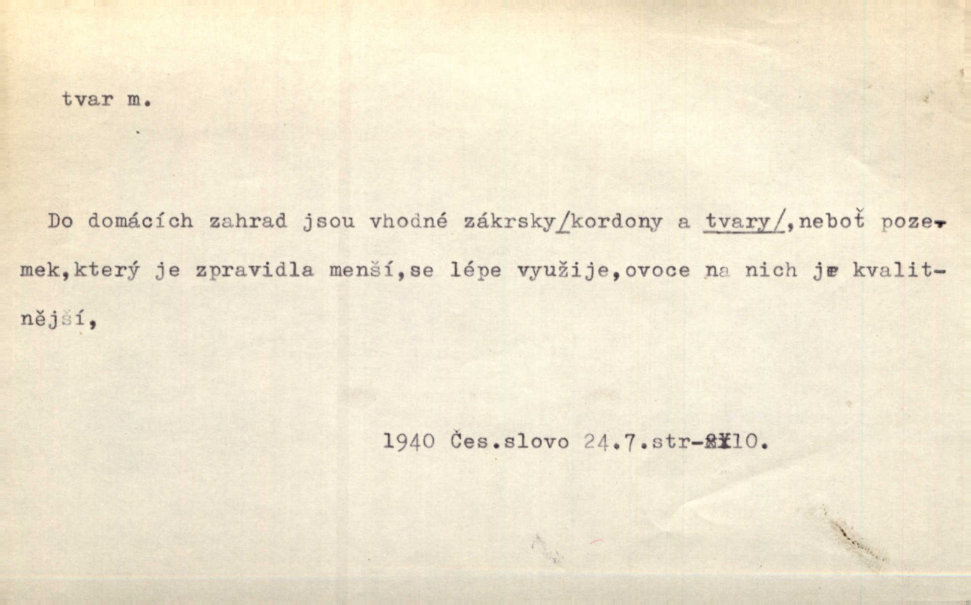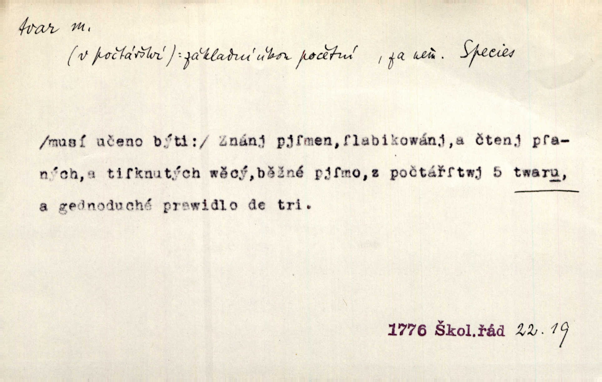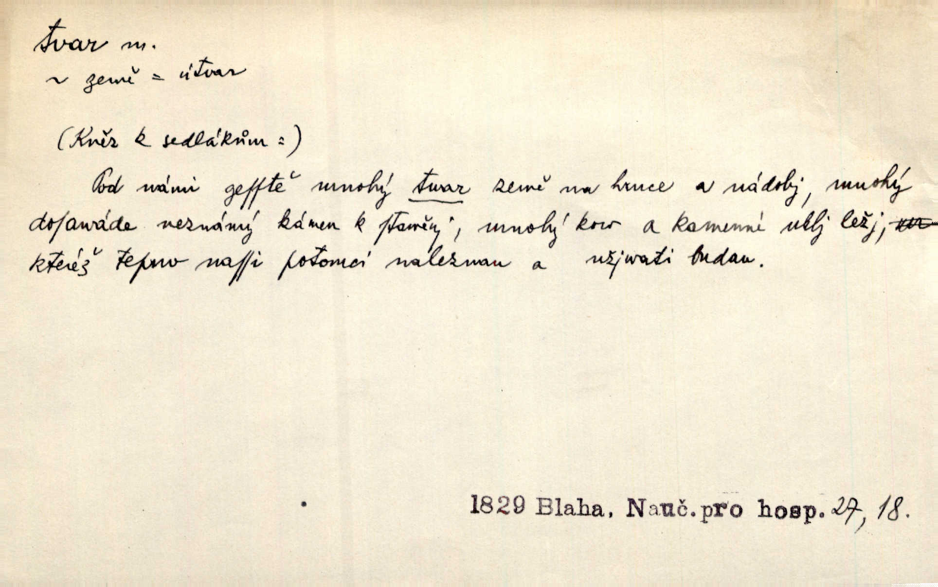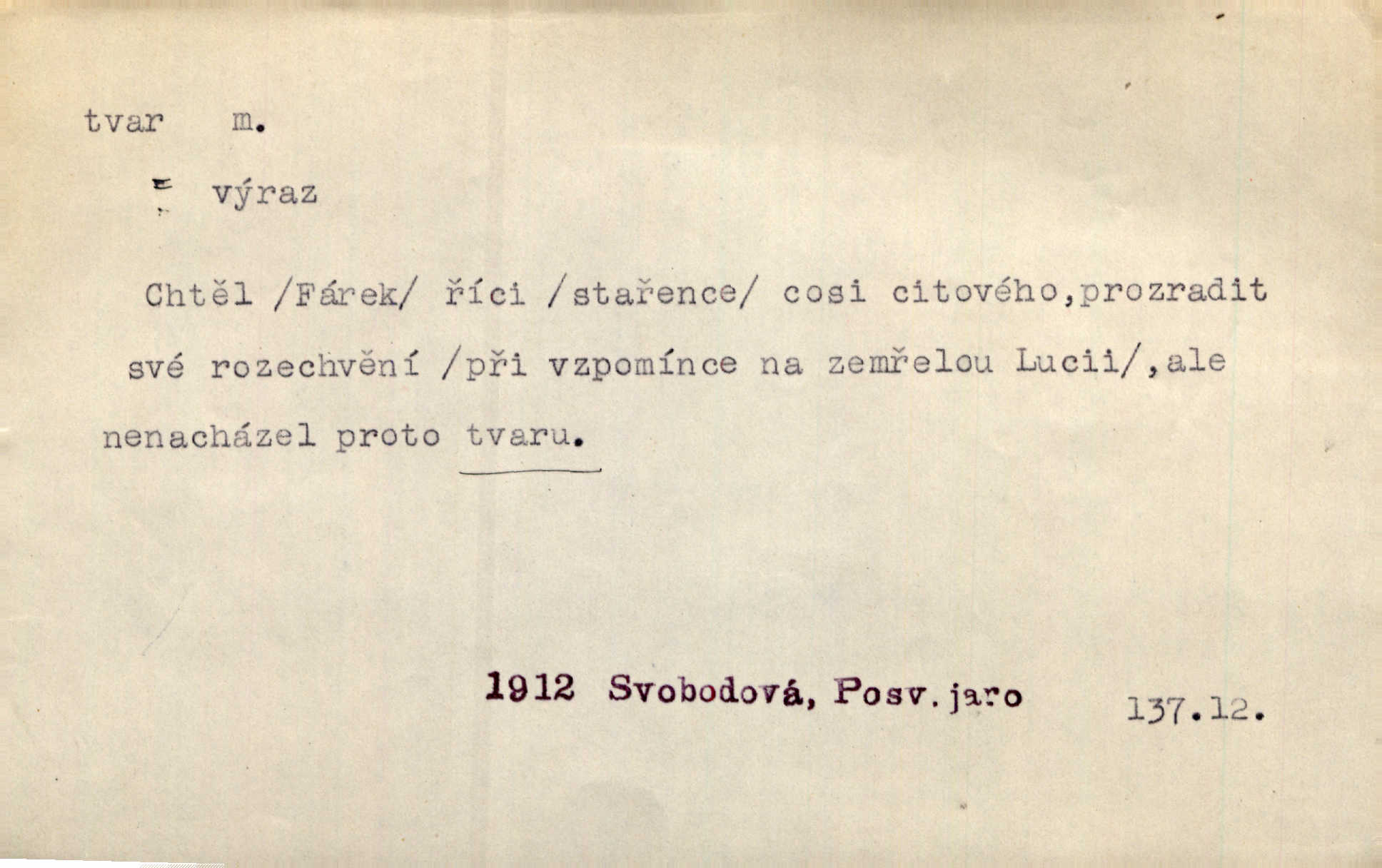 - tvar, -u m. způsob, jakým je plošný obraz n. těleso vymezeno. Původní česká vesnice byla formy okrouhlé a již tvarem svým byla symbolem a výrazem jednoty rodové. Jir. Seděl v lenošce tvaru poněkud starodávného. Herrm. Lámu větévku s nejbližšího keře a ohýbám ji ve tvar věnce. Lit. noviny. Zvláště tvar nosu a malých úst dojímal pozorovatele. Ner. Nad vlnamí páry se vznášely a kolem dědin rozkládaly běloučký svůj tvar. V. Mrš. Geom. forma. Kryst. tvar jednoduchý, štěpený a j. Zem. tvar (povrchu zemského) destrukční, strukturní, tektonický a j. Zahr. zákrsek (stromek) uměle tvarovaný. Voj. seskupování vojínů n. vojenských jednotek podle určitého pořádku. Tvar bojový, nástupový, bočný, čelní, pochodový a p. Tech. aerodynamický tvar (vozidla, letadla). D tvary (tělesné) proporce, rozměry, vnější vzhled. Na prahu sýpky stálo děvče postavy vysoké, plných tvarů. Jan. Prsa jejich [tanečnic] byla pokryta penězi tvořícími jakýs pohyblivý, vděkuplně k tvarům přiléhající pancíř. Zey. Na oblačných štítech, vozech, koních obrovské se mužů kreslí tvary. Čech. Mě takým činí [Athéna]‚ jak přeje si, jednak žebráka tvar mi dávajíc, jednak i muže mladého zas. Vaň. Vidím ten rozum vzácný, vznešený — všechen ten tvar a vzlhled mladistvé krásy. J. J. Kol. [Máť mrtvých] stvořila jí [duši pěvcově] příbytek ve tvaru slavíka. Zey. Biol. tvar normální, abnormální, chorobný. D ráz, způsob. Používá [tělesná výchova] pro všechny cvičence celé řady různých druhů a tvarů vrhů a hodů. Vojta. Známost Jaroslavova se slečnou Rosou nabývala nyní barvitého tvaru. Hál. Byl si předsevzal, že bude „sloužiti člověčenstvu“ a mlhavý ten pojem vzal náhle na se tvar určitý. Zey. Rodiče jsou povinni objevit svému dítěti tvar životní, který pokládají za vrcholný. R. Svob. Mat. vnější podoba nějakého algebraického výrazu, forma. D gramatická podoba slova. Básníka překvapilo slovo „říci“ jako z úst baletky neočekávaný tvar. Čap. Ch. Gram. obměněná podoba slova mající mluvnický význam; slovesné tvary určité a neurčité; tvary jednoduché a složité, opsané; tvary jmenné a složené (přídavného jména). D uspořádání všech složek i částí uměleckého díla. Tvar uměleckého díla, jeho důsledné dopracování a domýšlení, je předním příznakem díla opravdu uměleckého. Muk. Symbolisté kladli důraz na tvar jako na cosi absolutního. Muk. Je to zajímavý doklad uměleckého tvaru, v němž dominantní složkou je obraz a slovo jen složkou průvodní. Havr. D Psych. v idealistické psychologii tvarové nesoučtový celek, jehož celostní charakter není podmíněn komponenty.