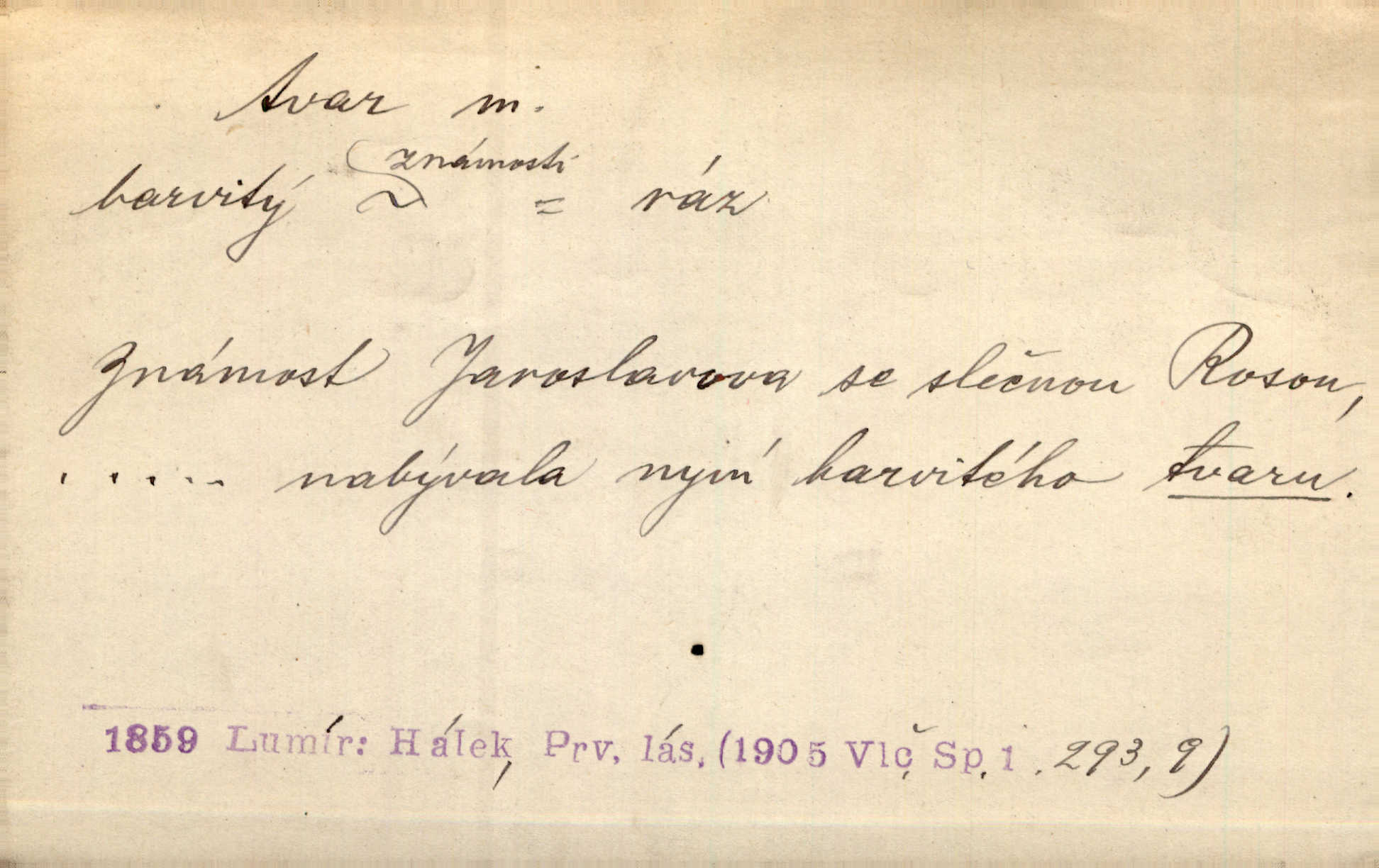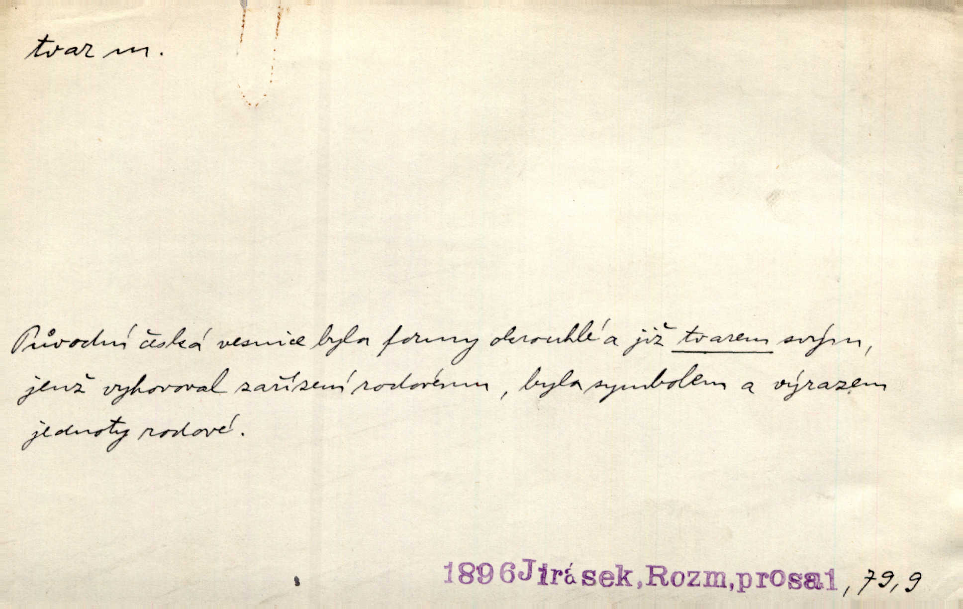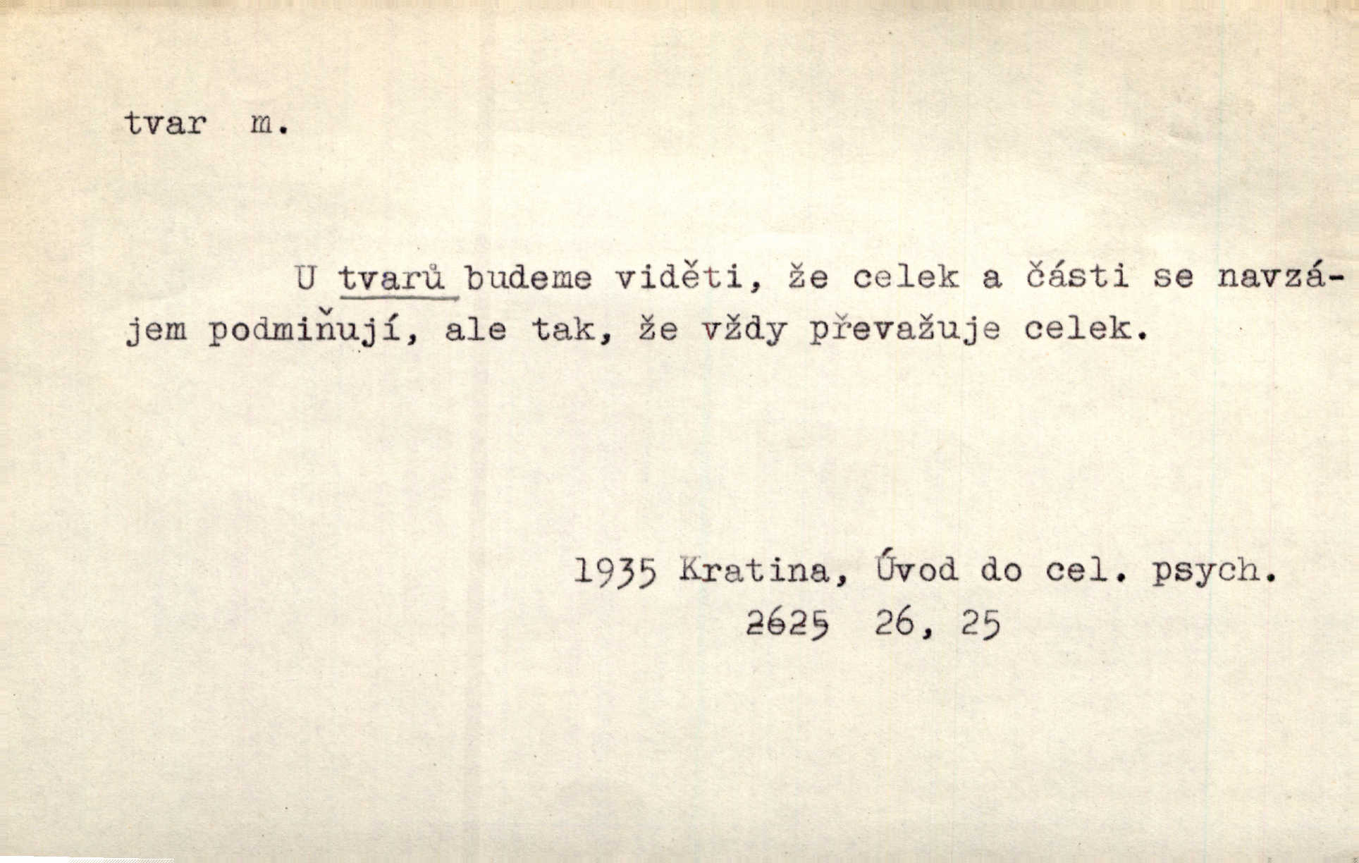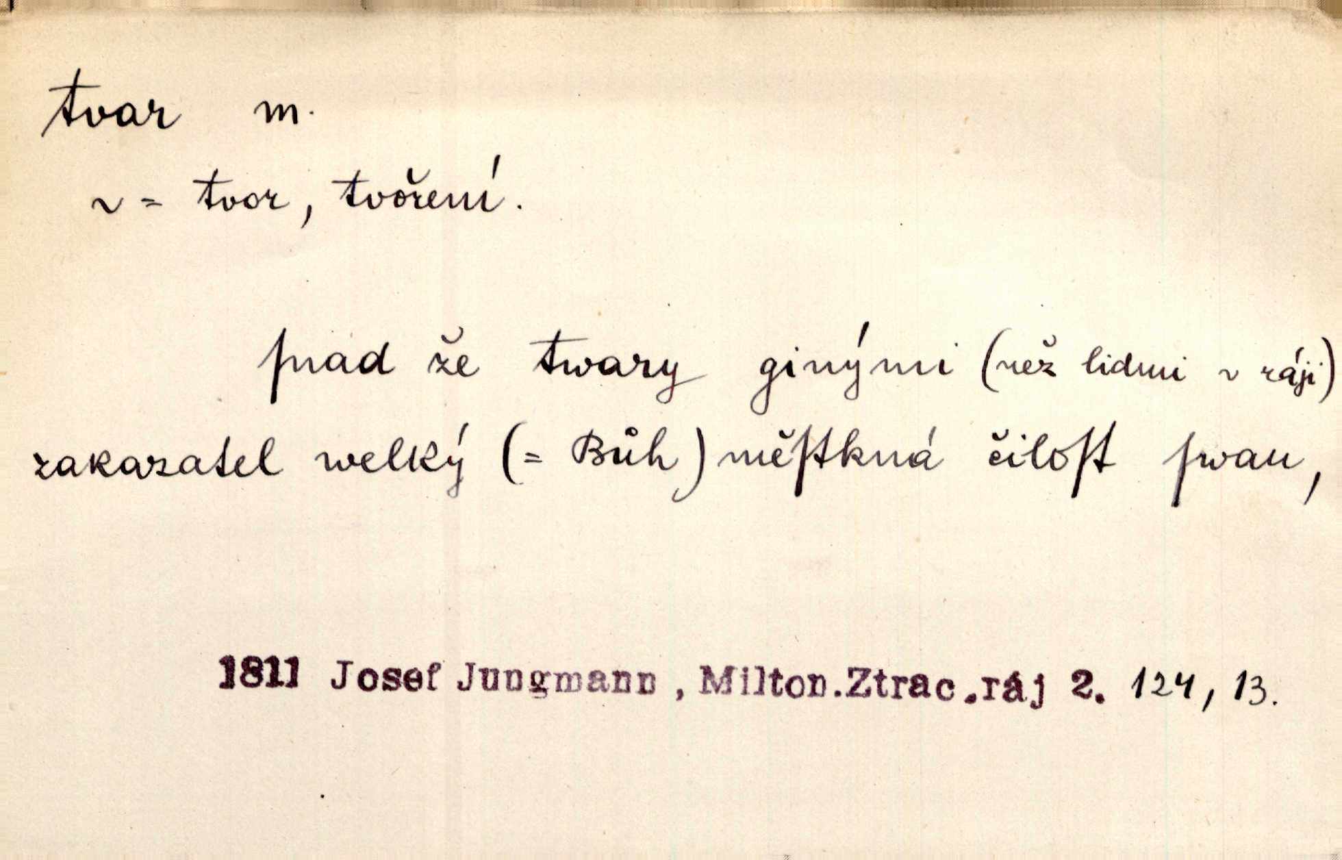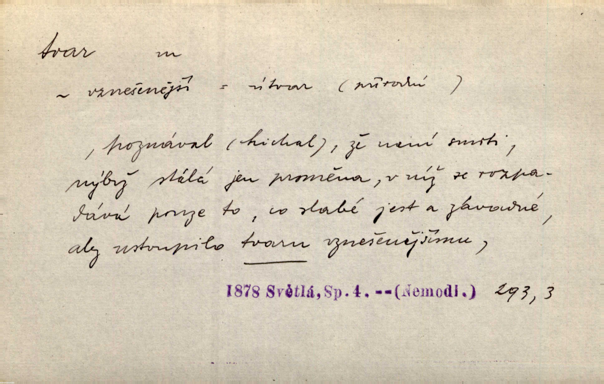 - tvar, -u m. způsob, jakým je plošný obraz n. těleso vymezeno. Původní česká vesnice byla formy okrouhlé a již tvarem svým byla symbolem a výrazem jednoty rodové. Jir. Seděl v lenošce tvaru poněkud starodávného. Herrm. Lámu větévku s nejbližšího keře a ohýbám ji ve tvar věnce. Lit. noviny. Zvláště tvar nosu a malých úst dojímal pozorovatele. Ner. Nad vlnamí páry se vznášely a kolem dědin rozkládaly běloučký svůj tvar. V. Mrš. Geom. forma. Kryst. tvar jednoduchý, štěpený a j. Zem. tvar (povrchu zemského) destrukční, strukturní, tektonický a j. Zahr. zákrsek (stromek) uměle tvarovaný. Voj. seskupování vojínů n. vojenských jednotek podle určitého pořádku. Tvar bojový, nástupový, bočný, čelní, pochodový a p. Tech. aerodynamický tvar (vozidla, letadla). D tvary (tělesné) proporce, rozměry, vnější vzhled. Na prahu sýpky stálo děvče postavy vysoké, plných tvarů. Jan. Prsa jejich [tanečnic] byla pokryta penězi tvořícími jakýs pohyblivý, vděkuplně k tvarům přiléhající pancíř. Zey. Na oblačných štítech, vozech, koních obrovské se mužů kreslí tvary. Čech. Mě takým činí [Athéna]‚ jak přeje si, jednak žebráka tvar mi dávajíc, jednak i muže mladého zas. Vaň. Vidím ten rozum vzácný, vznešený — všechen ten tvar a vzlhled mladistvé krásy. J. J. Kol. [Máť mrtvých] stvořila jí [duši pěvcově] příbytek ve tvaru slavíka. Zey. Biol. tvar normální, abnormální, chorobný. D ráz, způsob. Používá [tělesná výchova] pro všechny cvičence celé řady různých druhů a tvarů vrhů a hodů. Vojta. Známost Jaroslavova se slečnou Rosou nabývala nyní barvitého tvaru. Hál. Byl si předsevzal, že bude „sloužiti člověčenstvu“ a mlhavý ten pojem vzal náhle na se tvar určitý. Zey. Rodiče jsou povinni objevit svému dítěti tvar životní, který pokládají za vrcholný. R. Svob. Mat. vnější podoba nějakého algebraického výrazu, forma. D gramatická podoba slova. Básníka překvapilo slovo „říci“ jako z úst baletky neočekávaný tvar. Čap. Ch. Gram. obměněná podoba slova mající mluvnický význam; slovesné tvary určité a neurčité; tvary jednoduché a složité, opsané; tvary jmenné a složené (přídavného jména). D uspořádání všech složek i částí uměleckého díla. Tvar uměleckého díla, jeho důsledné dopracování a domýšlení, je předním příznakem díla opravdu uměleckého. Muk. Symbolisté kladli důraz na tvar jako na cosi absolutního. Muk. Je to zajímavý doklad uměleckého tvaru, v němž dominantní složkou je obraz a slovo jen složkou průvodní. Havr. D Psych. v idealistické psychologii tvarové nesoučtový celek, jehož celostní charakter není podmíněn komponenty.