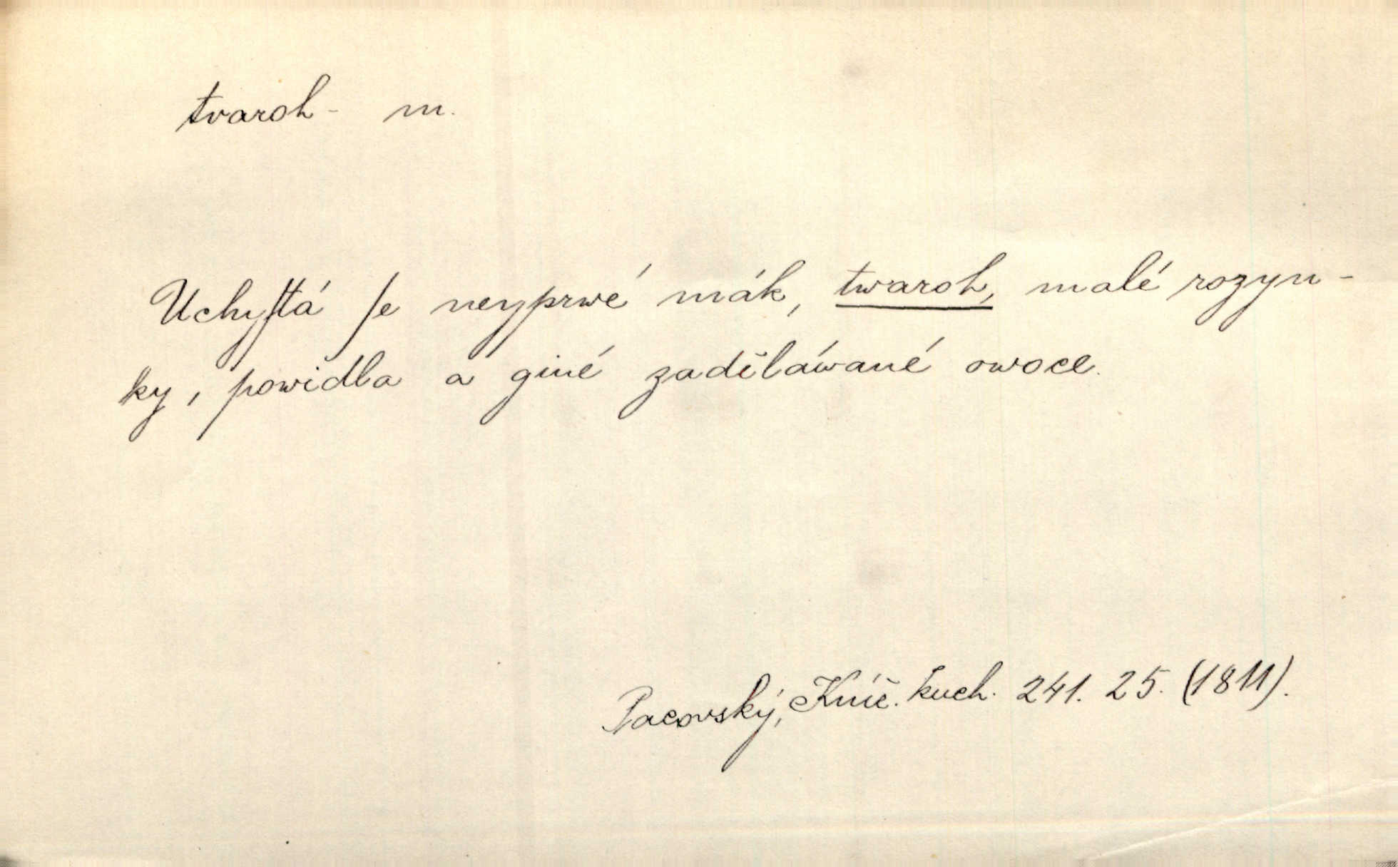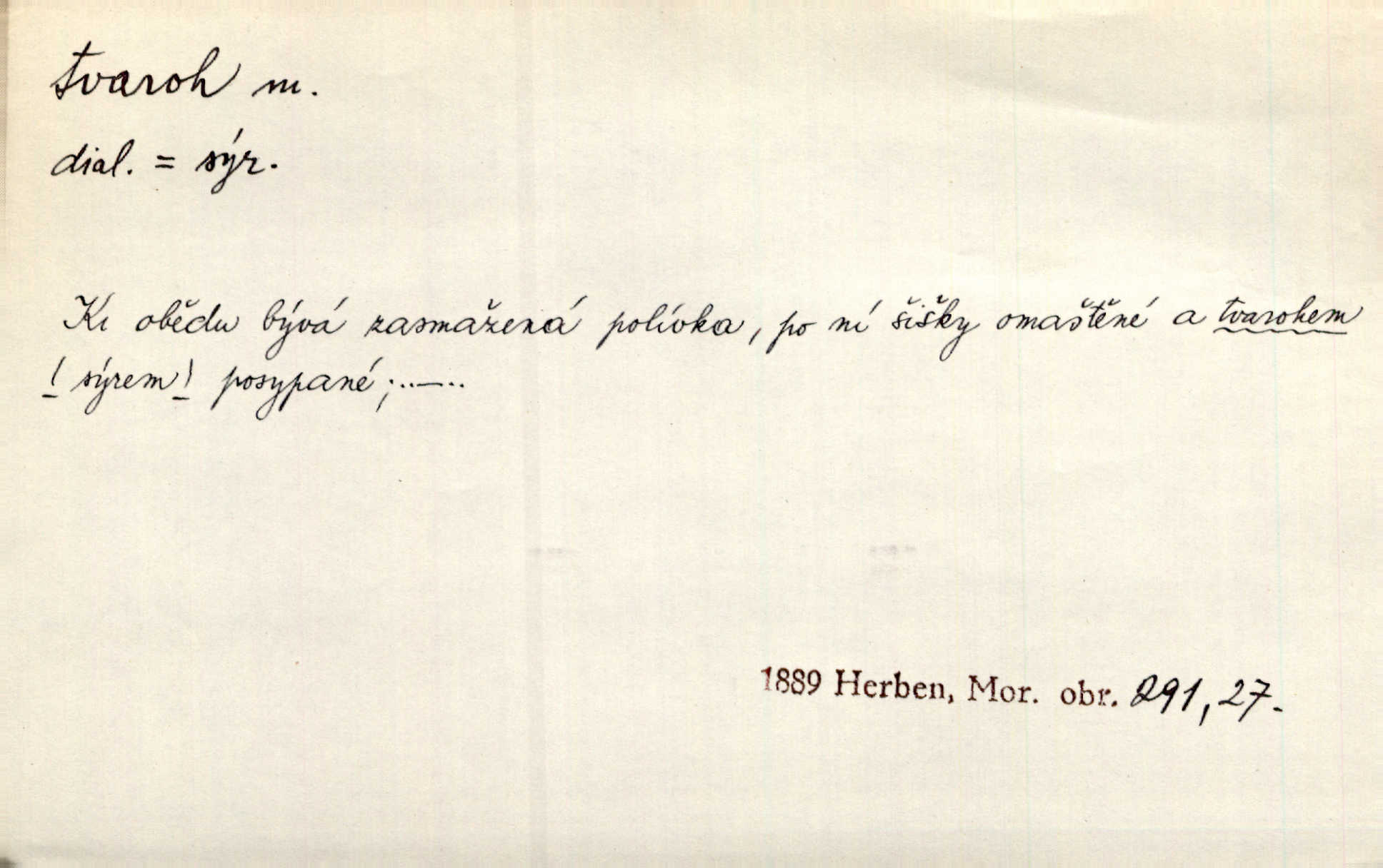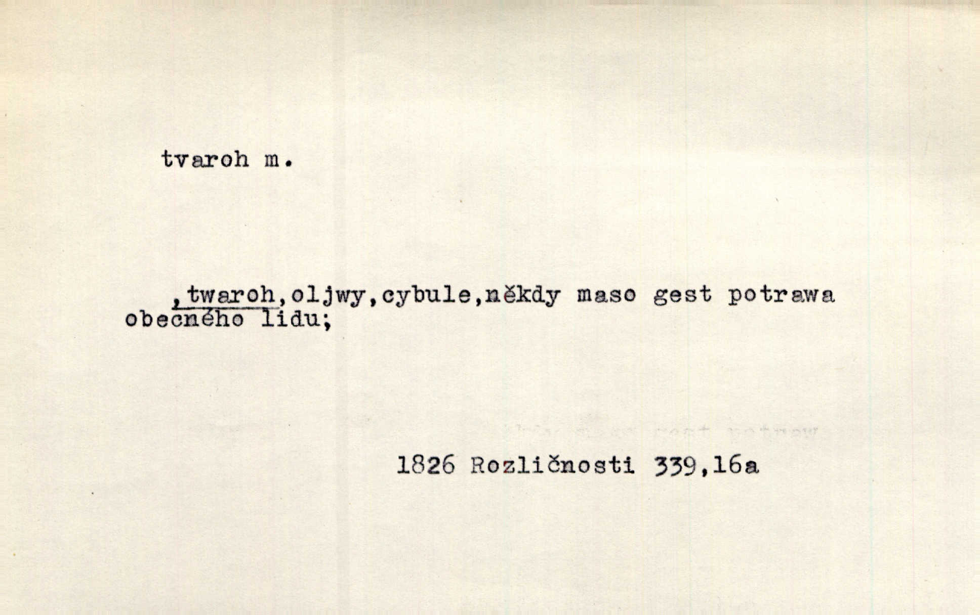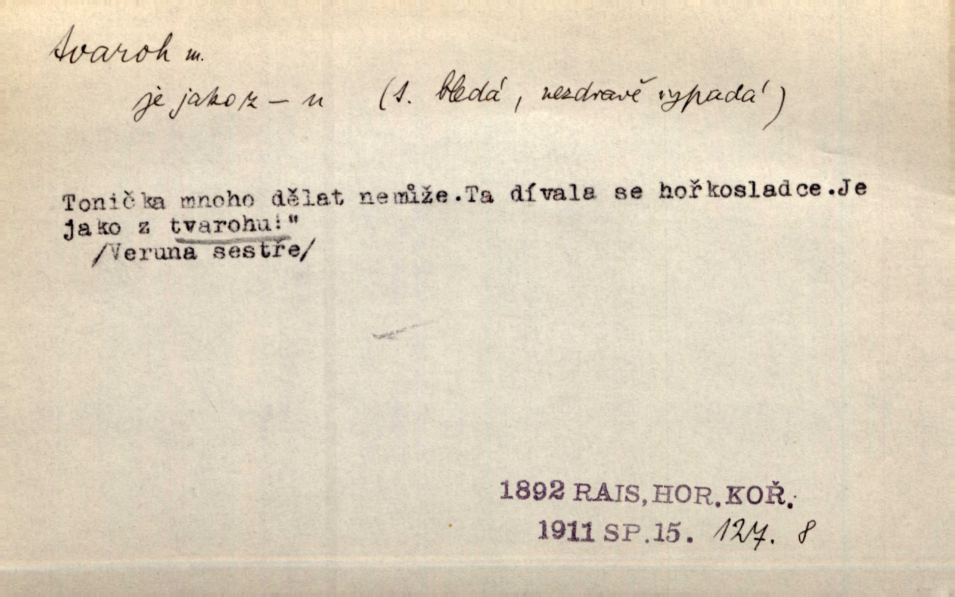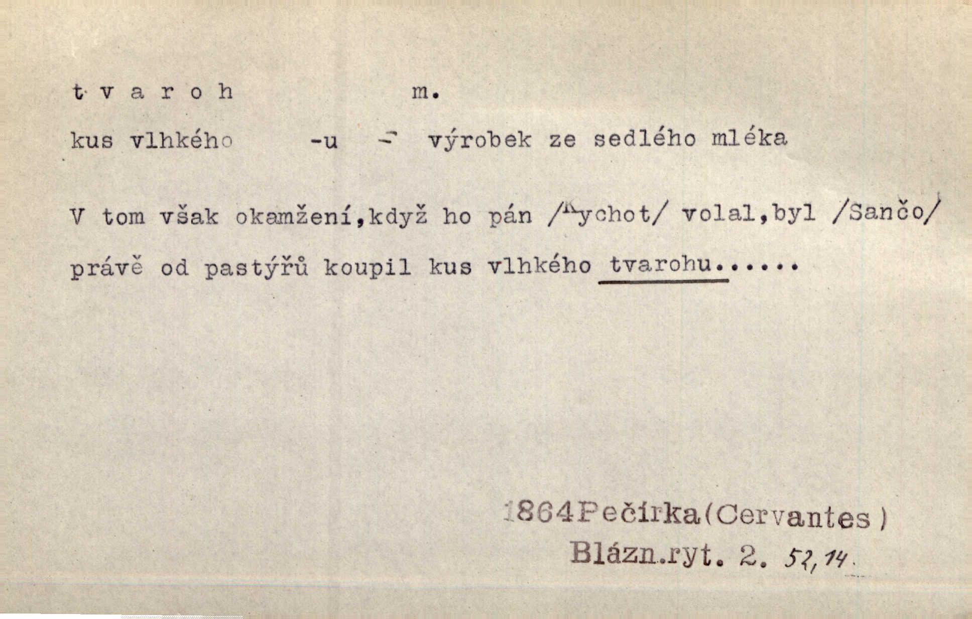 - tvaroh, -u m. mléčný výrobek, vzniklý sražením kaseinu. Já jsem ti schoval kousek tvarohu. Pfleg. Vyklopila hrnek zemčat na loupačku, k nim tvaroh mlékem rozdělaný. Herrm. Bývají děti podělovány vdolky a netyjí posýpanou tvarohem. Preis. Ubledne, jako by byla z tvarohu. Tyl. Styděli se [dělníci] všichni, ačkoli nebyli také zrovna z tvarohu příliš citliví. Čap. Ch. Poslali výra pro kus sýra, on přinesl tvaroh hloupému svěřili poslání. Čel. Přen. Máš-li peněz dost a tvaroh v mozku svém, také uplatníš se na té pouti zdejší. Mach.