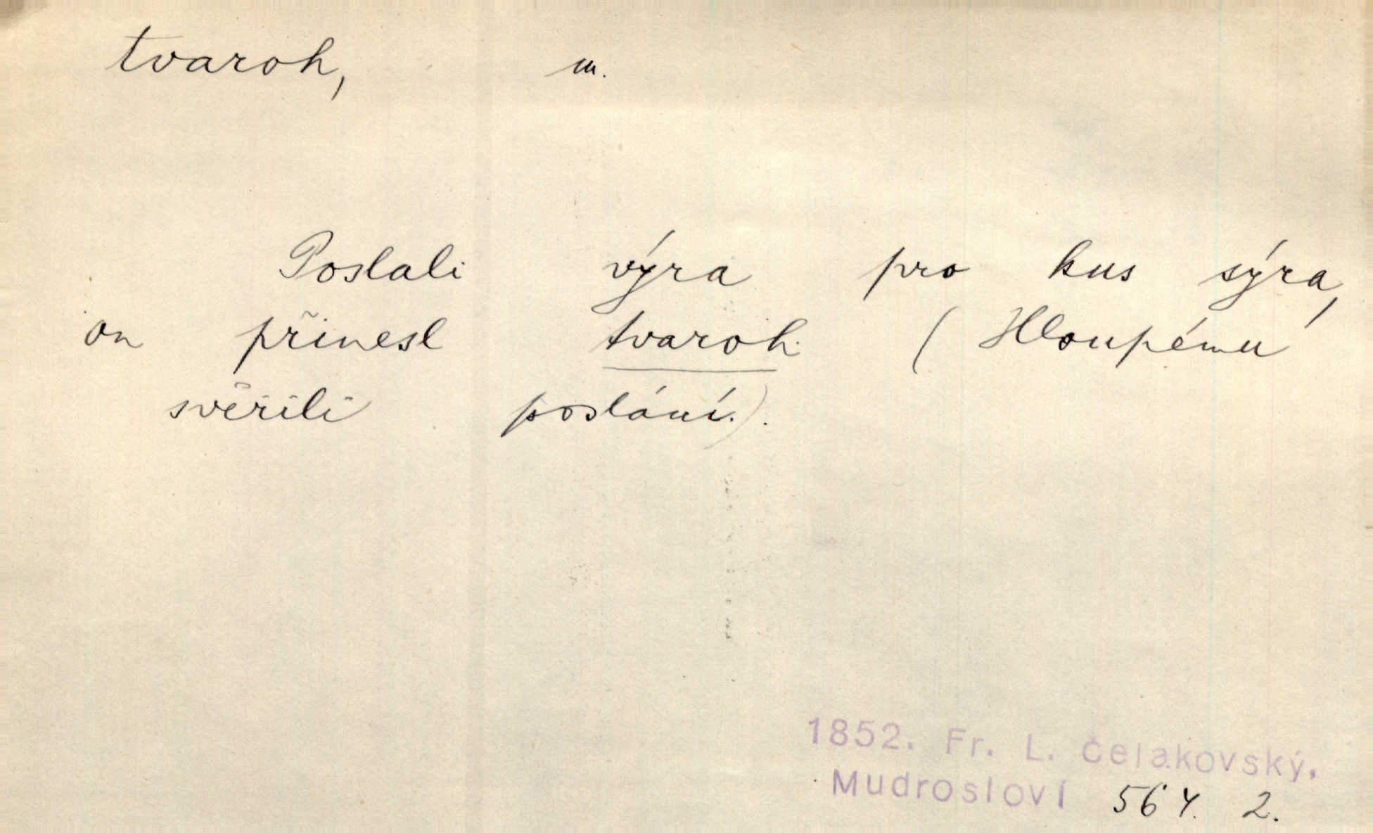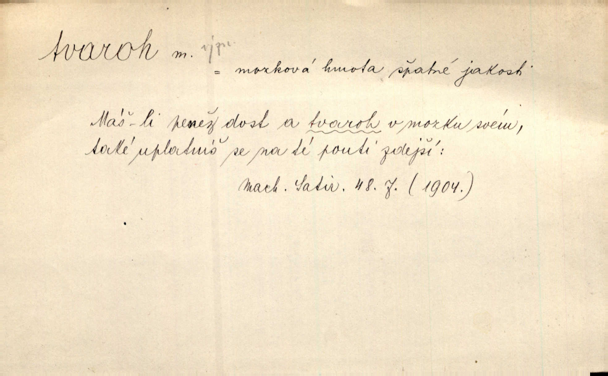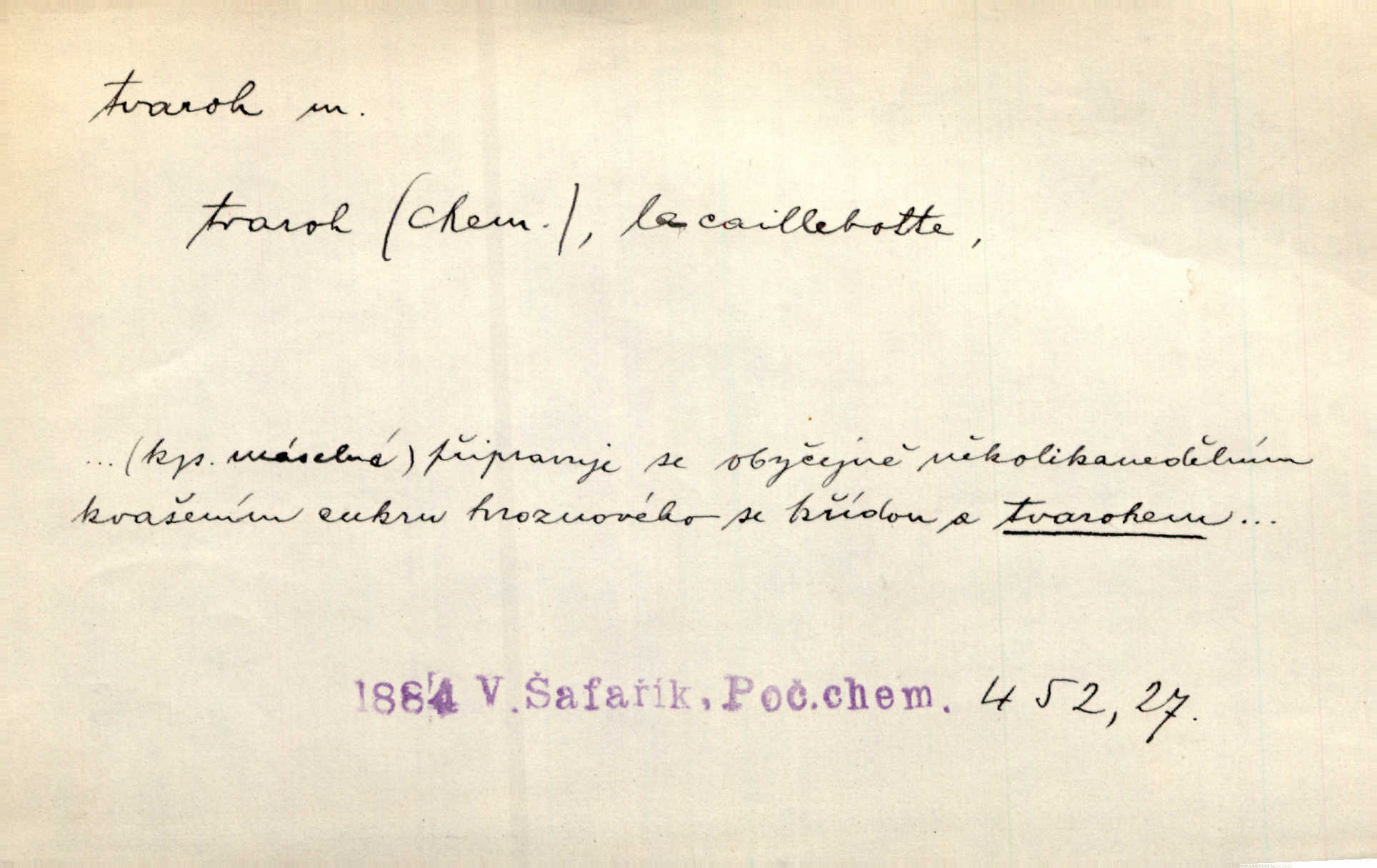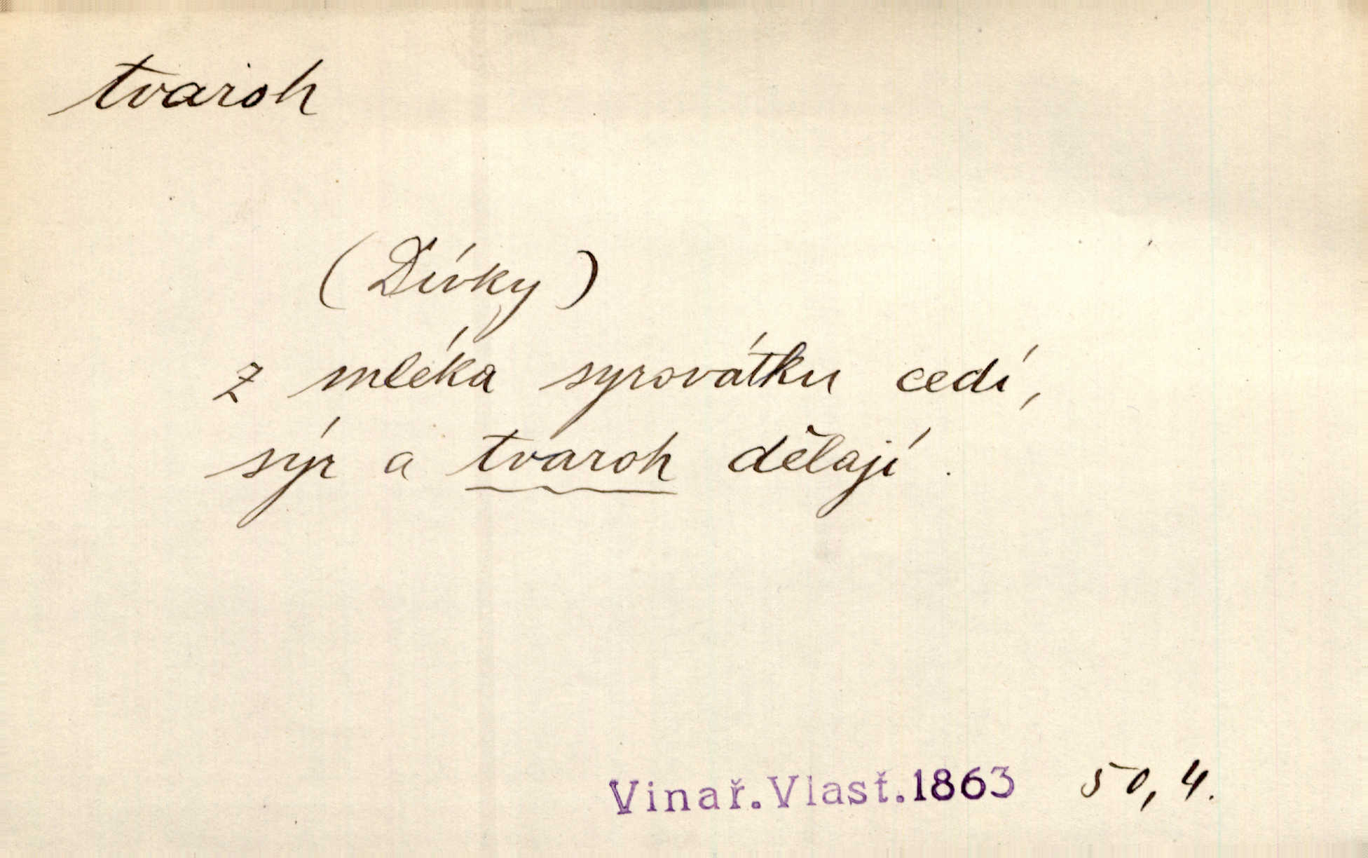 - tvaroh, -u m. mléčný výrobek, vzniklý sražením kaseinu. Já jsem ti schoval kousek tvarohu. Pfleg. Vyklopila hrnek zemčat na loupačku, k nim tvaroh mlékem rozdělaný. Herrm. Bývají děti podělovány vdolky a netyjí posýpanou tvarohem. Preis. Ubledne, jako by byla z tvarohu. Tyl. Styděli se [dělníci] všichni, ačkoli nebyli také zrovna z tvarohu příliš citliví. Čap. Ch. Poslali výra pro kus sýra, on přinesl tvaroh hloupému svěřili poslání. Čel. Přen. Máš-li peněz dost a tvaroh v mozku svém, také uplatníš se na té pouti zdejší. Mach.