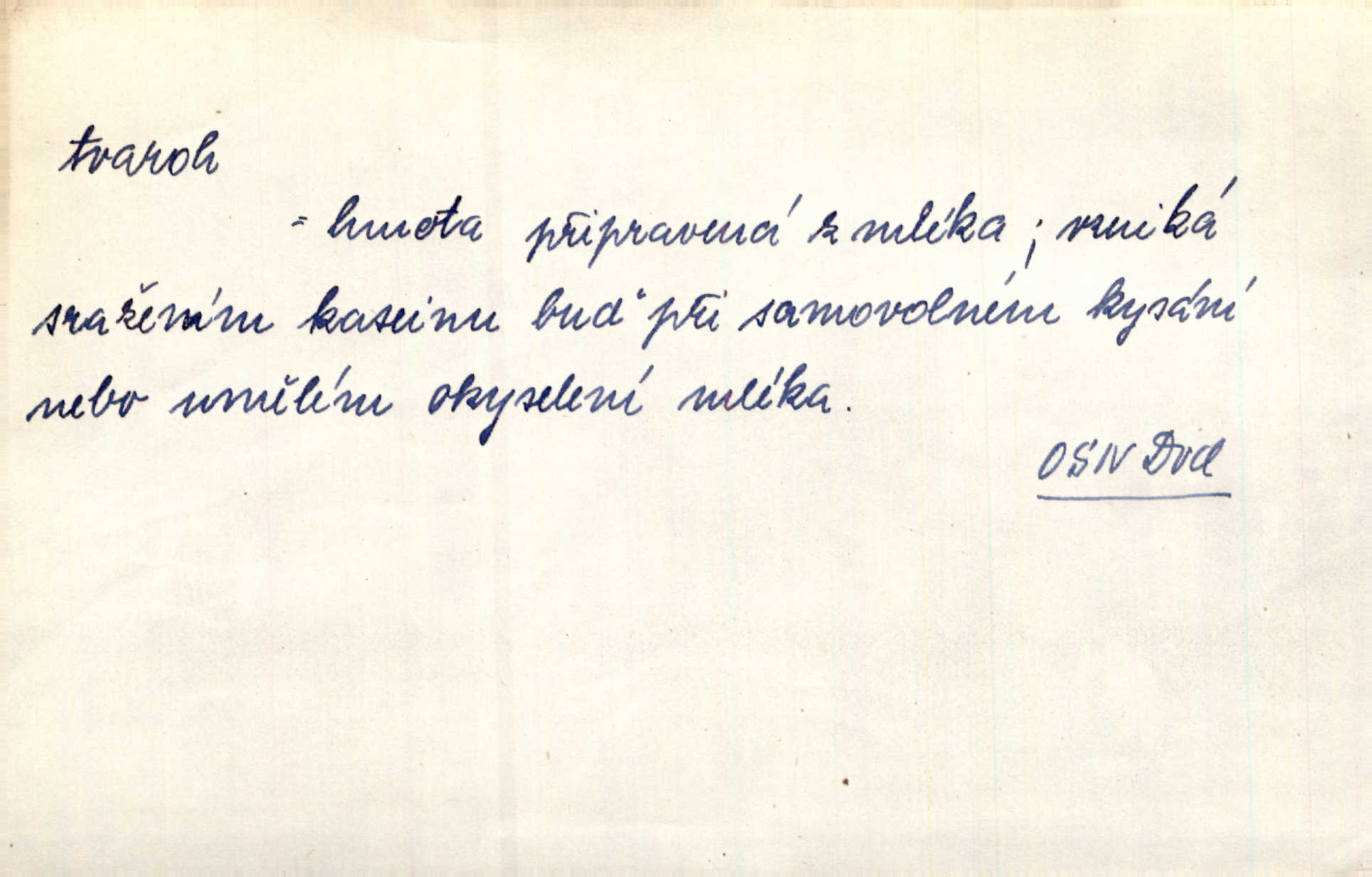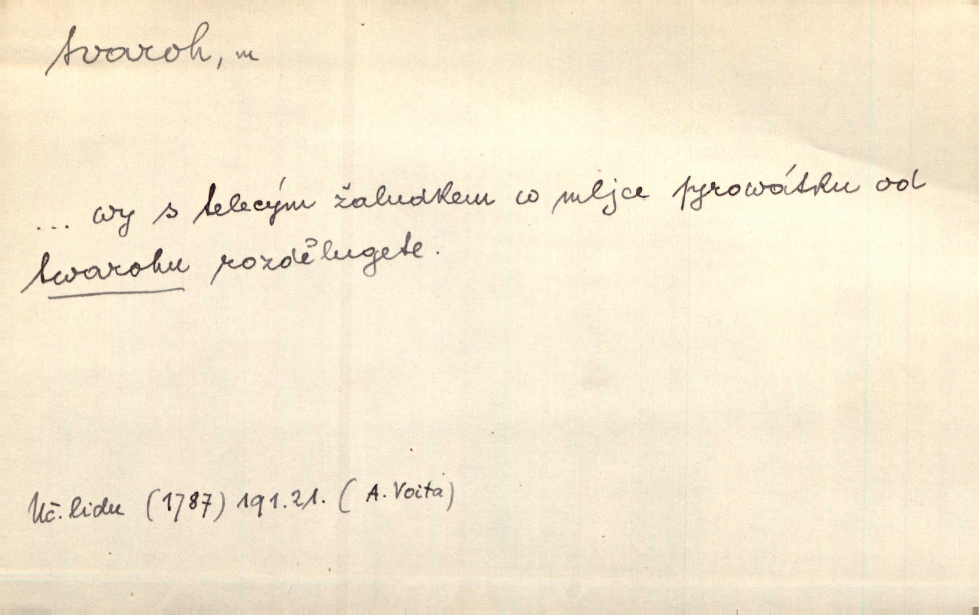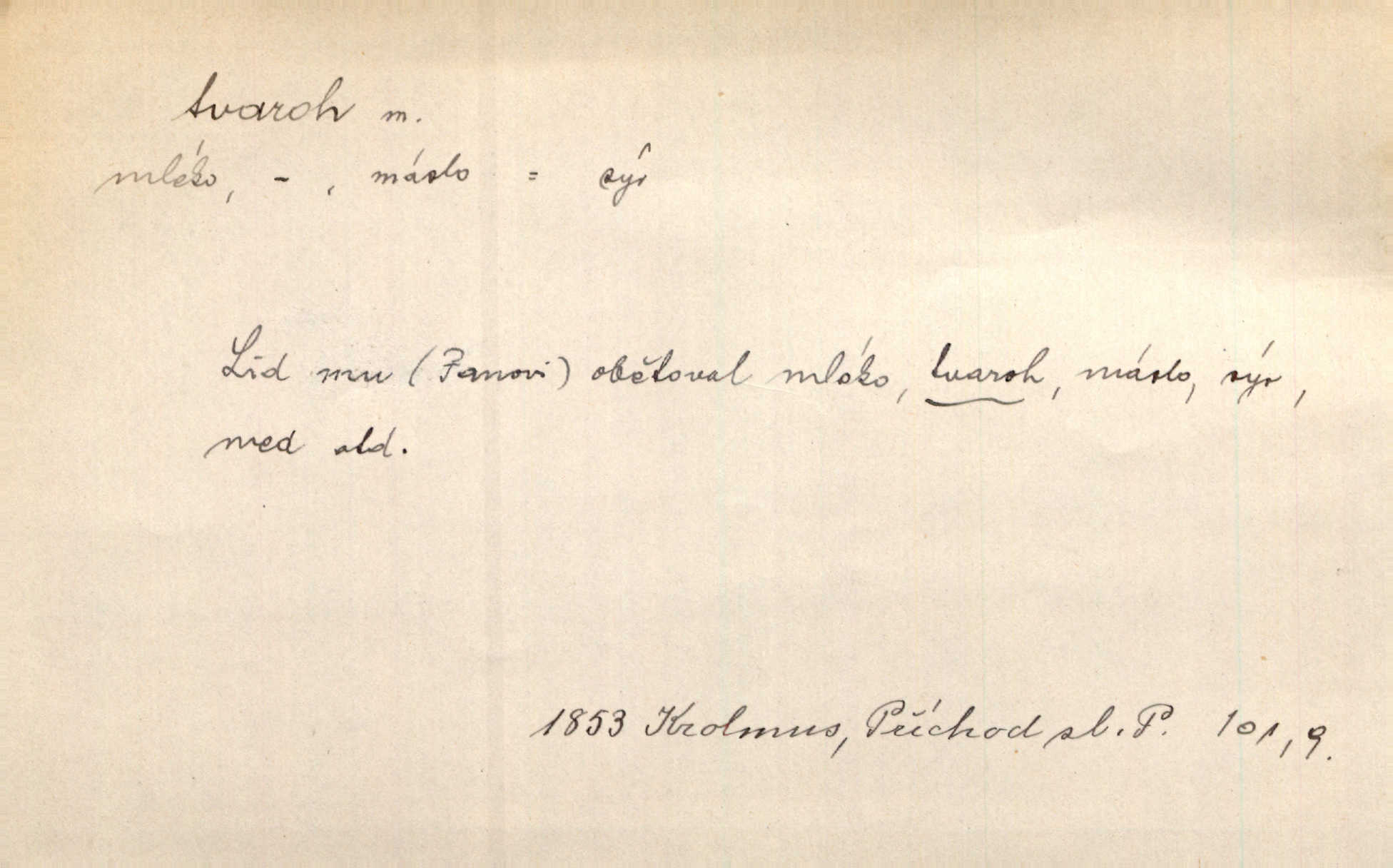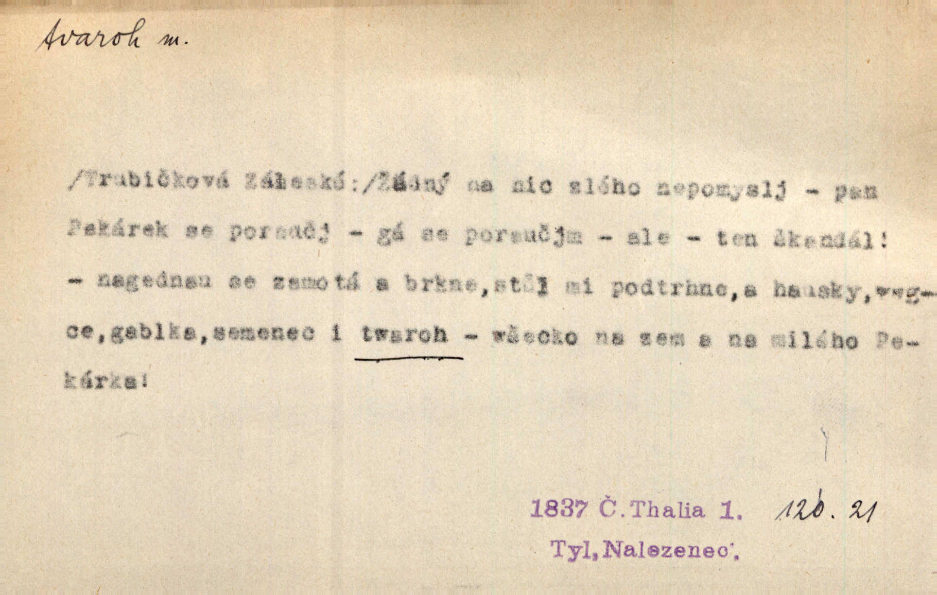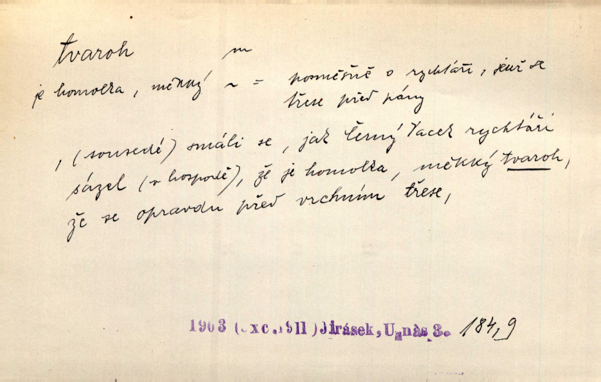 - tvaroh, -u m. mléčný výrobek, vzniklý sražením kaseinu. Já jsem ti schoval kousek tvarohu. Pfleg. Vyklopila hrnek zemčat na loupačku, k nim tvaroh mlékem rozdělaný. Herrm. Bývají děti podělovány vdolky a netyjí posýpanou tvarohem. Preis. Ubledne, jako by byla z tvarohu. Tyl. Styděli se [dělníci] všichni, ačkoli nebyli také zrovna z tvarohu příliš citliví. Čap. Ch. Poslali výra pro kus sýra, on přinesl tvaroh hloupému svěřili poslání. Čel. Přen. Máš-li peněz dost a tvaroh v mozku svém, také uplatníš se na té pouti zdejší. Mach.