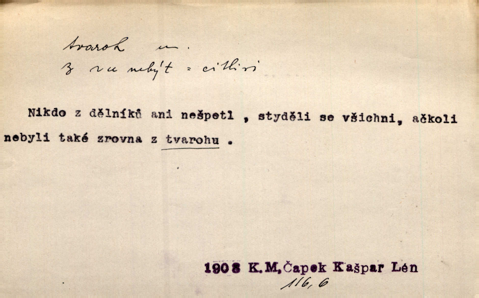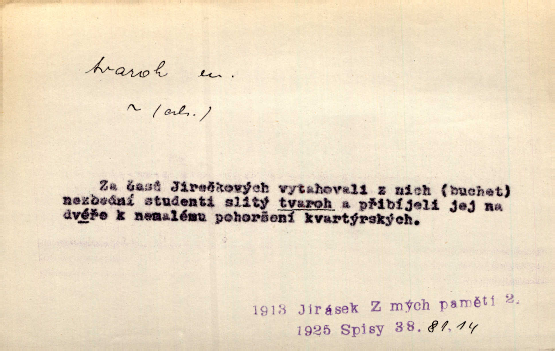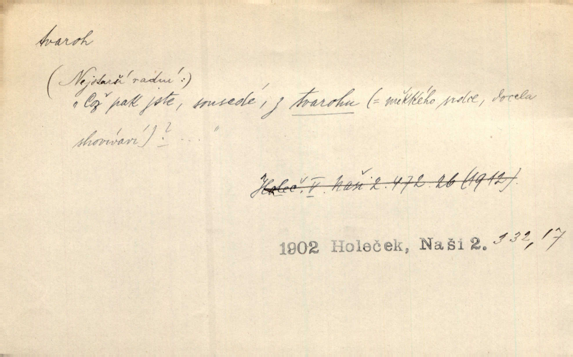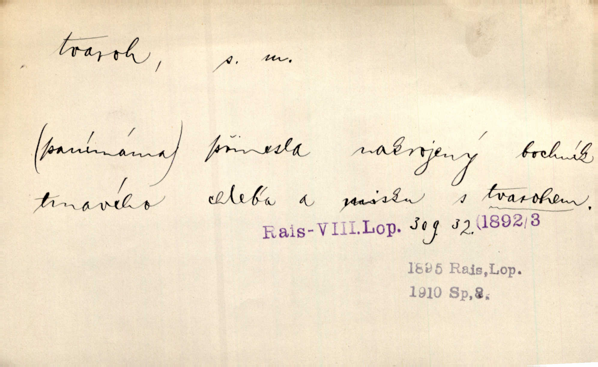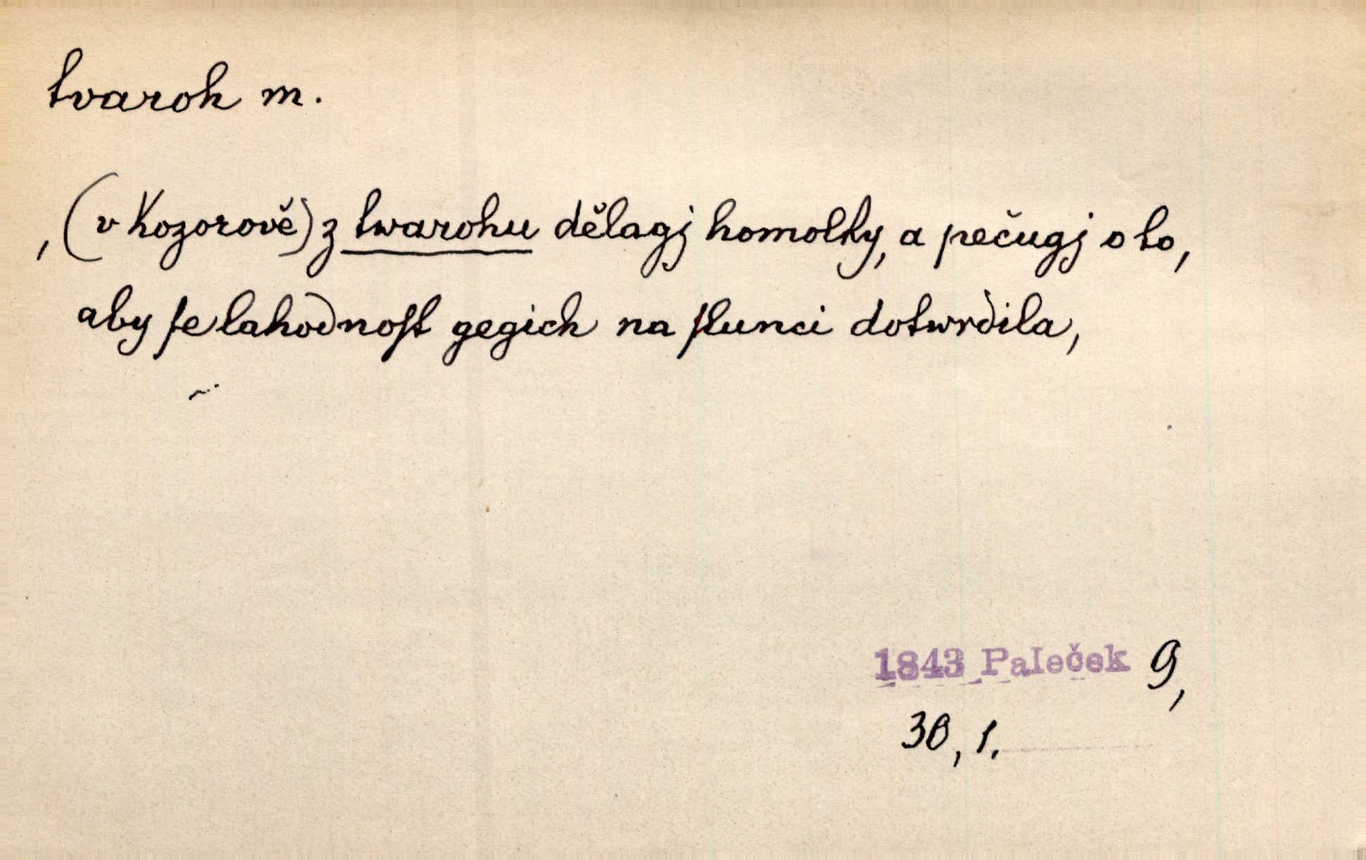 - tvaroh, -u m. mléčný výrobek, vzniklý sražením kaseinu. Já jsem ti schoval kousek tvarohu. Pfleg. Vyklopila hrnek zemčat na loupačku, k nim tvaroh mlékem rozdělaný. Herrm. Bývají děti podělovány vdolky a netyjí posýpanou tvarohem. Preis. Ubledne, jako by byla z tvarohu. Tyl. Styděli se [dělníci] všichni, ačkoli nebyli také zrovna z tvarohu příliš citliví. Čap. Ch. Poslali výra pro kus sýra, on přinesl tvaroh hloupému svěřili poslání. Čel. Přen. Máš-li peněz dost a tvaroh v mozku svém, také uplatníš se na té pouti zdejší. Mach.