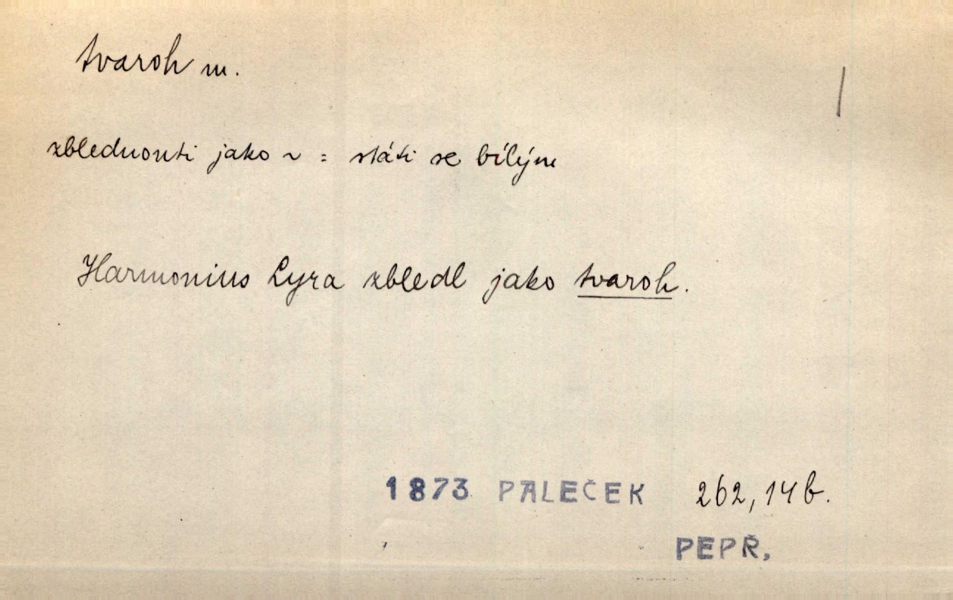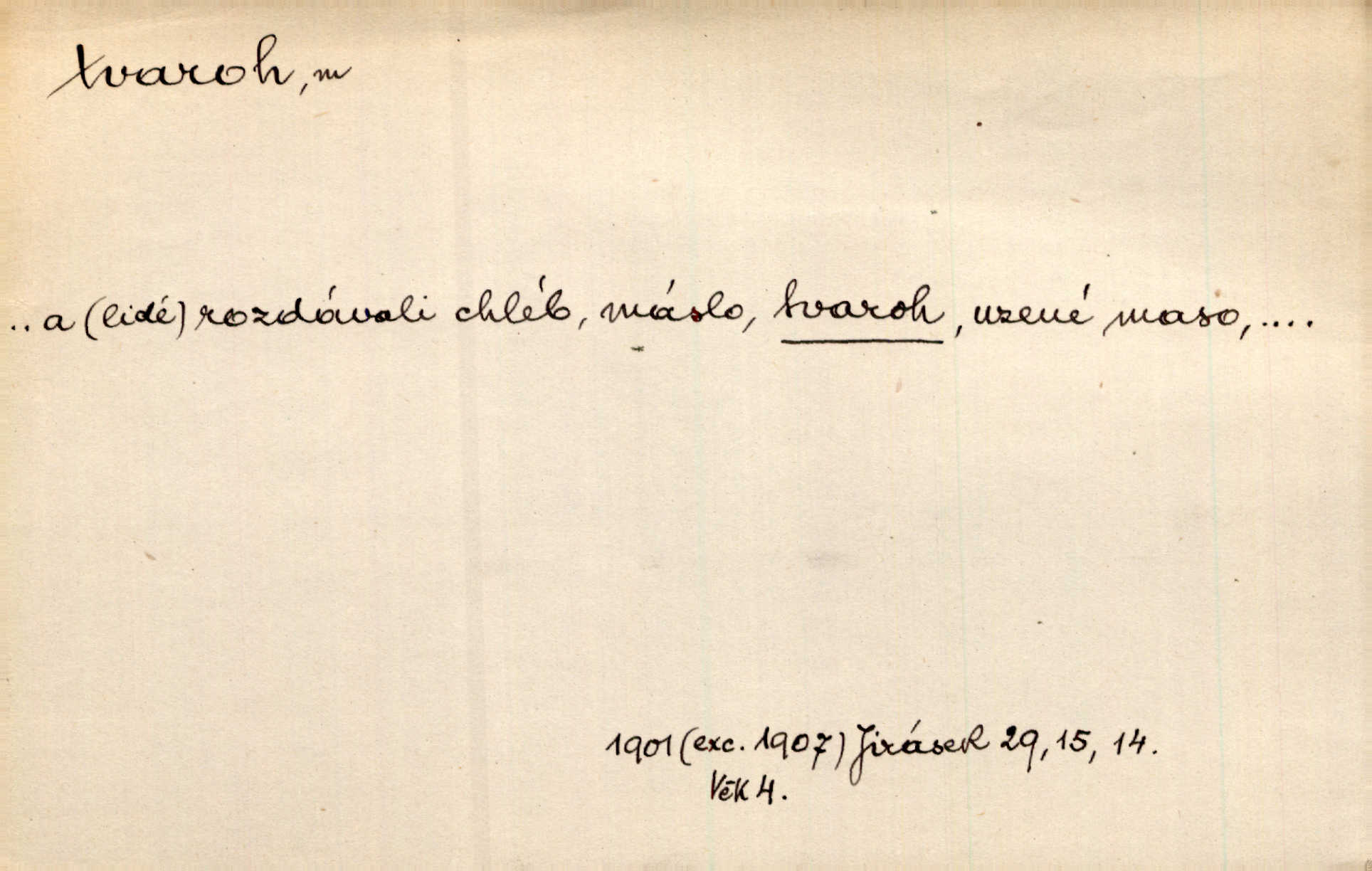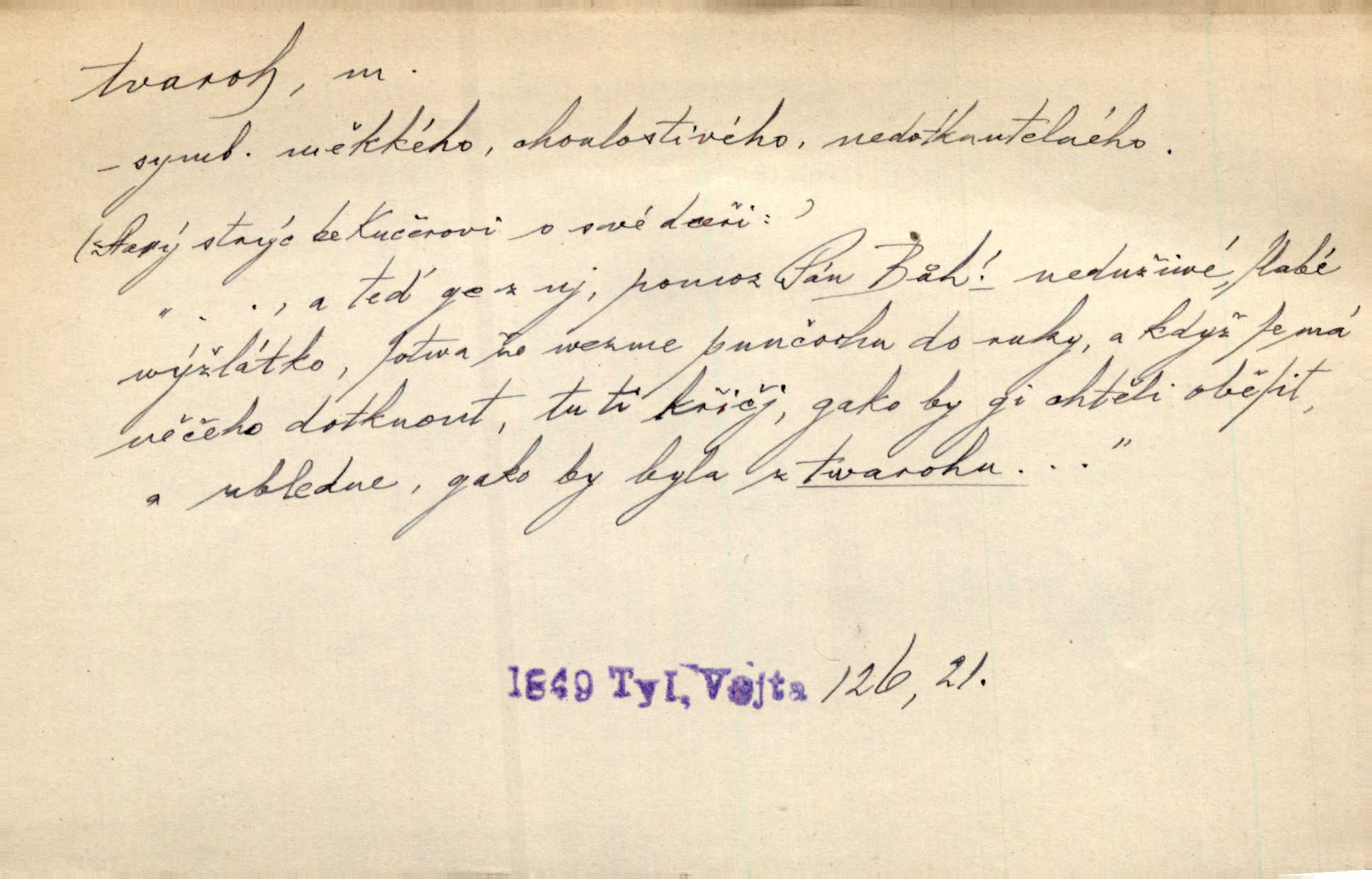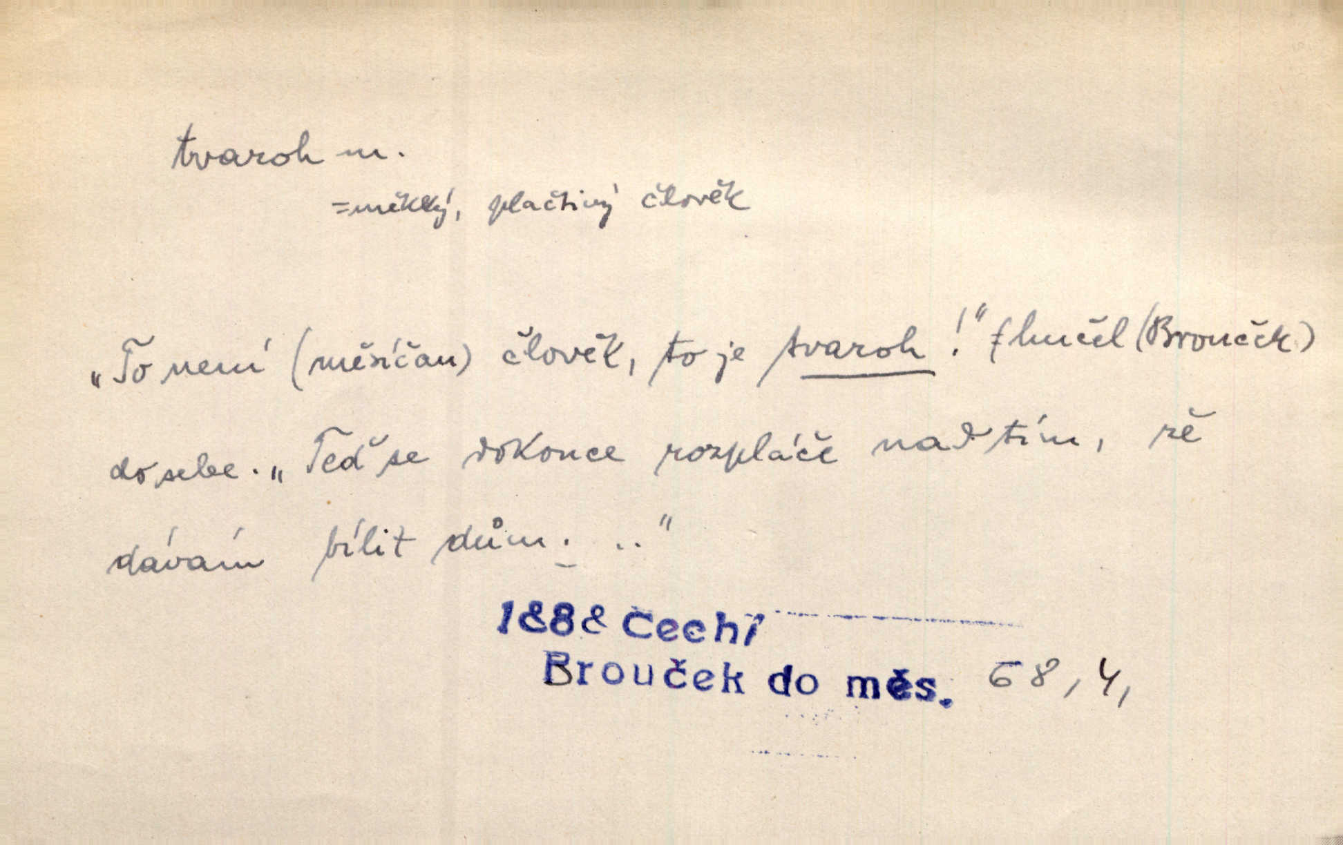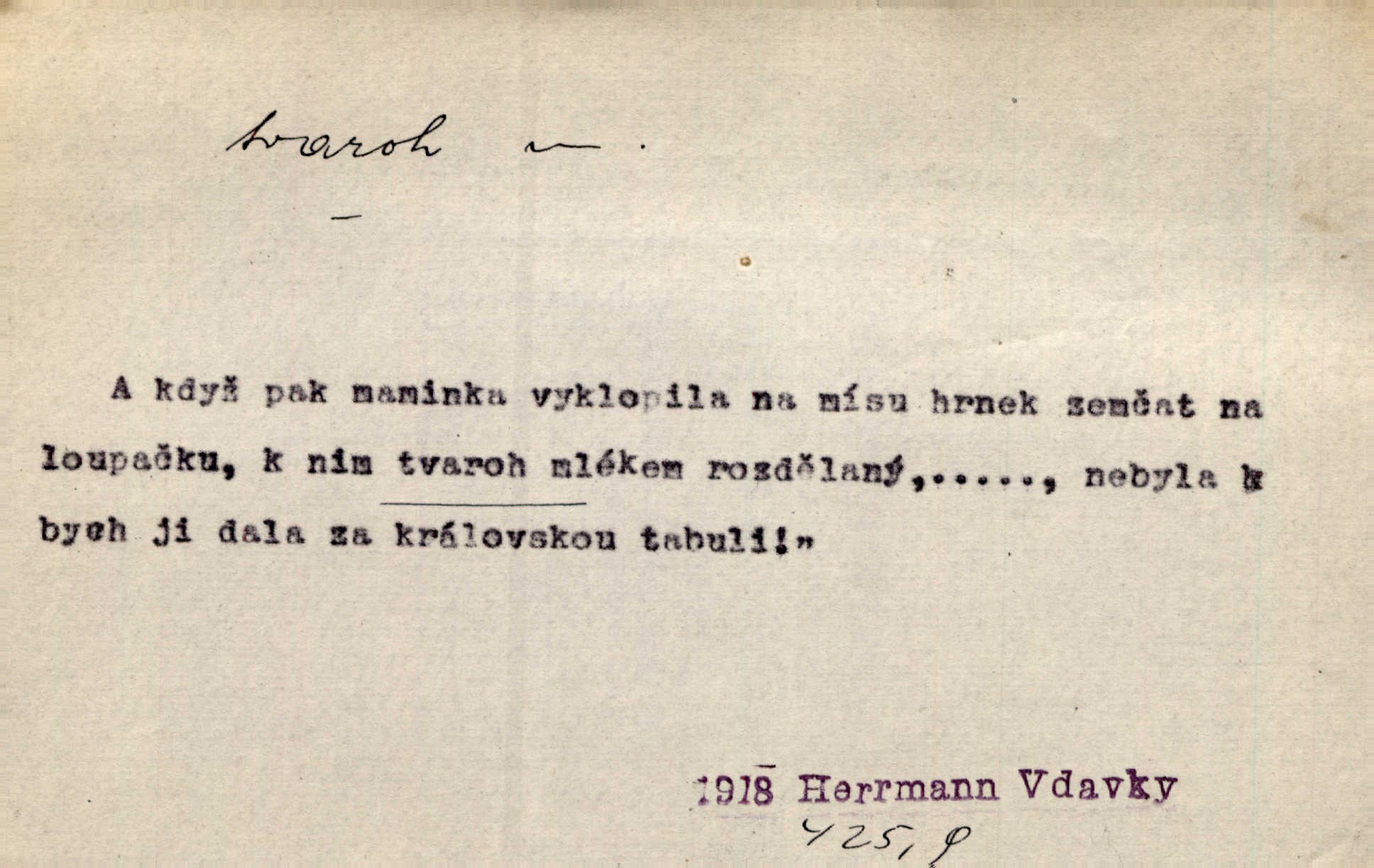 - tvaroh, -u m. mléčný výrobek, vzniklý sražením kaseinu. Já jsem ti schoval kousek tvarohu. Pfleg. Vyklopila hrnek zemčat na loupačku, k nim tvaroh mlékem rozdělaný. Herrm. Bývají děti podělovány vdolky a netyjí posýpanou tvarohem. Preis. Ubledne, jako by byla z tvarohu. Tyl. Styděli se [dělníci] všichni, ačkoli nebyli také zrovna z tvarohu příliš citliví. Čap. Ch. Poslali výra pro kus sýra, on přinesl tvaroh hloupému svěřili poslání. Čel. Přen. Máš-li peněz dost a tvaroh v mozku svém, také uplatníš se na té pouti zdejší. Mach.