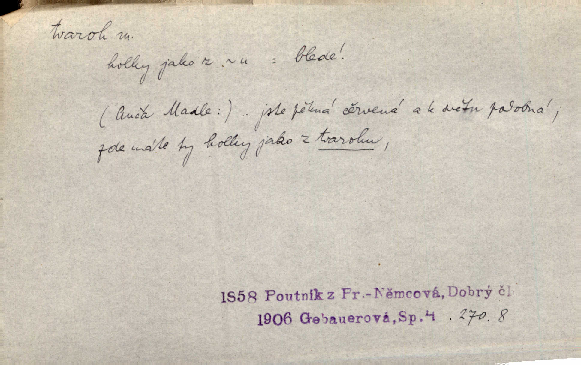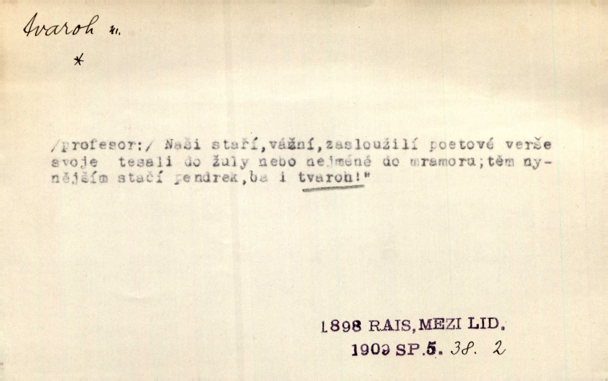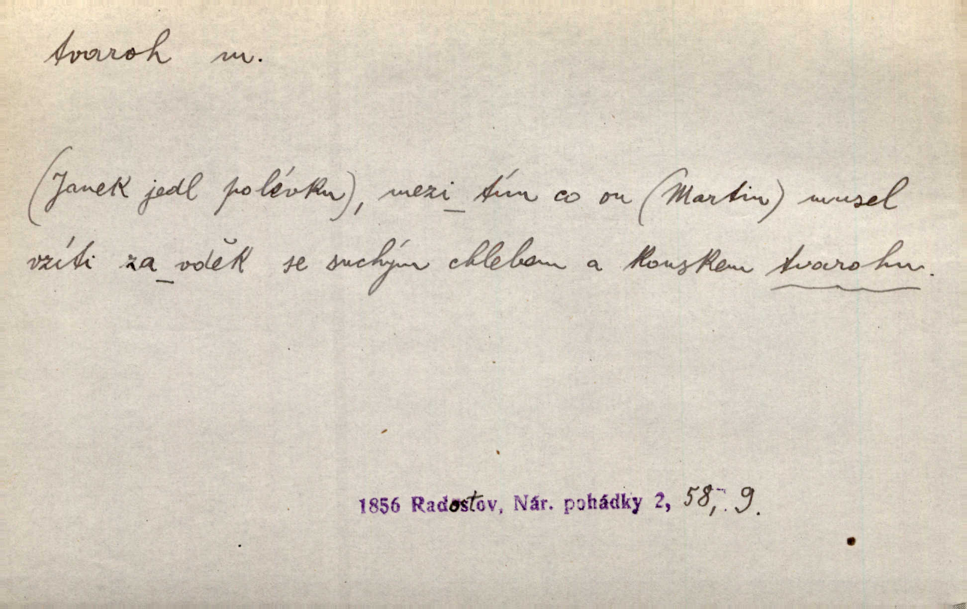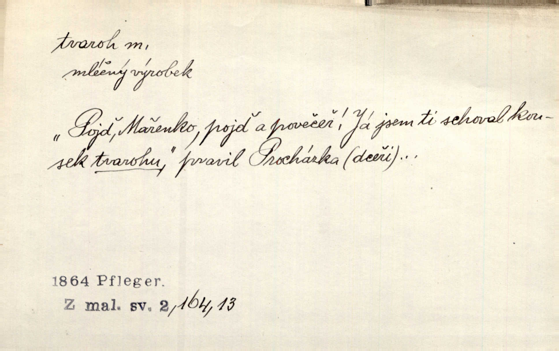 - tvaroh, -u m. mléčný výrobek, vzniklý sražením kaseinu. Já jsem ti schoval kousek tvarohu. Pfleg. Vyklopila hrnek zemčat na loupačku, k nim tvaroh mlékem rozdělaný. Herrm. Bývají děti podělovány vdolky a netyjí posýpanou tvarohem. Preis. Ubledne, jako by byla z tvarohu. Tyl. Styděli se [dělníci] všichni, ačkoli nebyli také zrovna z tvarohu příliš citliví. Čap. Ch. Poslali výra pro kus sýra, on přinesl tvaroh hloupému svěřili poslání. Čel. Přen. Máš-li peněz dost a tvaroh v mozku svém, také uplatníš se na té pouti zdejší. Mach.