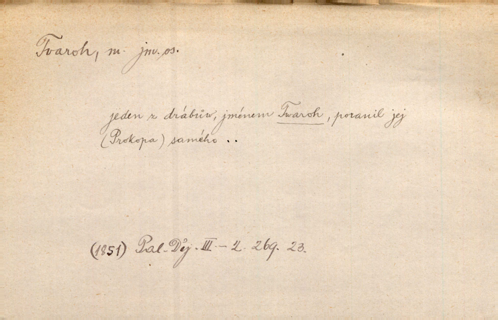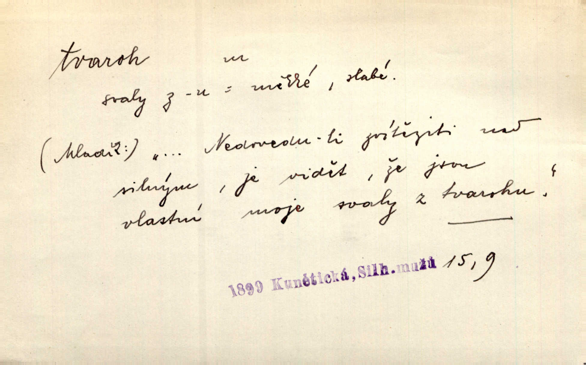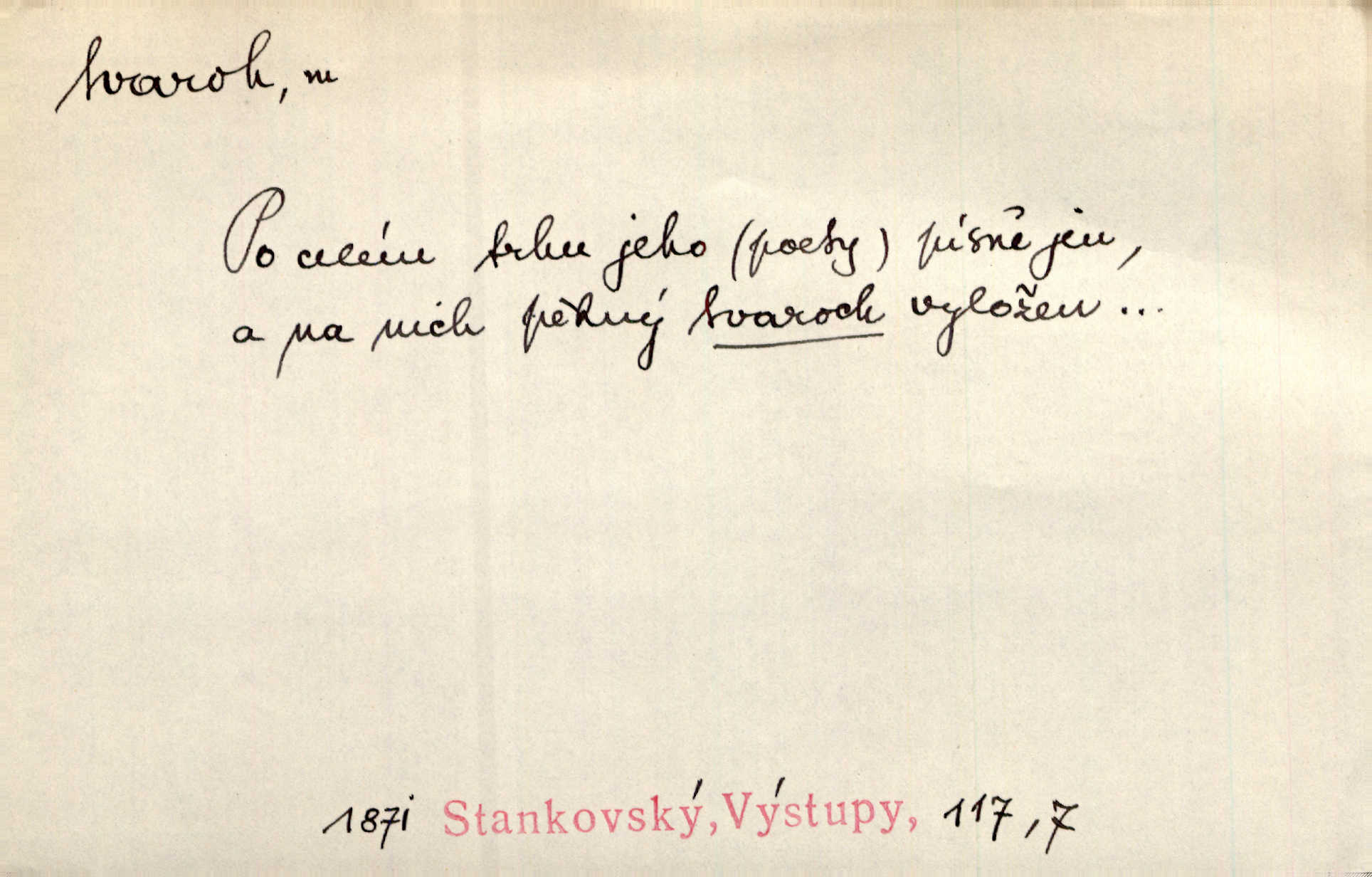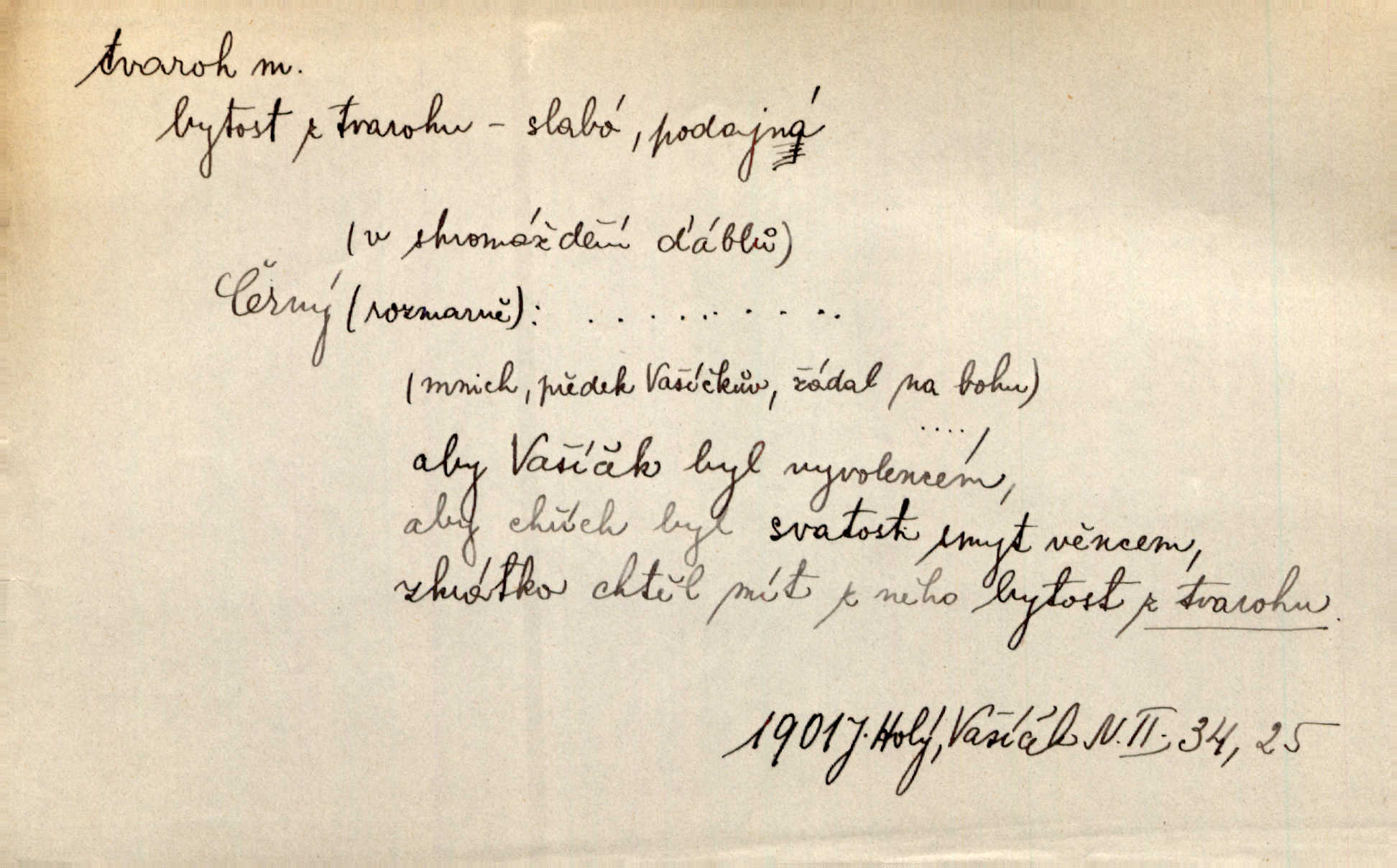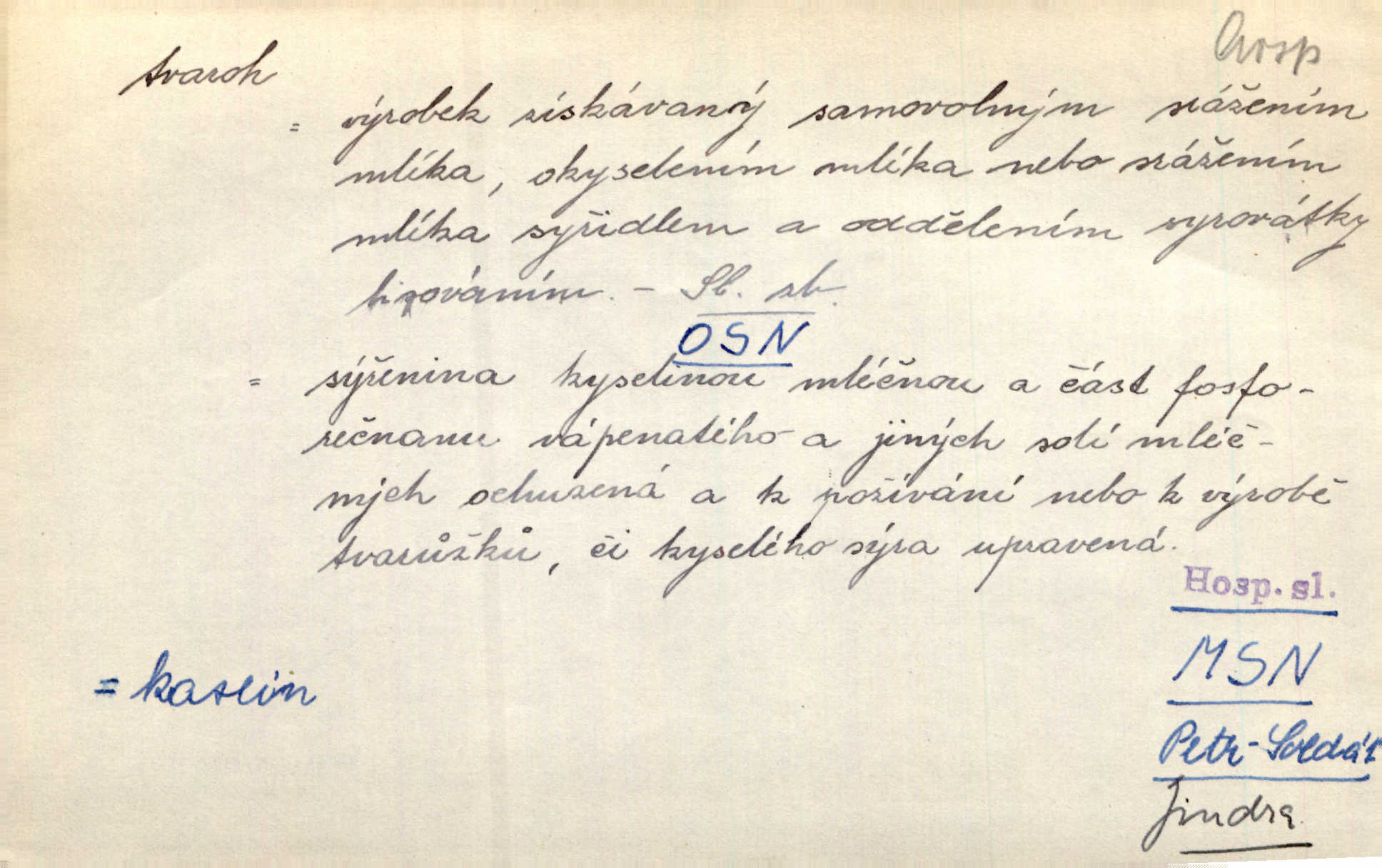 - tvaroh, -u m. mléčný výrobek, vzniklý sražením kaseinu. Já jsem ti schoval kousek tvarohu. Pfleg. Vyklopila hrnek zemčat na loupačku, k nim tvaroh mlékem rozdělaný. Herrm. Bývají děti podělovány vdolky a netyjí posýpanou tvarohem. Preis. Ubledne, jako by byla z tvarohu. Tyl. Styděli se [dělníci] všichni, ačkoli nebyli také zrovna z tvarohu příliš citliví. Čap. Ch. Poslali výra pro kus sýra, on přinesl tvaroh hloupému svěřili poslání. Čel. Přen. Máš-li peněz dost a tvaroh v mozku svém, také uplatníš se na té pouti zdejší. Mach.