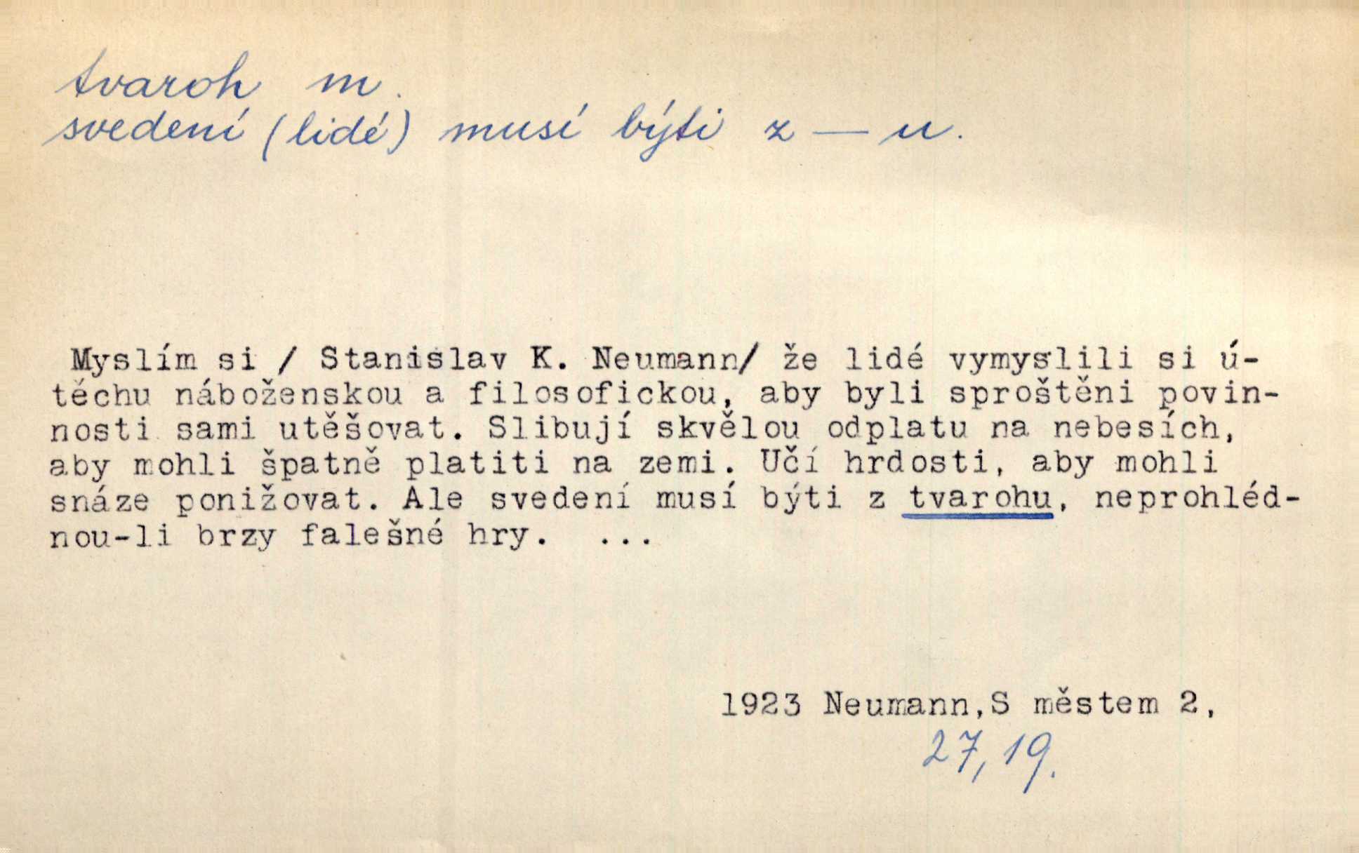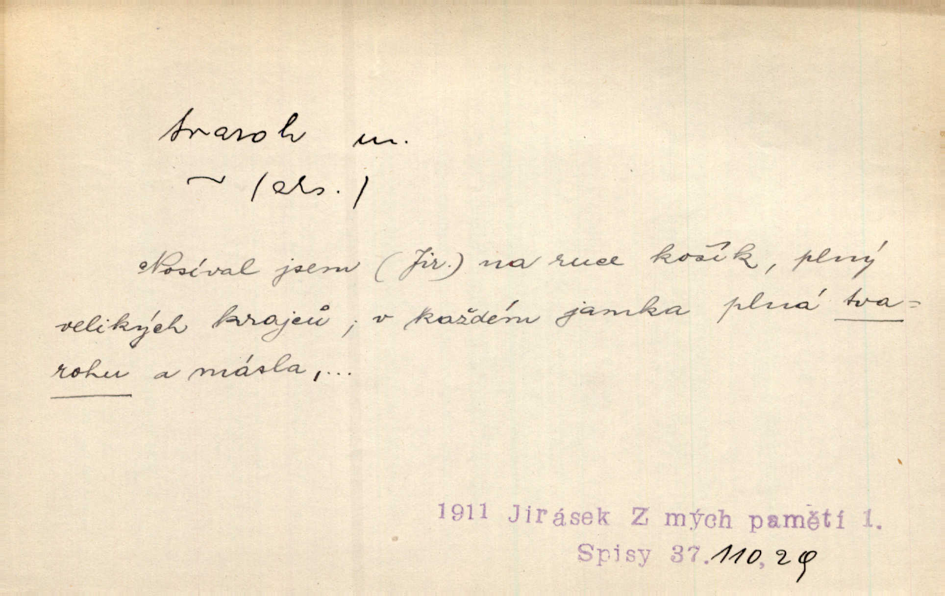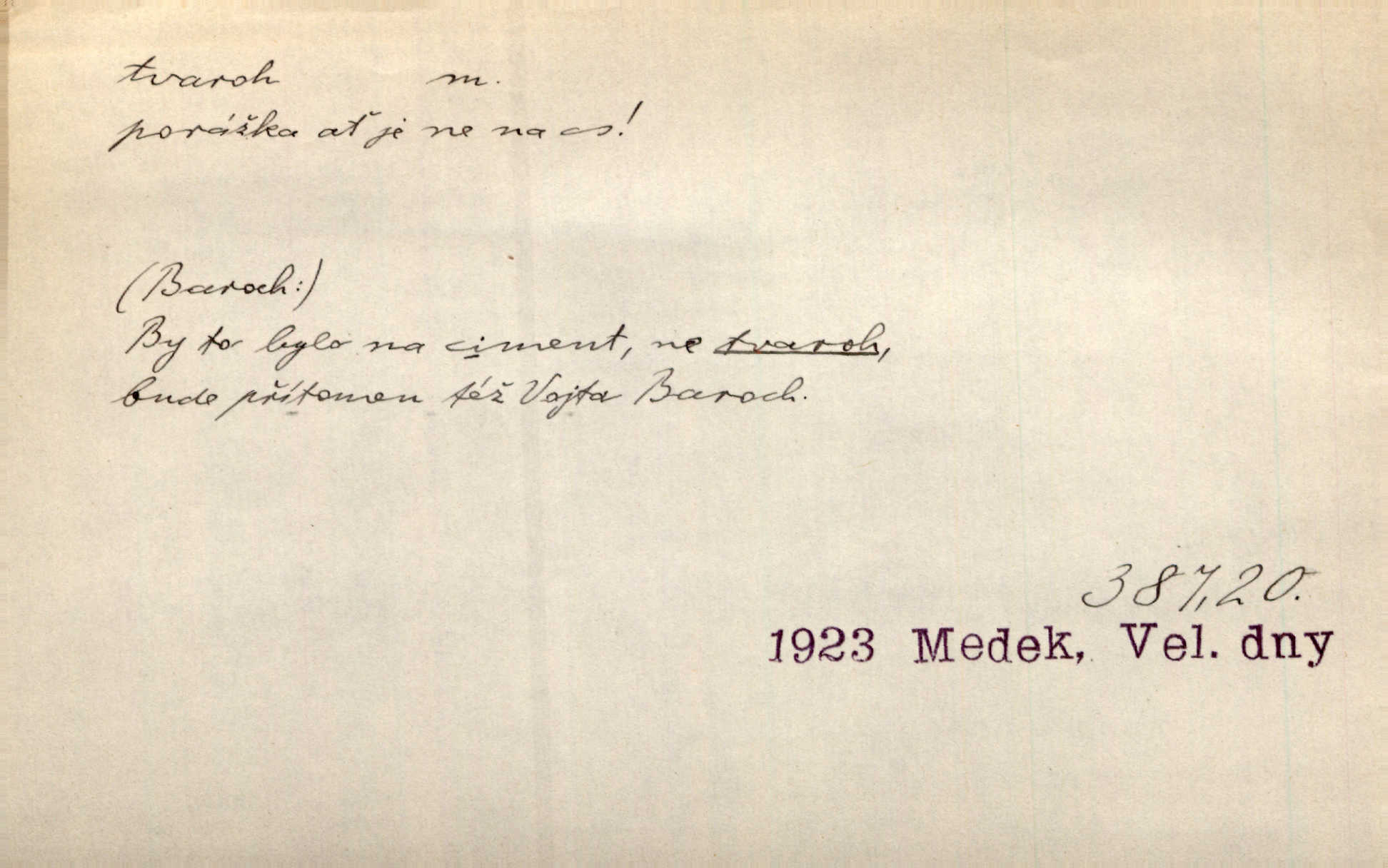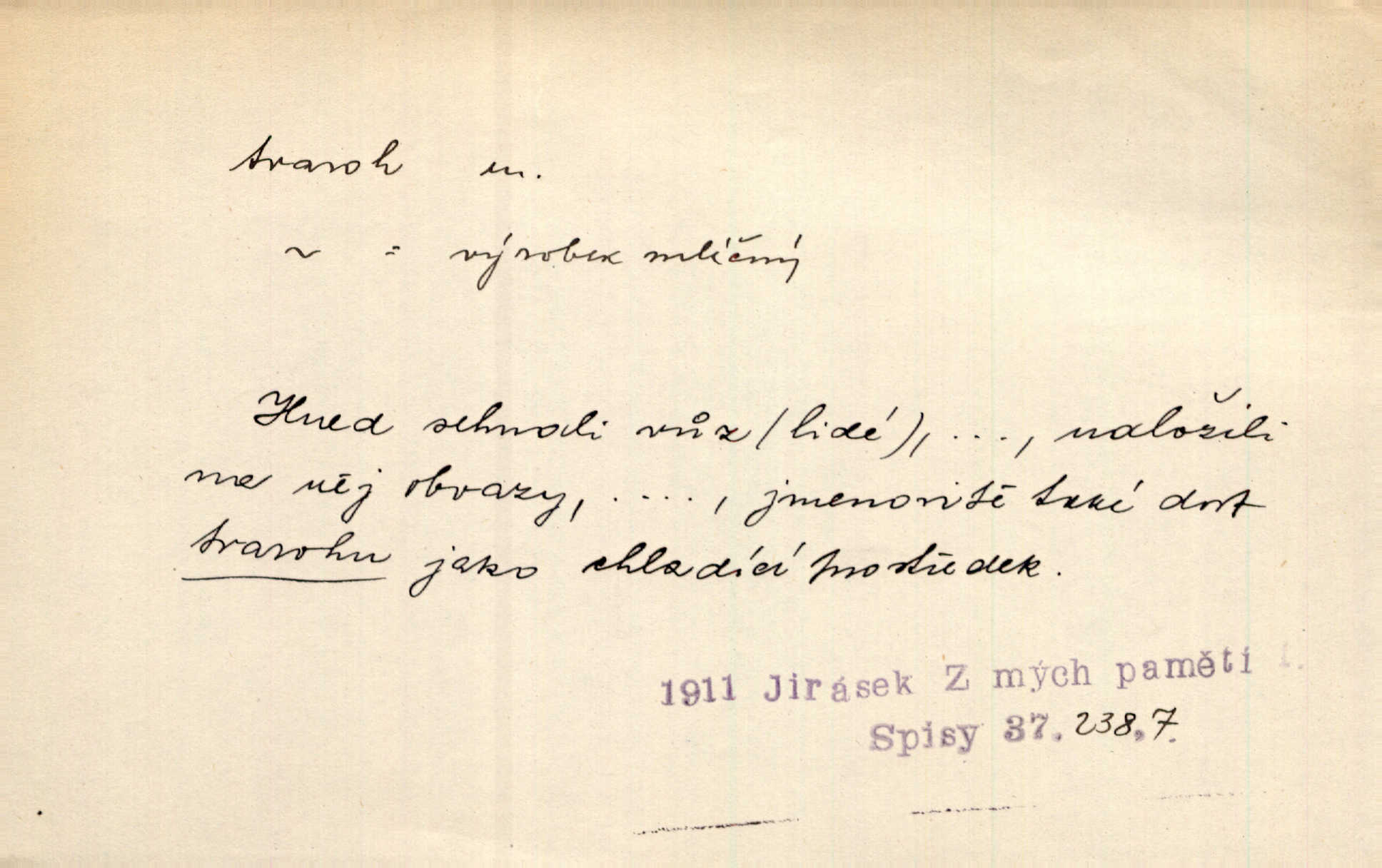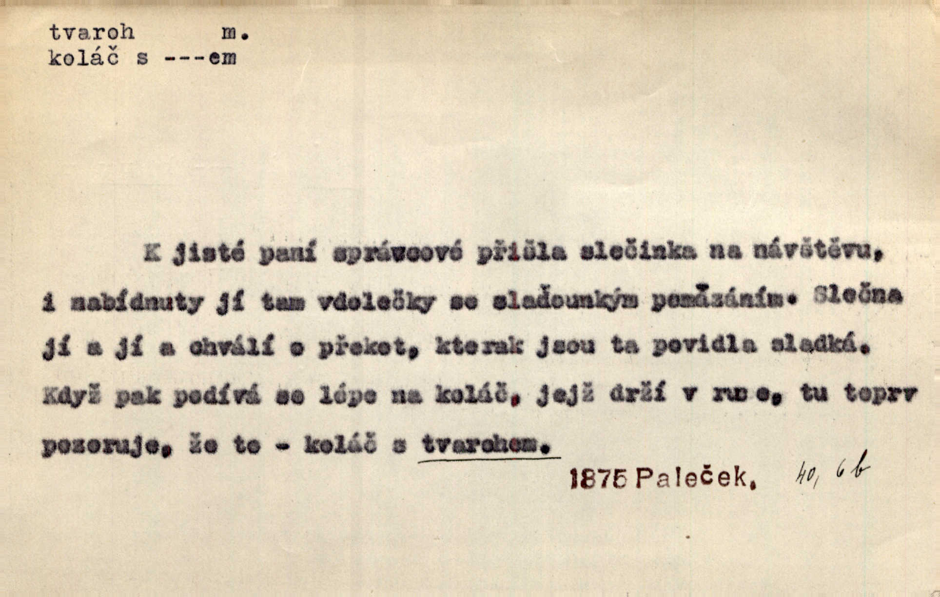 - tvaroh, -u m. mléčný výrobek, vzniklý sražením kaseinu. Já jsem ti schoval kousek tvarohu. Pfleg. Vyklopila hrnek zemčat na loupačku, k nim tvaroh mlékem rozdělaný. Herrm. Bývají děti podělovány vdolky a netyjí posýpanou tvarohem. Preis. Ubledne, jako by byla z tvarohu. Tyl. Styděli se [dělníci] všichni, ačkoli nebyli také zrovna z tvarohu příliš citliví. Čap. Ch. Poslali výra pro kus sýra, on přinesl tvaroh hloupému svěřili poslání. Čel. Přen. Máš-li peněz dost a tvaroh v mozku svém, také uplatníš se na té pouti zdejší. Mach.