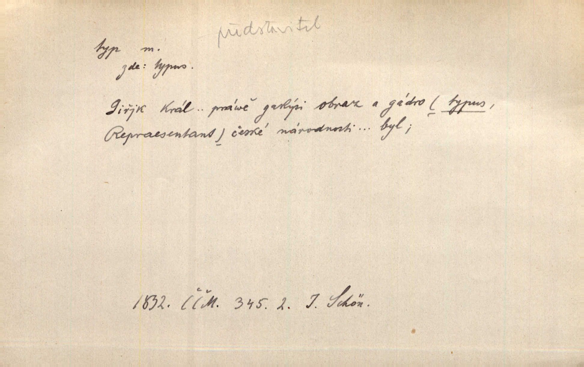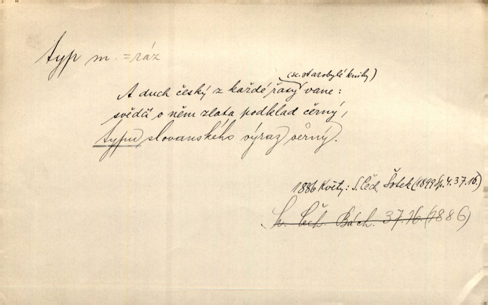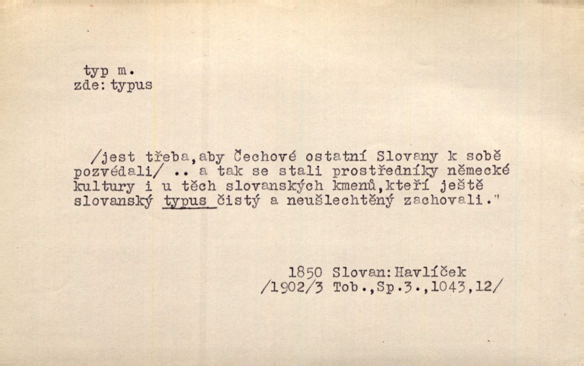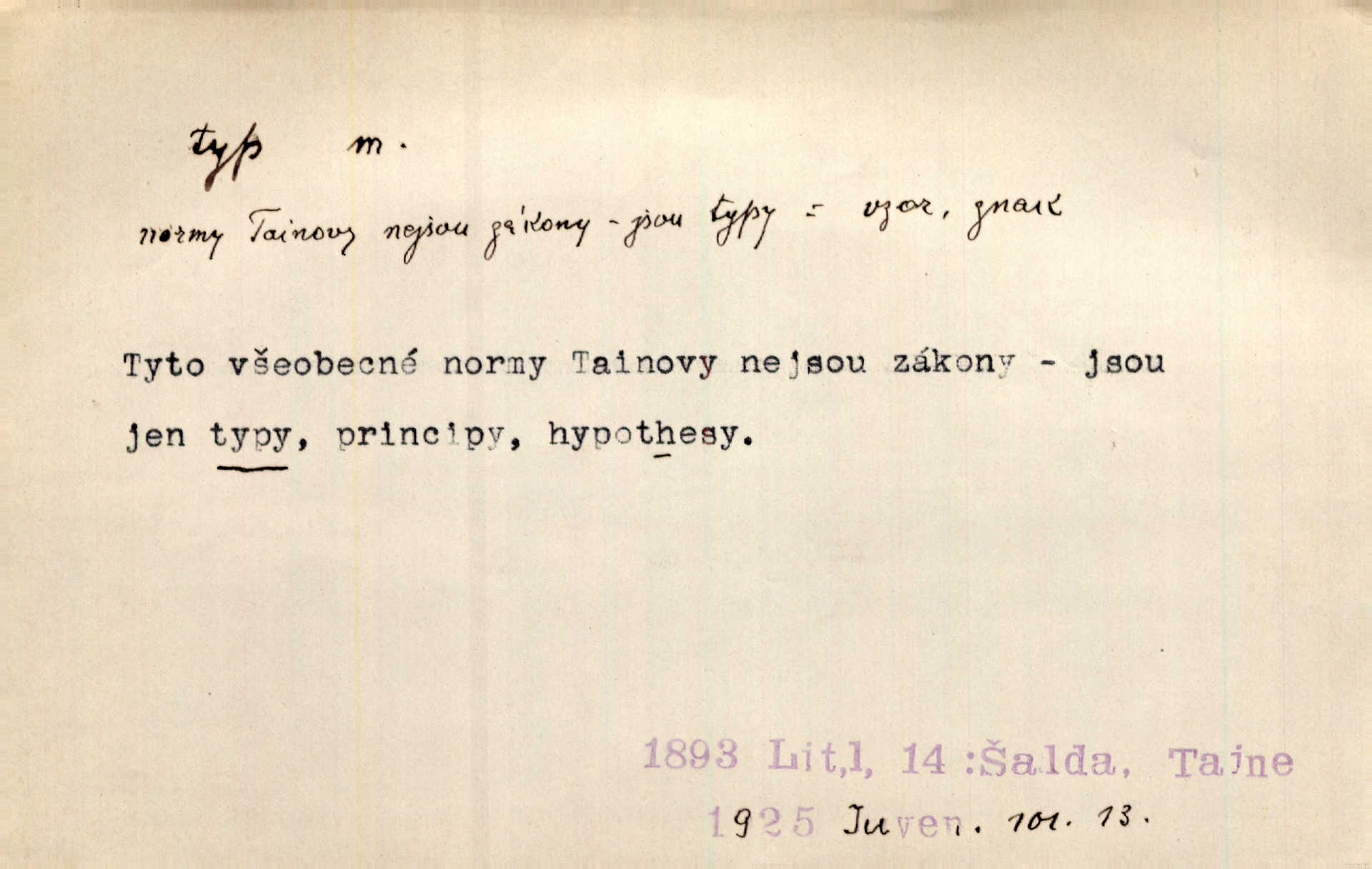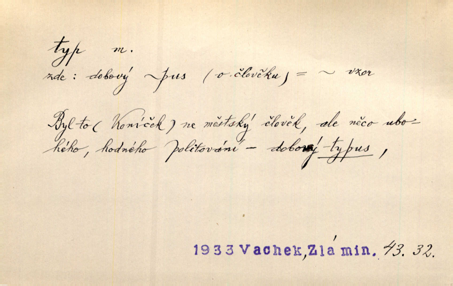 - typ, -u (zř. a zast. typus, -pu) m. vzor, příklad, zvl. postava soustreďující na sobě charakteristické vlastnosti celé skupiny lidí; ustálená představa o někom n. o něčem, obraz, ideál. Dělnická třída zřizuje nový typ státu — socialistický sovětský stát. Dějiny VKS(b)-J. Proch. Ricardovo učení nám ukazuje nemilosrdně celou anglickou buržoasii, která sama je zase typem moderní buržoasie. Marx-Blochová. Kdo by neviděl český typ v dobrém člověku B. Němcové, tak překrásně vylíčeném? Z. Nej. To [Brumovčák] je typ zatvrzelého, nedůvěřivého sedláka. Herb. Nebyl to [drátař] romanticky zidealisovaný typ, ale dobrý, nezkažený člověk. Šlej. Hledajíc mezi lidem tamějším typy, v nichž by se mravný, náboženský a socialní ráz doby jejich nejjasněji zobrazil, zpomněla jsem si ovšem na onu vdovu. Svět. Z houslistů nejvíce slynul dřevičský učitel Morávek, typ starého kantora. Jir. Ve vlastenectví rostl v nás čistě náš národně čestný typ a není vinou ideje, že se v polou vývoje zvrhl v typ odporný. V. Mrš. On [Michelangelo] zavrhl i všechny běžné typy náboženské. Ner. Elis, statný padesátník. V masce ustálený typ malířský. Šim. Byla zkrátka jeho typ. Schein. Přenesla svoji lásku a vášeň na svůj „typ“‚ který dostala na fotografii. Mah. Kramerius stvořil typ populární dobré češtiny knihové. J. Vlč. Za těchto mých hradeckých let ustálil se typ hladké čamary s ležatým límcem model. Jir. Filos. základní tvar, který má jisté podstatné znaky, společné všem členům nějaké skupiny, typus. Člen takové skupiny (jedinec n. věc), u kterého se všechny tyto znaky zřetelně projevují, pravzor, vzor, příklad. Biol. jedinec, který je nejvýstižnějším vzorem své skupiny (druhu, rodu, čeledi a p.) a podle něhož byla popsána, typus. Lit. představitel celého druhu skutečných osob ze života, nositel rysů pro celou onu skupinu společných. Burs. kapit. stálý vzorek zastupitelského zboží, uložený na burse. Cenný papír, který si spekulanti vyhlédli za předmět své spekulace a pro který dělají náladu. Sport. tip. D skupina jedinců n. věcí vyznačujících se stejnými základními, charakteristickými znaky, druh. Jakož si pisatel už dříve dovolil o některých typech našich národních promluviti, tak chystá se i dnes mluviti o českých kramářích. Thom. Trochu připomíná šoféra při bláznivé jízdě, a já takový typ nemám ráda. Ben. Estétové typu Anatola France psali o antice jako o zmizelém světu krásy. Lit. noviny. Bylo to ohromné zvíře [pes] typu foundlandského. Čap. Ch. Takové skupině [jevů shodujících se ve vlastnostech podstatných] říkáme druh (species) nebo typ. Chalup. Kdo ručí za to, že zítra se neobjeví epochální vynález, nový „typ“ flinty, děla, náboje? model, tvar. Herrm. Černaly se mu v hlavě drobné typy písmenek, seskupene v houfy: odstavce, články a knihy litery. Baar. Tak bývá zpravidla nominativ doplňkem v ustáleném typu neslovesných vět „mladost — radost“. Ertl. Zavádění nových typů středoškolských děje se jen nařízením. Čes. pol. Přijali jsme [v JZD] provozní řád třetího typu, který podepsali a schválili všichni zemědělci u nás. R. právo. Filol. typ jazyka aglutinační, flexivní a j. Zool. a bot. kmen, typus. Meteor. typ klimatický, podnební vyznačující se jistými společnými znaky bez zřetele k rozdílům způsobeným zeměpisnou šířkou. Typ přímořský, pevninský, horský a j. Pedol. půdní typ půda s vývojově zákonitě uspořádaným průrezem. Tech., výr. výrobek obyč. nějak označený (názvem, číslem, písmenem), který má s jinými výrobky stejně označenými jisté význačné znaky a vlastnosti společné, typa. Typ. čtyřboký pravoúhlý hranol nesoucí na svrchní straně vyvýšený a převrácený obraz písmena, litera; druh písma tištěného, ale i psaného, kresleného. D způsob, ráz, sloh. Vyhnáním menševiků byla vytvořena strana nového typu — strana bolševická. Ml. fronta. Takovýmto předvojem, bojovým štábem dělnické třídy je strana, revoluční strana leninského typu — komunistická strana. R. právo. Přídavná jména na -itý jsou příkladem nového typu tvoření. Havr. Podle celého typu jeviště byl to spolek kočovnický. Řezn. Madonna [strakonického chrámu] náleží dle typu svého do poslední čtvrti 14. století. Světozor. Charaktery [ve „Dvou umělcích“] podrobí se rozdílným změnám přirozeným i neodporujícím předce jejich základnímu typu. Ner. Jako Verdi, Brahms představují hudební typ svého národa, tak zase náš Smetana zní ryze česky. Lit. noviny. D rysy, podoba tváře, zjev, postava člověka vyjádřená tělesnými znaky. Od těch dob, co přišly francouzské gardy až do Moskvy a kozáci do Paříže, spletly se poněkud typy v tvářích evropských národů. Ner. Nosila na odiv přespříliš vyslovený rodový typ, monumentální šeredu zdravím kypící tváře. Čap. Ch. [Někteří slovanští kmenové] ještě slovanský typus čistý zachovali. Havl. Chlapec [Michal] patří k svalovému typu. John. Pro svůj hezký jižní typ se teta Lola líbila důstojníkům. John. Namaloval asi 1000 podobizen, z nichž asi pětina představuje typy maorské. Koř. Svou pečlivě oholenou tváří bez knírů připomínal starodávné typy hrabat. V. Mrš. Obraznost Mikuláškova malovala si postavy vojáků, které se později vytvářily v karakteristické typy vojenské, čistě Alšovské. Herrm. Anthrop. převládající disposice fysická, psychická n. psychofysická, kterou se vyznačuje druh lidí, od ostatních sice přesně ohraničený, ale v svém způsobu stálý. Typ atletický, pyknický, pozornostní, optický a j. typus. Sport. sportovní typ soubor tělesných z