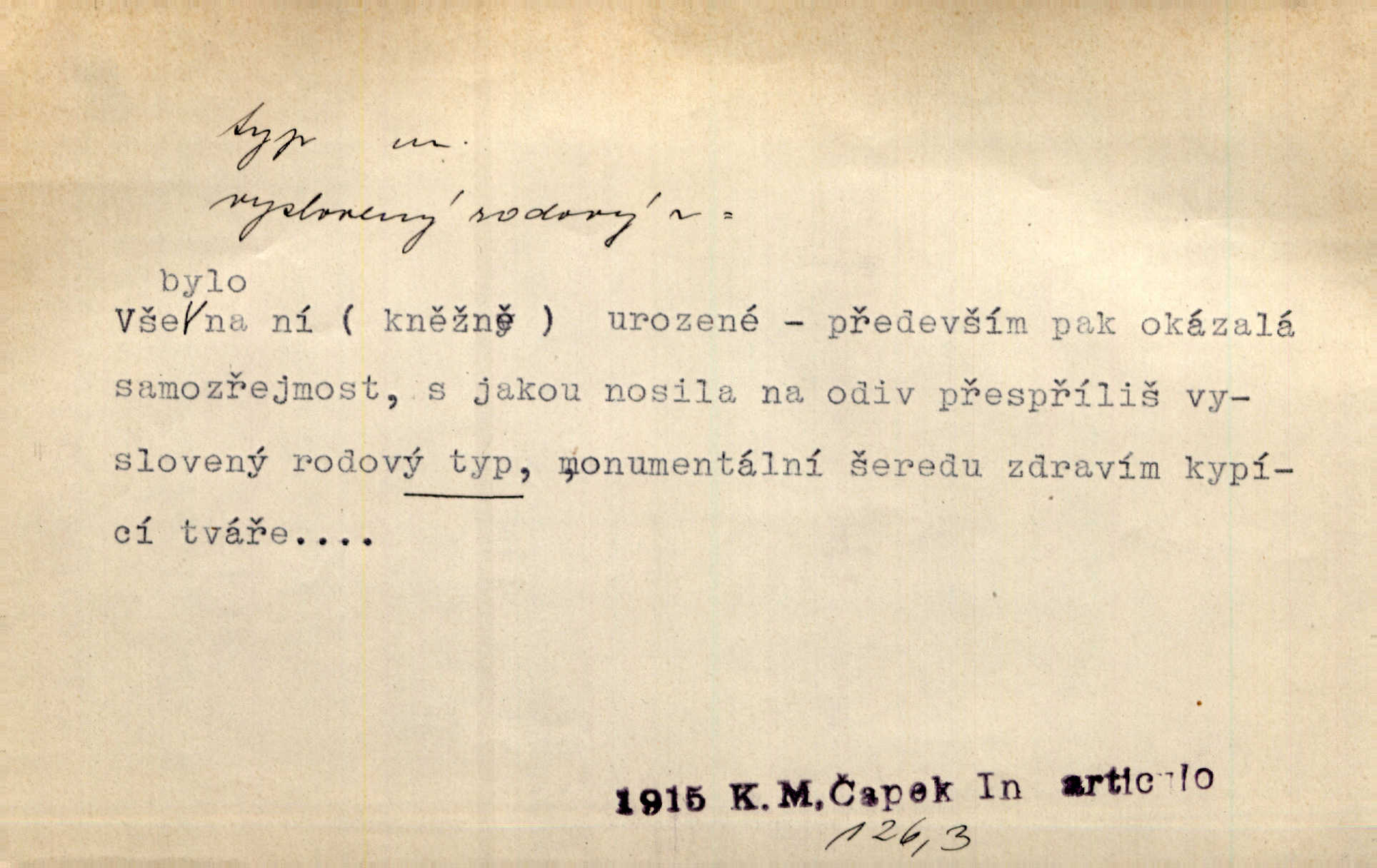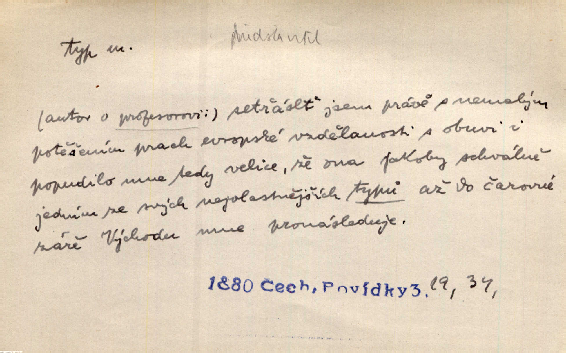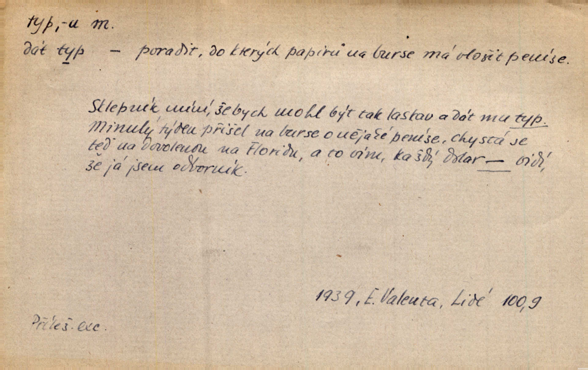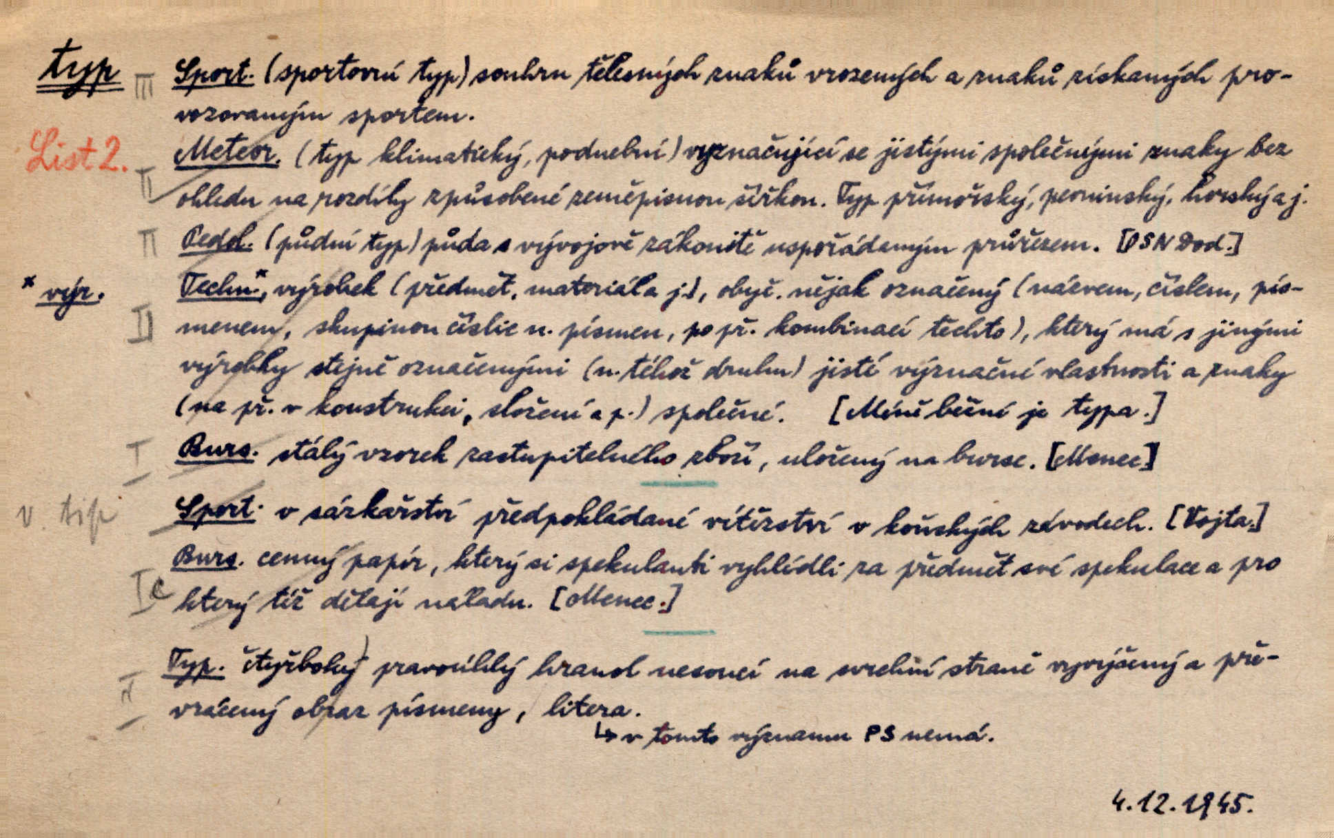 - typ, -u (zř. a zast. typus, -pu) m. vzor, příklad, zvl. postava soustreďující na sobě charakteristické vlastnosti celé skupiny lidí; ustálená představa o někom n. o něčem, obraz, ideál. Dělnická třída zřizuje nový typ státu — socialistický sovětský stát. Dějiny VKS(b)-J. Proch. Ricardovo učení nám ukazuje nemilosrdně celou anglickou buržoasii, která sama je zase typem moderní buržoasie. Marx-Blochová. Kdo by neviděl český typ v dobrém člověku B. Němcové, tak překrásně vylíčeném? Z. Nej. To [Brumovčák] je typ zatvrzelého, nedůvěřivého sedláka. Herb. Nebyl to [drátař] romanticky zidealisovaný typ, ale dobrý, nezkažený člověk. Šlej. Hledajíc mezi lidem tamějším typy, v nichž by se mravný, náboženský a socialní ráz doby jejich nejjasněji zobrazil, zpomněla jsem si ovšem na onu vdovu. Svět. Z houslistů nejvíce slynul dřevičský učitel Morávek, typ starého kantora. Jir. Ve vlastenectví rostl v nás čistě náš národně čestný typ a není vinou ideje, že se v polou vývoje zvrhl v typ odporný. V. Mrš. On [Michelangelo] zavrhl i všechny běžné typy náboženské. Ner. Elis, statný padesátník. V masce ustálený typ malířský. Šim. Byla zkrátka jeho typ. Schein. Přenesla svoji lásku a vášeň na svůj „typ“‚ který dostala na fotografii. Mah. Kramerius stvořil typ populární dobré češtiny knihové. J. Vlč. Za těchto mých hradeckých let ustálil se typ hladké čamary s ležatým límcem model. Jir. Filos. základní tvar, který má jisté podstatné znaky, společné všem členům nějaké skupiny, typus. Člen takové skupiny (jedinec n. věc), u kterého se všechny tyto znaky zřetelně projevují, pravzor, vzor, příklad. Biol. jedinec, který je nejvýstižnějším vzorem své skupiny (druhu, rodu, čeledi a p.) a podle něhož byla popsána, typus. Lit. představitel celého druhu skutečných osob ze života, nositel rysů pro celou onu skupinu společných. Burs. kapit. stálý vzorek zastupitelského zboží, uložený na burse. Cenný papír, který si spekulanti vyhlédli za předmět své spekulace a pro který dělají náladu. Sport. tip. D skupina jedinců n. věcí vyznačujících se stejnými základními, charakteristickými znaky, druh. Jakož si pisatel už dříve dovolil o některých typech našich národních promluviti, tak chystá se i dnes mluviti o českých kramářích. Thom. Trochu připomíná šoféra při bláznivé jízdě, a já takový typ nemám ráda. Ben. Estétové typu Anatola France psali o antice jako o zmizelém světu krásy. Lit. noviny. Bylo to ohromné zvíře [pes] typu foundlandského. Čap. Ch. Takové skupině [jevů shodujících se ve vlastnostech podstatných] říkáme druh (species) nebo typ. Chalup. Kdo ručí za to, že zítra se neobjeví epochální vynález, nový „typ“ flinty, děla, náboje? model, tvar. Herrm. Černaly se mu v hlavě drobné typy písmenek, seskupene v houfy: odstavce, články a knihy litery. Baar. Tak bývá zpravidla nominativ doplňkem v ustáleném typu neslovesných vět „mladost — radost“. Ertl. Zavádění nových typů středoškolských děje se jen nařízením. Čes. pol. Přijali jsme [v JZD] provozní řád třetího typu, který podepsali a schválili všichni zemědělci u nás. R. právo. Filol. typ jazyka aglutinační, flexivní a j. Zool. a bot. kmen, typus. Meteor. typ klimatický, podnební vyznačující se jistými společnými znaky bez zřetele k rozdílům způsobeným zeměpisnou šířkou. Typ přímořský, pevninský, horský a j. Pedol. půdní typ půda s vývojově zákonitě uspořádaným průrezem. Tech., výr. výrobek obyč. nějak označený (názvem, číslem, písmenem), který má s jinými výrobky stejně označenými jisté význačné znaky a vlastnosti společné, typa. Typ. čtyřboký pravoúhlý hranol nesoucí na svrchní straně vyvýšený a převrácený obraz písmena, litera; druh písma tištěného, ale i psaného, kresleného. D způsob, ráz, sloh. Vyhnáním menševiků byla vytvořena strana nového typu — strana bolševická. Ml. fronta. Takovýmto předvojem, bojovým štábem dělnické třídy je strana, revoluční strana leninského typu — komunistická strana. R. právo. Přídavná jména na -itý jsou příkladem nového typu tvoření. Havr. Podle celého typu jeviště byl to spolek kočovnický. Řezn. Madonna [strakonického chrámu] náleží dle typu svého do poslední čtvrti 14. století. Světozor. Charaktery [ve „Dvou umělcích“] podrobí se rozdílným změnám přirozeným i neodporujícím předce jejich základnímu typu. Ner. Jako Verdi, Brahms představují hudební typ svého národa, tak zase náš Smetana zní ryze česky. Lit. noviny. D rysy, podoba tváře, zjev, postava člověka vyjádřená tělesnými znaky. Od těch dob, co přišly francouzské gardy až do Moskvy a kozáci do Paříže, spletly se poněkud typy v tvářích evropských národů. Ner. Nosila na odiv přespříliš vyslovený rodový typ, monumentální šeredu zdravím kypící tváře. Čap. Ch. [Někteří slovanští kmenové] ještě slovanský typus čistý zachovali. Havl. Chlapec [Michal] patří k svalovému typu. John. Pro svůj hezký jižní typ se teta Lola líbila důstojníkům. John. Namaloval asi 1000 podobizen, z nichž asi pětina představuje typy maorské. Koř. Svou pečlivě oholenou tváří bez knírů připomínal starodávné typy hrabat. V. Mrš. Obraznost Mikuláškova malovala si postavy vojáků, které se později vytvářily v karakteristické typy vojenské, čistě Alšovské. Herrm. Anthrop. převládající disposice fysická, psychická n. psychofysická, kterou se vyznačuje druh lidí, od ostatních sice přesně ohraničený, ale v svém způsobu stálý. Typ atletický, pyknický, pozornostní, optický a j. typus. Sport. sportovní typ soubor tělesných z