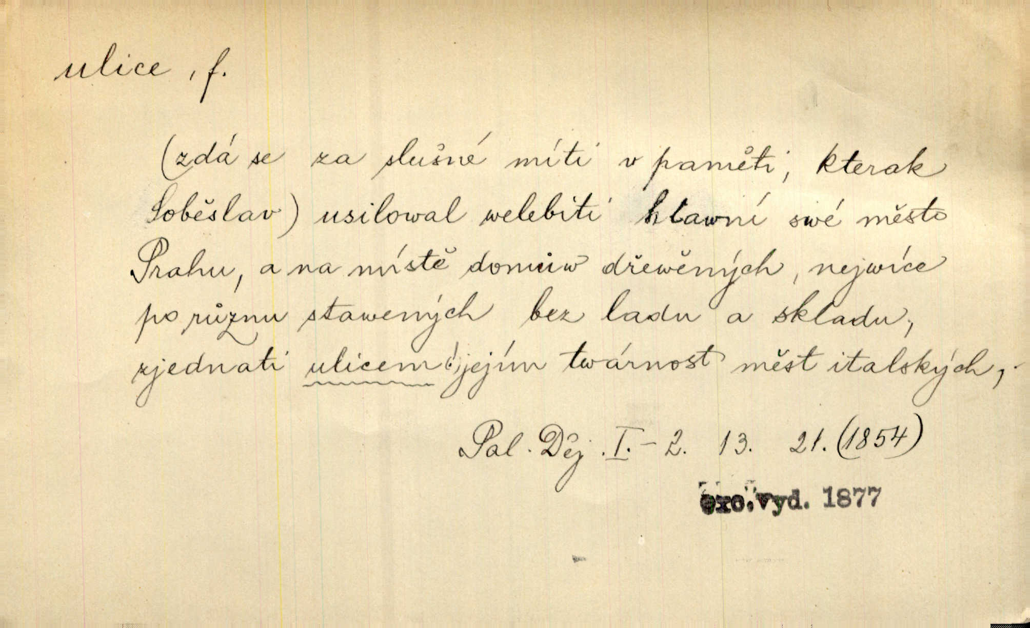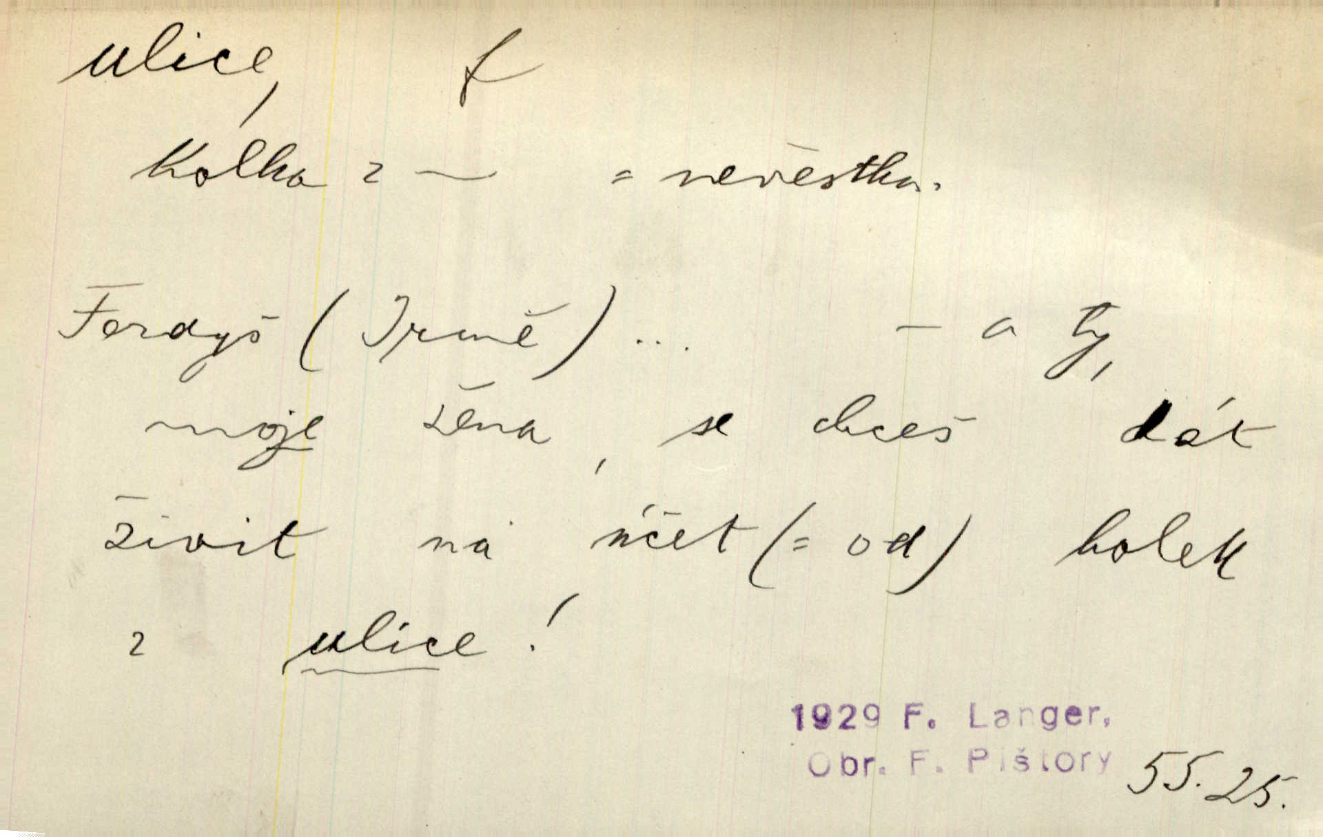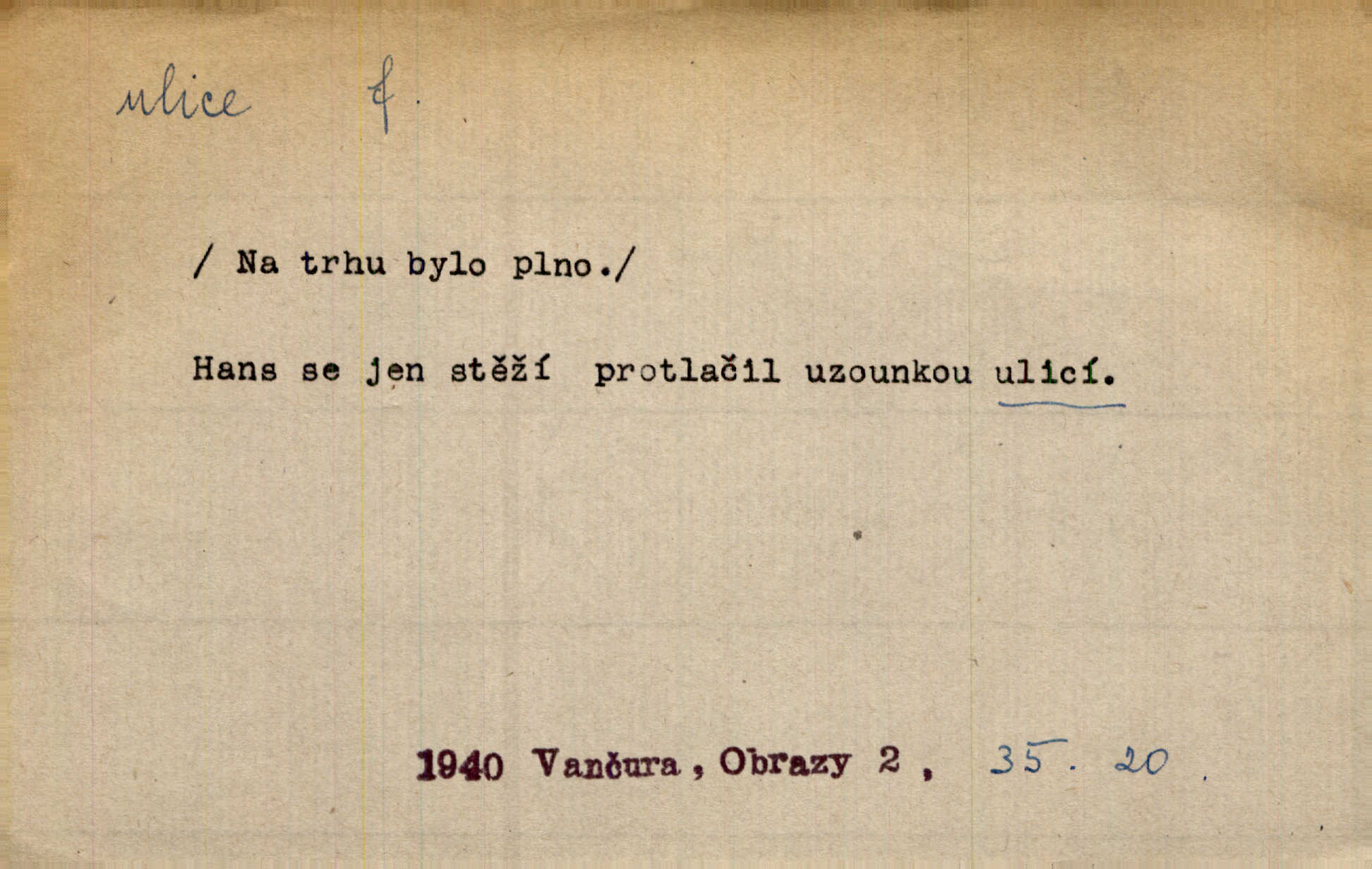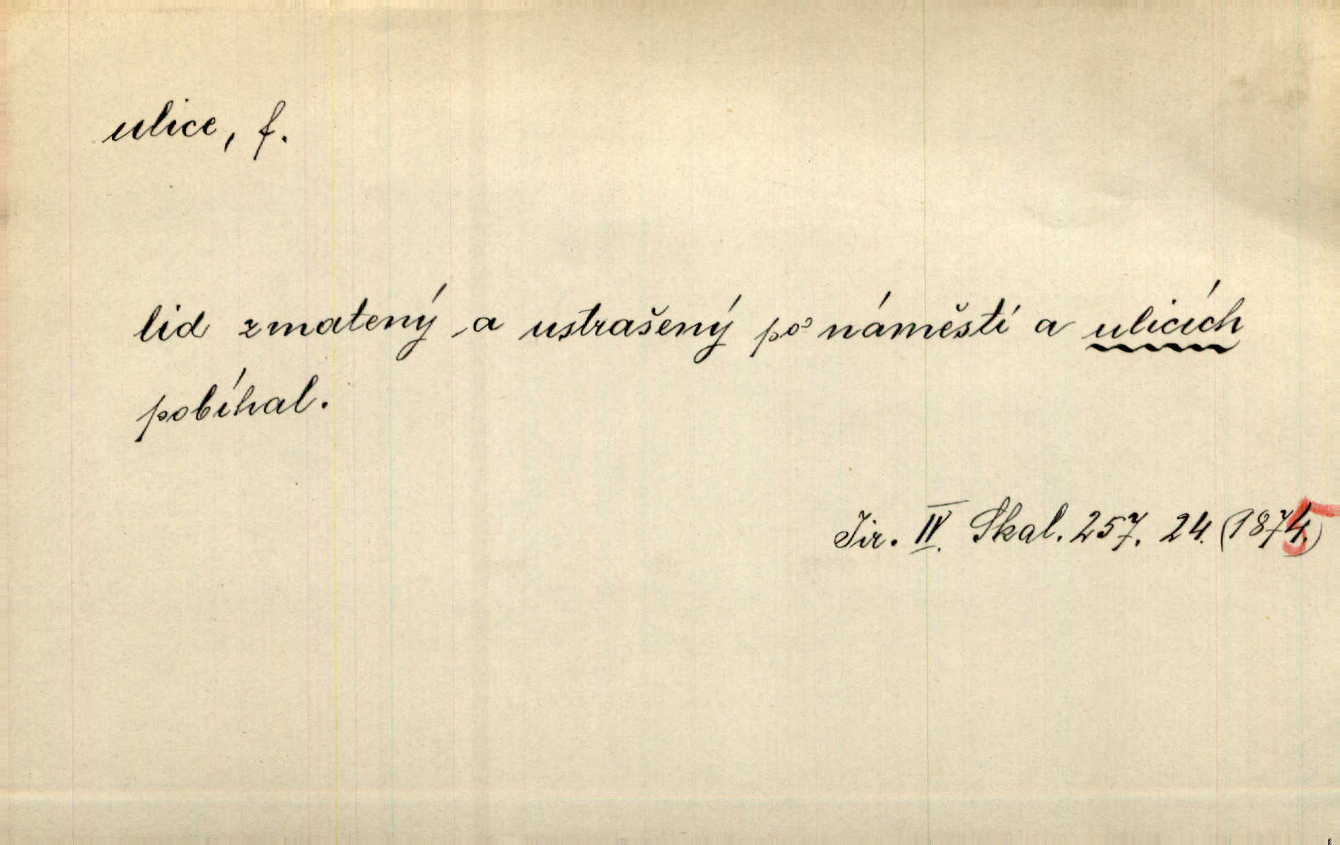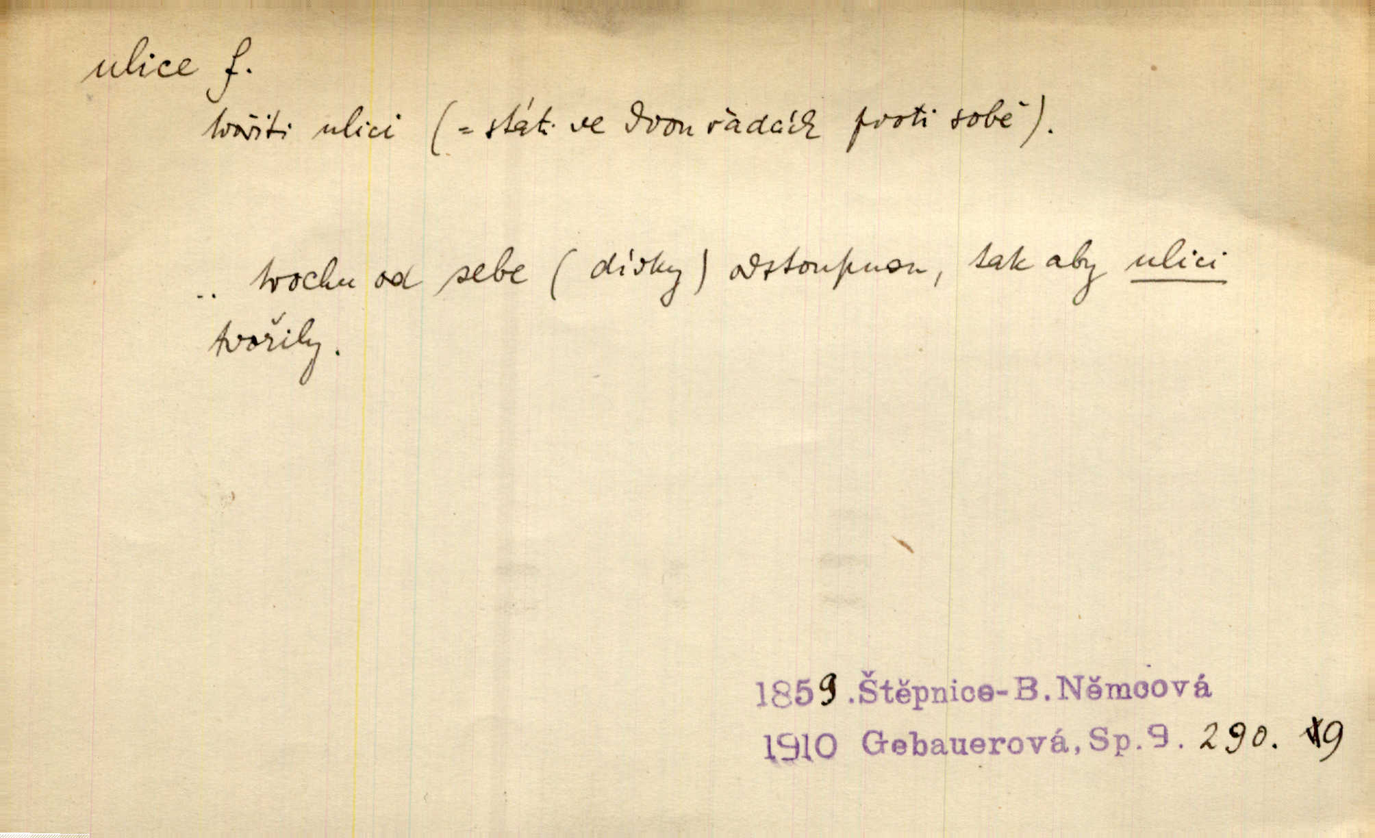 - ulice, -e f. veřejná cesta v městě, obyč. mezi dvěma řadami domů. Revoluční písně hlaholí do nočního ticha spící ulice. Lenin-J. Proch. Potkal jsem tetu Rózi ve Spálené ulici. Šim. Lid zmatený a ustrašený po náměstí a ulicích pobíhal. Jir. Já bych se pak ani na ulici neukázal! Tyl. [Hospodská] točí pivo přes ulici na konsum mimo hostinskou místnost. Maj. Kdo nemohl na činži sehnat, ocitl se na ulici i se svým skromným nábytkem pozbyl bytu. Halas st. Snad se ocitnu na ulici pozbudu zaměstnání. Šim. Dělala jsi dojem děvčete z ulice prostitutky. Kun. Na některé [holky] znovu číhala nemocnice nebo ulice prostituce. Včel. V jedné odlehlé slepé ulici stál tichý dům bez východu na druhé straně. Čech. Mladočeši dostali se svou politikou do slepé ulice do situace bez východiska. Čas. To si myslel „muž z ulice“. Ale diplomaté a právníci měli zde své výhrady prostý občan. Ečer. Zem. ulice hlavní, okružní, příčná, slepá, vedlejší. D obyvatelé ulice, lidé na ulici; dav. Osel se rozkřikne, celá ulice odpovídá. Ner. Vzrůstající nespokojenost a stále vzrůstající nároky římské ulice nezpříjemnily Diokletiánovi ty starosti. Trýb. Národní divadlo lze tu omluviti skutečně jen tím, že se zaleklo této nálady ulice. Smet. Na most hustě obsazený ježatou policií, vznáší se zpěv rudé ulice. Včel. D podlouhlý volný prostor mezi dvěma částmi něčeho n. mezi dvěma věcmi. Trochu od sebe [dívky] odstoupnou, tak aby ulici tvořily. Něm. Byl [bojovník] celou ulici si proklestil už rojem pohanským. Zey. Šli nejistým krokem po náledí, zvláště když se dostali do vinic a musili často jejich úbočím vzhůru, ulicemi jejich tyček. Jir. Pět saských dragounů, kteří bitku začali, chodilo za rachotu bubnů krvavou „ulicí“ starý vojenský trest, t. j. běh mezi dvěma řadami vojáků, kteří trestaného bili. Jir. Přen. Byl jsem hnán jako zrádce ulicí tisku ostouzen. Stech.