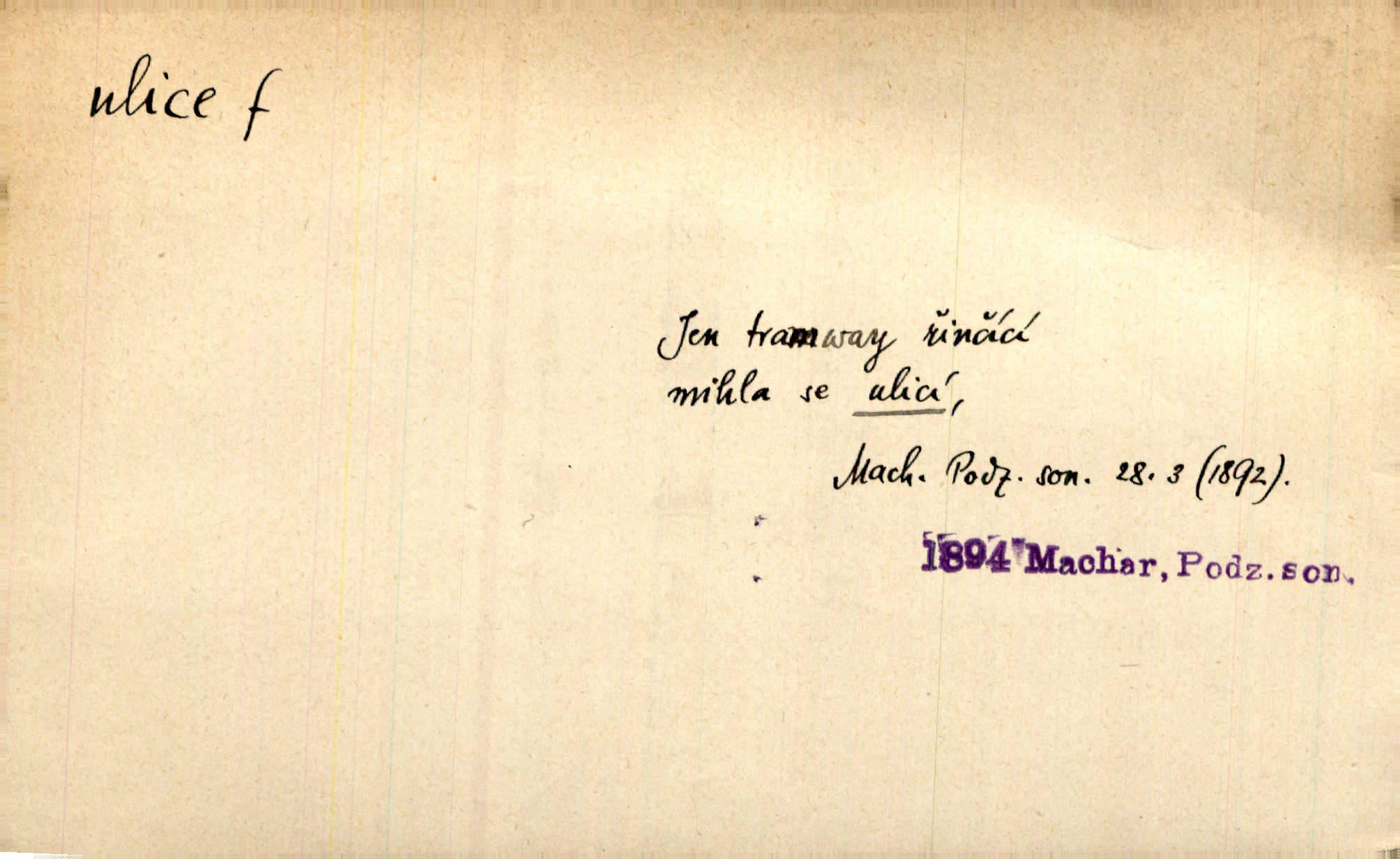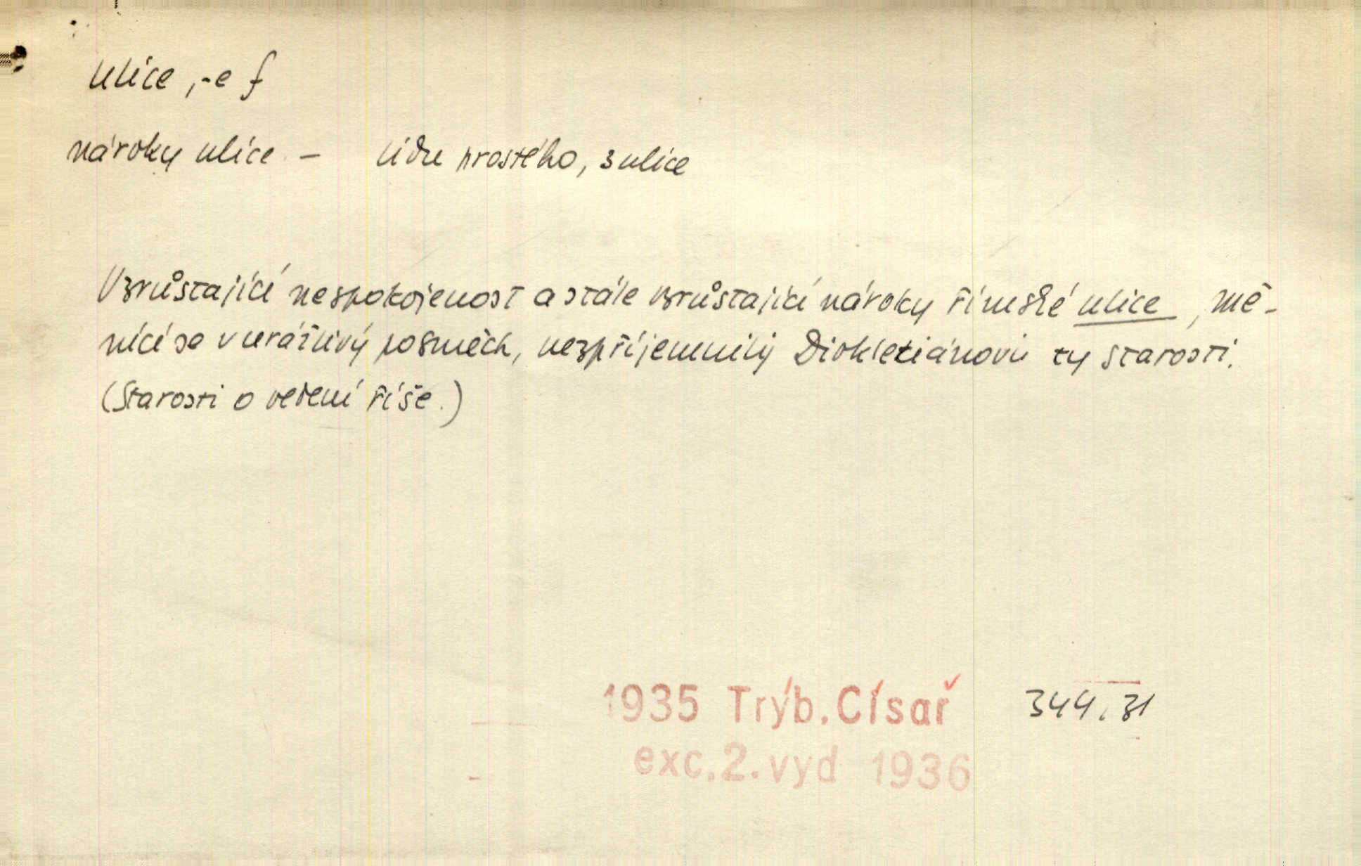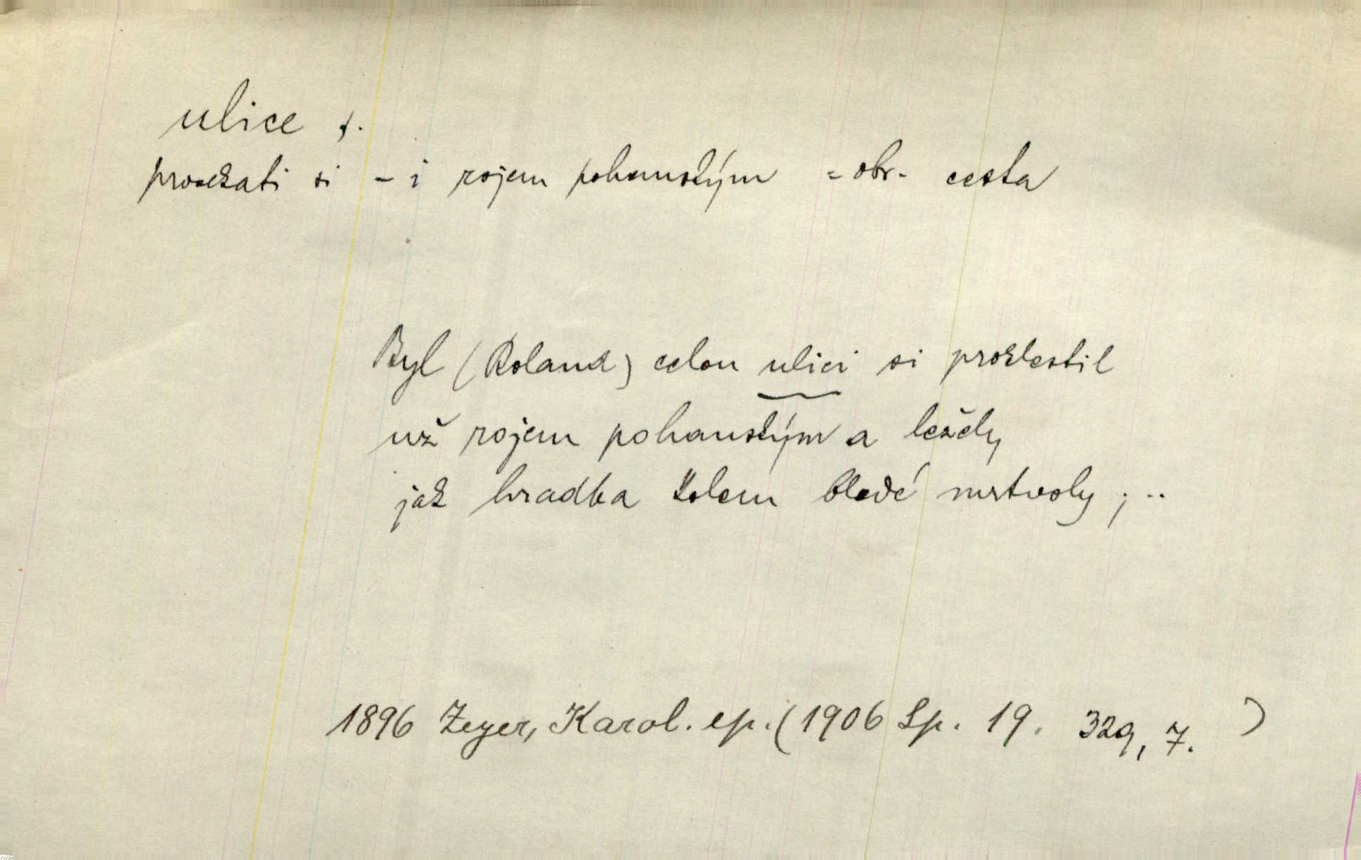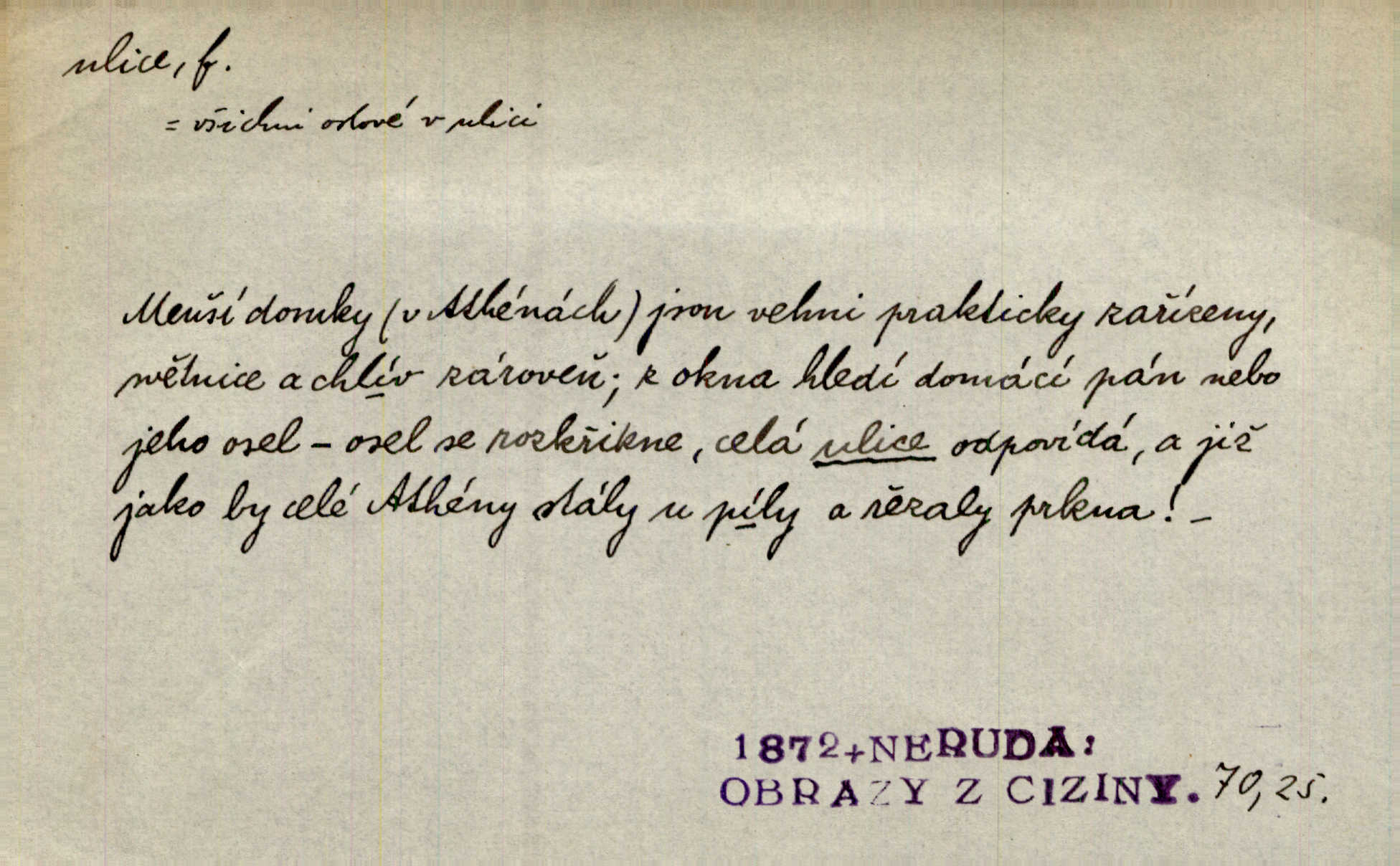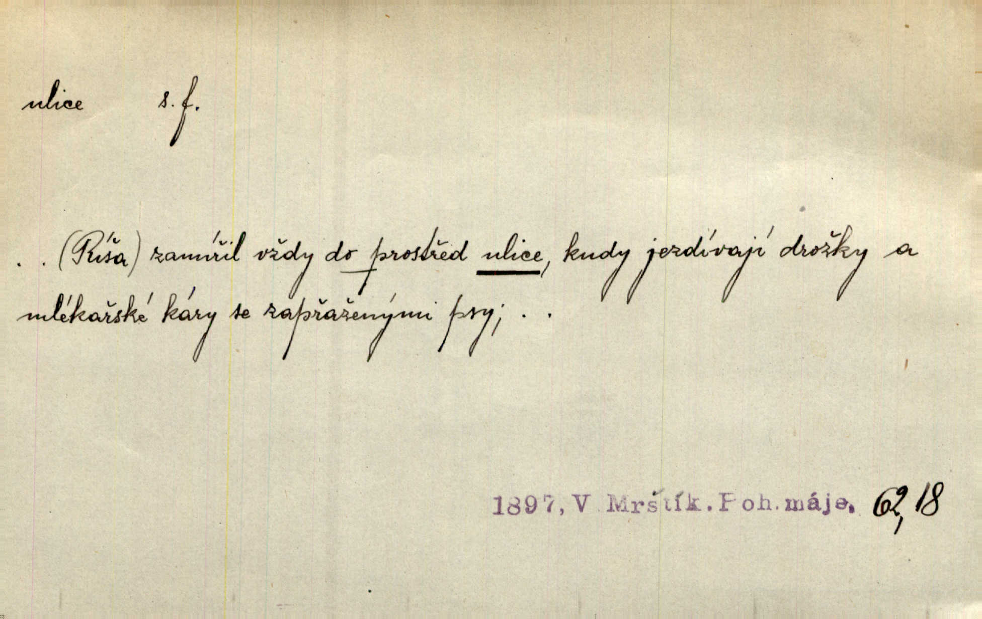 - ulice, -e f. veřejná cesta v městě, obyč. mezi dvěma řadami domů. Revoluční písně hlaholí do nočního ticha spící ulice. Lenin-J. Proch. Potkal jsem tetu Rózi ve Spálené ulici. Šim. Lid zmatený a ustrašený po náměstí a ulicích pobíhal. Jir. Já bych se pak ani na ulici neukázal! Tyl. [Hospodská] točí pivo přes ulici na konsum mimo hostinskou místnost. Maj. Kdo nemohl na činži sehnat, ocitl se na ulici i se svým skromným nábytkem pozbyl bytu. Halas st. Snad se ocitnu na ulici pozbudu zaměstnání. Šim. Dělala jsi dojem děvčete z ulice prostitutky. Kun. Na některé [holky] znovu číhala nemocnice nebo ulice prostituce. Včel. V jedné odlehlé slepé ulici stál tichý dům bez východu na druhé straně. Čech. Mladočeši dostali se svou politikou do slepé ulice do situace bez východiska. Čas. To si myslel „muž z ulice“. Ale diplomaté a právníci měli zde své výhrady prostý občan. Ečer. Zem. ulice hlavní, okružní, příčná, slepá, vedlejší. D obyvatelé ulice, lidé na ulici; dav. Osel se rozkřikne, celá ulice odpovídá. Ner. Vzrůstající nespokojenost a stále vzrůstající nároky římské ulice nezpříjemnily Diokletiánovi ty starosti. Trýb. Národní divadlo lze tu omluviti skutečně jen tím, že se zaleklo této nálady ulice. Smet. Na most hustě obsazený ježatou policií, vznáší se zpěv rudé ulice. Včel. D podlouhlý volný prostor mezi dvěma částmi něčeho n. mezi dvěma věcmi. Trochu od sebe [dívky] odstoupnou, tak aby ulici tvořily. Něm. Byl [bojovník] celou ulici si proklestil už rojem pohanským. Zey. Šli nejistým krokem po náledí, zvláště když se dostali do vinic a musili často jejich úbočím vzhůru, ulicemi jejich tyček. Jir. Pět saských dragounů, kteří bitku začali, chodilo za rachotu bubnů krvavou „ulicí“ starý vojenský trest, t. j. běh mezi dvěma řadami vojáků, kteří trestaného bili. Jir. Přen. Byl jsem hnán jako zrádce ulicí tisku ostouzen. Stech.