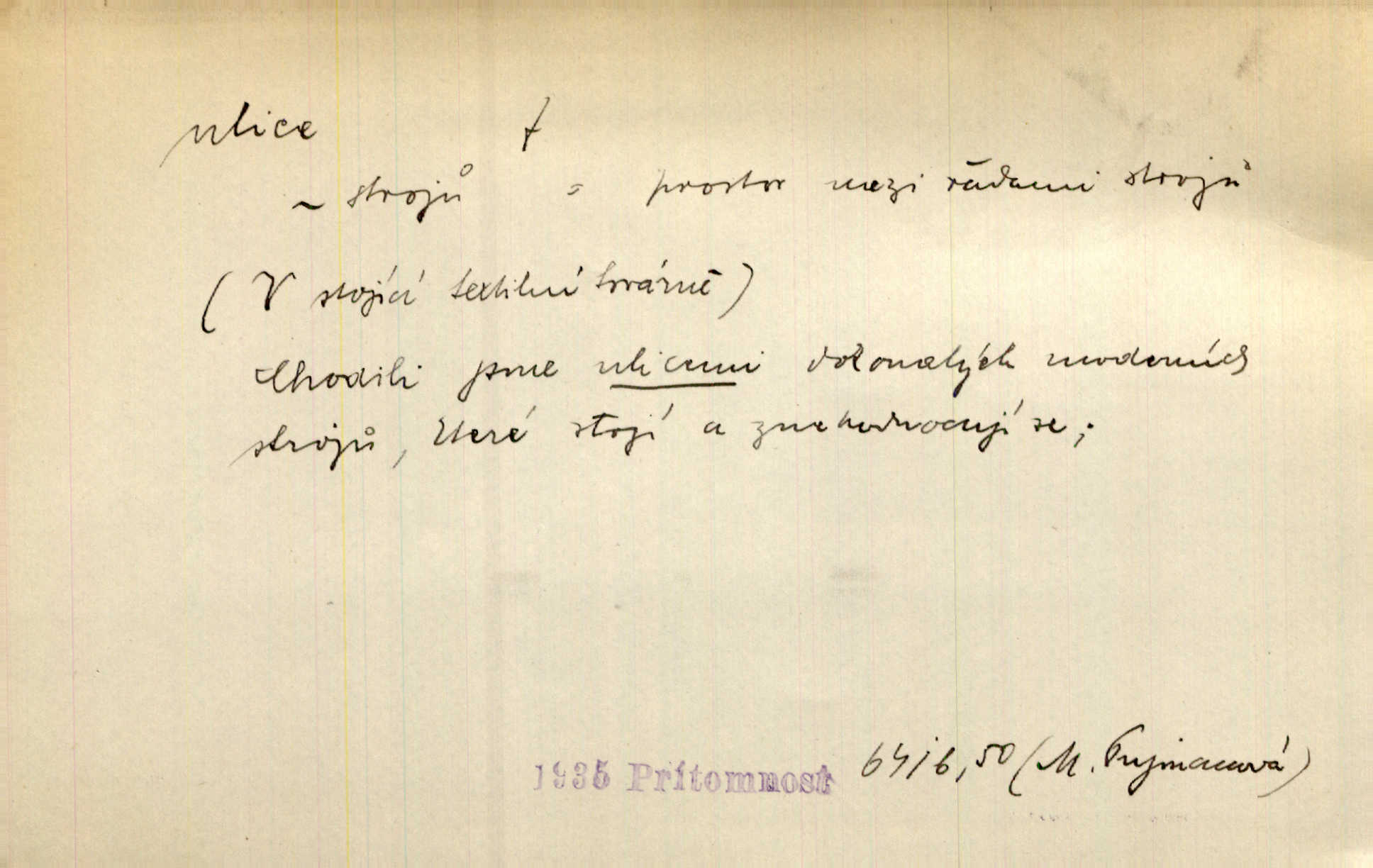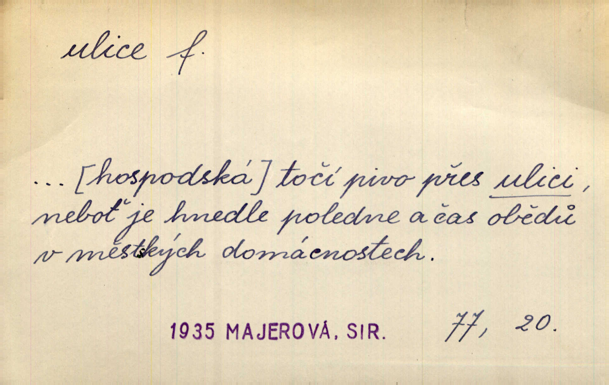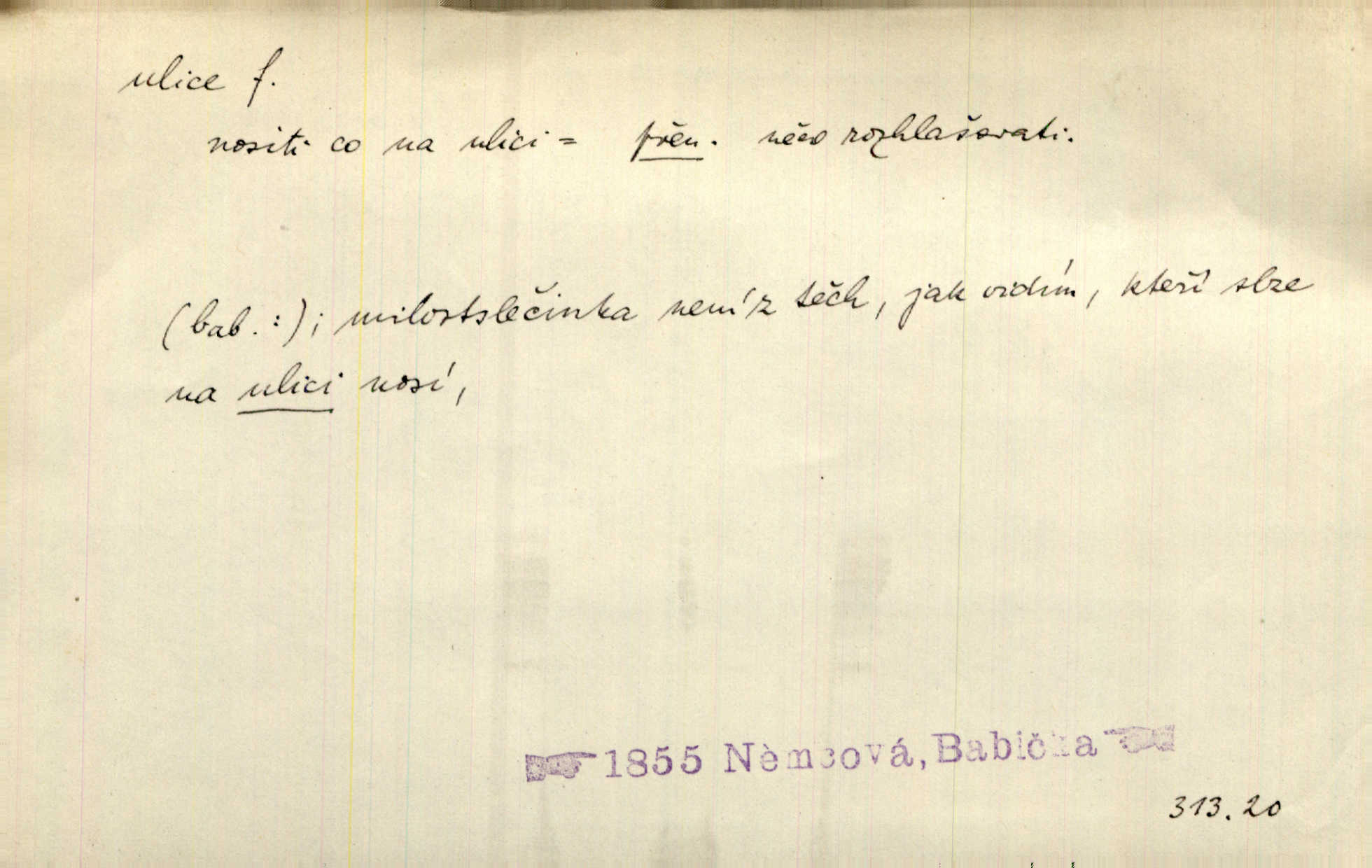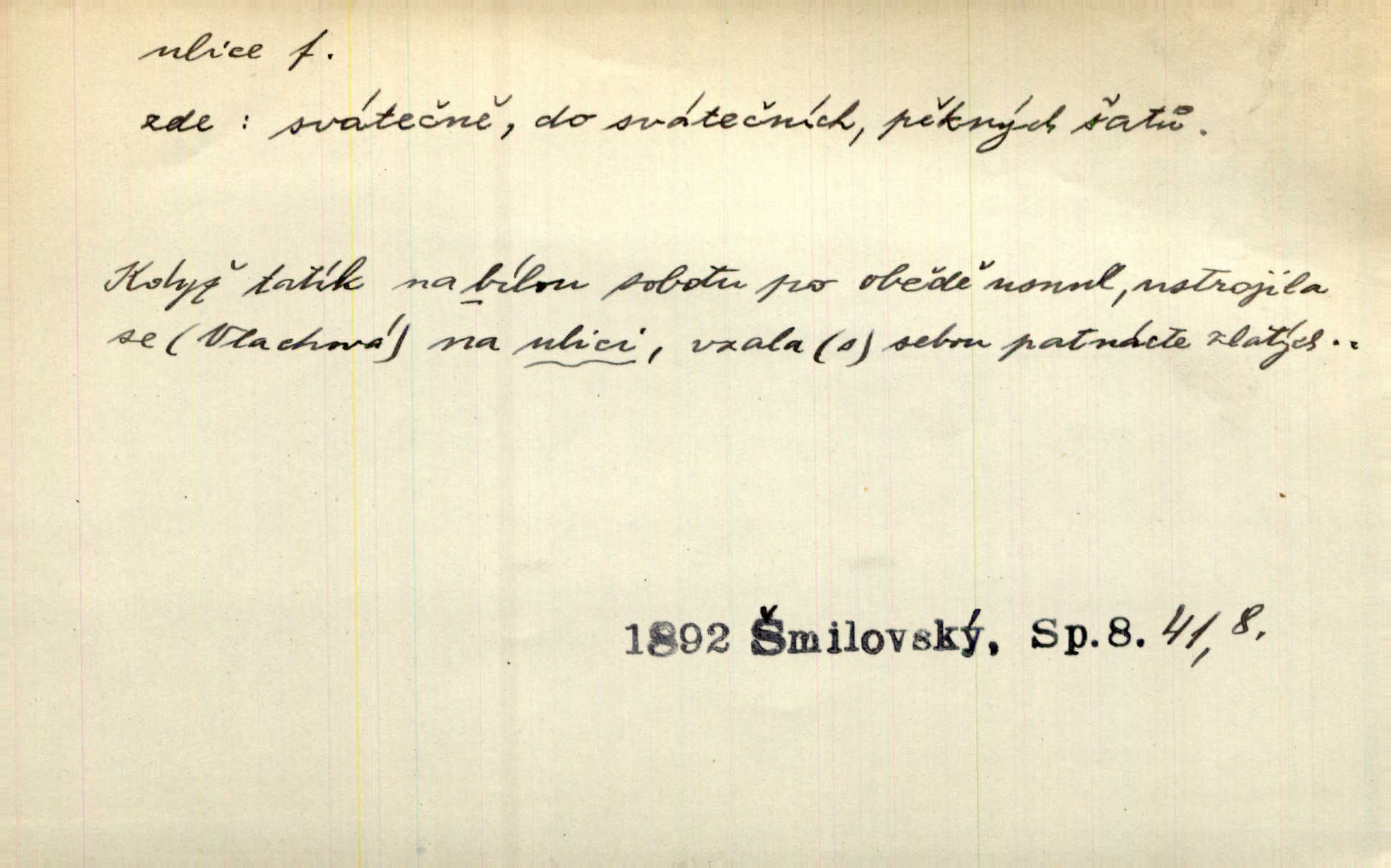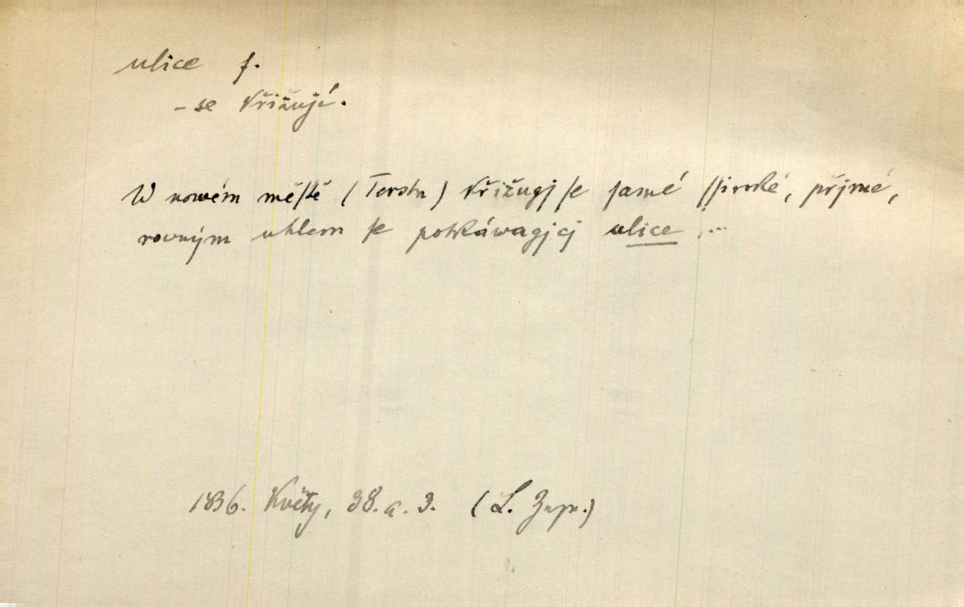 - ulice, -e f. veřejná cesta v městě, obyč. mezi dvěma řadami domů. Revoluční písně hlaholí do nočního ticha spící ulice. Lenin-J. Proch. Potkal jsem tetu Rózi ve Spálené ulici. Šim. Lid zmatený a ustrašený po náměstí a ulicích pobíhal. Jir. Já bych se pak ani na ulici neukázal! Tyl. [Hospodská] točí pivo přes ulici na konsum mimo hostinskou místnost. Maj. Kdo nemohl na činži sehnat, ocitl se na ulici i se svým skromným nábytkem pozbyl bytu. Halas st. Snad se ocitnu na ulici pozbudu zaměstnání. Šim. Dělala jsi dojem děvčete z ulice prostitutky. Kun. Na některé [holky] znovu číhala nemocnice nebo ulice prostituce. Včel. V jedné odlehlé slepé ulici stál tichý dům bez východu na druhé straně. Čech. Mladočeši dostali se svou politikou do slepé ulice do situace bez východiska. Čas. To si myslel „muž z ulice“. Ale diplomaté a právníci měli zde své výhrady prostý občan. Ečer. Zem. ulice hlavní, okružní, příčná, slepá, vedlejší. D obyvatelé ulice, lidé na ulici; dav. Osel se rozkřikne, celá ulice odpovídá. Ner. Vzrůstající nespokojenost a stále vzrůstající nároky římské ulice nezpříjemnily Diokletiánovi ty starosti. Trýb. Národní divadlo lze tu omluviti skutečně jen tím, že se zaleklo této nálady ulice. Smet. Na most hustě obsazený ježatou policií, vznáší se zpěv rudé ulice. Včel. D podlouhlý volný prostor mezi dvěma částmi něčeho n. mezi dvěma věcmi. Trochu od sebe [dívky] odstoupnou, tak aby ulici tvořily. Něm. Byl [bojovník] celou ulici si proklestil už rojem pohanským. Zey. Šli nejistým krokem po náledí, zvláště když se dostali do vinic a musili často jejich úbočím vzhůru, ulicemi jejich tyček. Jir. Pět saských dragounů, kteří bitku začali, chodilo za rachotu bubnů krvavou „ulicí“ starý vojenský trest, t. j. běh mezi dvěma řadami vojáků, kteří trestaného bili. Jir. Přen. Byl jsem hnán jako zrádce ulicí tisku ostouzen. Stech.