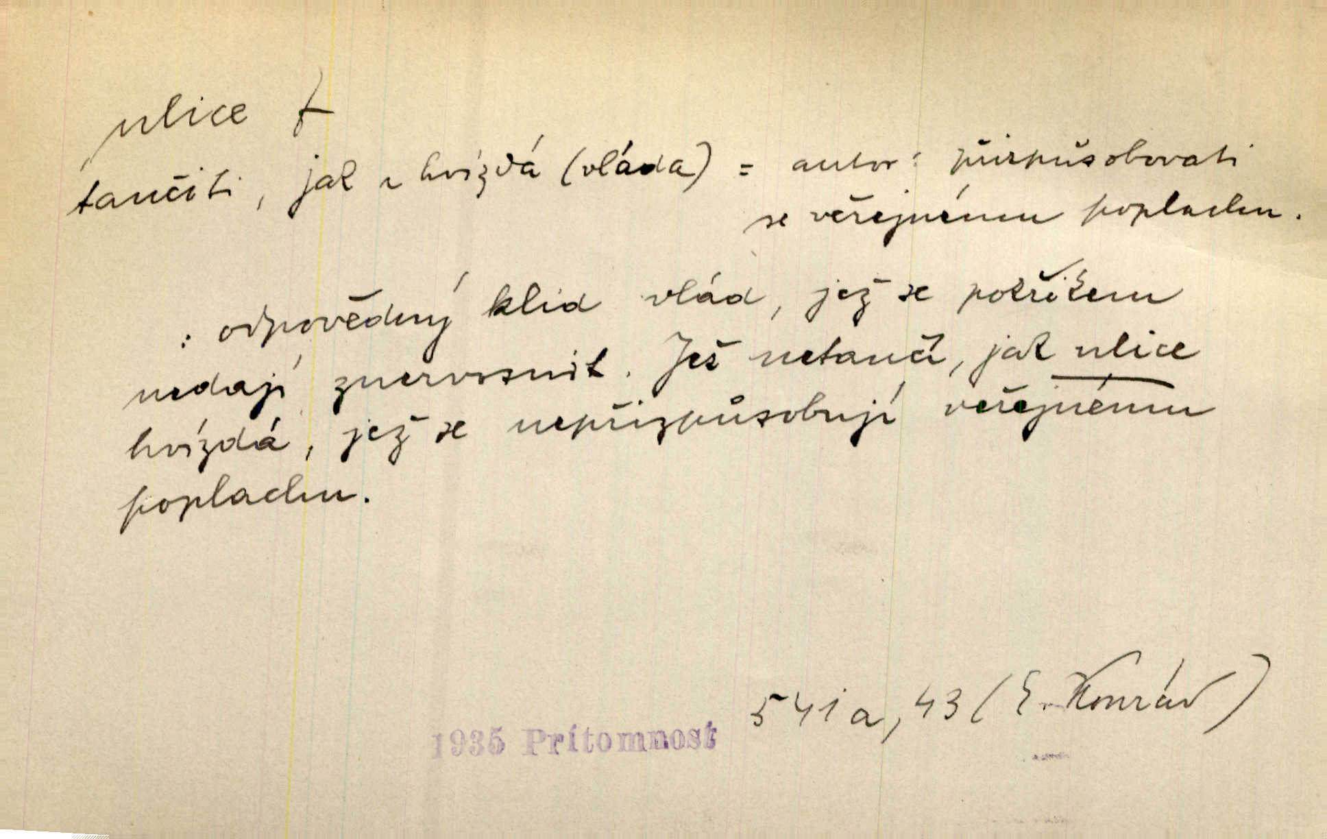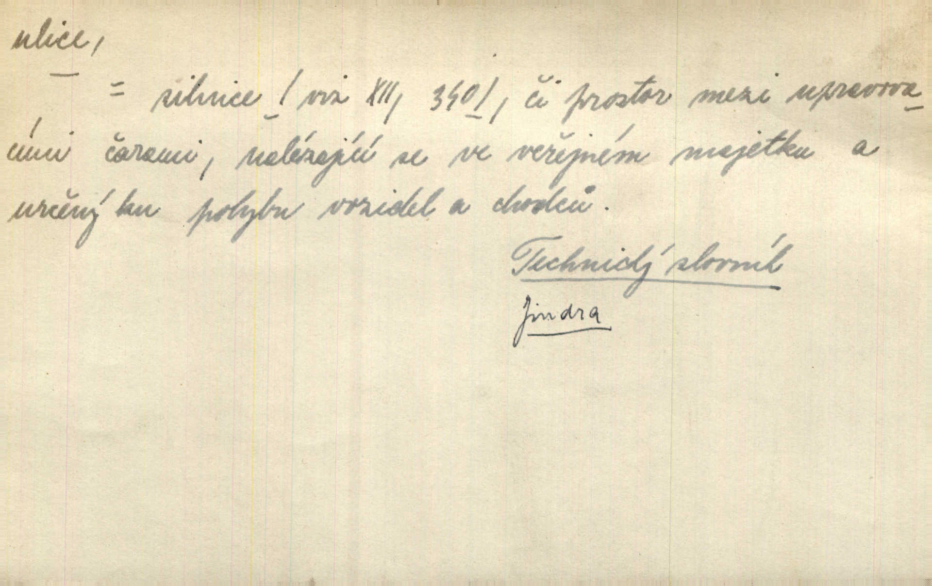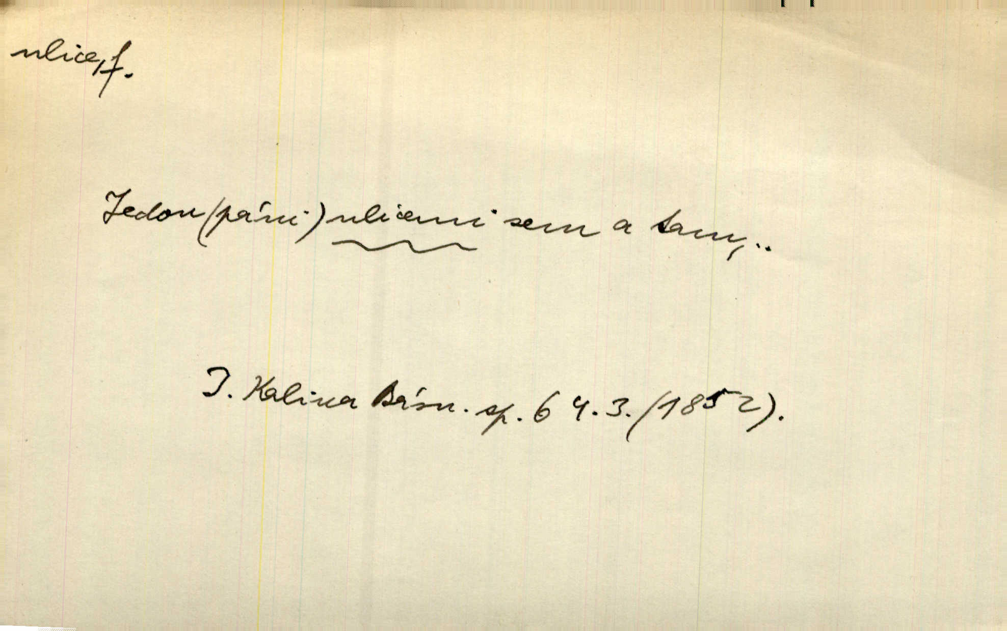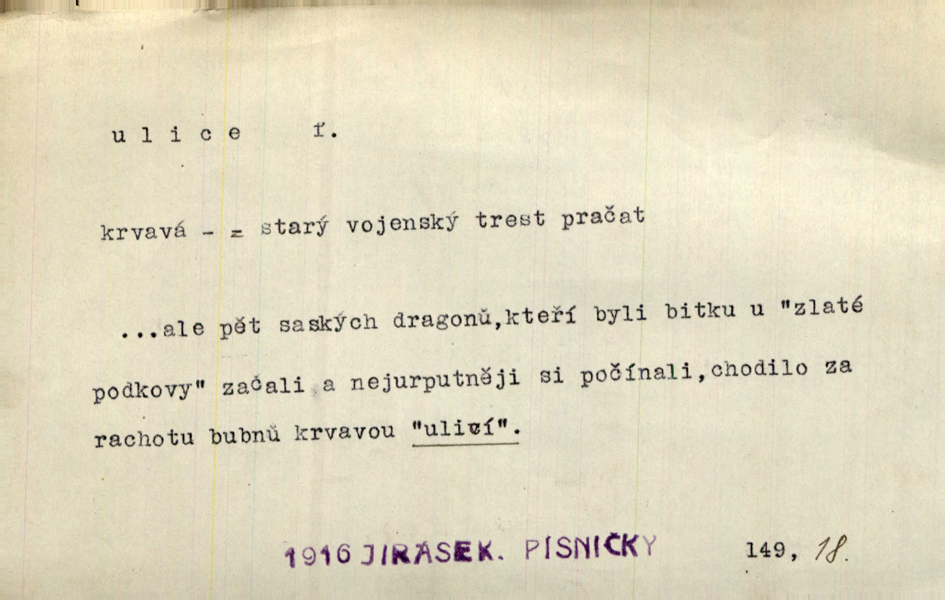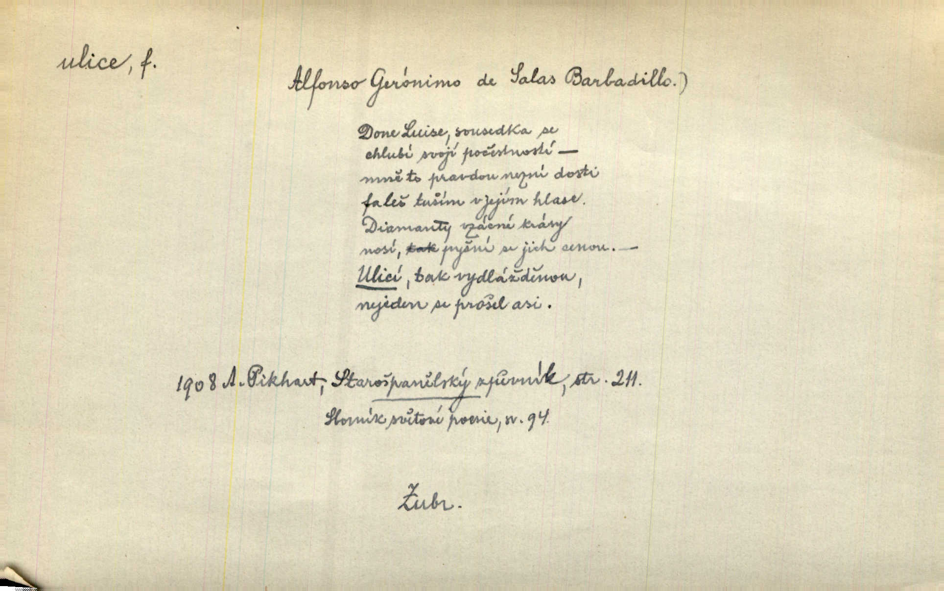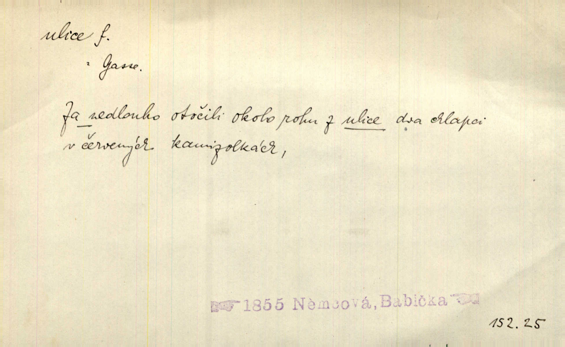 - ulice, -e f. veřejná cesta v městě, obyč. mezi dvěma řadami domů. Revoluční písně hlaholí do nočního ticha spící ulice. Lenin-J. Proch. Potkal jsem tetu Rózi ve Spálené ulici. Šim. Lid zmatený a ustrašený po náměstí a ulicích pobíhal. Jir. Já bych se pak ani na ulici neukázal! Tyl. [Hospodská] točí pivo přes ulici na konsum mimo hostinskou místnost. Maj. Kdo nemohl na činži sehnat, ocitl se na ulici i se svým skromným nábytkem pozbyl bytu. Halas st. Snad se ocitnu na ulici pozbudu zaměstnání. Šim. Dělala jsi dojem děvčete z ulice prostitutky. Kun. Na některé [holky] znovu číhala nemocnice nebo ulice prostituce. Včel. V jedné odlehlé slepé ulici stál tichý dům bez východu na druhé straně. Čech. Mladočeši dostali se svou politikou do slepé ulice do situace bez východiska. Čas. To si myslel „muž z ulice“. Ale diplomaté a právníci měli zde své výhrady prostý občan. Ečer. Zem. ulice hlavní, okružní, příčná, slepá, vedlejší. D obyvatelé ulice, lidé na ulici; dav. Osel se rozkřikne, celá ulice odpovídá. Ner. Vzrůstající nespokojenost a stále vzrůstající nároky římské ulice nezpříjemnily Diokletiánovi ty starosti. Trýb. Národní divadlo lze tu omluviti skutečně jen tím, že se zaleklo této nálady ulice. Smet. Na most hustě obsazený ježatou policií, vznáší se zpěv rudé ulice. Včel. D podlouhlý volný prostor mezi dvěma částmi něčeho n. mezi dvěma věcmi. Trochu od sebe [dívky] odstoupnou, tak aby ulici tvořily. Něm. Byl [bojovník] celou ulici si proklestil už rojem pohanským. Zey. Šli nejistým krokem po náledí, zvláště když se dostali do vinic a musili často jejich úbočím vzhůru, ulicemi jejich tyček. Jir. Pět saských dragounů, kteří bitku začali, chodilo za rachotu bubnů krvavou „ulicí“ starý vojenský trest, t. j. běh mezi dvěma řadami vojáků, kteří trestaného bili. Jir. Přen. Byl jsem hnán jako zrádce ulicí tisku ostouzen. Stech.