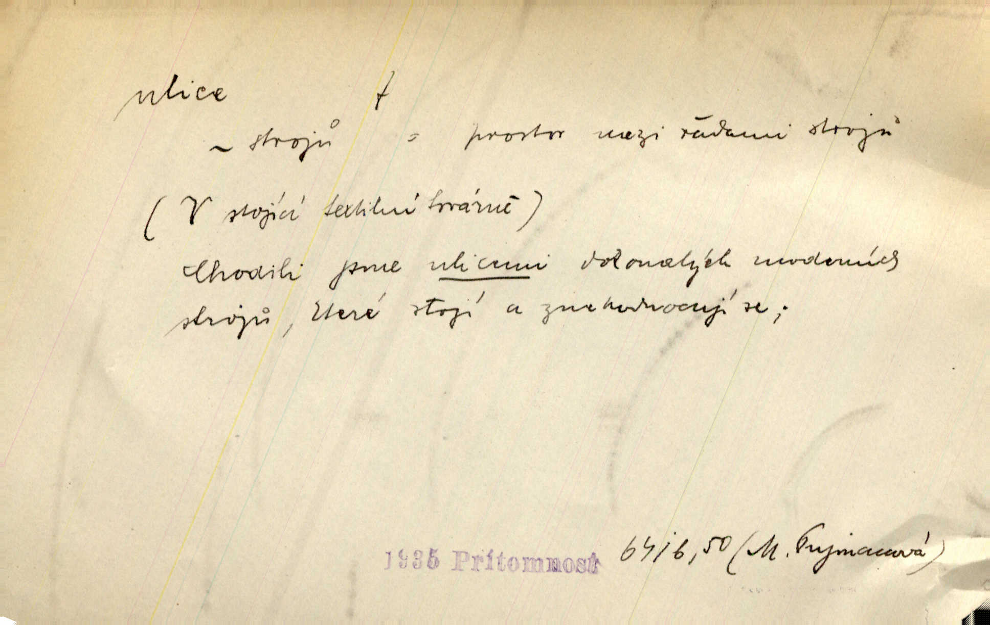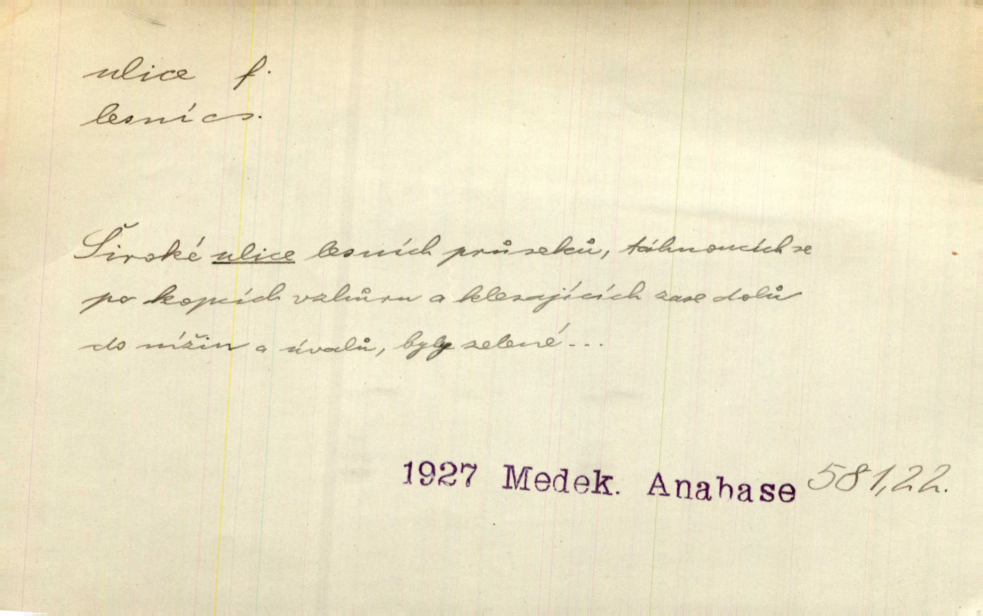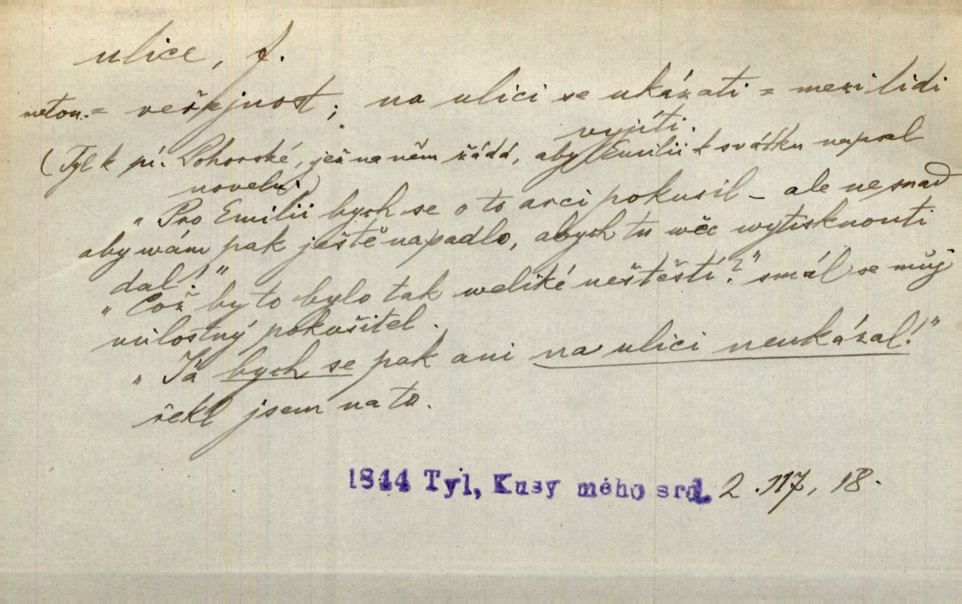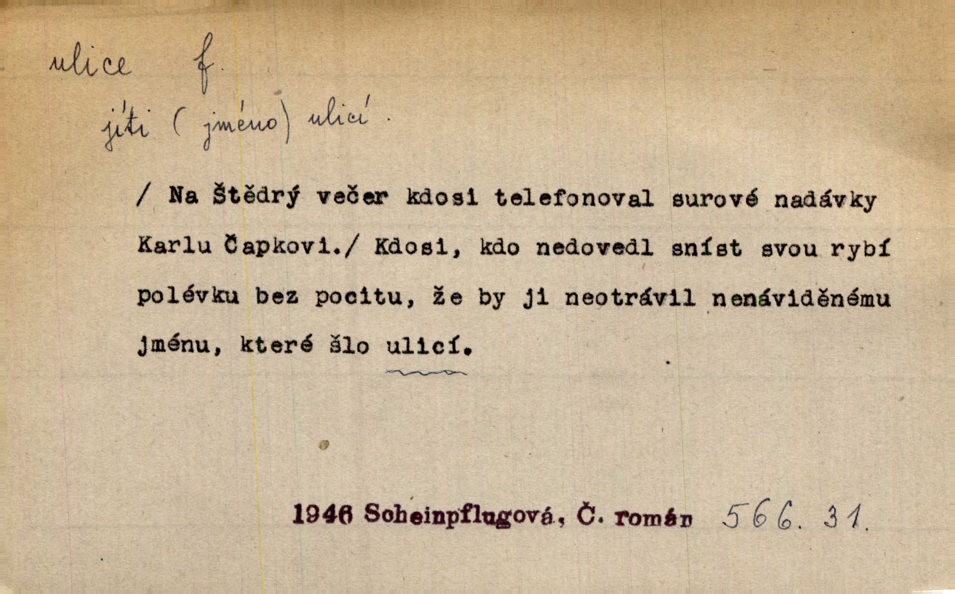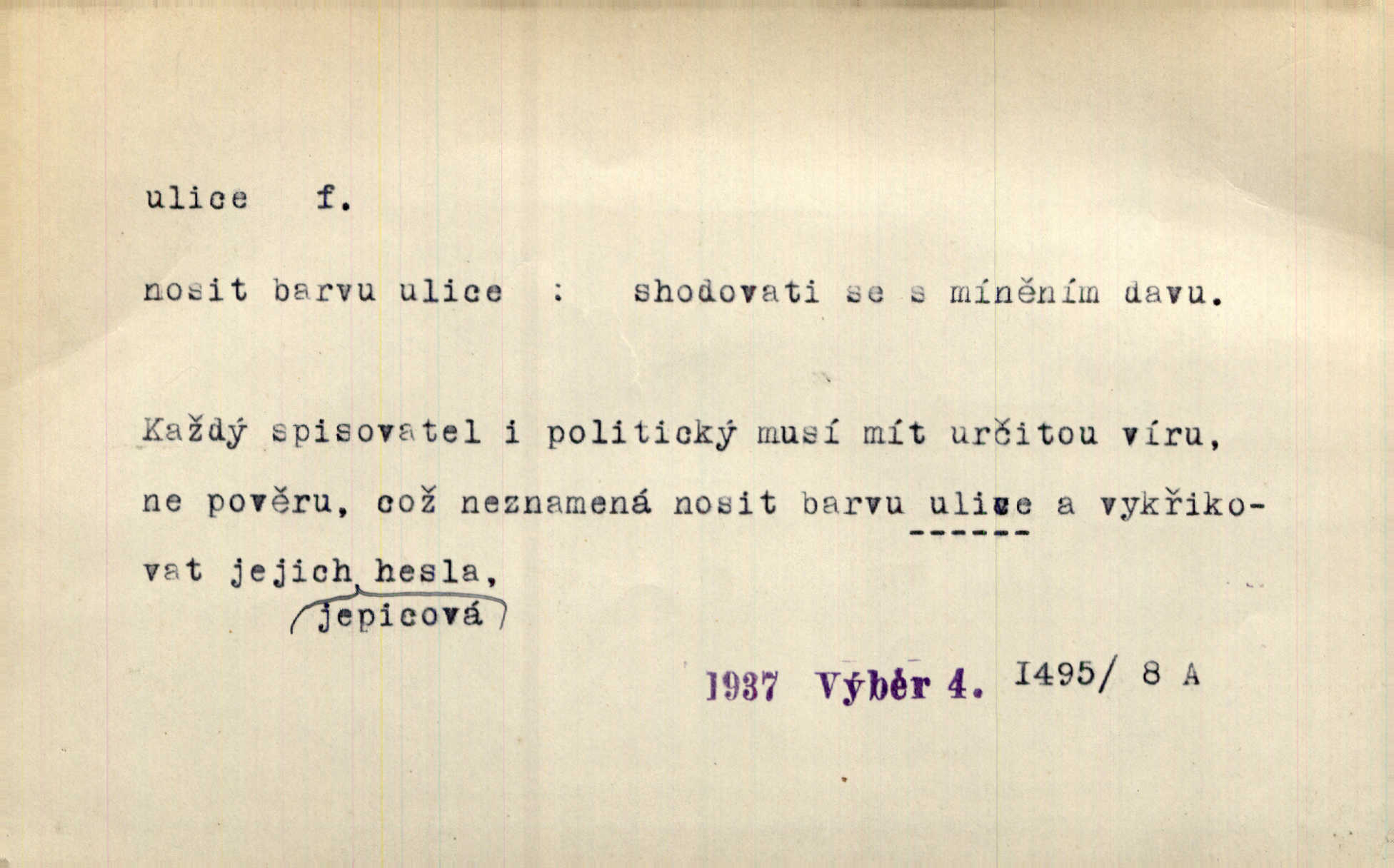 - ulice, -e f. veřejná cesta v městě, obyč. mezi dvěma řadami domů. Revoluční písně hlaholí do nočního ticha spící ulice. Lenin-J. Proch. Potkal jsem tetu Rózi ve Spálené ulici. Šim. Lid zmatený a ustrašený po náměstí a ulicích pobíhal. Jir. Já bych se pak ani na ulici neukázal! Tyl. [Hospodská] točí pivo přes ulici na konsum mimo hostinskou místnost. Maj. Kdo nemohl na činži sehnat, ocitl se na ulici i se svým skromným nábytkem pozbyl bytu. Halas st. Snad se ocitnu na ulici pozbudu zaměstnání. Šim. Dělala jsi dojem děvčete z ulice prostitutky. Kun. Na některé [holky] znovu číhala nemocnice nebo ulice prostituce. Včel. V jedné odlehlé slepé ulici stál tichý dům bez východu na druhé straně. Čech. Mladočeši dostali se svou politikou do slepé ulice do situace bez východiska. Čas. To si myslel „muž z ulice“. Ale diplomaté a právníci měli zde své výhrady prostý občan. Ečer. Zem. ulice hlavní, okružní, příčná, slepá, vedlejší. D obyvatelé ulice, lidé na ulici; dav. Osel se rozkřikne, celá ulice odpovídá. Ner. Vzrůstající nespokojenost a stále vzrůstající nároky římské ulice nezpříjemnily Diokletiánovi ty starosti. Trýb. Národní divadlo lze tu omluviti skutečně jen tím, že se zaleklo této nálady ulice. Smet. Na most hustě obsazený ježatou policií, vznáší se zpěv rudé ulice. Včel. D podlouhlý volný prostor mezi dvěma částmi něčeho n. mezi dvěma věcmi. Trochu od sebe [dívky] odstoupnou, tak aby ulici tvořily. Něm. Byl [bojovník] celou ulici si proklestil už rojem pohanským. Zey. Šli nejistým krokem po náledí, zvláště když se dostali do vinic a musili často jejich úbočím vzhůru, ulicemi jejich tyček. Jir. Pět saských dragounů, kteří bitku začali, chodilo za rachotu bubnů krvavou „ulicí“ starý vojenský trest, t. j. běh mezi dvěma řadami vojáků, kteří trestaného bili. Jir. Přen. Byl jsem hnán jako zrádce ulicí tisku ostouzen. Stech.