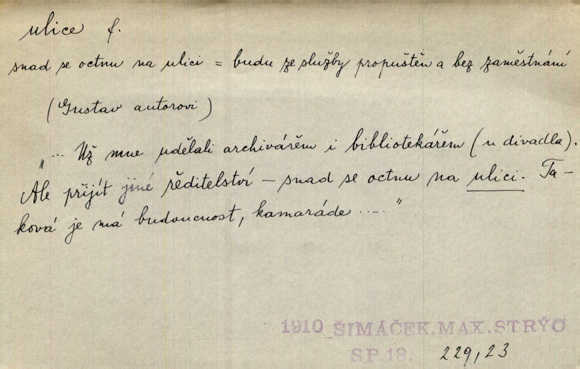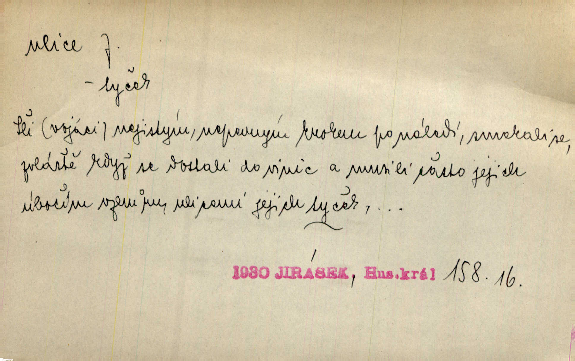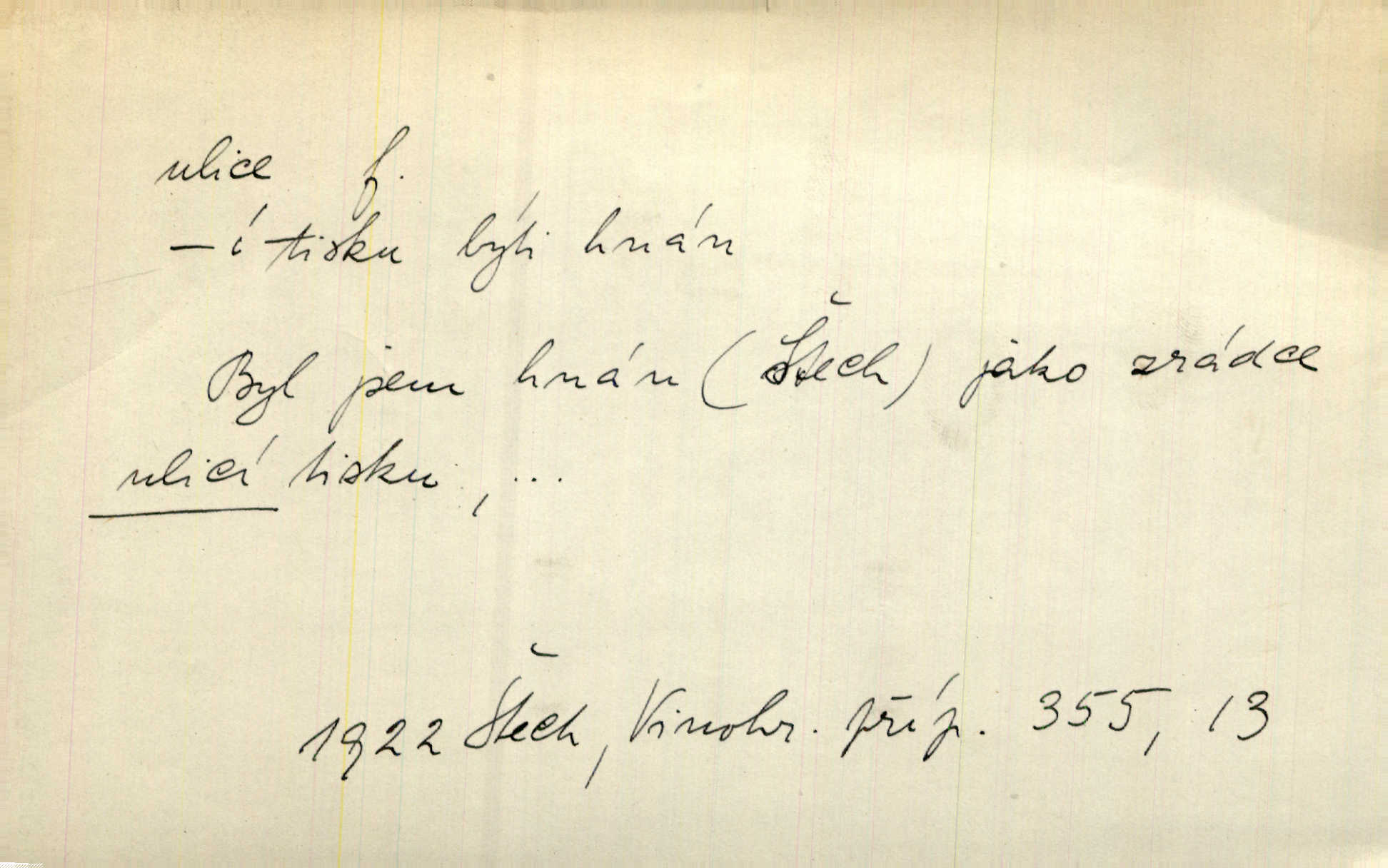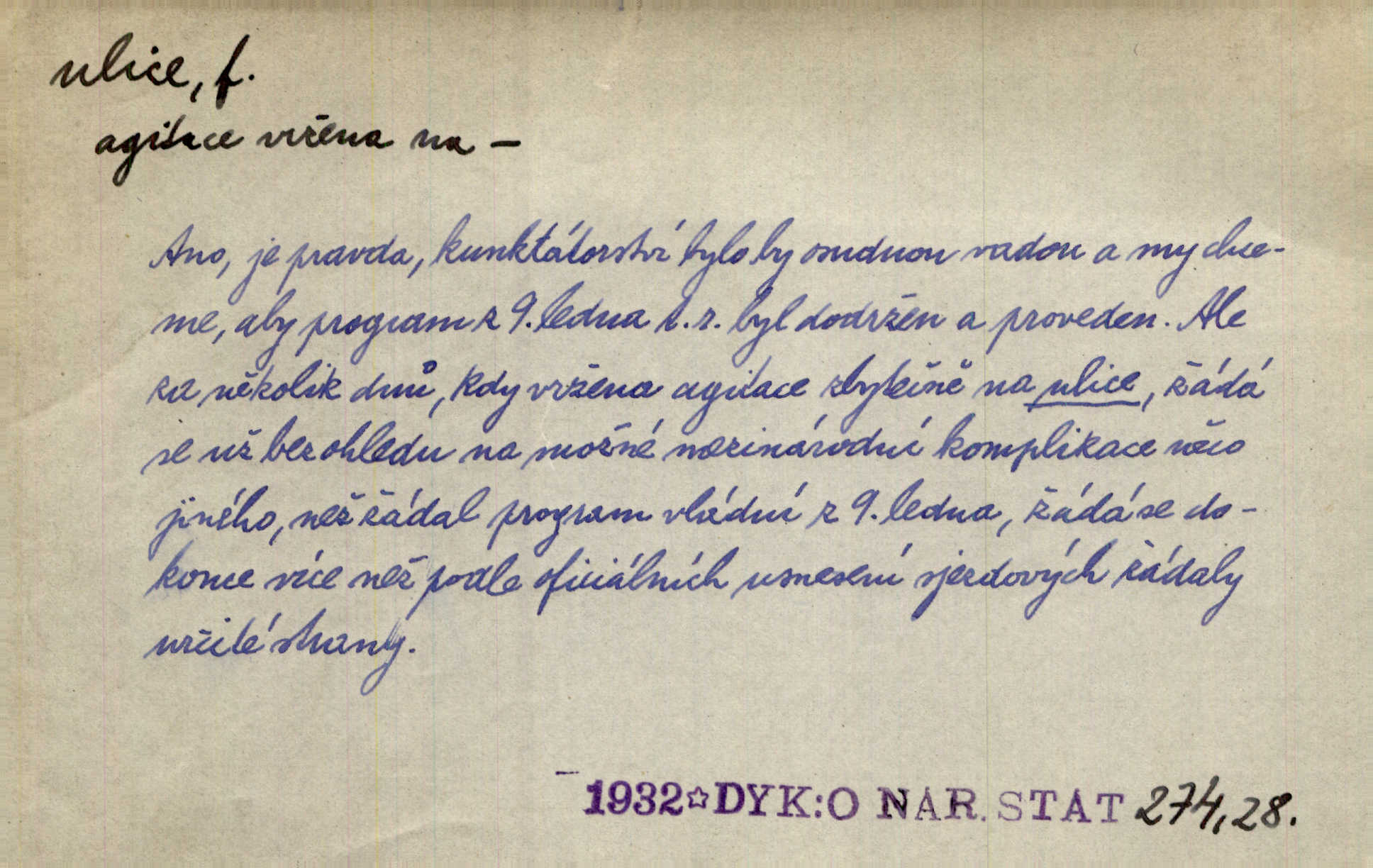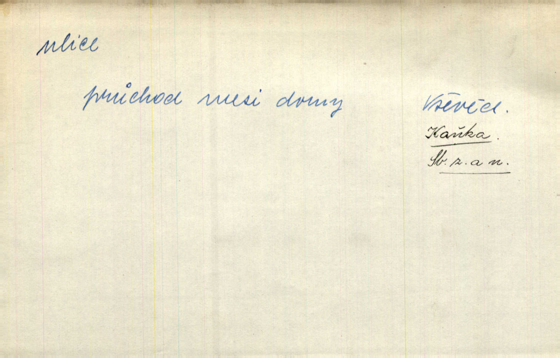 - ulice, -e f. veřejná cesta v městě, obyč. mezi dvěma řadami domů. Revoluční písně hlaholí do nočního ticha spící ulice. Lenin-J. Proch. Potkal jsem tetu Rózi ve Spálené ulici. Šim. Lid zmatený a ustrašený po náměstí a ulicích pobíhal. Jir. Já bych se pak ani na ulici neukázal! Tyl. [Hospodská] točí pivo přes ulici na konsum mimo hostinskou místnost. Maj. Kdo nemohl na činži sehnat, ocitl se na ulici i se svým skromným nábytkem pozbyl bytu. Halas st. Snad se ocitnu na ulici pozbudu zaměstnání. Šim. Dělala jsi dojem děvčete z ulice prostitutky. Kun. Na některé [holky] znovu číhala nemocnice nebo ulice prostituce. Včel. V jedné odlehlé slepé ulici stál tichý dům bez východu na druhé straně. Čech. Mladočeši dostali se svou politikou do slepé ulice do situace bez východiska. Čas. To si myslel „muž z ulice“. Ale diplomaté a právníci měli zde své výhrady prostý občan. Ečer. Zem. ulice hlavní, okružní, příčná, slepá, vedlejší. D obyvatelé ulice, lidé na ulici; dav. Osel se rozkřikne, celá ulice odpovídá. Ner. Vzrůstající nespokojenost a stále vzrůstající nároky římské ulice nezpříjemnily Diokletiánovi ty starosti. Trýb. Národní divadlo lze tu omluviti skutečně jen tím, že se zaleklo této nálady ulice. Smet. Na most hustě obsazený ježatou policií, vznáší se zpěv rudé ulice. Včel. D podlouhlý volný prostor mezi dvěma částmi něčeho n. mezi dvěma věcmi. Trochu od sebe [dívky] odstoupnou, tak aby ulici tvořily. Něm. Byl [bojovník] celou ulici si proklestil už rojem pohanským. Zey. Šli nejistým krokem po náledí, zvláště když se dostali do vinic a musili často jejich úbočím vzhůru, ulicemi jejich tyček. Jir. Pět saských dragounů, kteří bitku začali, chodilo za rachotu bubnů krvavou „ulicí“ starý vojenský trest, t. j. běh mezi dvěma řadami vojáků, kteří trestaného bili. Jir. Přen. Byl jsem hnán jako zrádce ulicí tisku ostouzen. Stech.