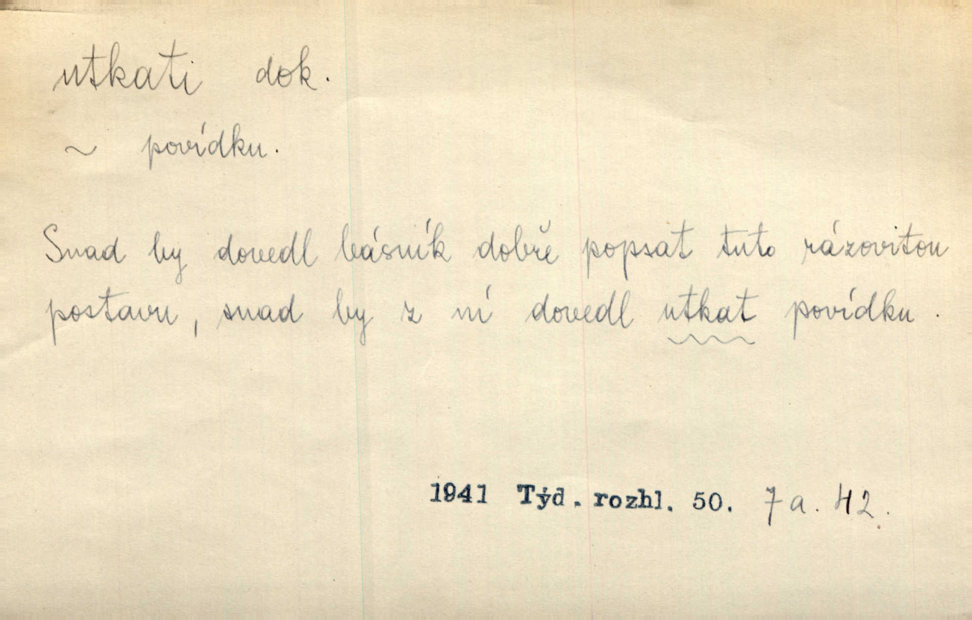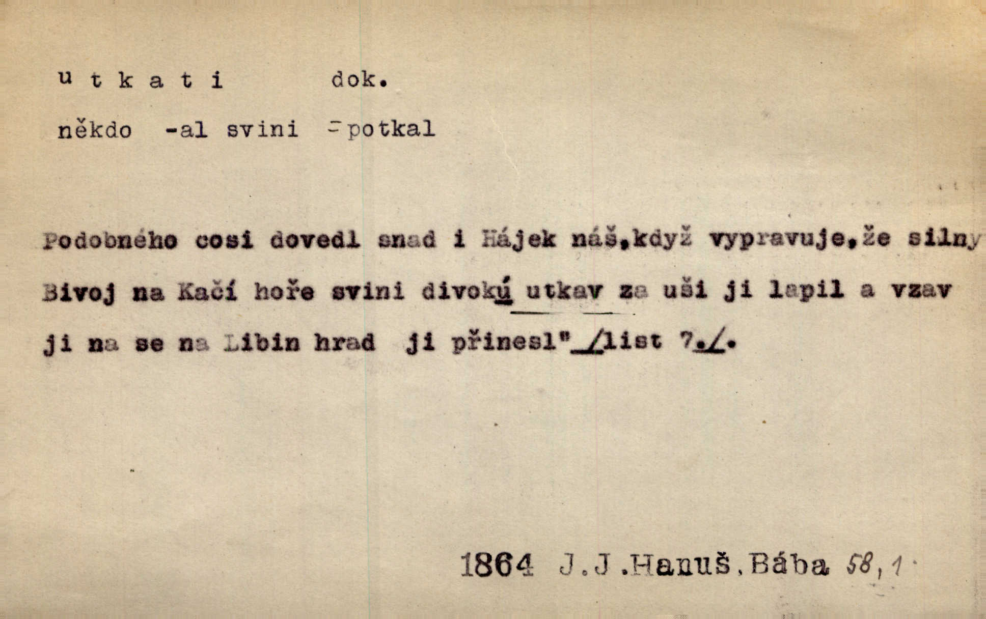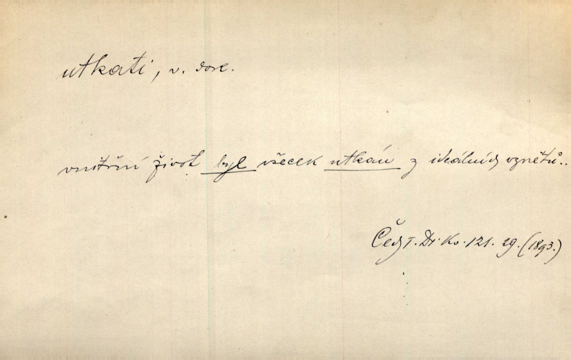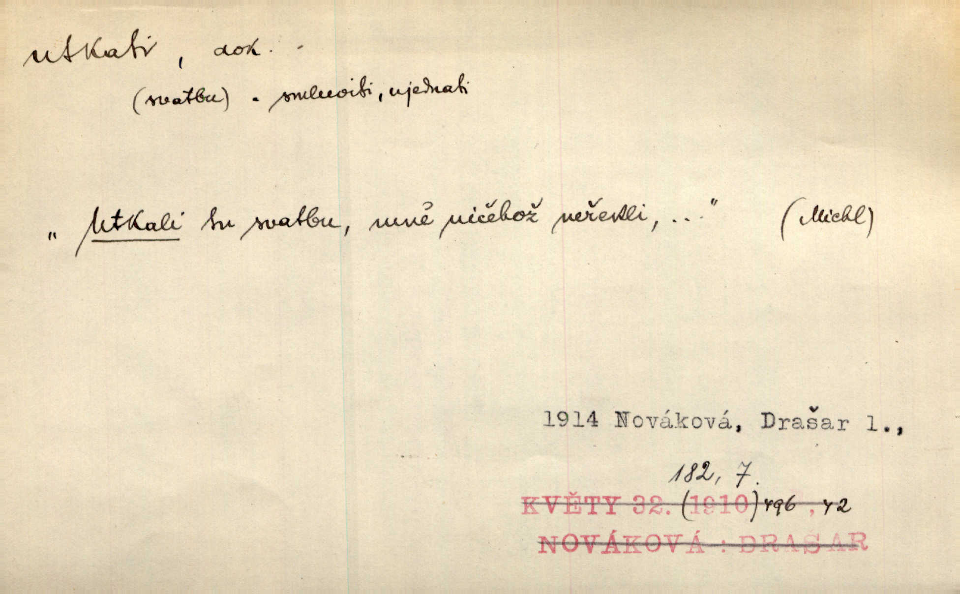 - utkati dok. 1. (co) tkaním vyrobiti něco. Tenkráte lidé sami na šat předli, sami si ho také utkali a ušili. Něm. Žena primitivním a zdlouhavým spůsobem utká z toho [bavlny] hrubé plátno. Štol. Za utkání velkého koberce placeno jedenáct krejcarů. Sum. Za krátko třepetal se ubohý don Juan sám v síti, kterou byl utkal pro tajemnou kněžnu. Čech. Černí pavouci vylezou a rubáš ze smutku utkají. Strn. D Kniž. vůbec vytvořiti, udělati, obyč. z různých částí, jednotlivostí. Utkána je tato sbírka [básní] z dvojího thematického živlu. Sez. Snad bz dovedl básník dobře popsat tuto rázovitou postavu, snad by z ní dovedl utkat povídku. Týd. rozhl. Plyne [bzukot včel] v jednotvárném vypravování o věcech zapomenutých a věcech utkaných ze snů. Vanč. Vnitřní život byl všecek utkán z ideálních vznětů. Čech. Utkal sobě již plán, jak dítě vychová. Hál. Utkali tu svatbu, mně ničehož neřekli. Nov. Třeba je [osudy Rimbaudovy] pozorovati se stanoviska legendy, která se utkala kol jména a plodů jeho. Vrch.